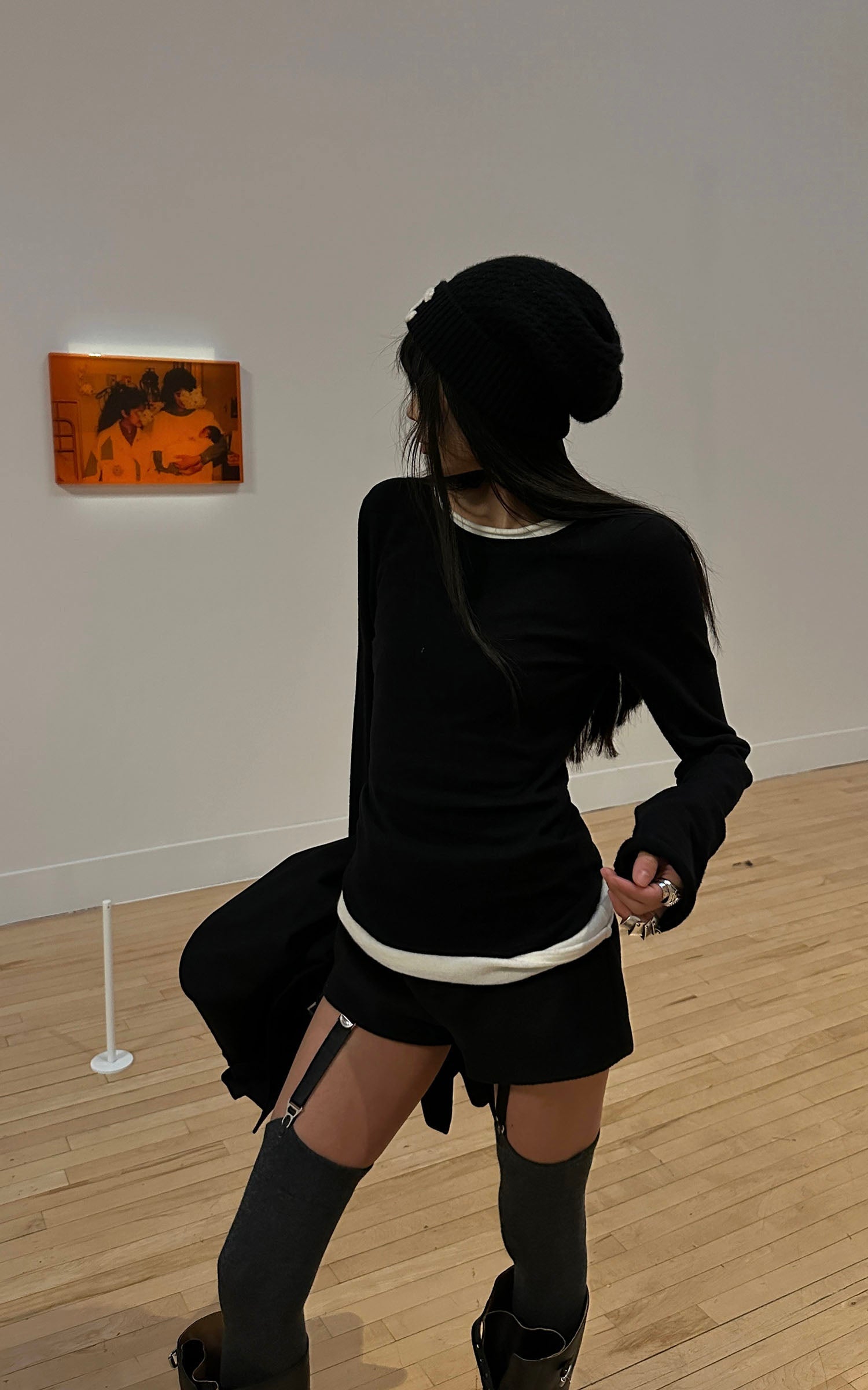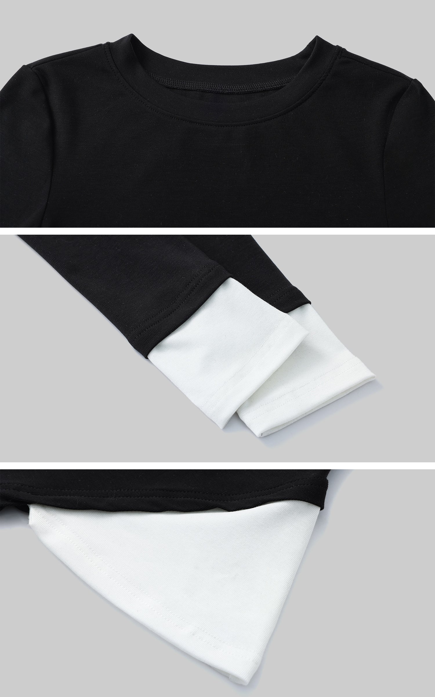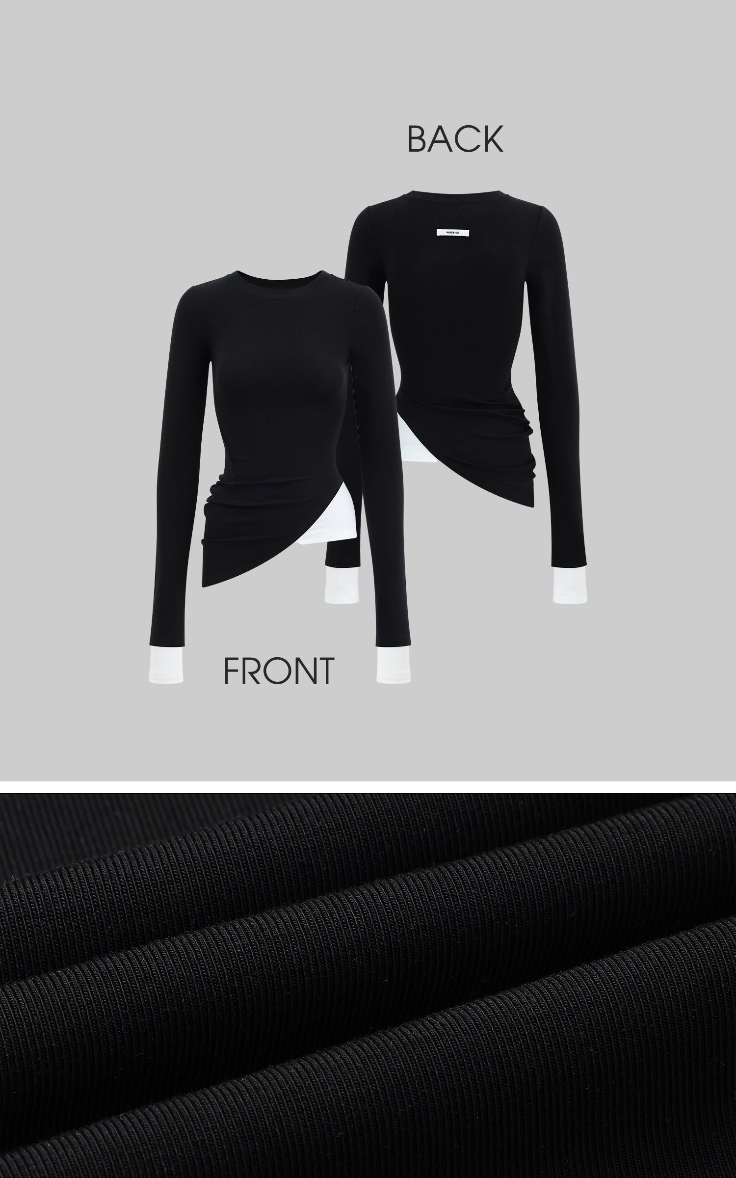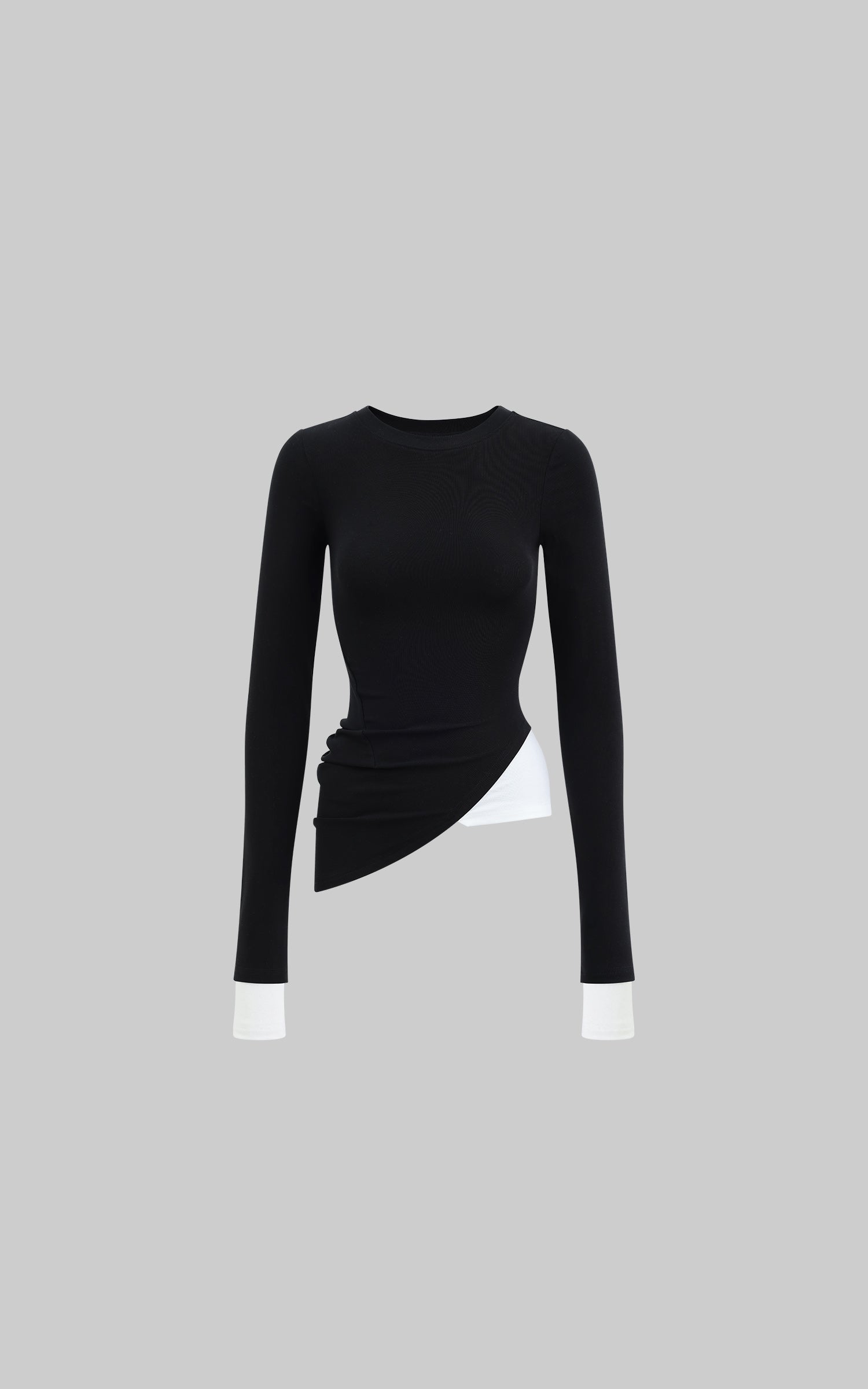 Redefining minimalism with a twist, this contrast-layered top embodies effortless sophistication. Featuring an asymmetric hem and contrasting cuffs, it creates a striking visual statement while maintaining a clean, tailored silhouette. Designed with a subtle ribbed texture and high-stretch fabric, it ensures a perfect balance of comfort and style. Layer it with oversized blazers or pair it with high-waisted bottoms for a bold yet versatile look that transitions seamlessly between casual and elevated streetwear.