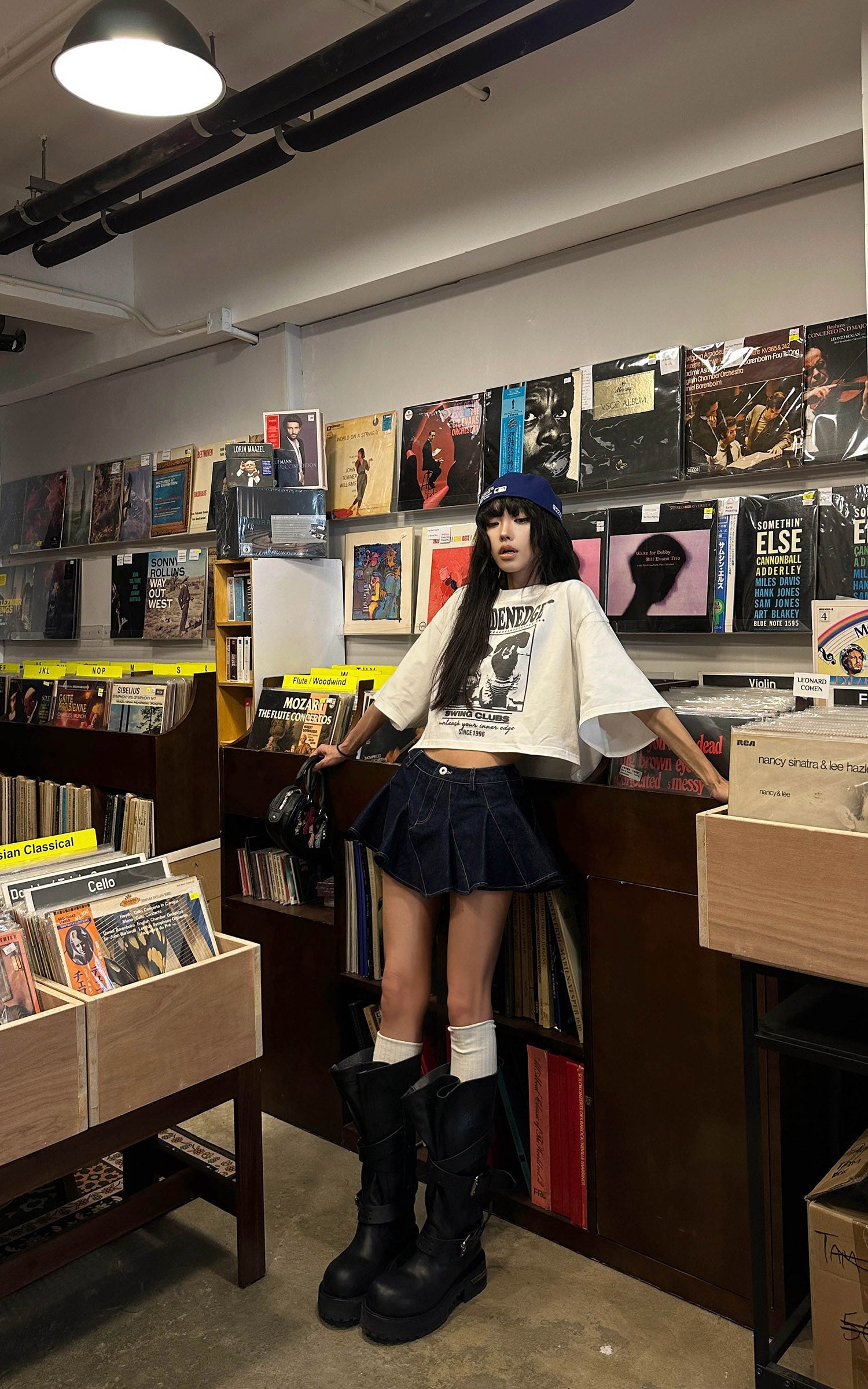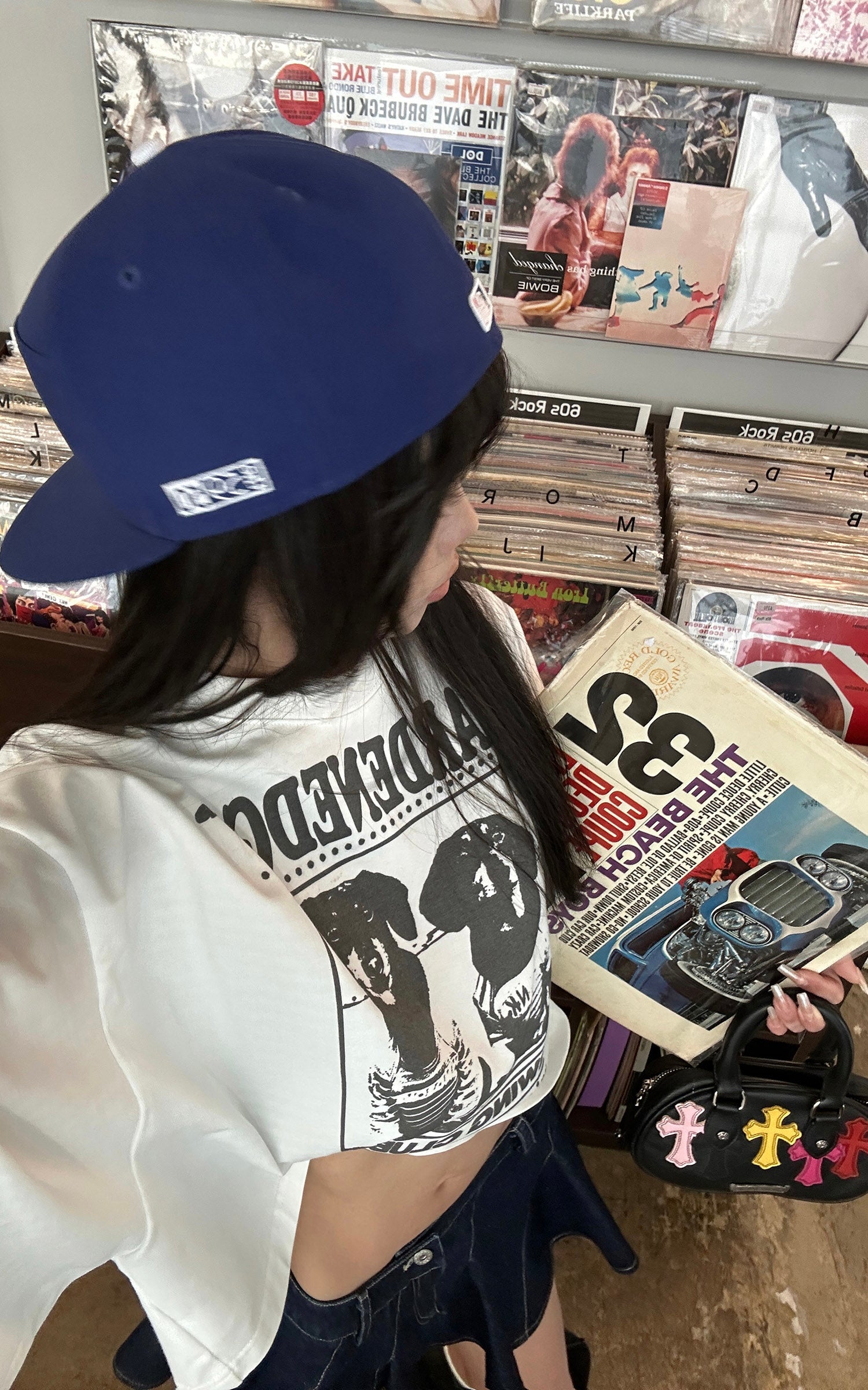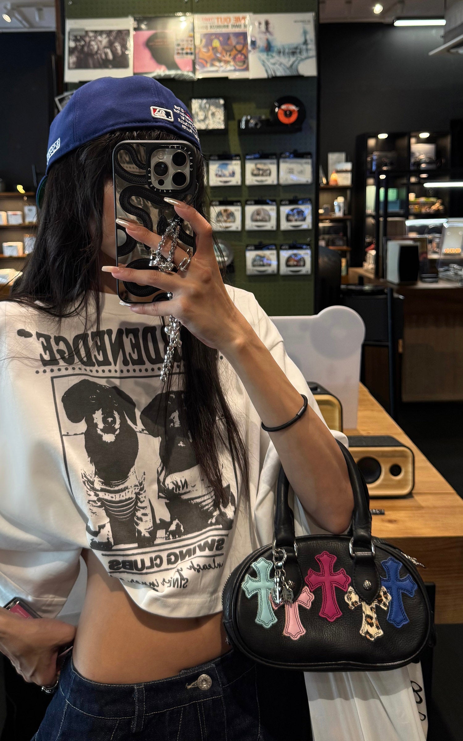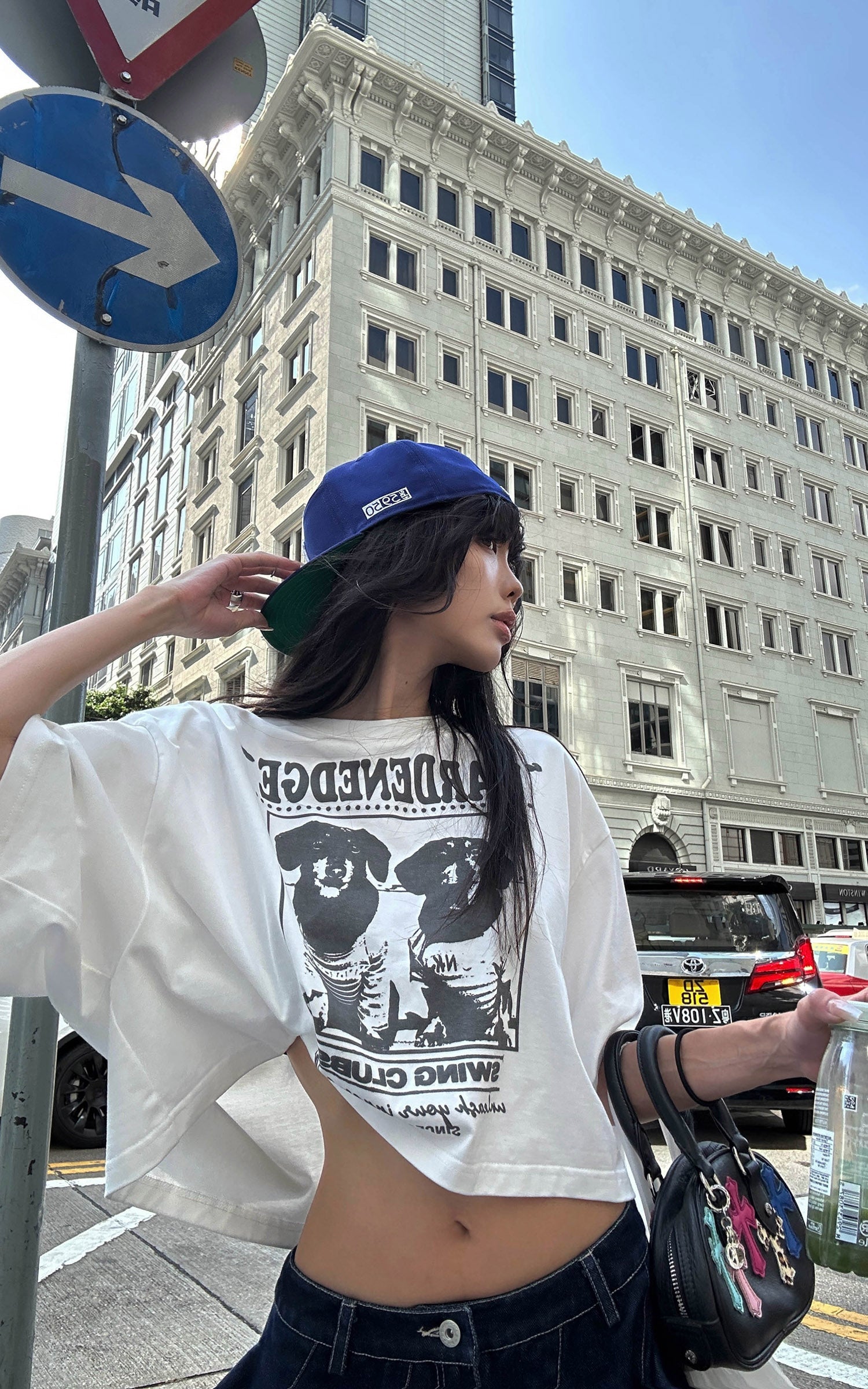 A cropped silhouette with oversized proportions and subtle attitude. This tee riffs on band merch iconography with a high-contrast dog duo printed front and center. The raw hemline and boxy fit evoke a bootleg energy—offbeat, lo-fi, and unapologetically direct. Meant to be worn loose, with denim or distortion.