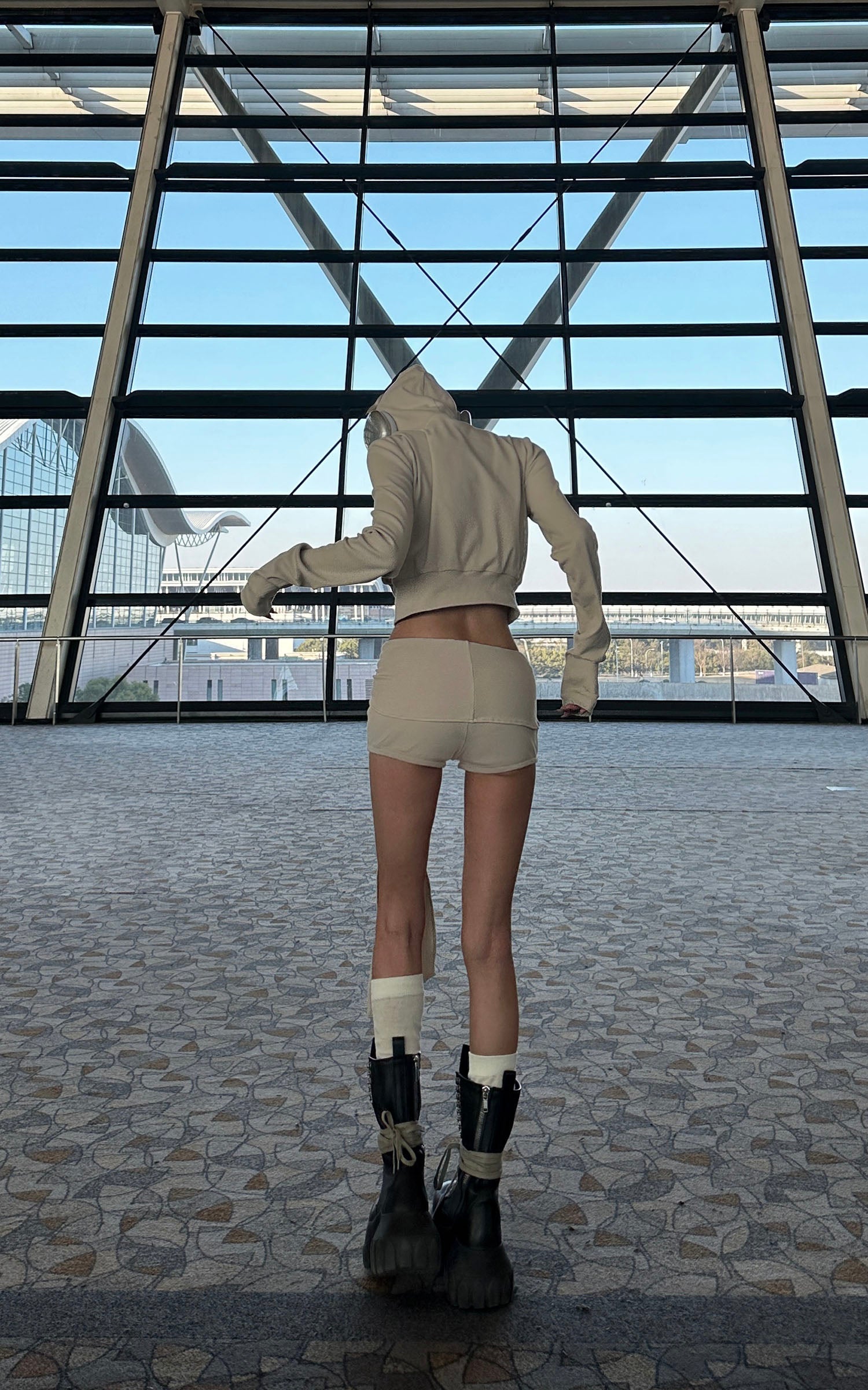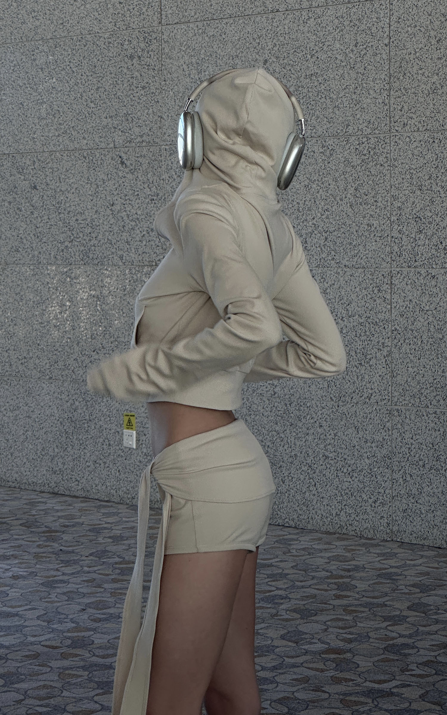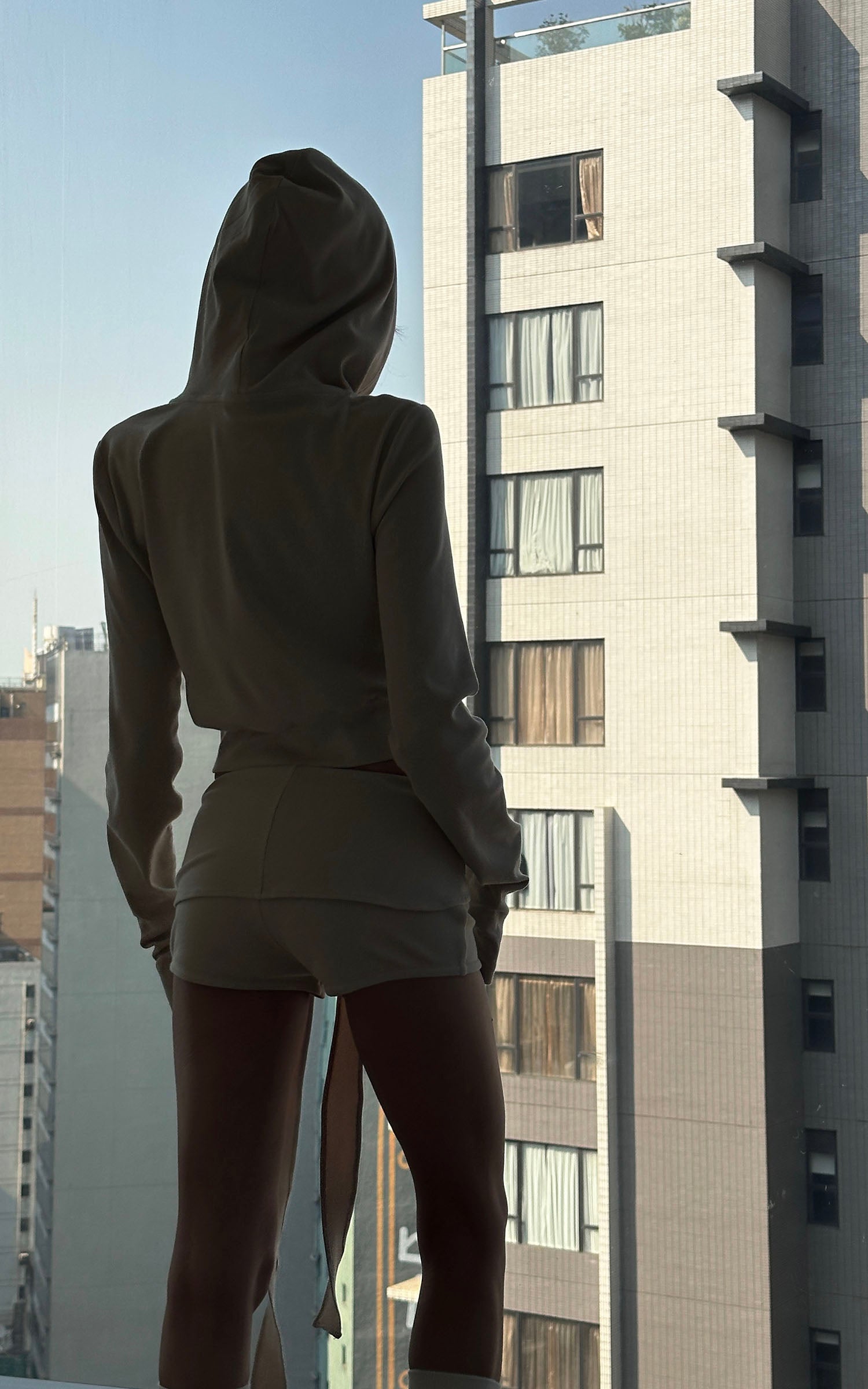 A redefinition of modern streetwear—this cropped hooded Henley and wrap shorts set is built for movement, attitude, and impact. The fitted ribbed fabric sculpts the body, while the cropped hoodie features an adjustable hood and buttoned neckline for versatile styling. The asymmetric wrap shorts create a striking silhouette, finished with an elongated sash that plays with movement. Designed for those who blur the line between casual and statement dressing, this set brings a bold edge to any wardrobe.