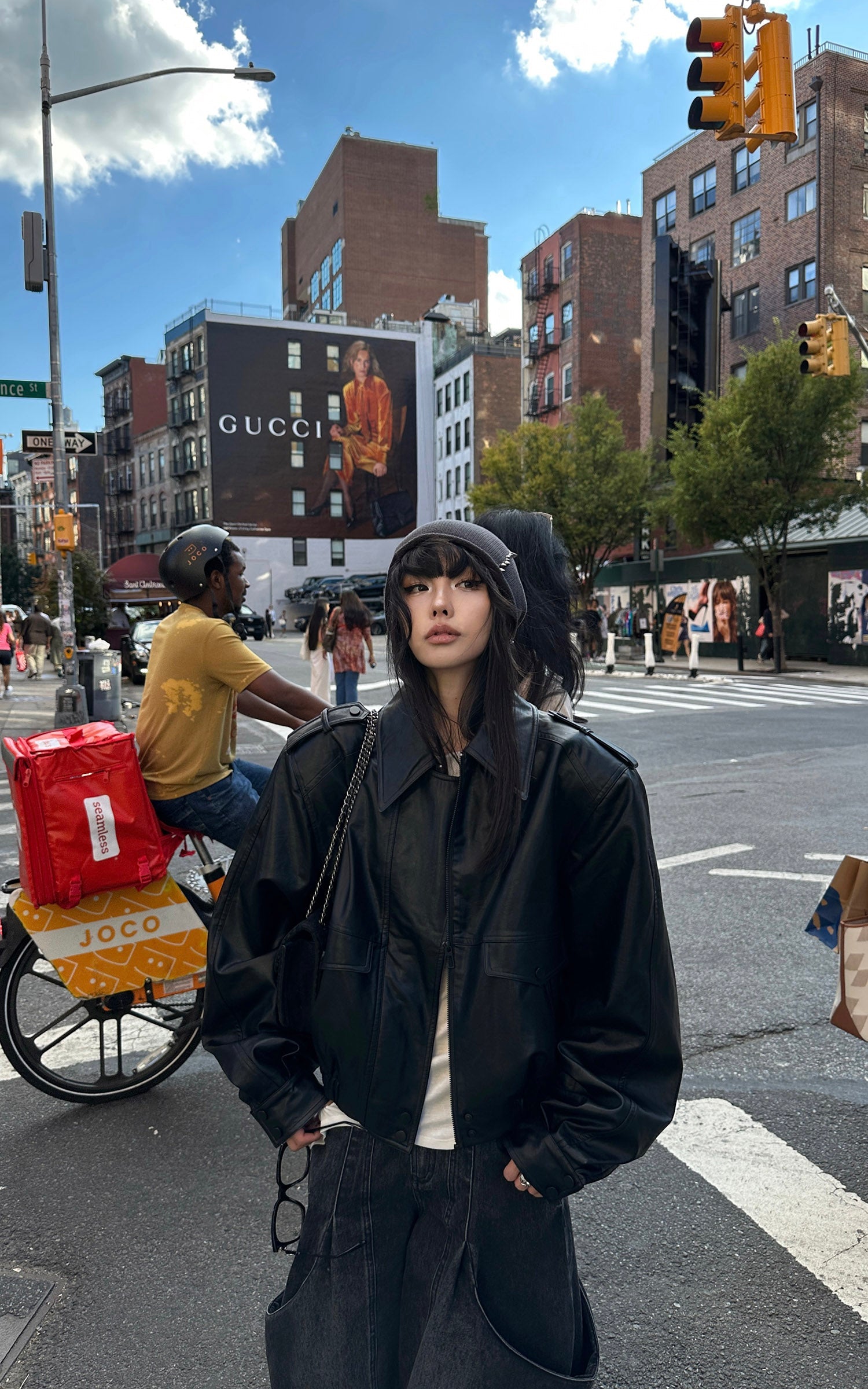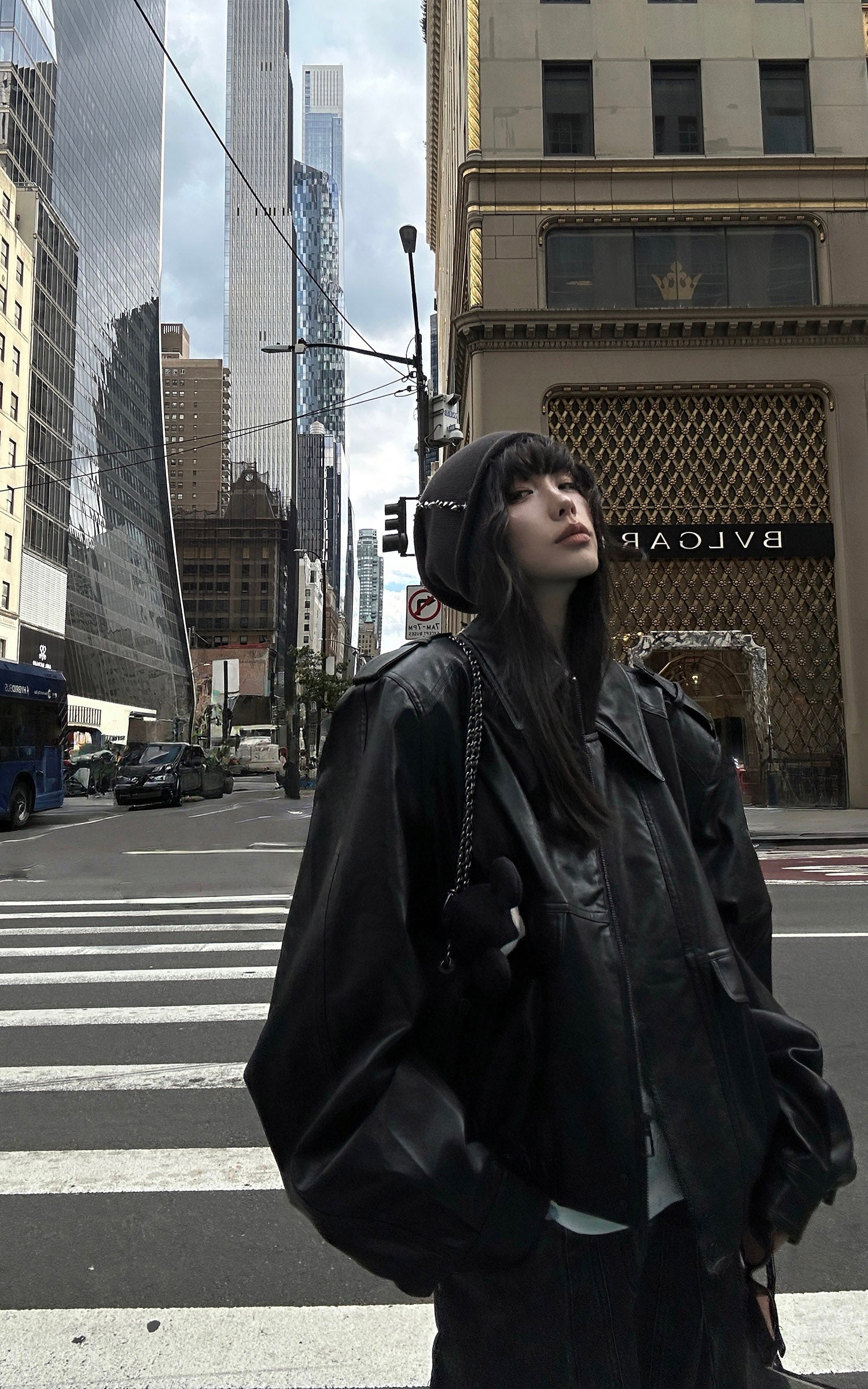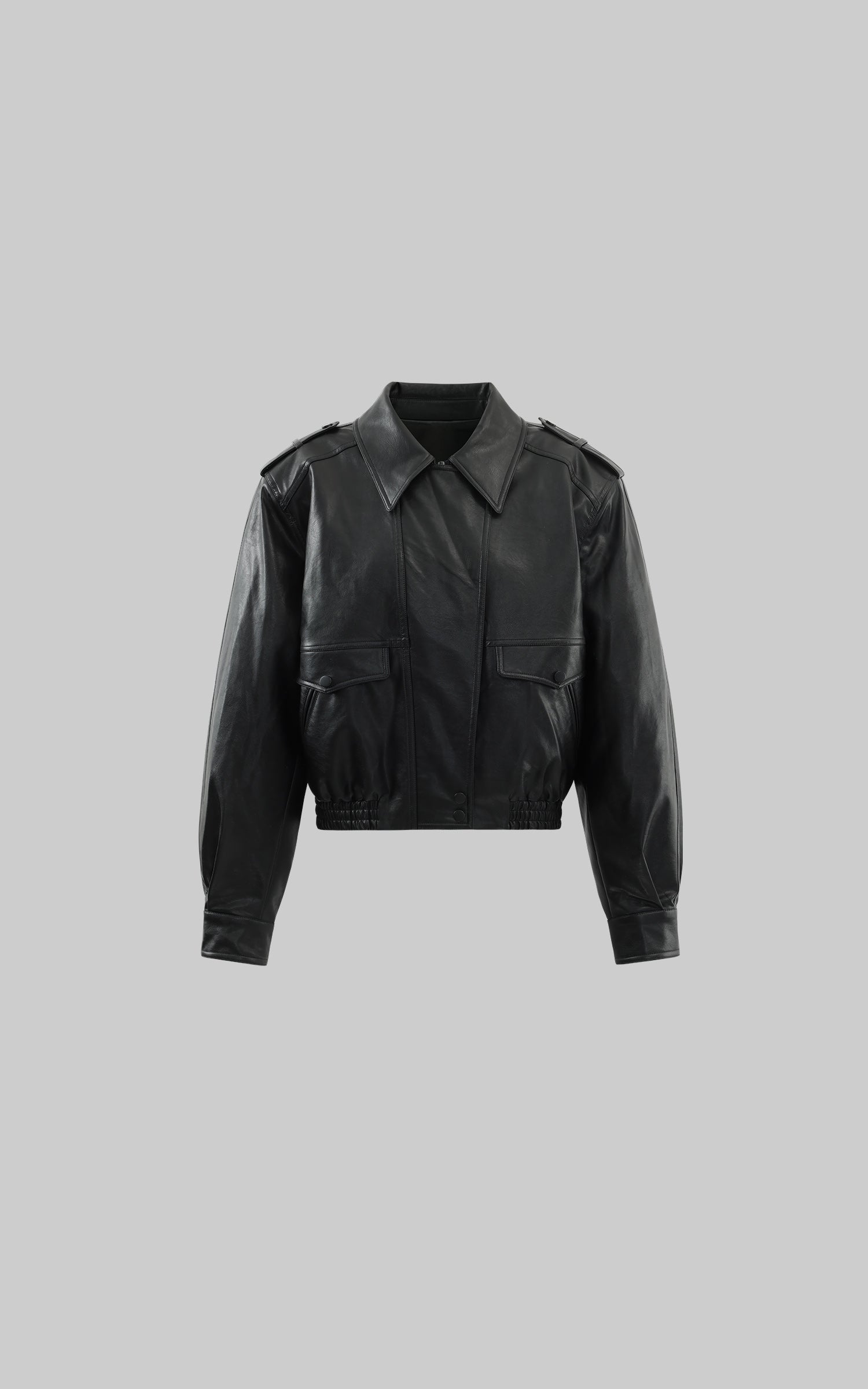 A structured leather jacket with a cropped cut and oversized shoulders, built on a sharp silhouette. Military-inspired epaulettes, flap pockets, and a concealed zip closure balance functionality with urban edge. The elasticated hem adds shape and volume, giving the piece a boxy yet refined proportion. Style it with relaxed denim or tailored bottoms for a statement layering essential.