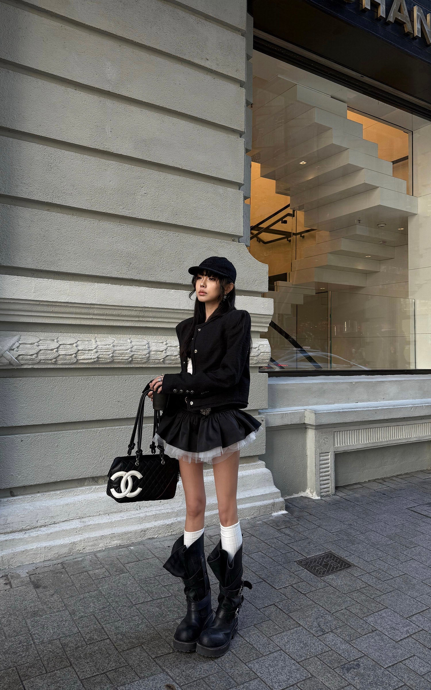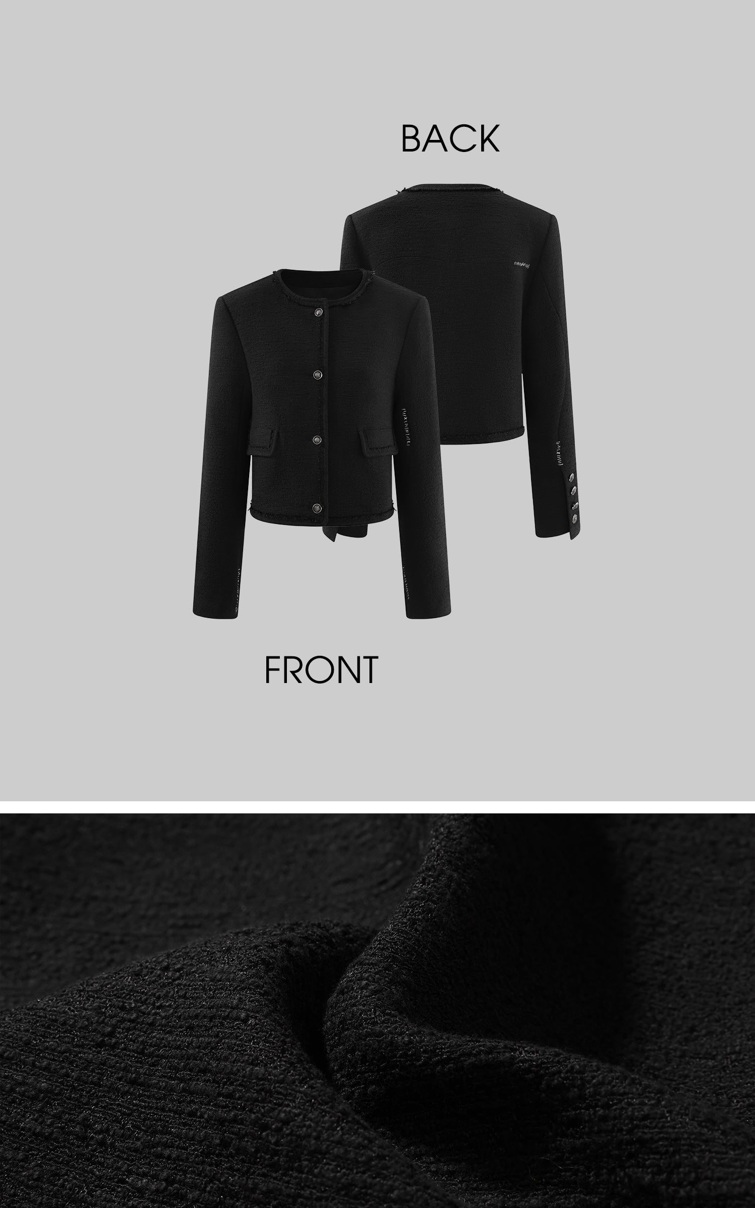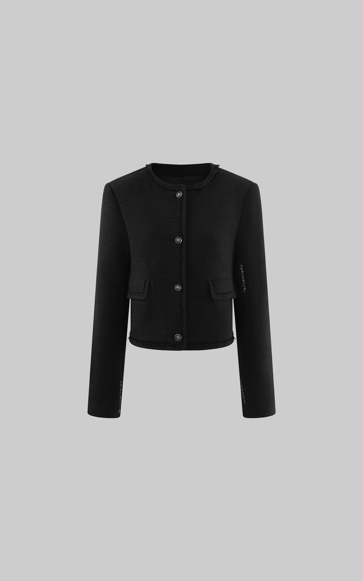 This cropped jacket is defined by a refined, architectural silhouette that balances structure with restraint. The round neckline softens the formality of classic tailoring, while subtly shaped shoulders create a clean, confident outline. Textured fabric adds depth and weight, complemented by a smooth inner lining for ease and comfort. Metal front buttons and detailed cuffs introduce a quiet sense of rhythm without excess. Designed to work as a statement layer or a precise finishing piece, it pairs effortlessly with minimal tops or layered silhouettes for a modern, understated edge.