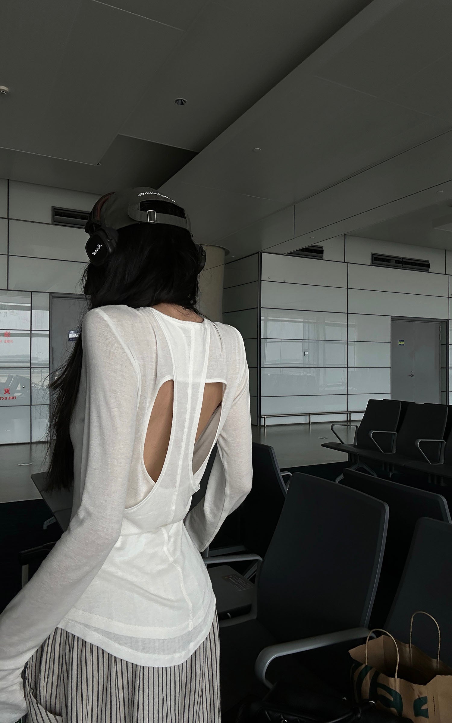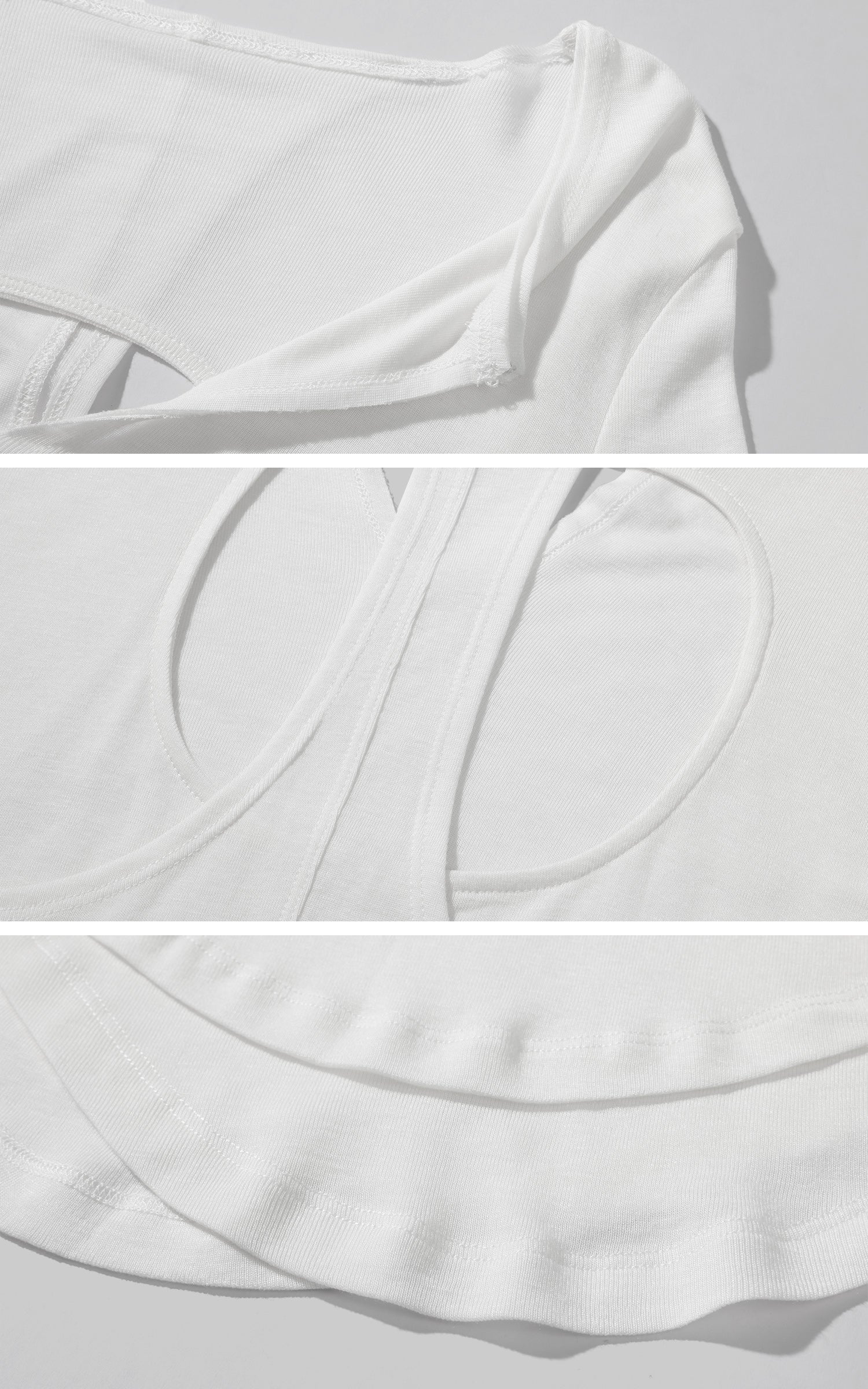 A minimal piece with tension in its cuts. The top features an asymmetrical neckline and a cutout back layered with a racerback tank insert. Slightly sheer, slim-fit, and elongated through the body, it skims the shape without restricting it. Finished with raw edge accents and curved hems—built for solitary movement, not perfection.