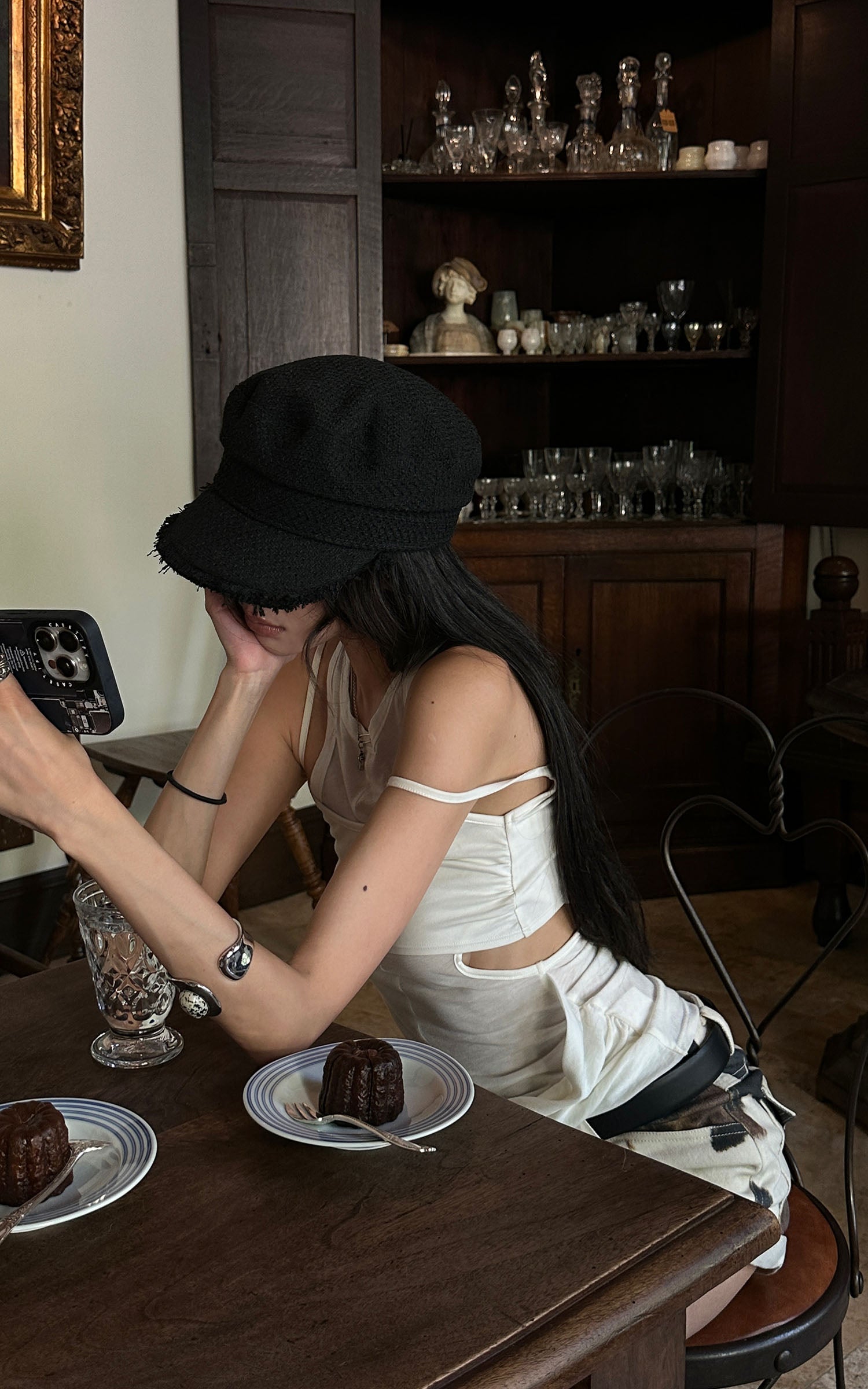 A deconstructed take on the everyday tank, featuring double strap detailing and a layered cutout silhouette. Crafted in a soft, lightweight stretch knit that drapes against the body, the design plays with proportion through its asymmetric hem and subtle side gathers. Perfect for pairing with statement bottoms or worn alone for a directional, street-ready look.