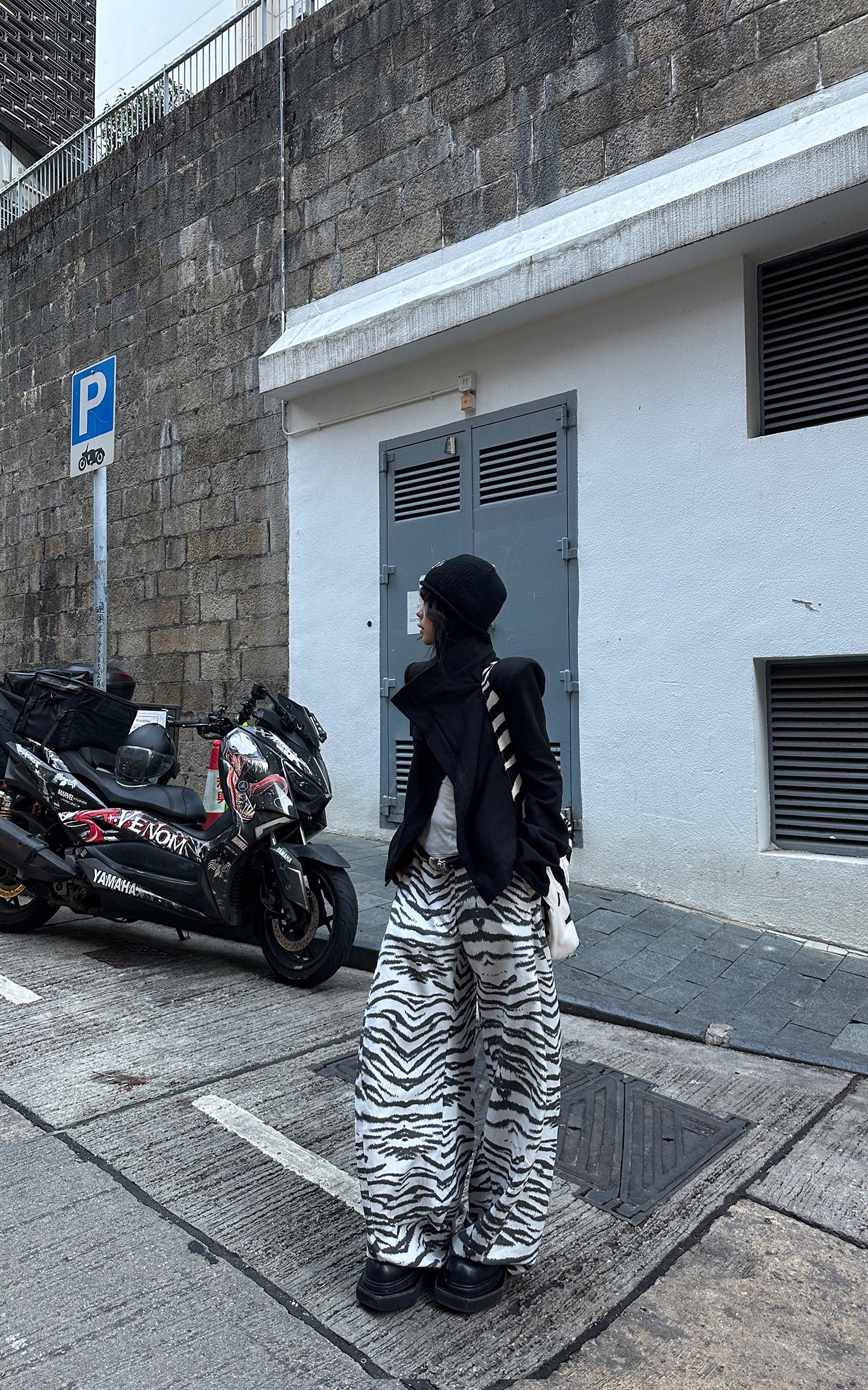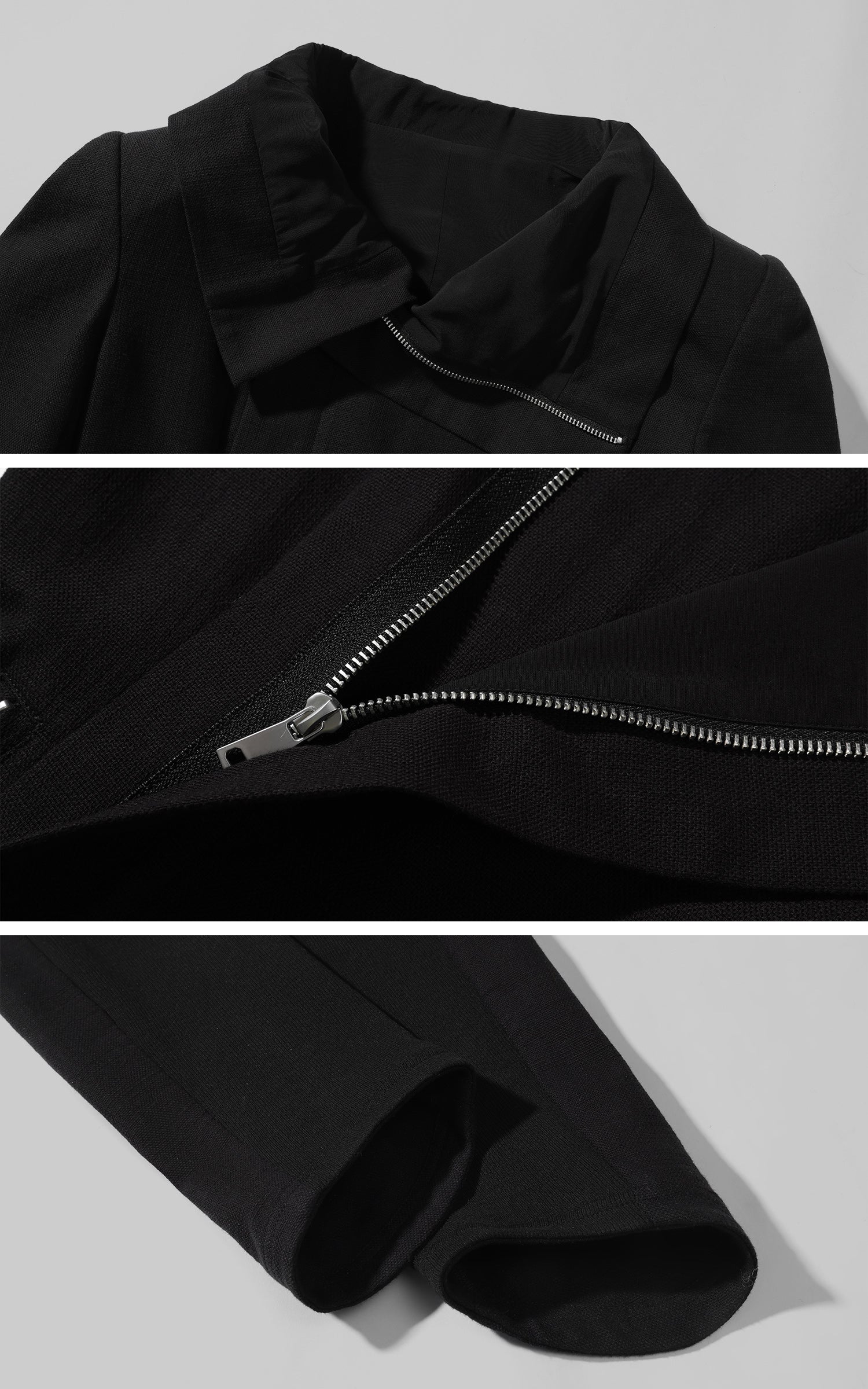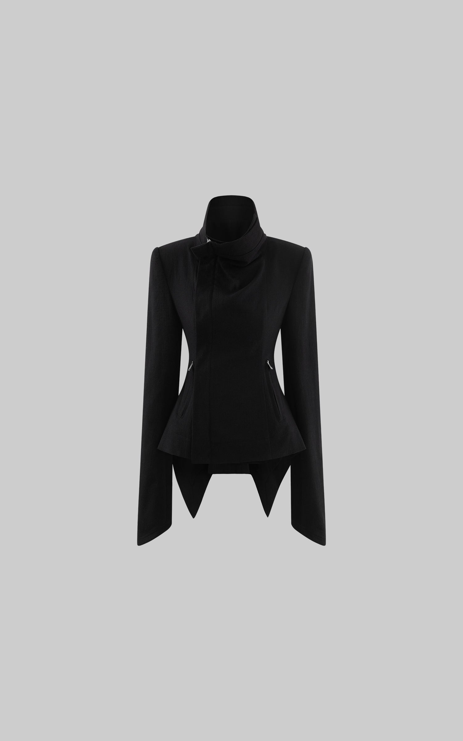 This jacket is shaped by deconstruction and directional tailoring. A sculpted high neckline folds into an asymmetric front, breaking conventional symmetry and guiding the eye through layered lines. Clean shoulders and a subtly contoured waist define a sharp yet controlled silhouette, while discreet zip details introduce a quiet utilitarian edge. The irregular extended hem adds movement and depth, creating contrast between structure and flow. Designed to stand alone or balance wide-leg bottoms, the piece delivers a composed, architectural presence with an unmistakably modern attitude.