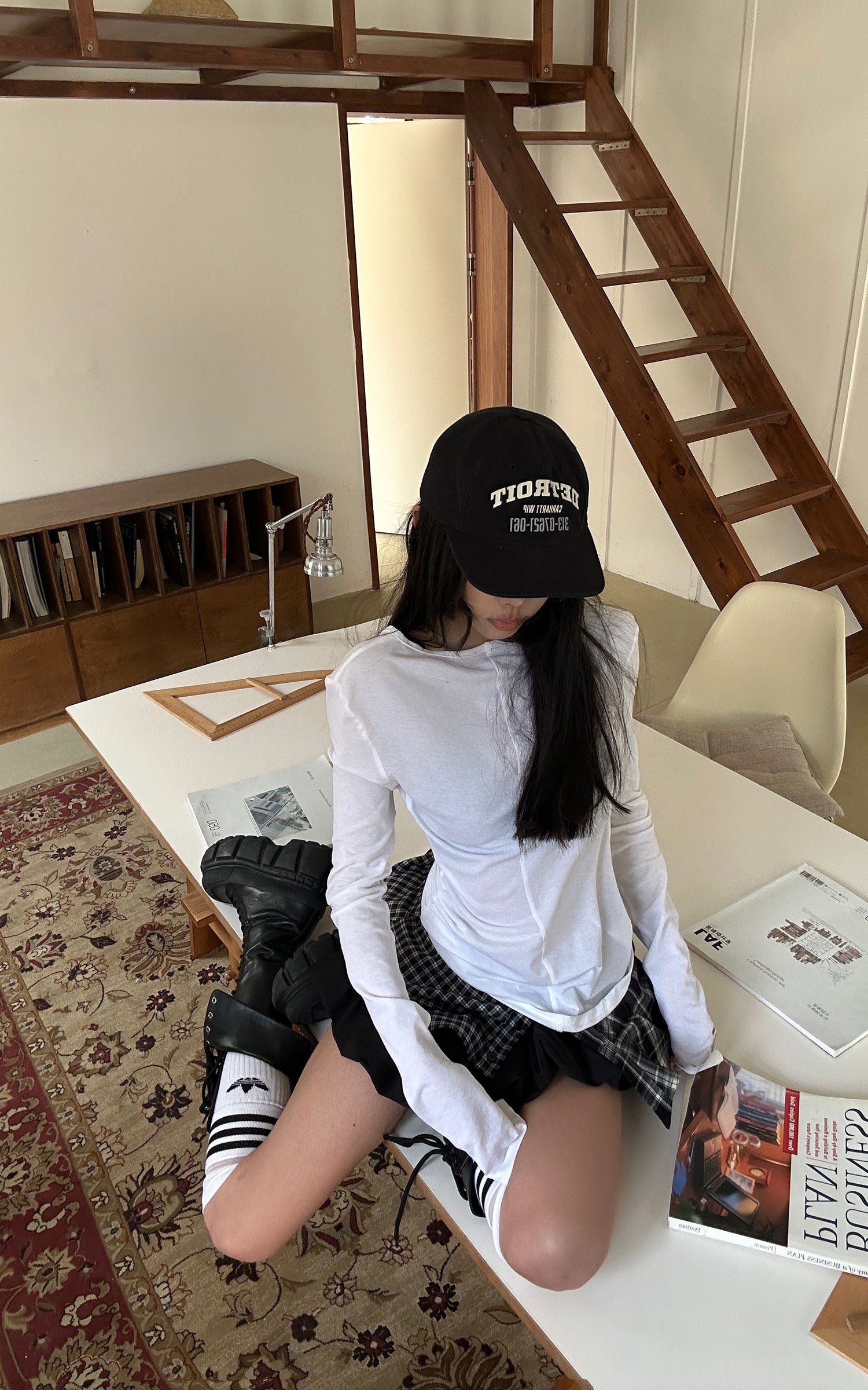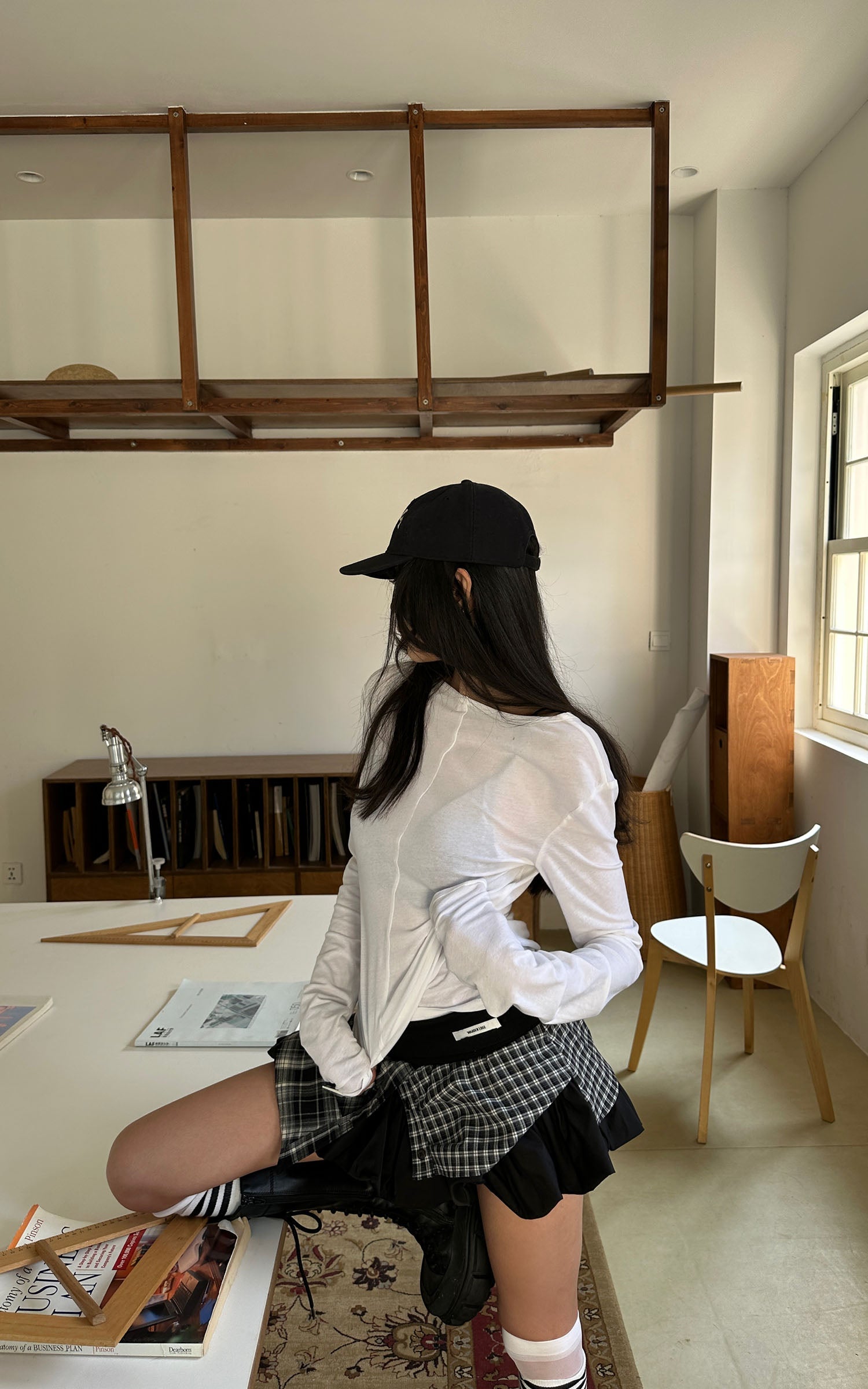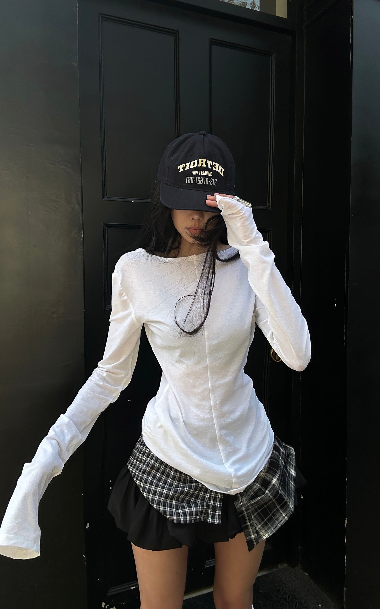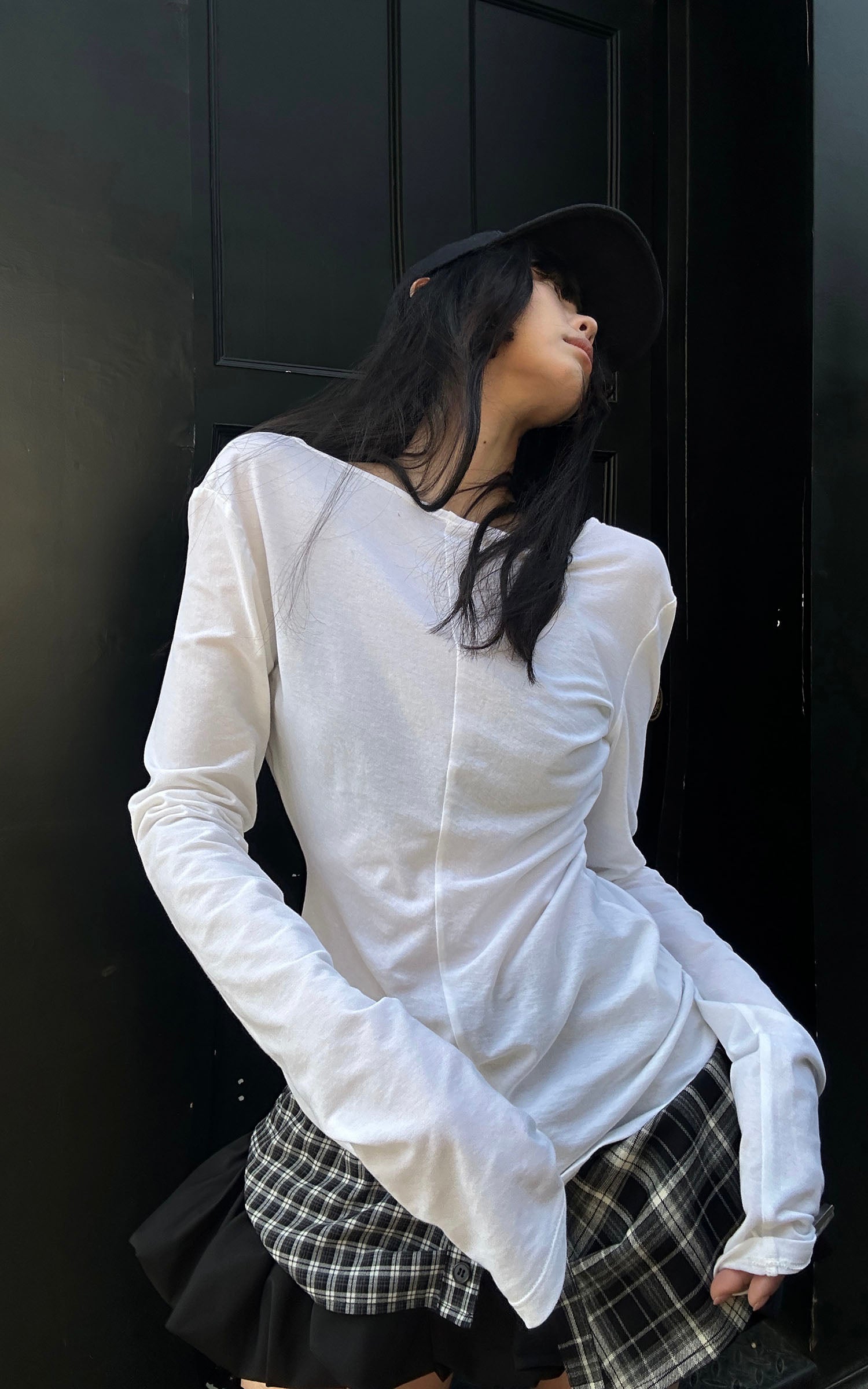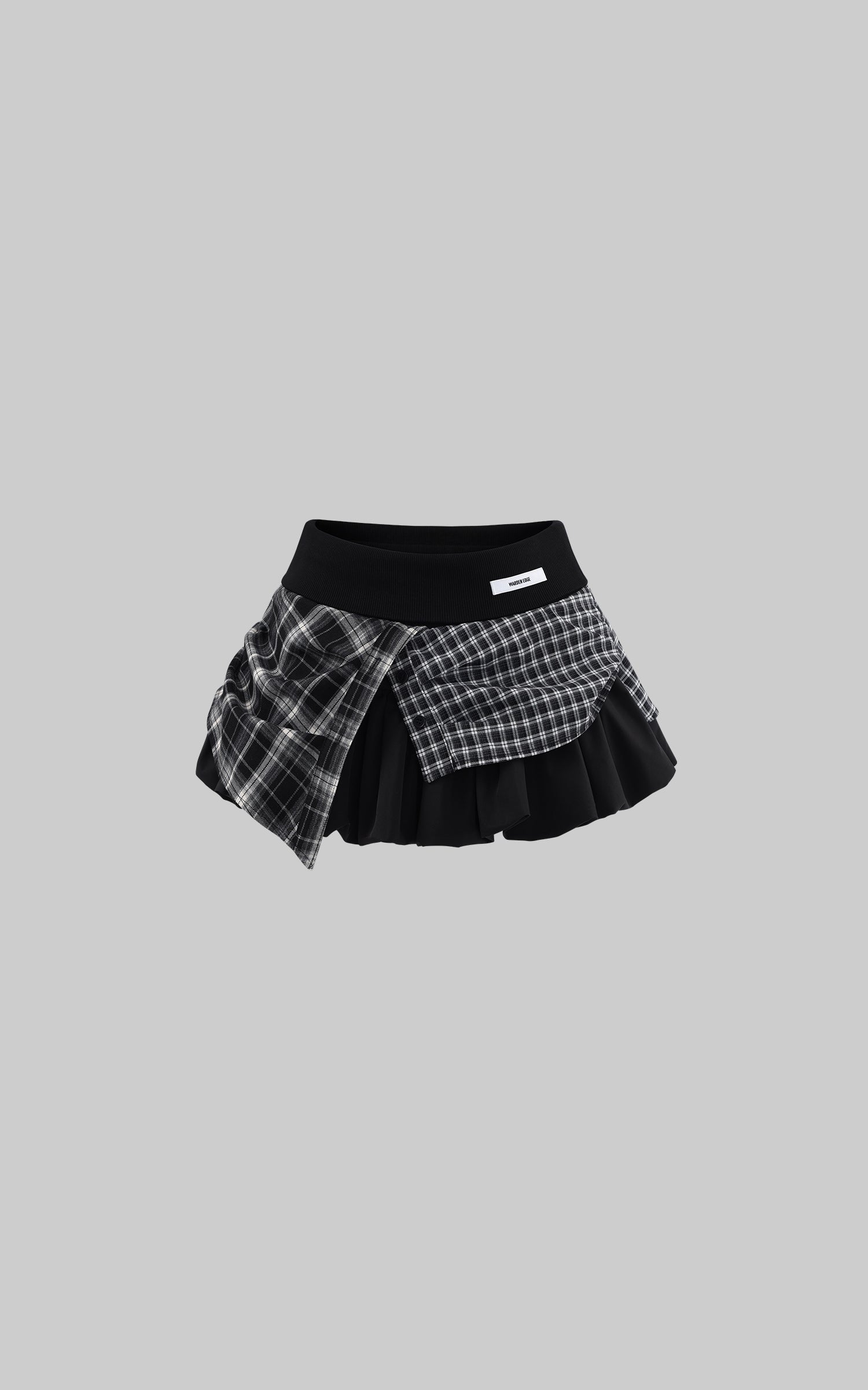 Designed through a deconstructed lens, this mini skirt fuses plaid panels with sharp pleated layers for a controlled yet disruptive silhouette. The high-rise elastic waistband defines the waist while allowing fluid movement. Asymmetrical overlays create visual tension with every step, balancing structure and rebellion. A statement piece that anchors modern street styling, confident, precise, and unapologetically bold.