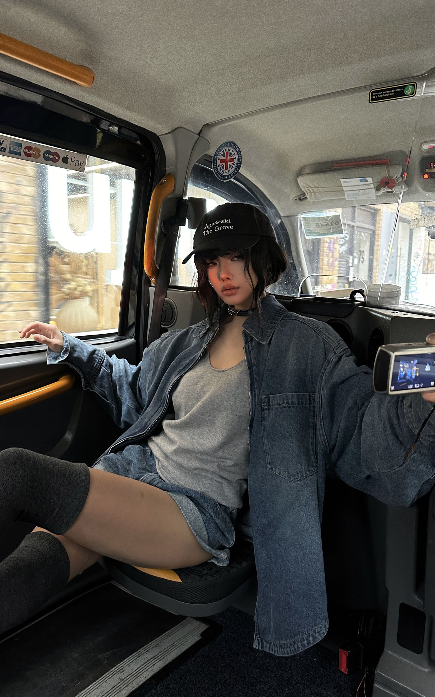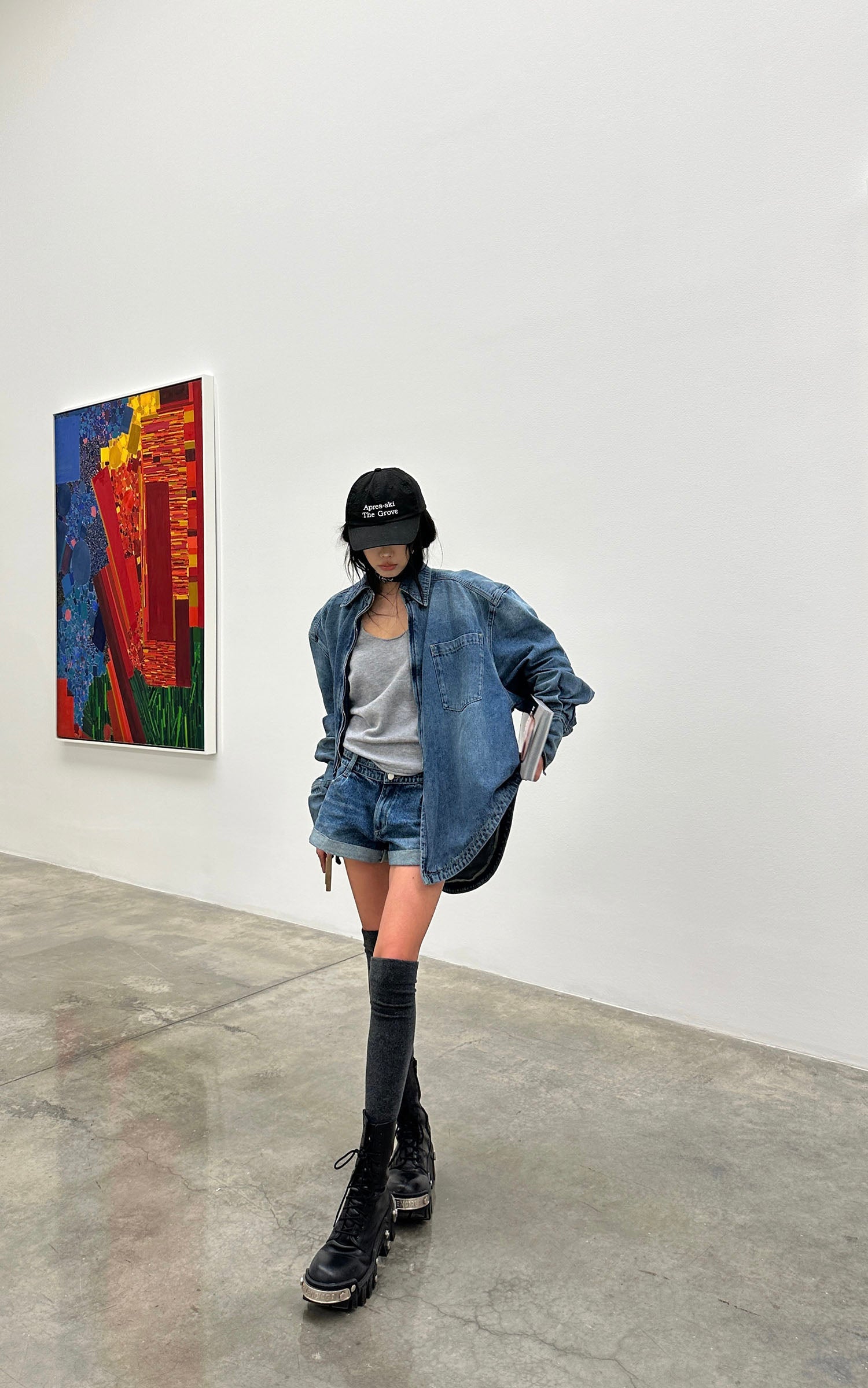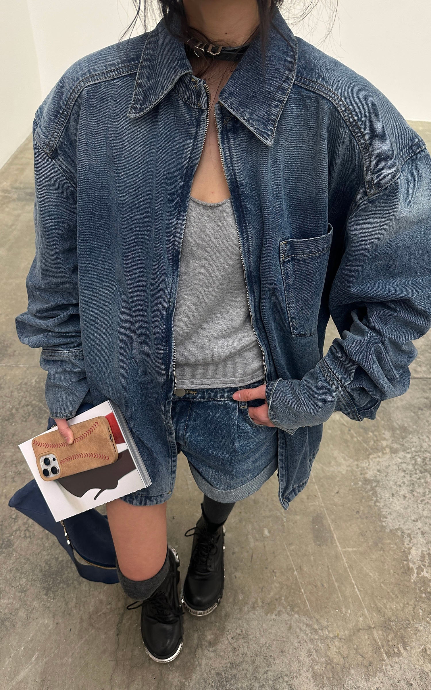 A layered composition of rugged denim meets raw elegance. This set, crafted in deep-washed denim, redefines contemporary casualwear with an oversized jacket, relaxed shorts, and a minimalist racerback tank. The jacket drapes loosely, offering a fluid silhouette with a structured collar and precise topstitching. The high-waisted shorts maintain a laid-back aesthetic, accented with rolled cuffs and a subtle worn-in fade. The ribbed-knit tank provides an understated contrast, amplifying the effortless cool. A synthesis of movement, structure, and textural intrigue—each piece in this set invites reinterpretation.