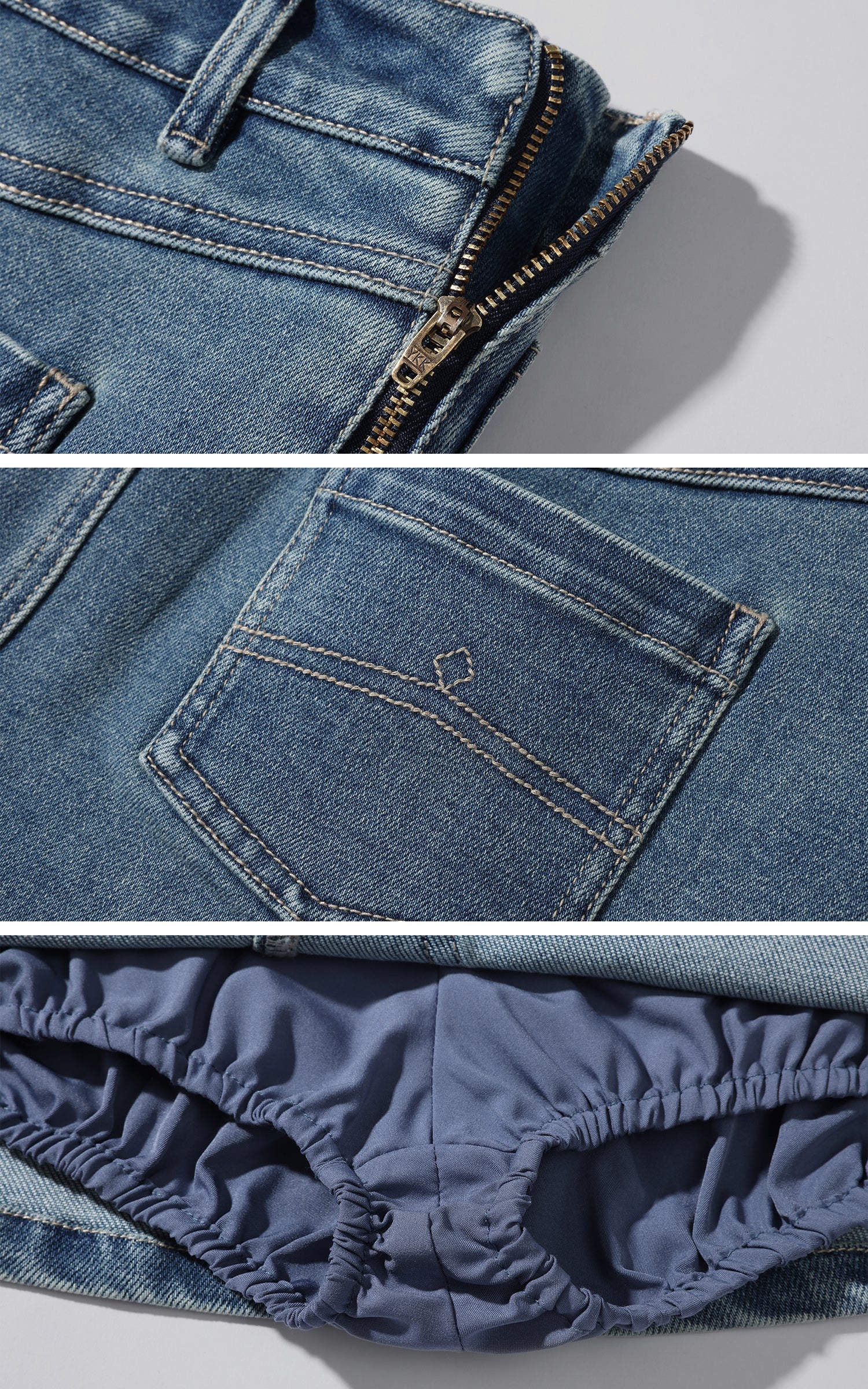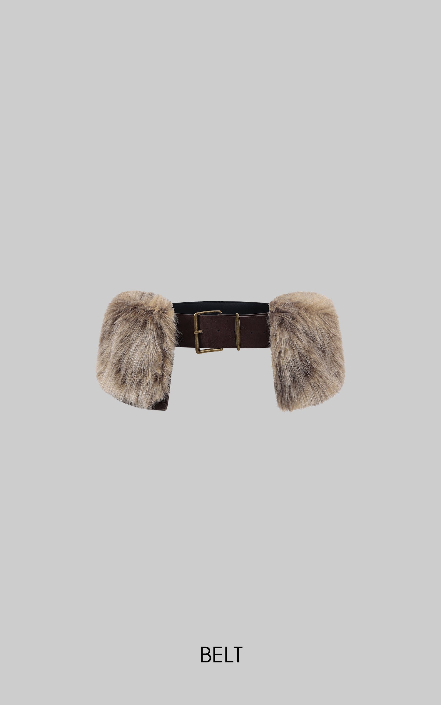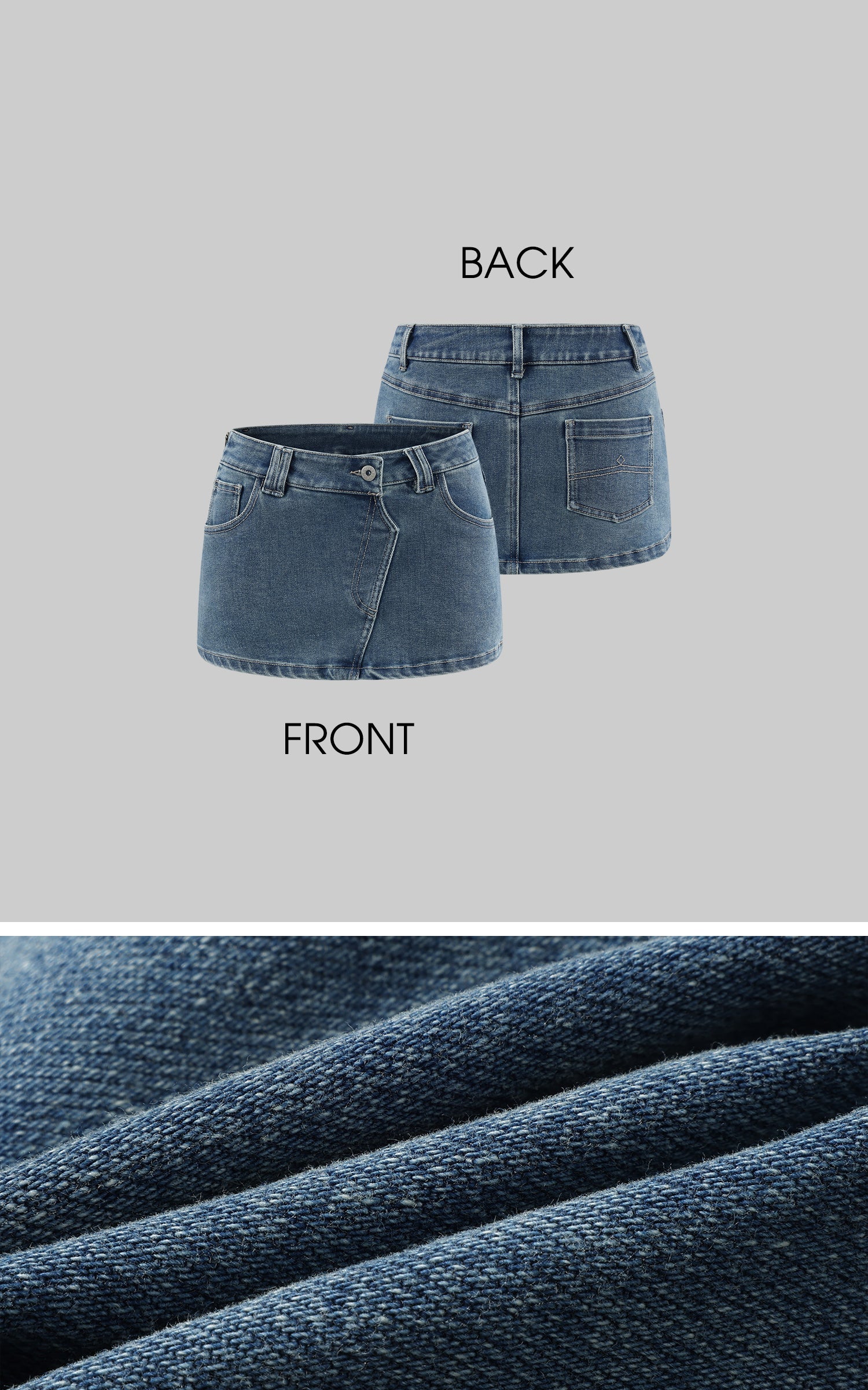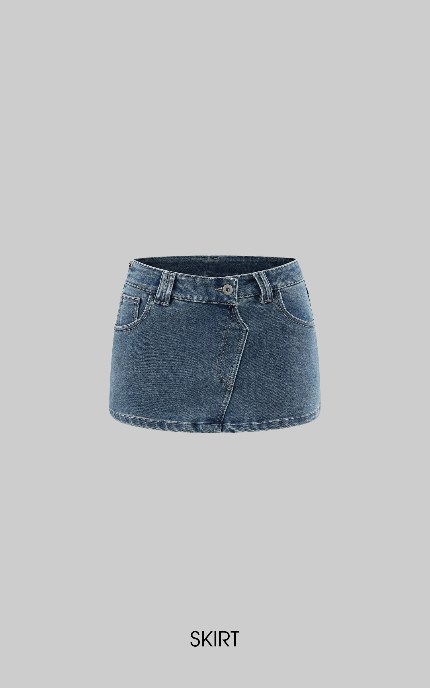 A low-rise denim mini skirt built with a sculpted silhouette and a raw, utilitarian tone. Washed blue denim and a clean front panel create a sharp, minimal line, while the attached faux-fur belt detail brings contrast and textural disruption. The inner elastic shorts add comfort and stability, making it easy to move while maintaining a controlled, sleek profile. A piece designed for layered winter looks, mixing rugged tactility with a modern, off-duty attitude.