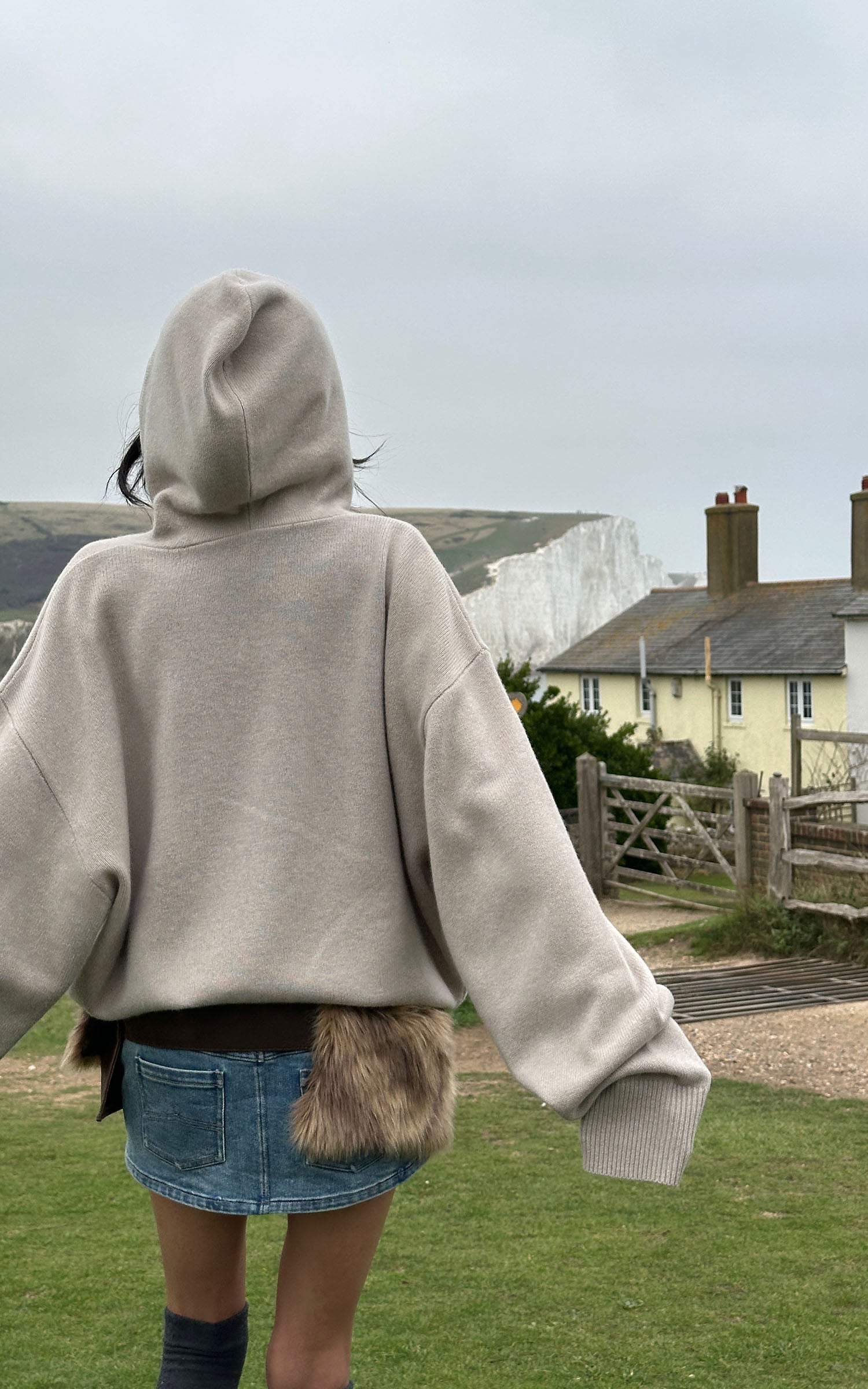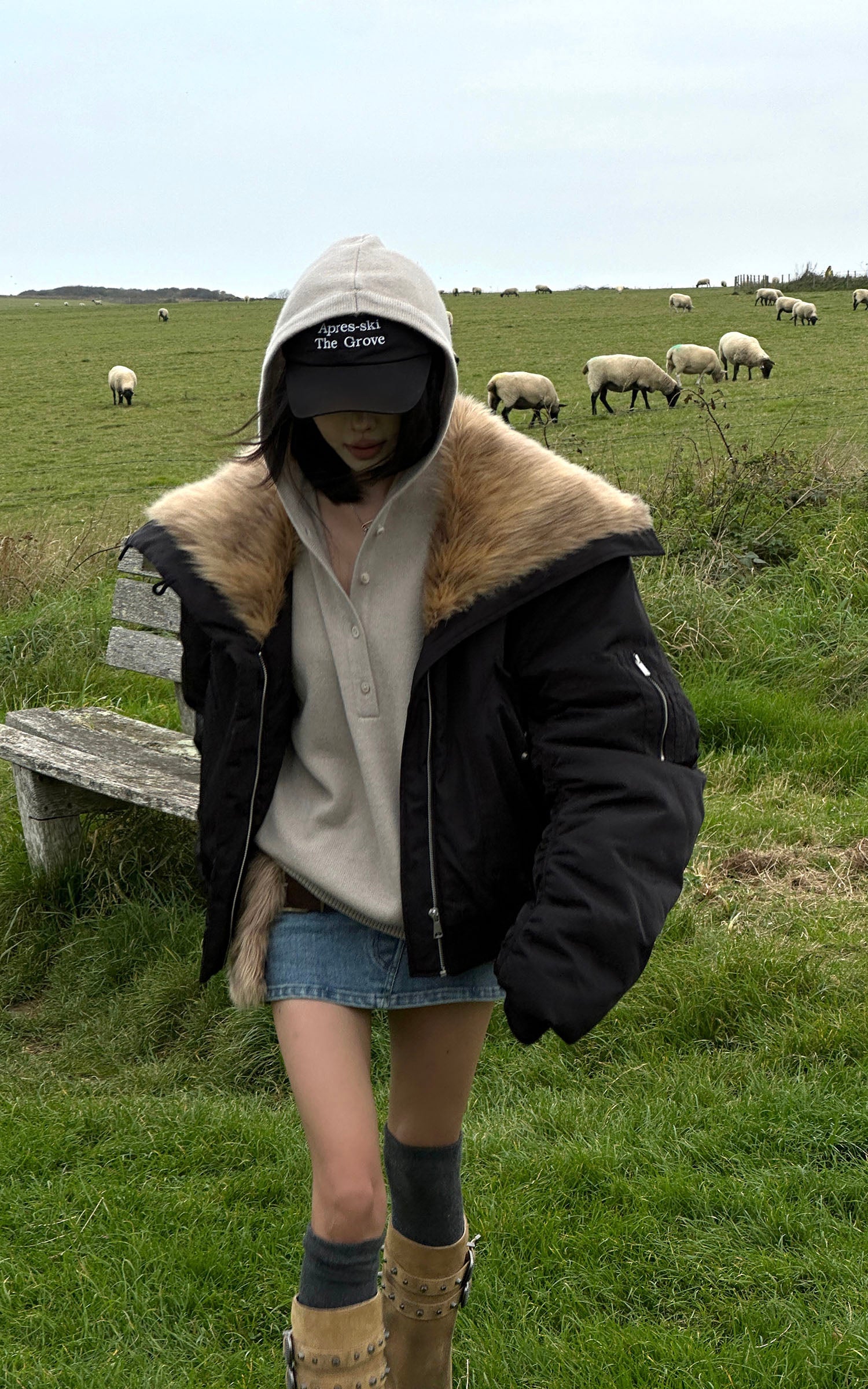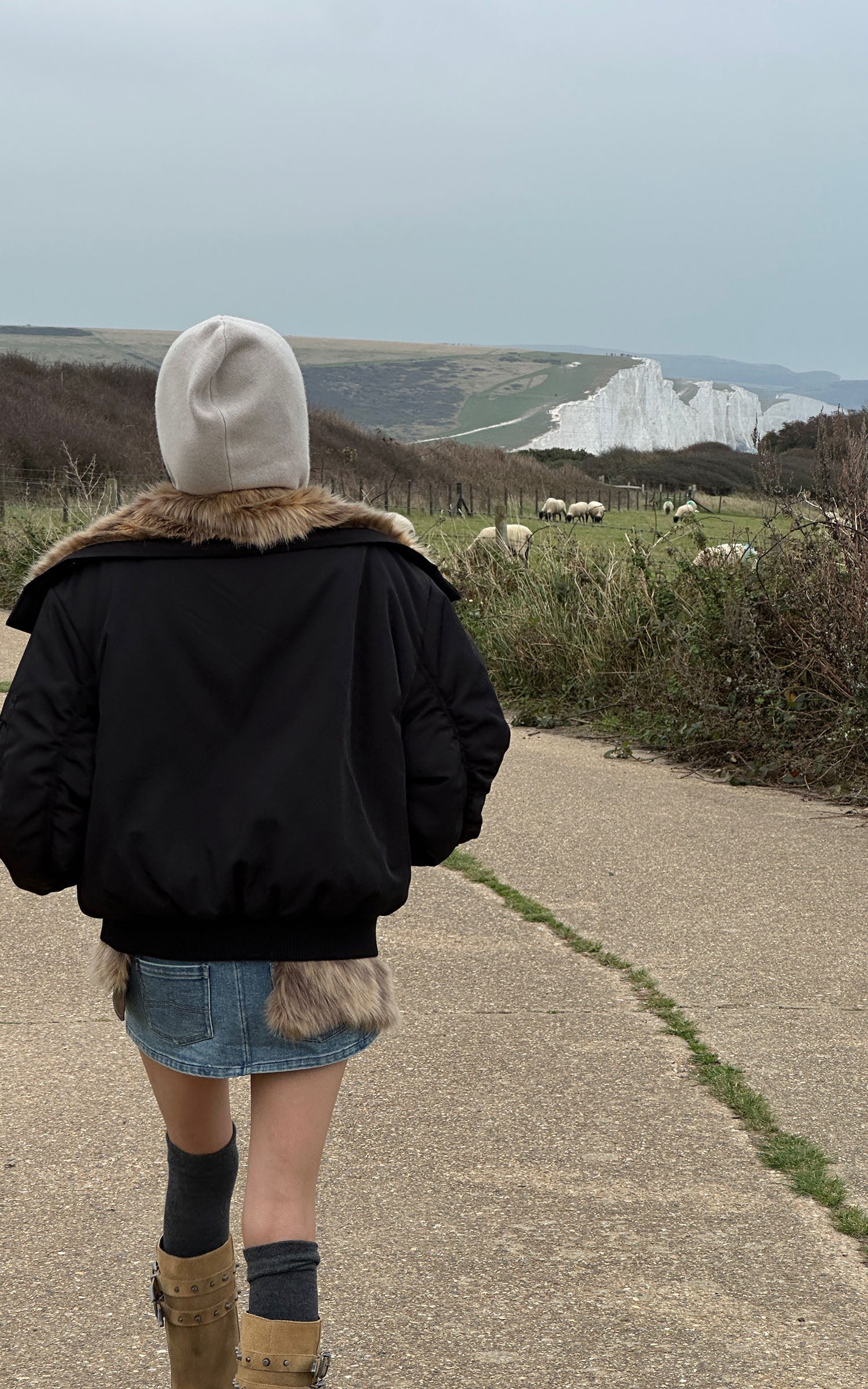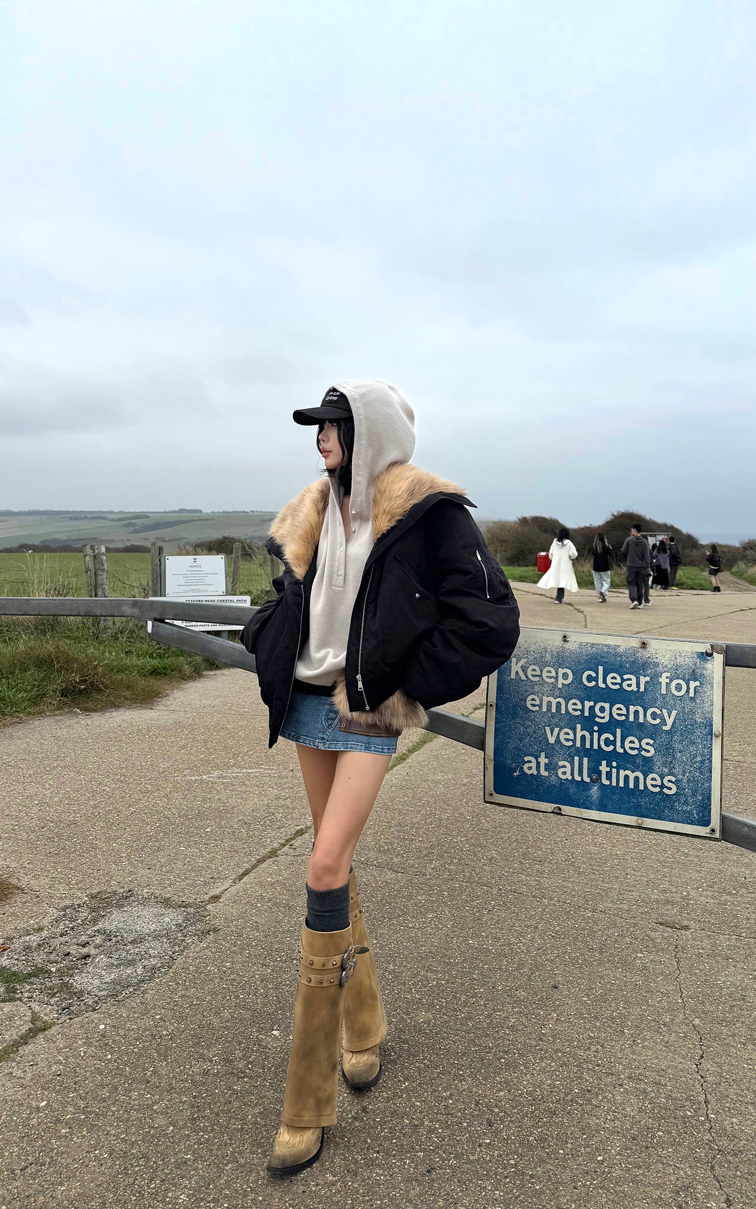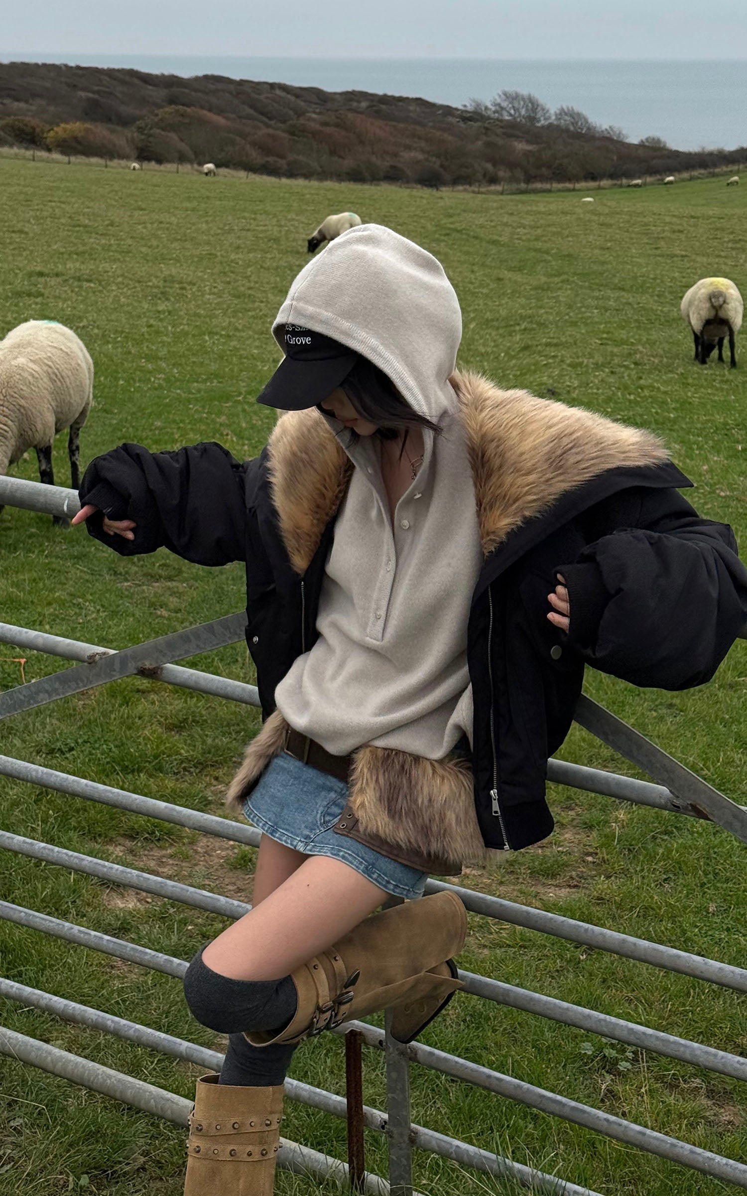 A low-rise denim mini skirt built with a sculpted silhouette and a raw, utilitarian tone. Washed blue denim and a clean front panel create a sharp, minimal line, while the attached faux-fur belt detail brings contrast and textural disruption. The inner elastic shorts add comfort and stability, making it easy to move while maintaining a controlled, sleek profile. A piece designed for layered winter looks, mixing rugged tactility with a modern, off-duty attitude.