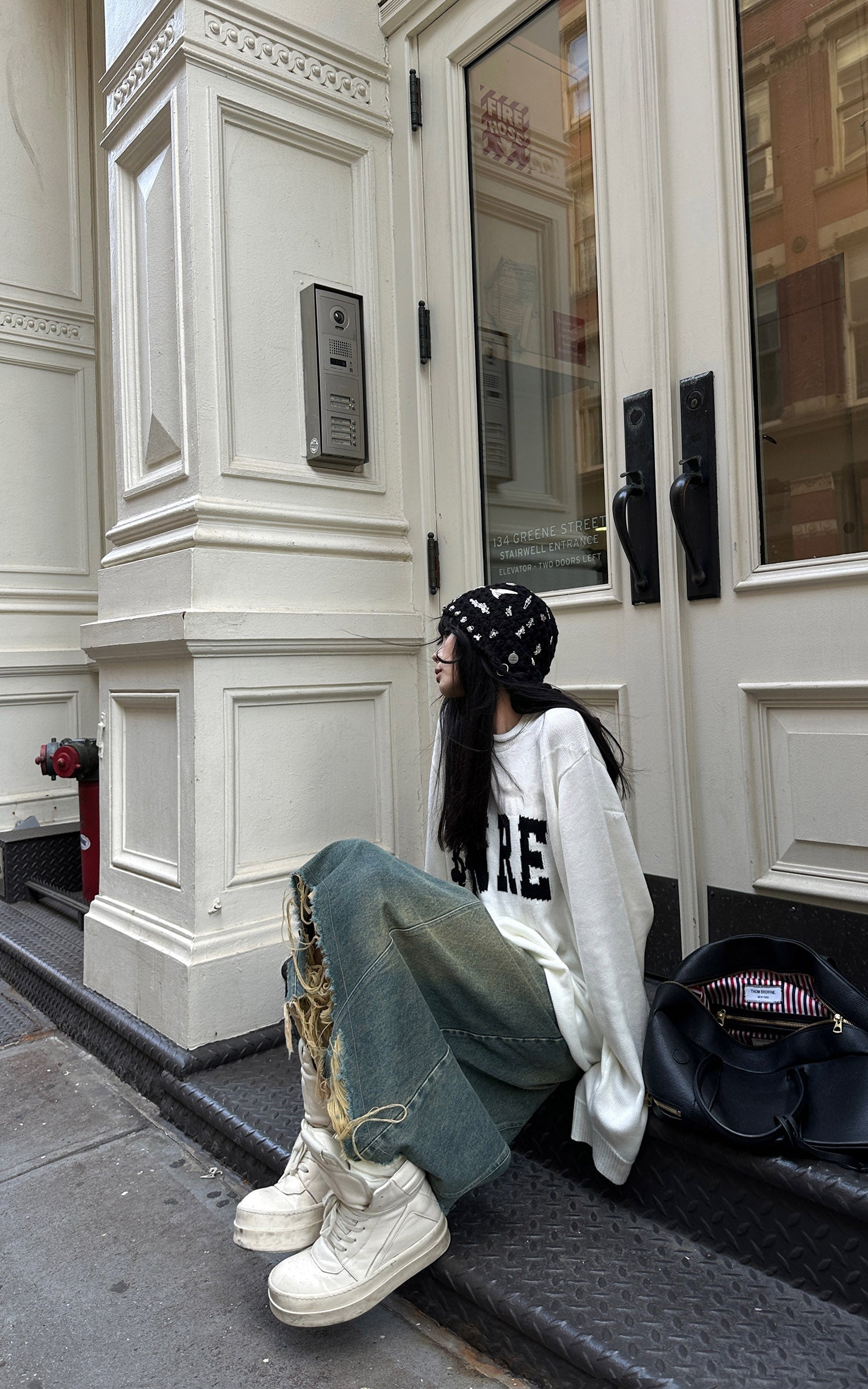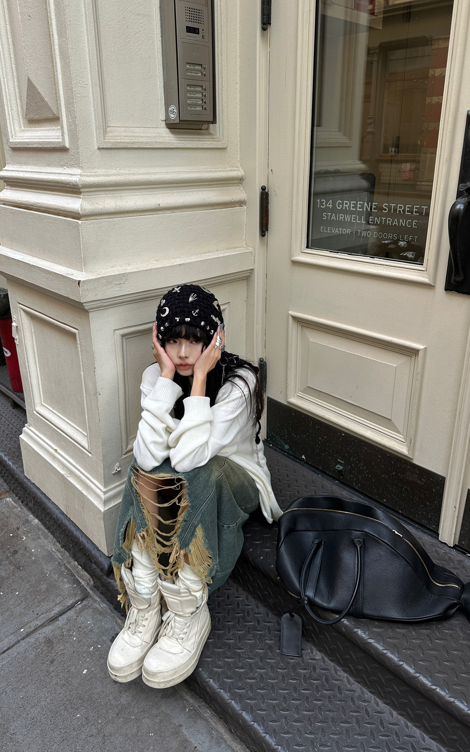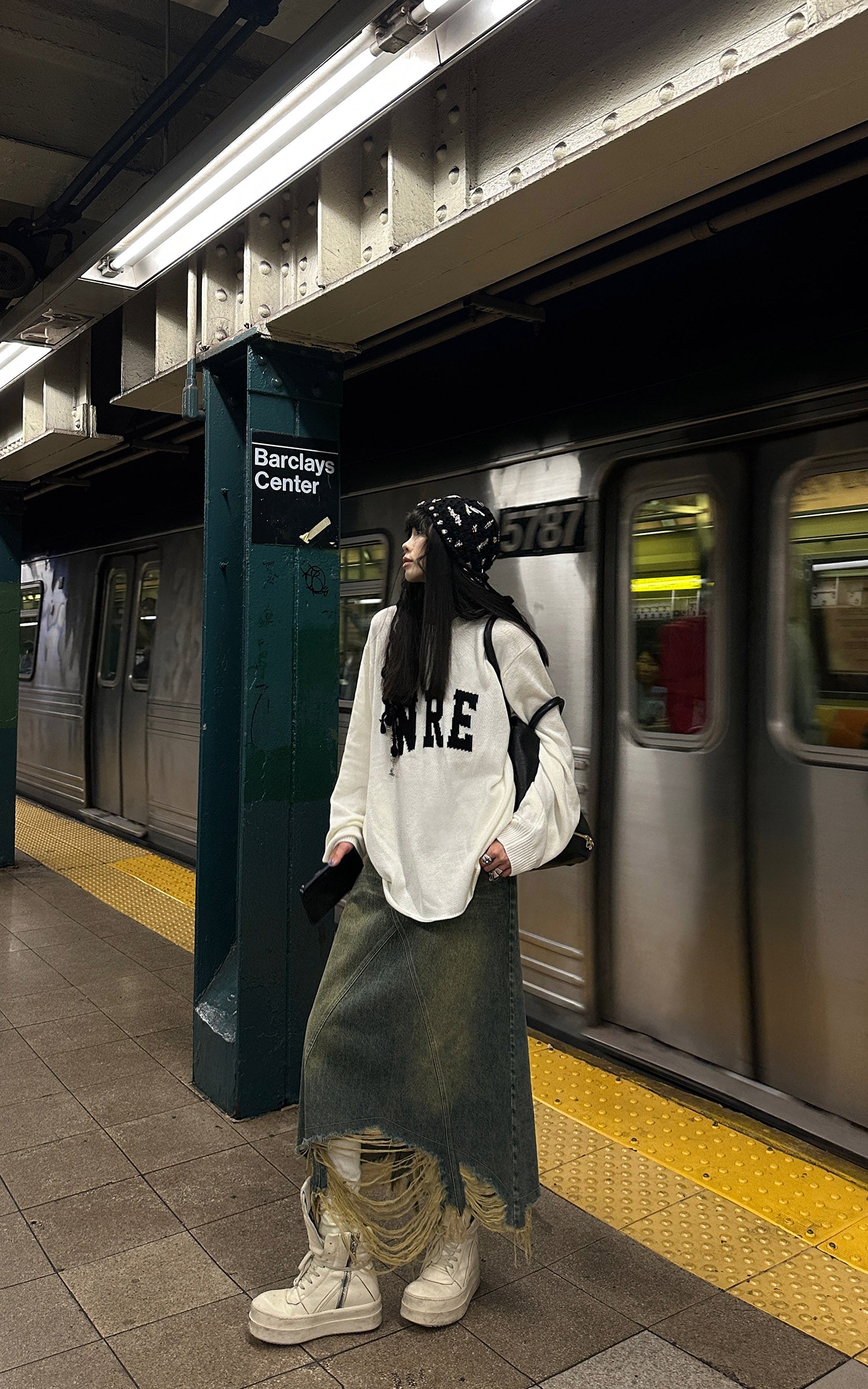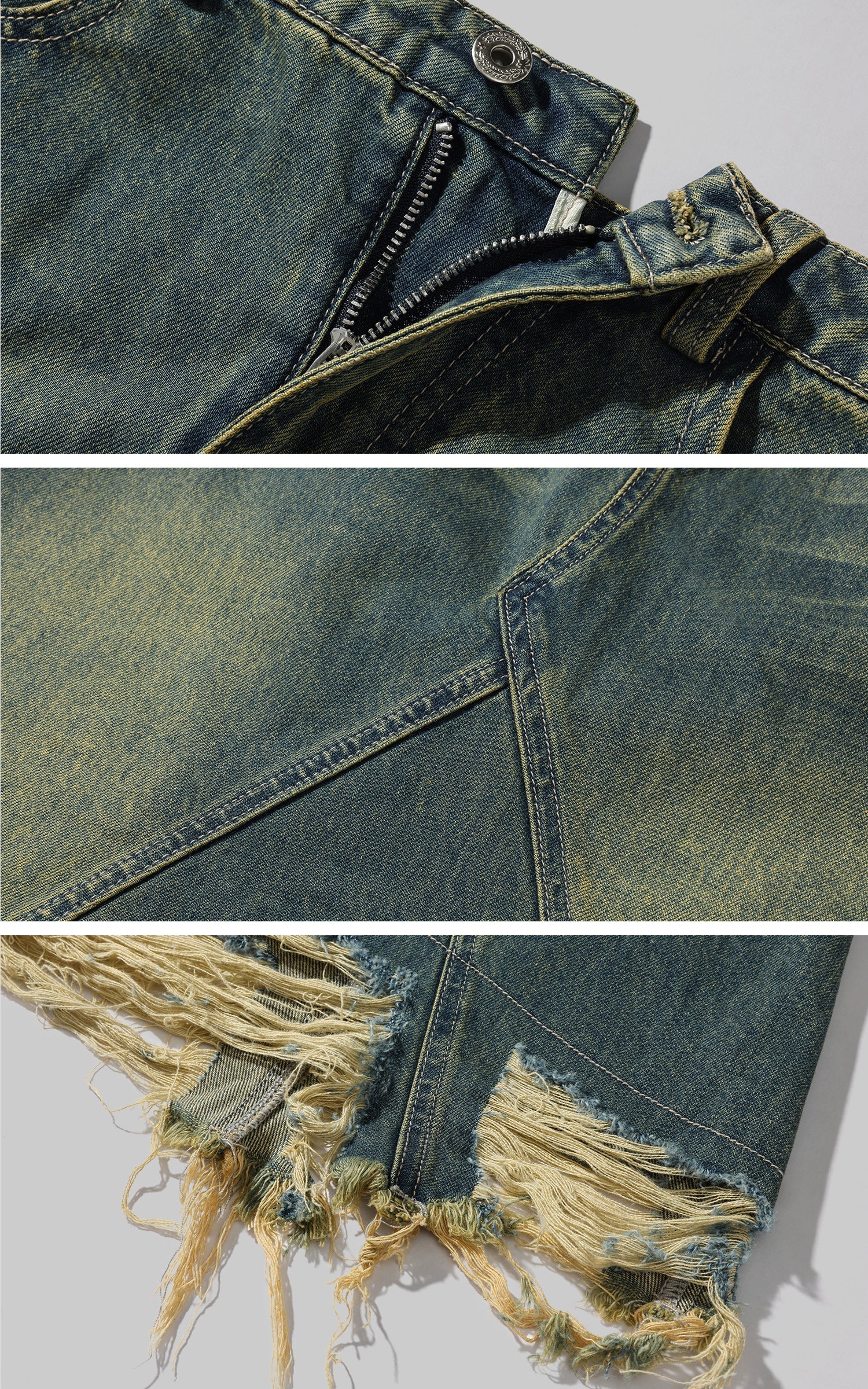 A raw interpretation of denim—this skirt is cut with asymmetric panels and finished with shredded hems that disrupt convention. The washed texture and heavy frayed details add depth and movement, creating a piece that carries both grit and fluidity. Designed to be styled with oversized tops or sharp tailoring, it shifts easily between street energy and underground refinement.