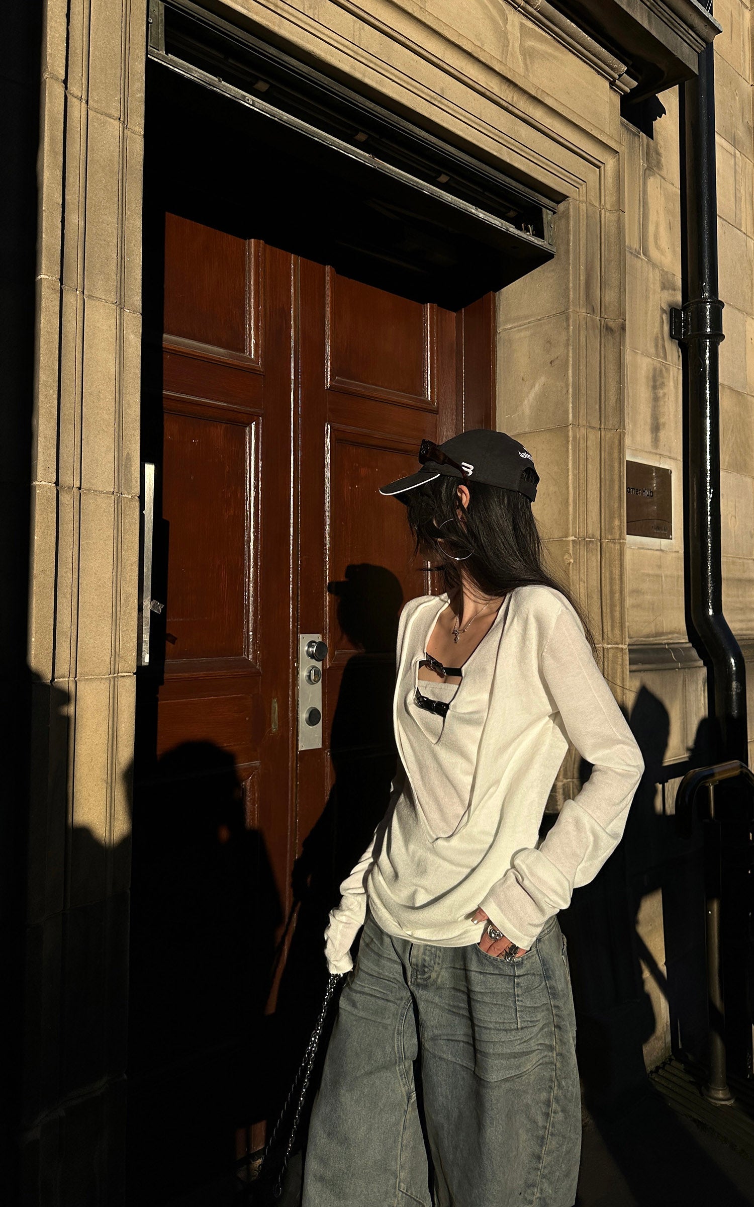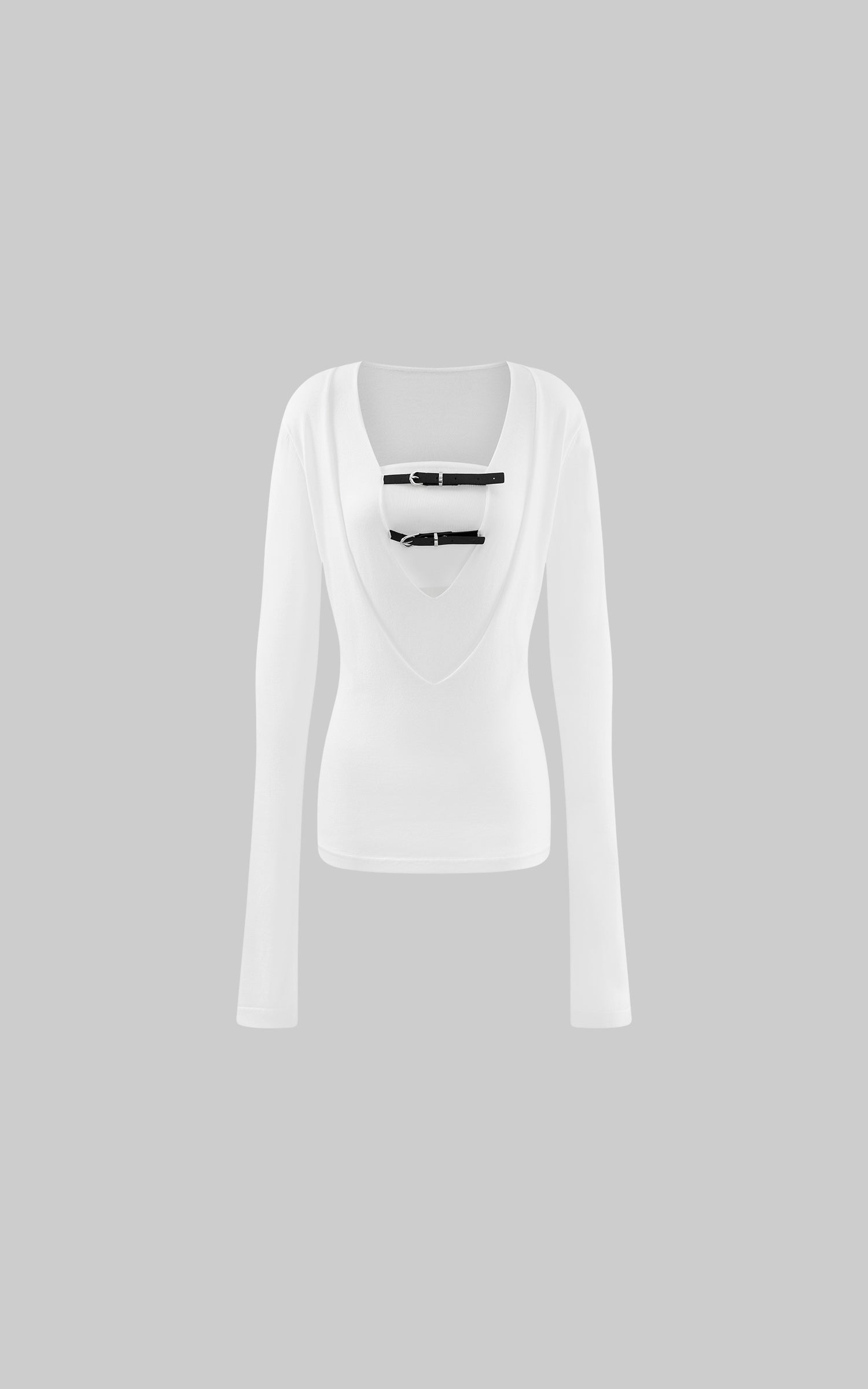 A fluid draped neckline paired with an integrated bandeau creates deliberate contrast and depth. Metal strap details interrupt the soft surface, introducing a controlled tension between structure and ease. The lightweight fabric moves naturally with the body, offering a relaxed fit without excess. Designed to stand alone or anchor layered looks, this piece delivers a quiet yet assertive edge to modern styling.