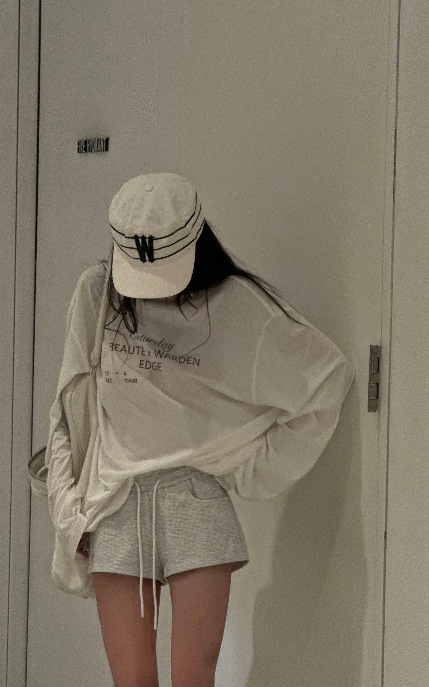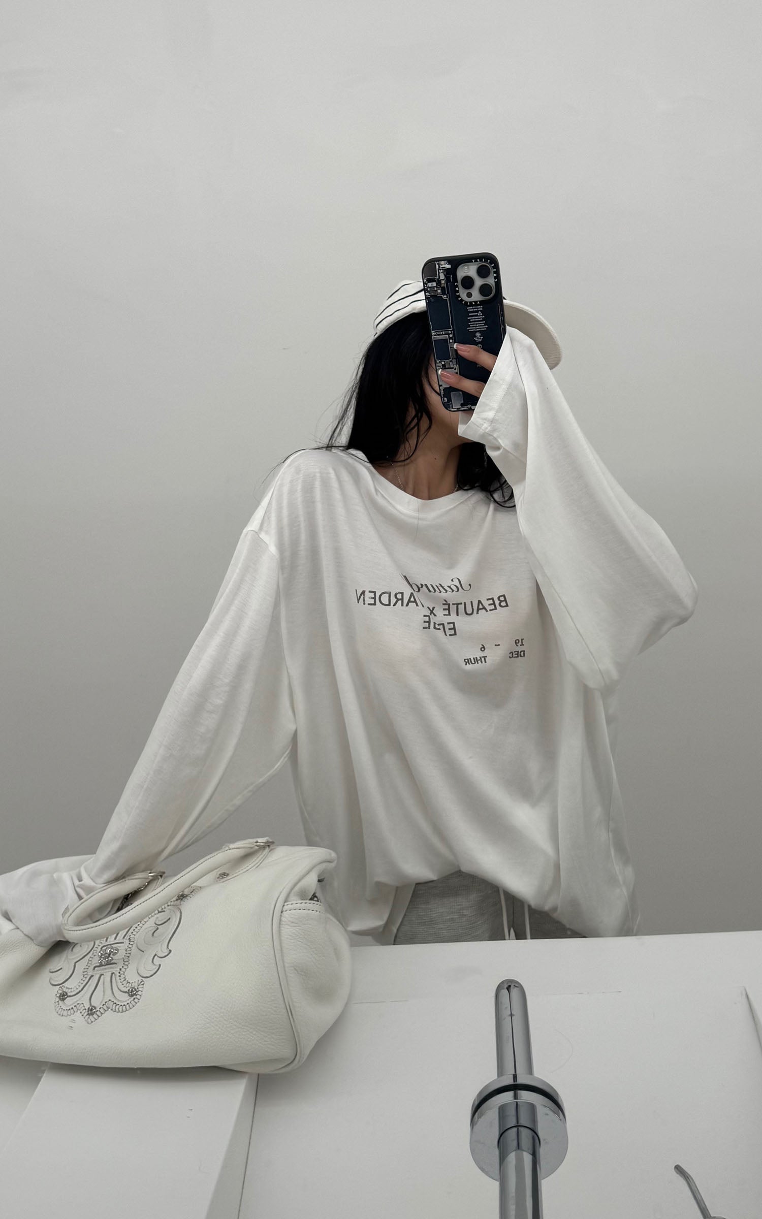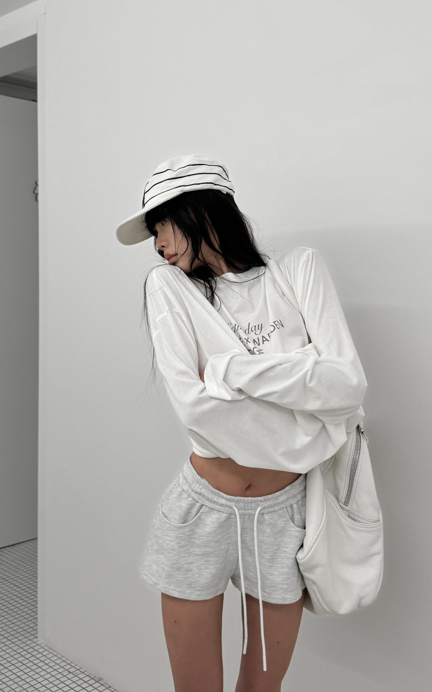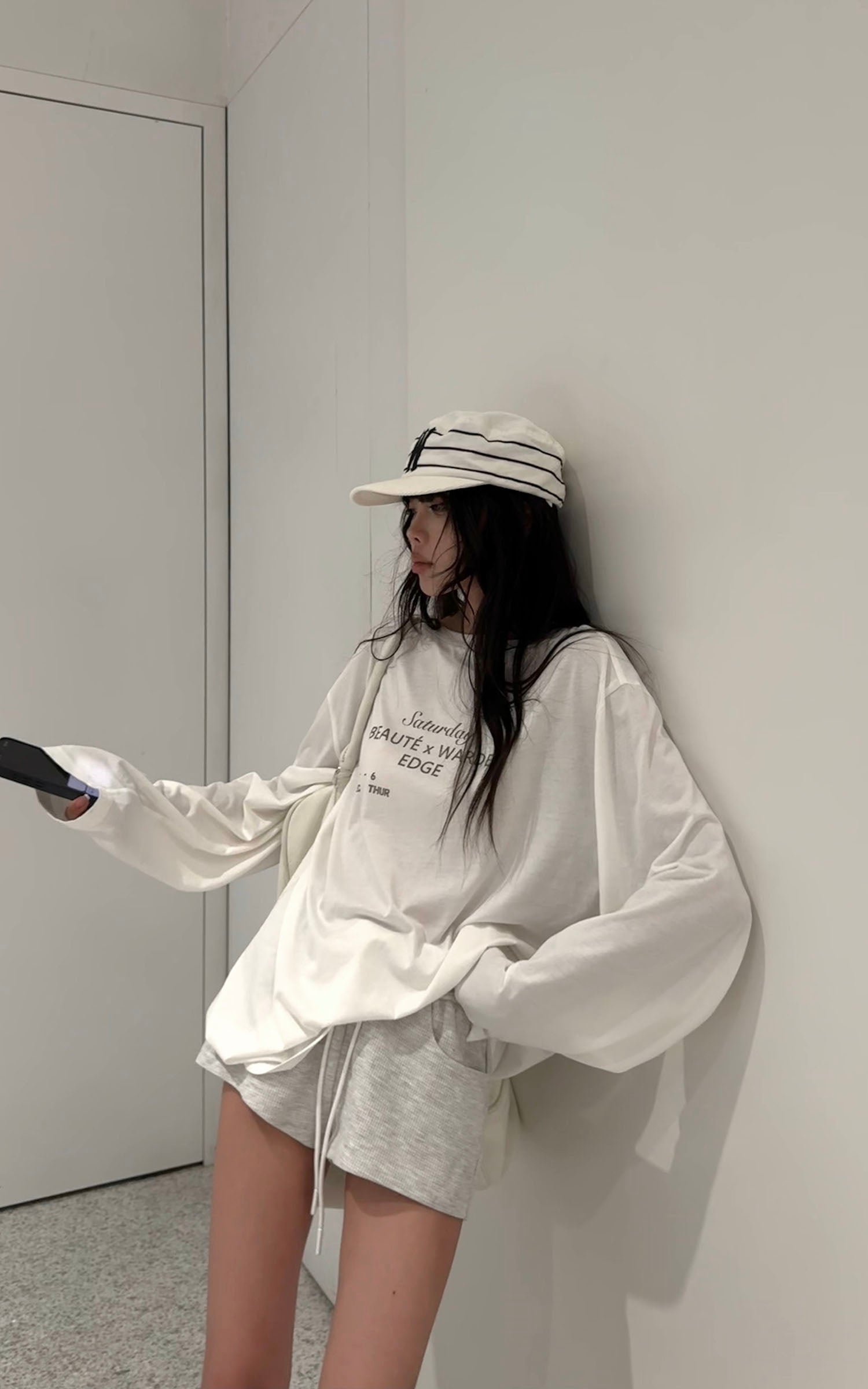 A relaxed long-sleeve tee cut from soft cotton jersey, featuring a minimal letter print across the chest with a washed finish for a lived-in feel. Dropped shoulders and an oversized silhouette give it a laid-back, street-ready attitude, perfect for layering or wearing solo. Pair it with shorts, denim, or joggers for an effortless off-duty look.