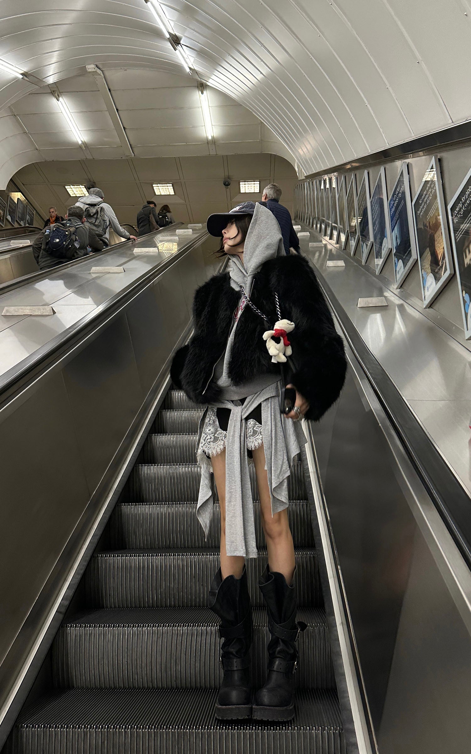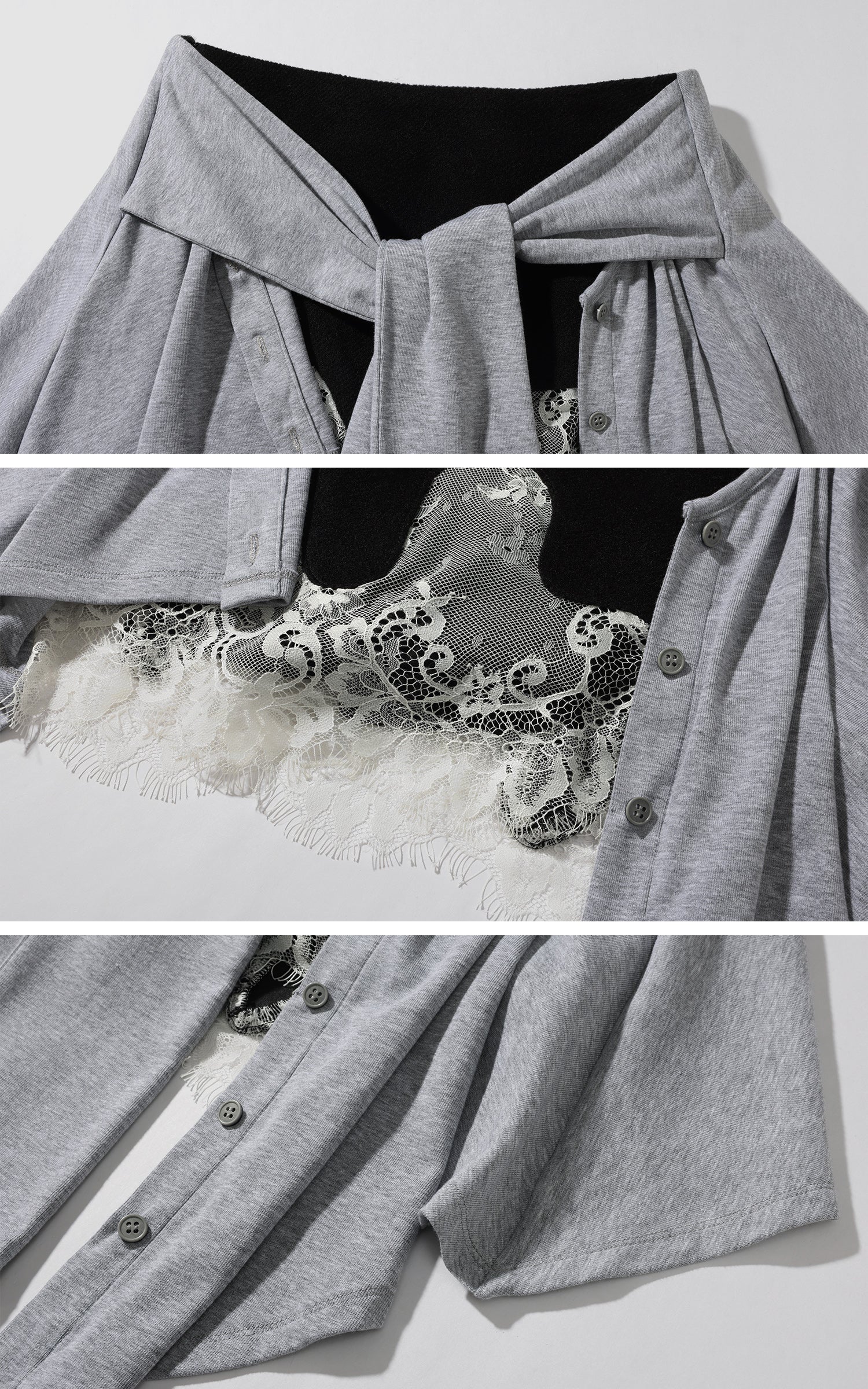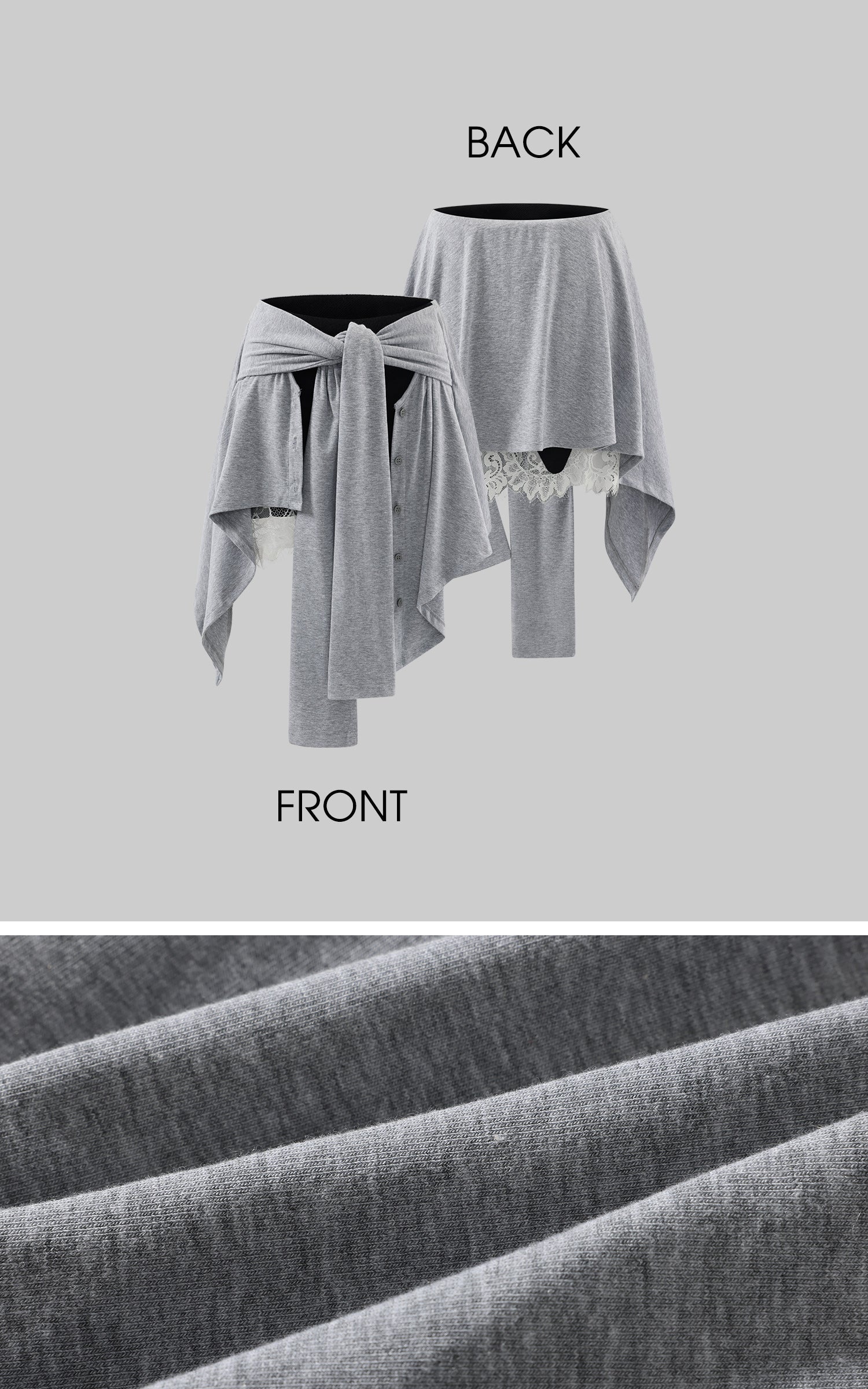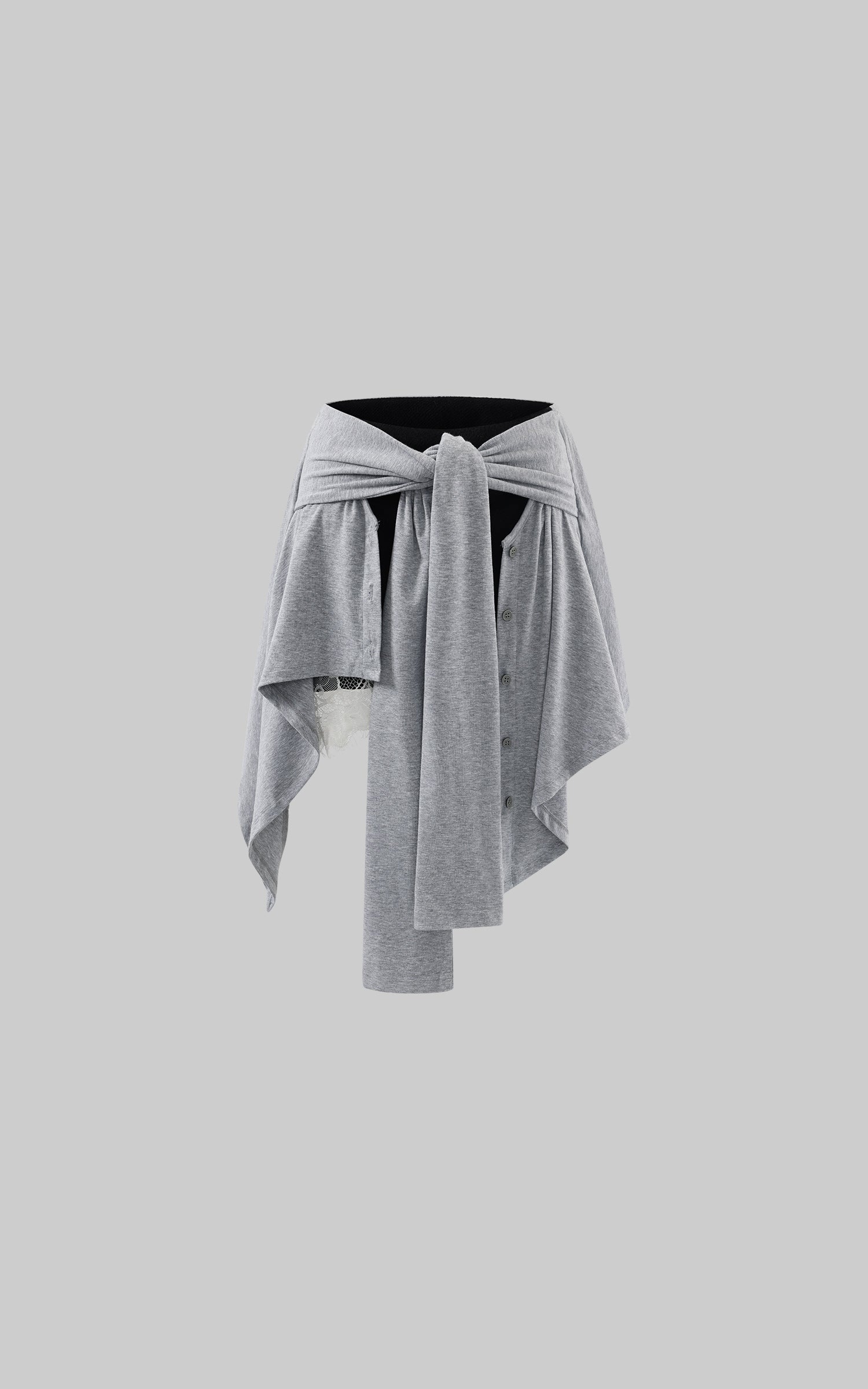 An experimental skirt that merges softness with edge—crafted from smooth cotton and delicate lace for a deconstructed silhouette. The asymmetric hem and faux tie detail create a layered, fluid movement that feels both casual and subversive. High-waisted for a lengthened shape, it blends urban street energy with understated sensuality. Style it with oversized hoodies or cropped outerwear for a cool, undone contrast.