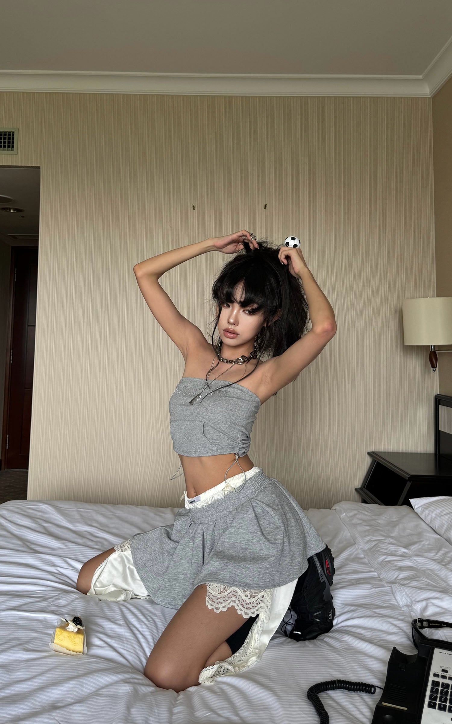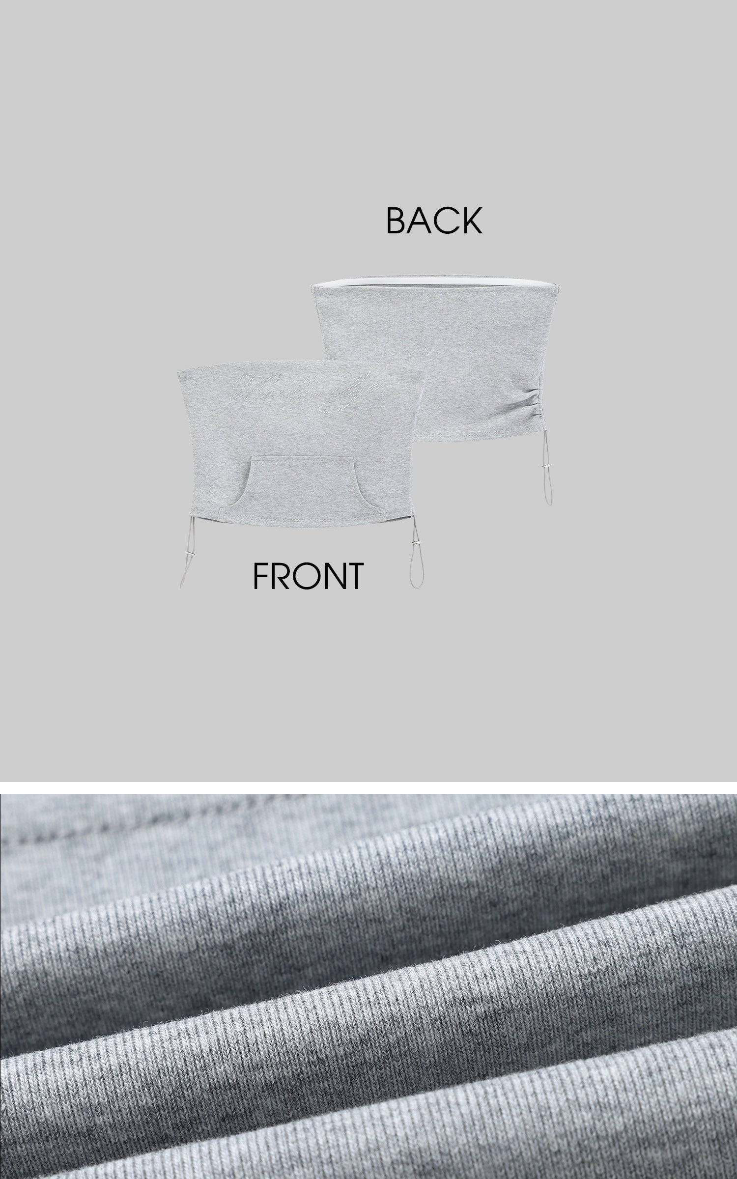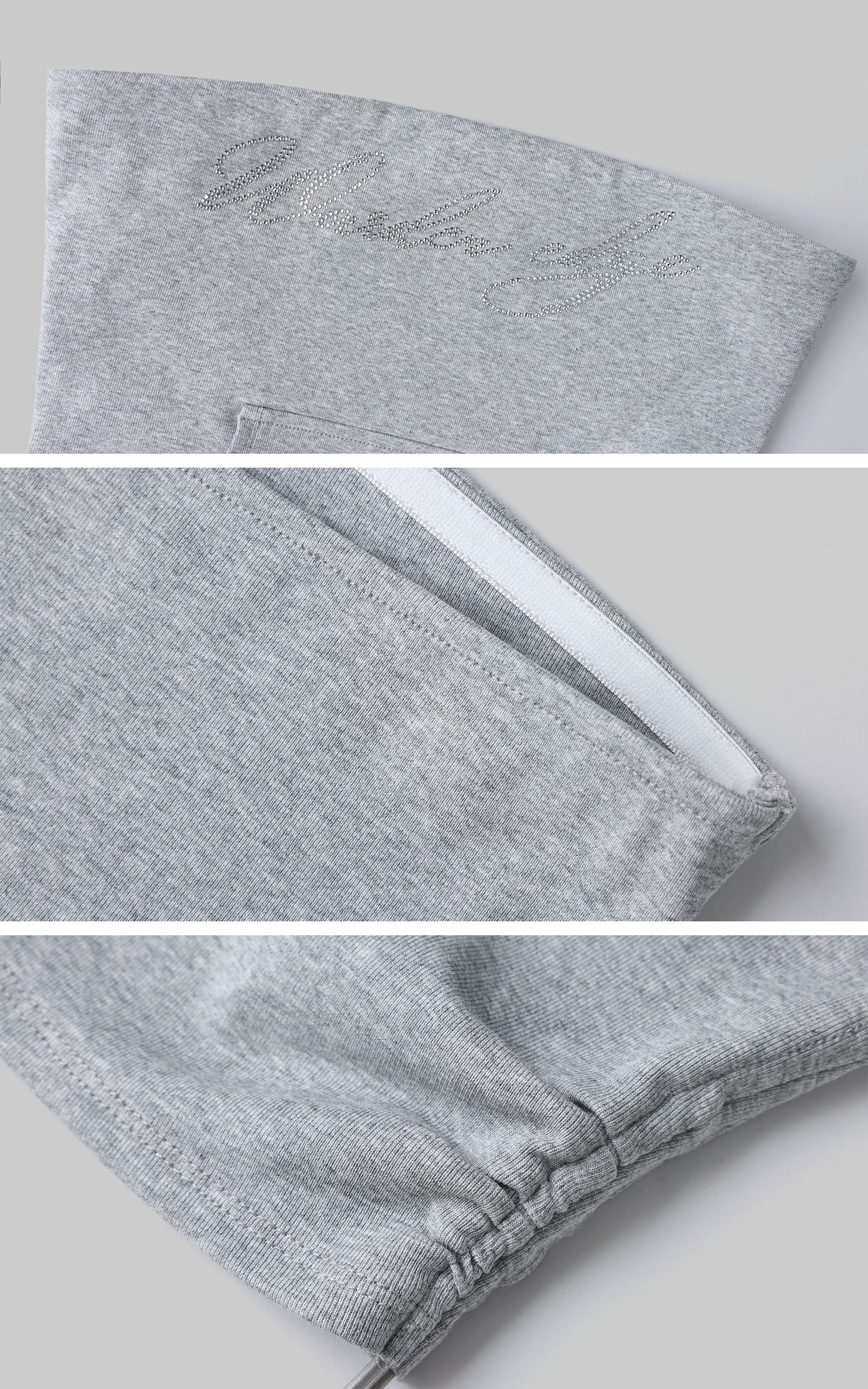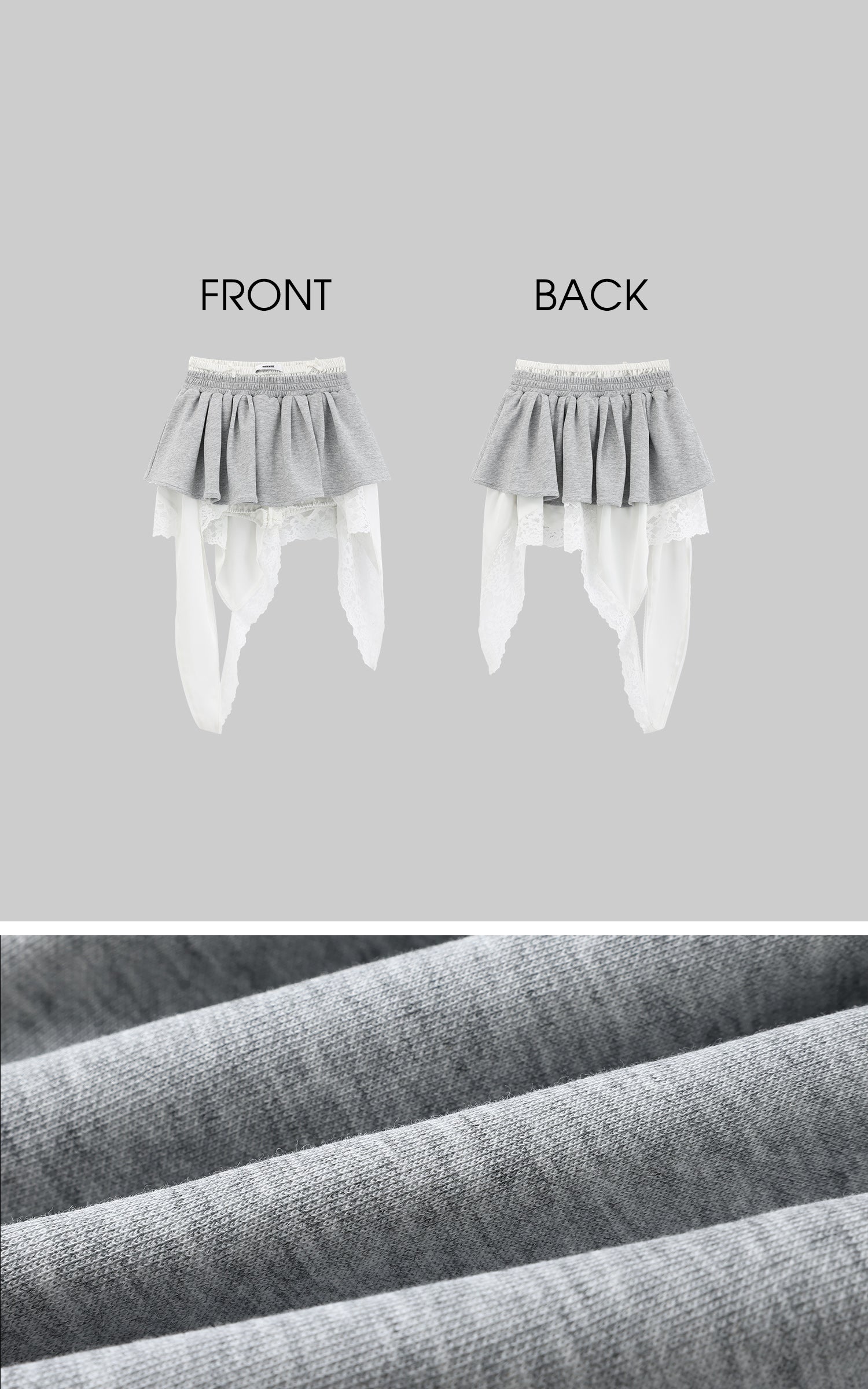A hybrid of softness and subversion, this two-piece set reshapes loungewear through distortion and contradiction. The top riffs on street classic codes with a bandeau silhouette cut from sweatshirt fabric, detailed with a pouch pocket and rhinestone script that sparkles with irony. The mini skirt plays against the same tension—pleated gym-short structure clashed with exposed lingerie lace, asymmetric drapes, and layered linings that blur the line between comfort and exhibition. This isn’t about being cozy. It’s about reclaiming softness as a statement.
