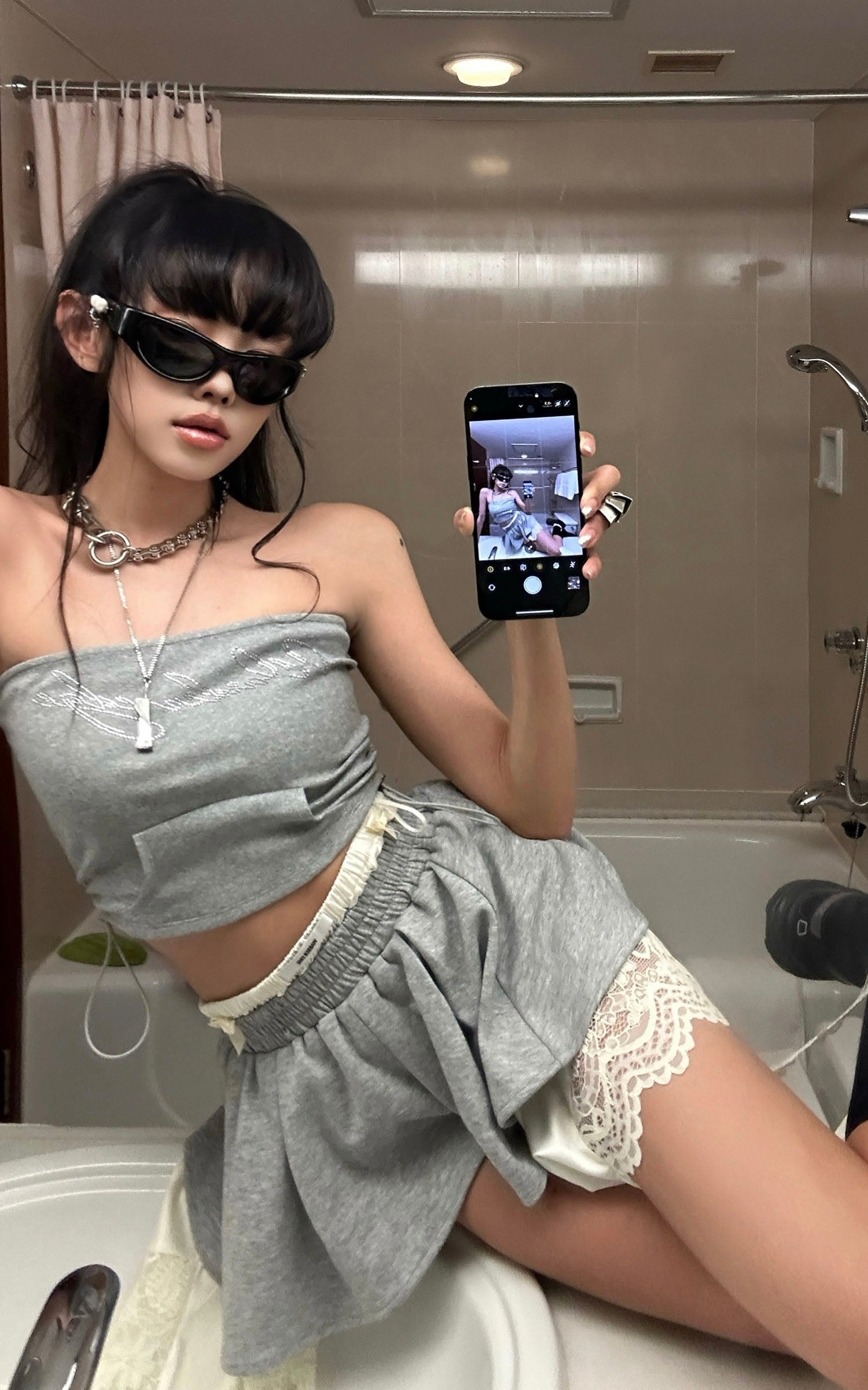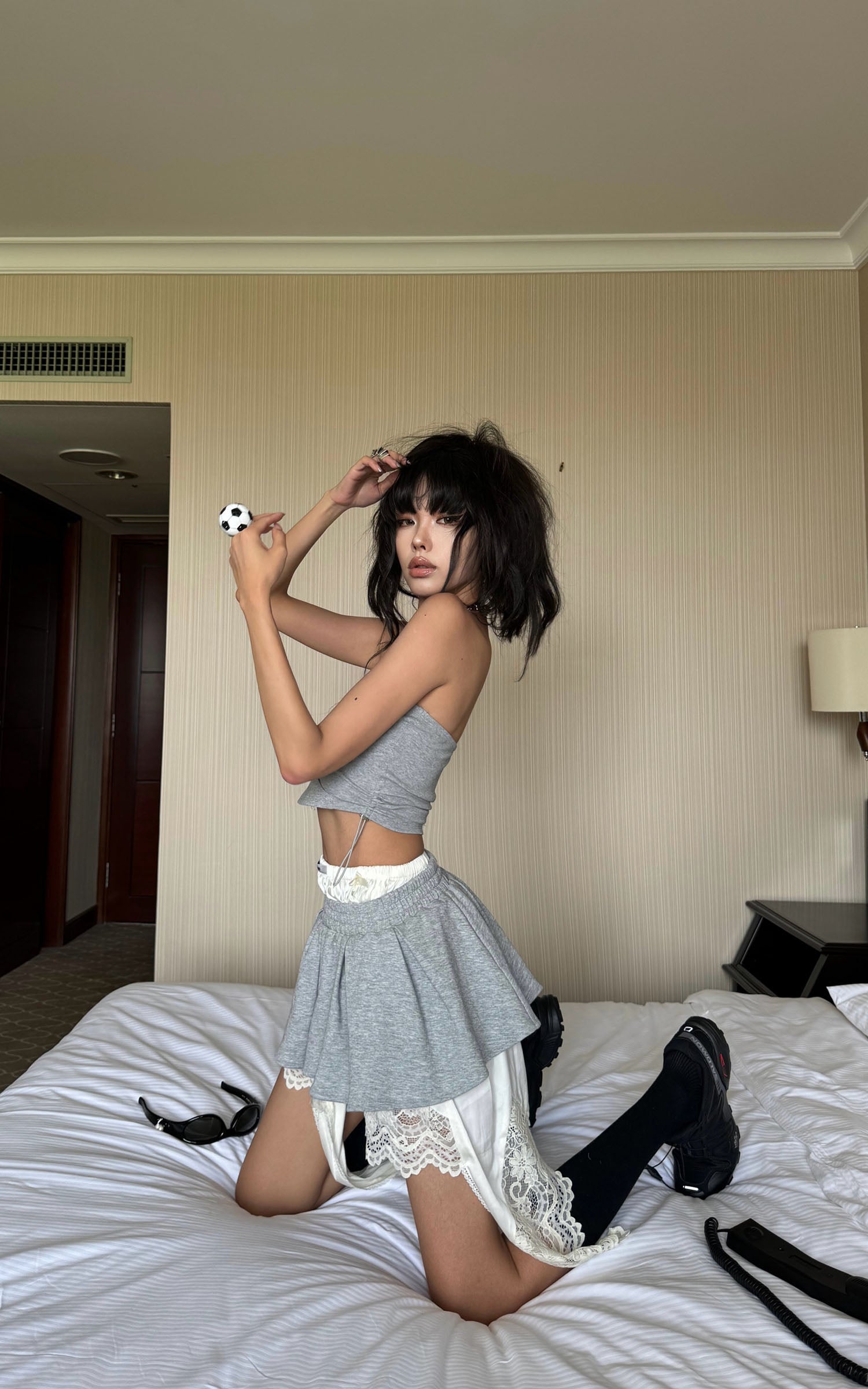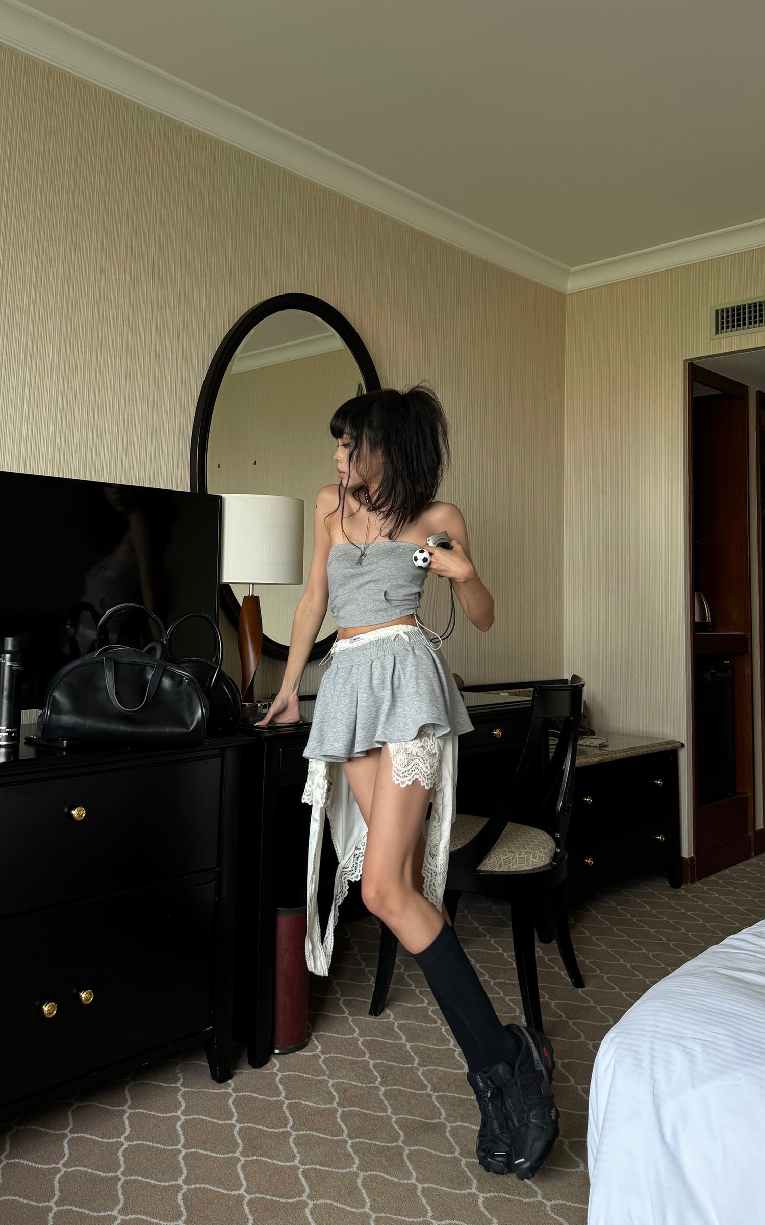 A hybrid of softness and subversion, this two-piece set reshapes loungewear through distortion and contradiction. The top riffs on street classic codes with a bandeau silhouette cut from sweatshirt fabric, detailed with a pouch pocket and rhinestone script that sparkles with irony. The mini skirt plays against the same tension—pleated gym-short structure clashed with exposed lingerie lace, asymmetric drapes, and layered linings that blur the line between comfort and exhibition. This isn’t about being cozy. It’s about reclaiming softness as a statement.
