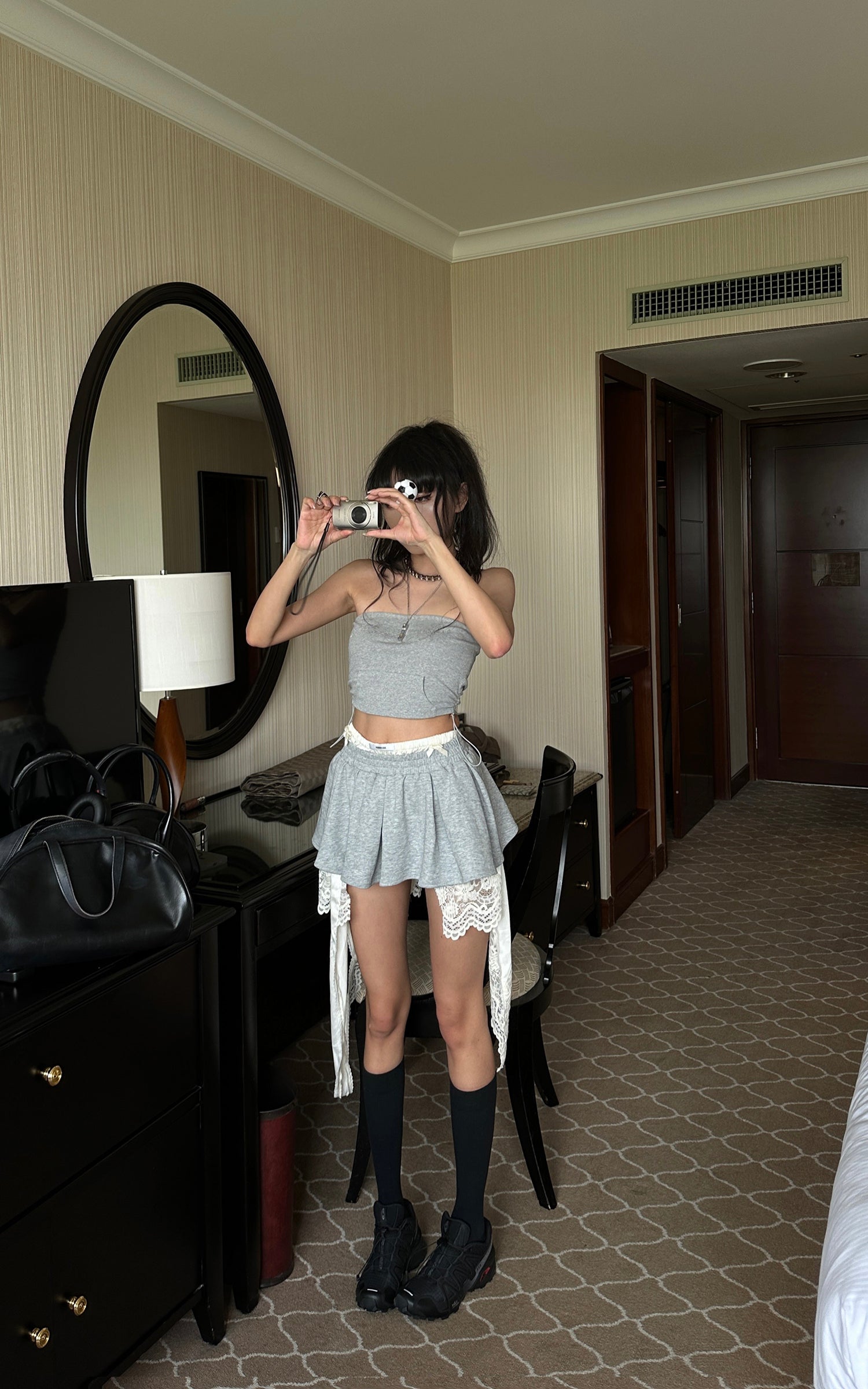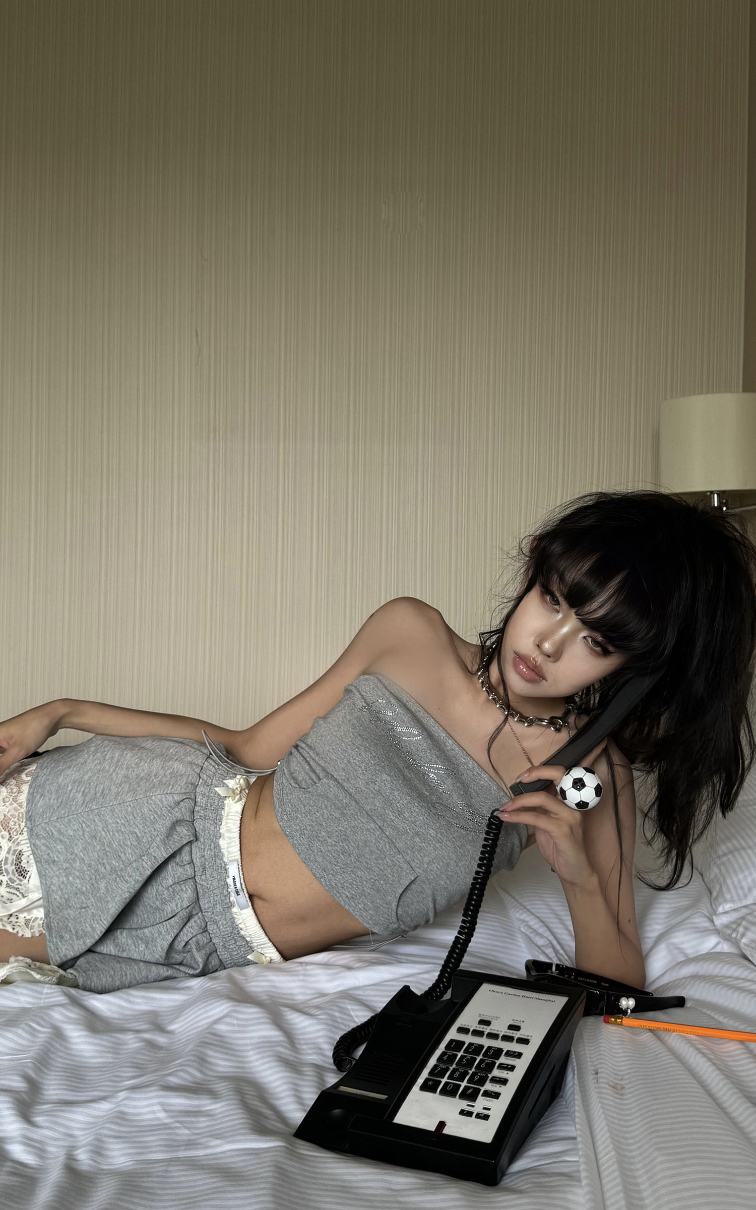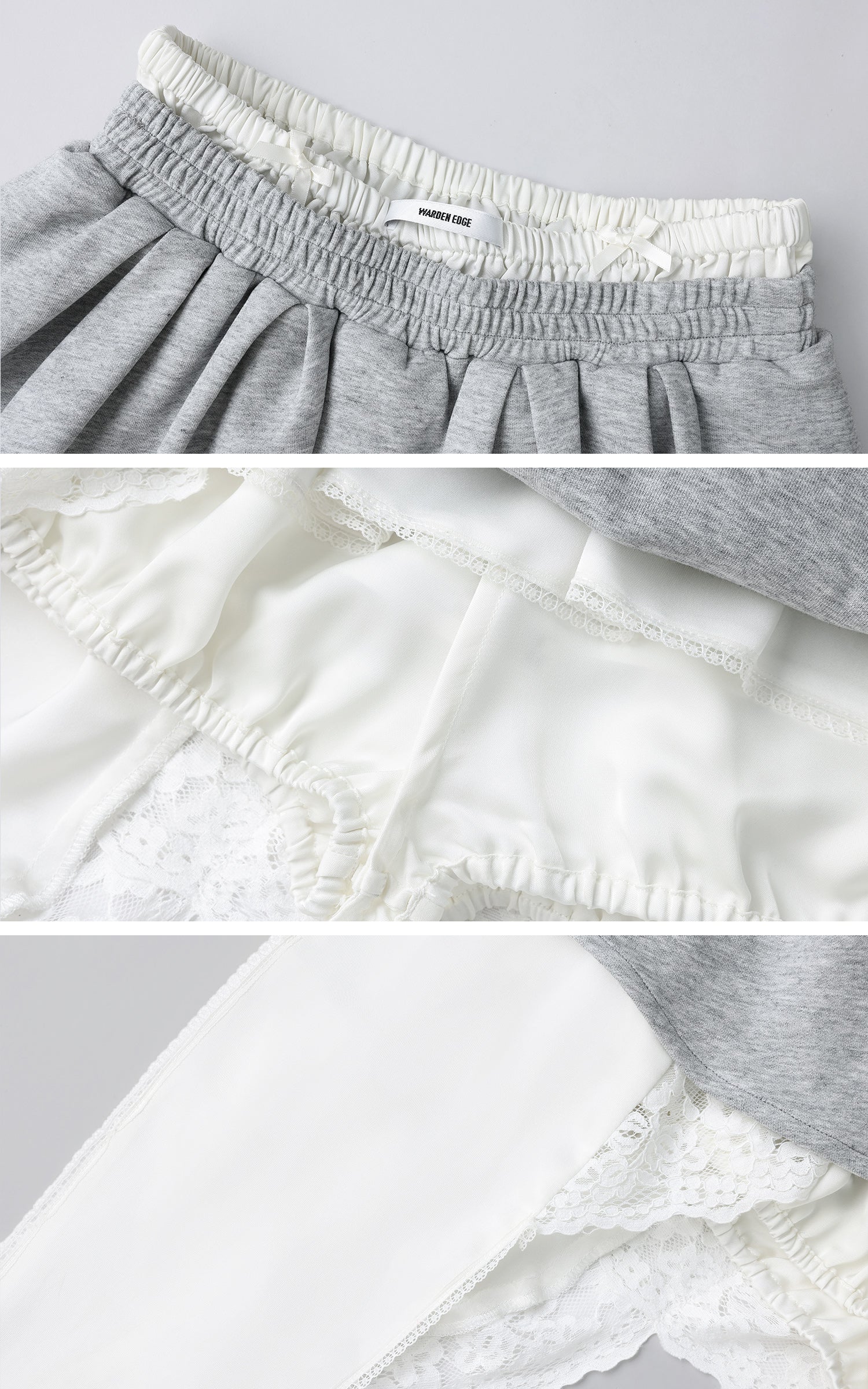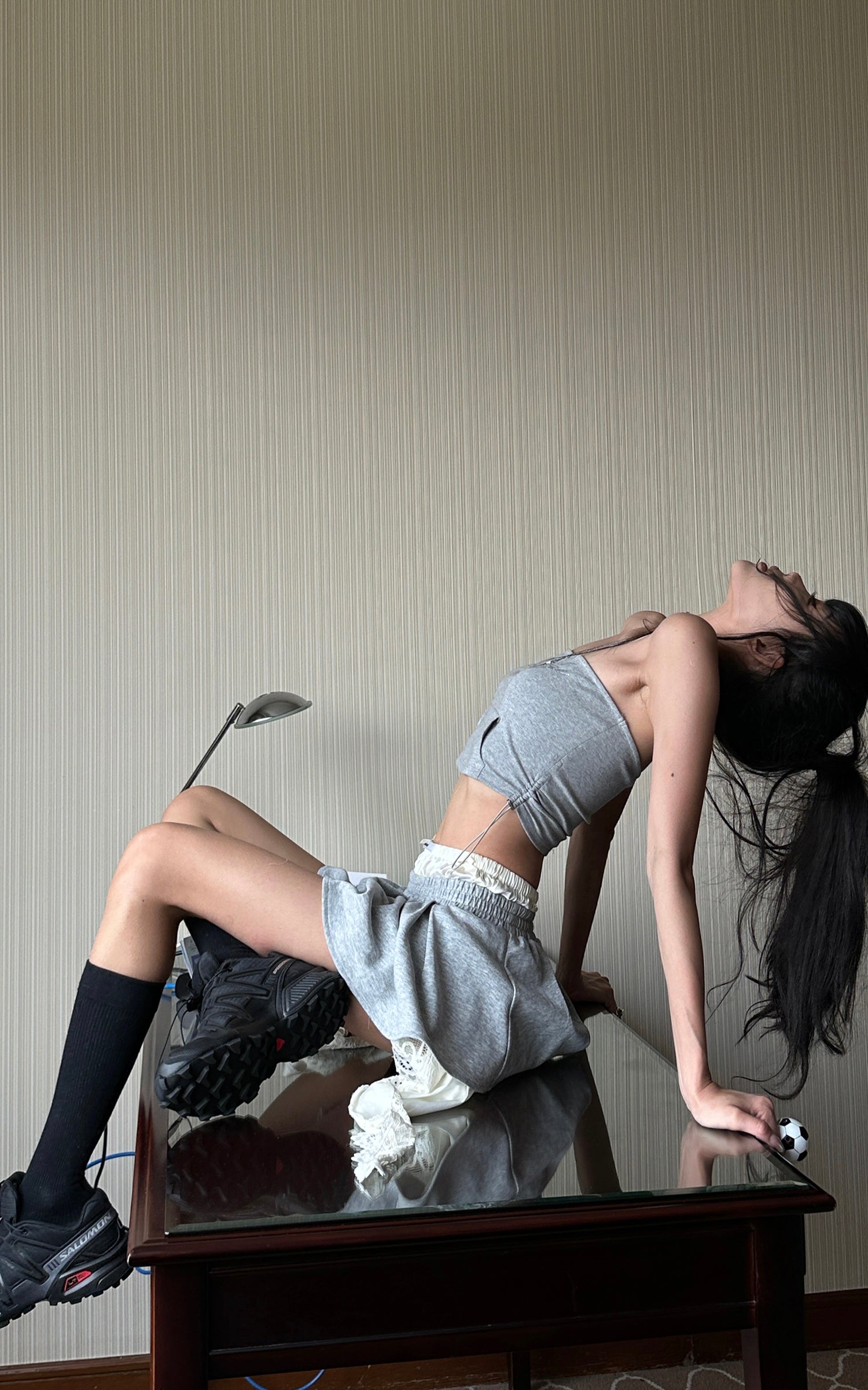 A hybrid of softness and subversion, this two-piece set reshapes loungewear through distortion and contradiction. The top riffs on street classic codes with a bandeau silhouette cut from sweatshirt fabric, detailed with a pouch pocket and rhinestone script that sparkles with irony. The mini skirt plays against the same tension—pleated gym-short structure clashed with exposed lingerie lace, asymmetric drapes, and layered linings that blur the line between comfort and exhibition. This isn’t about being cozy. It’s about reclaiming softness as a statement.