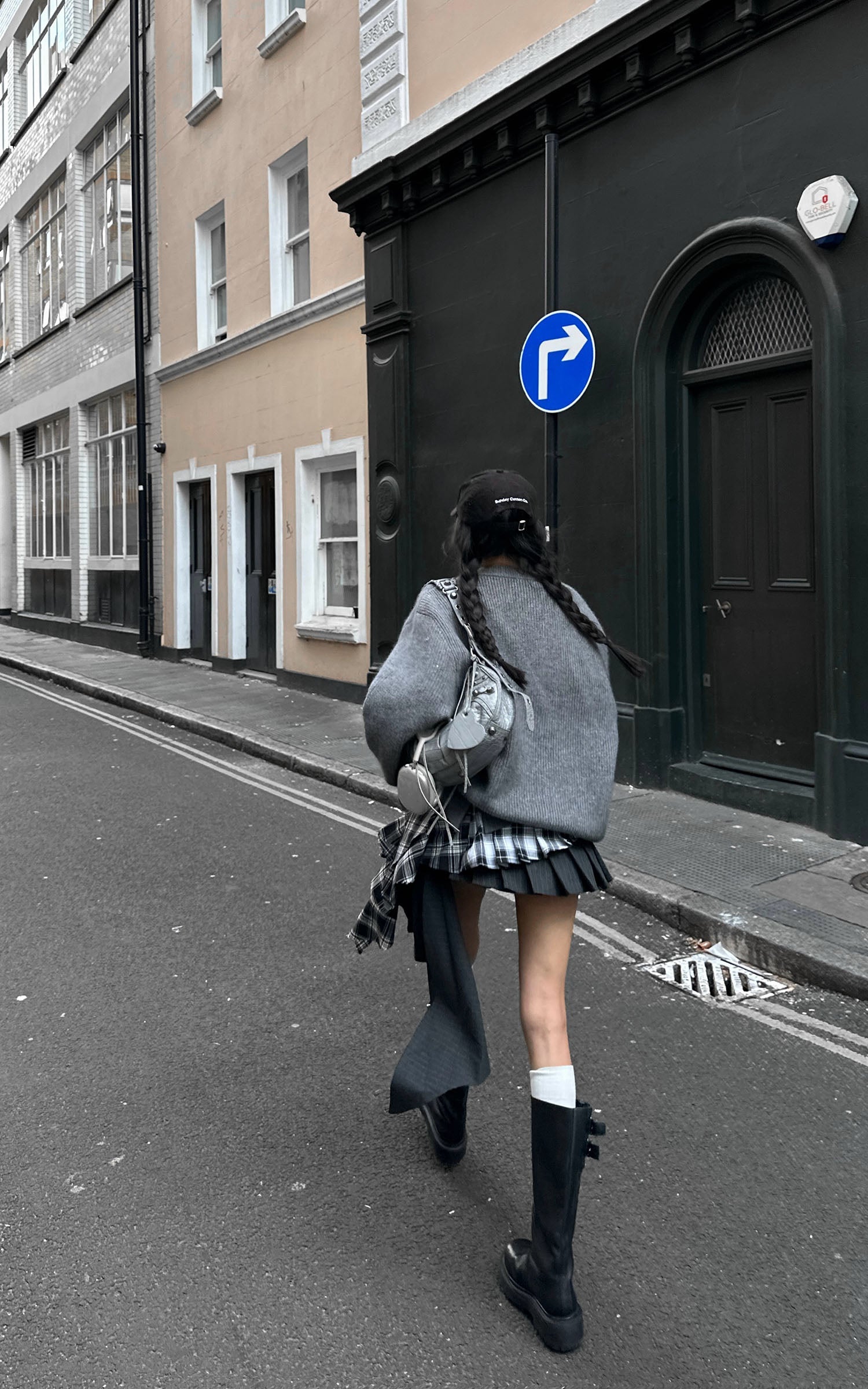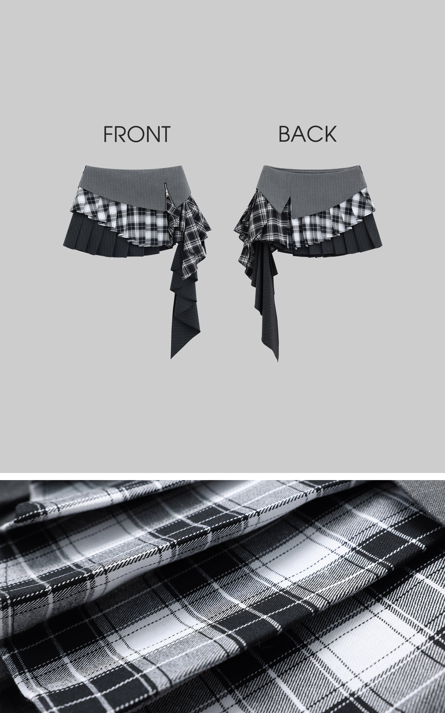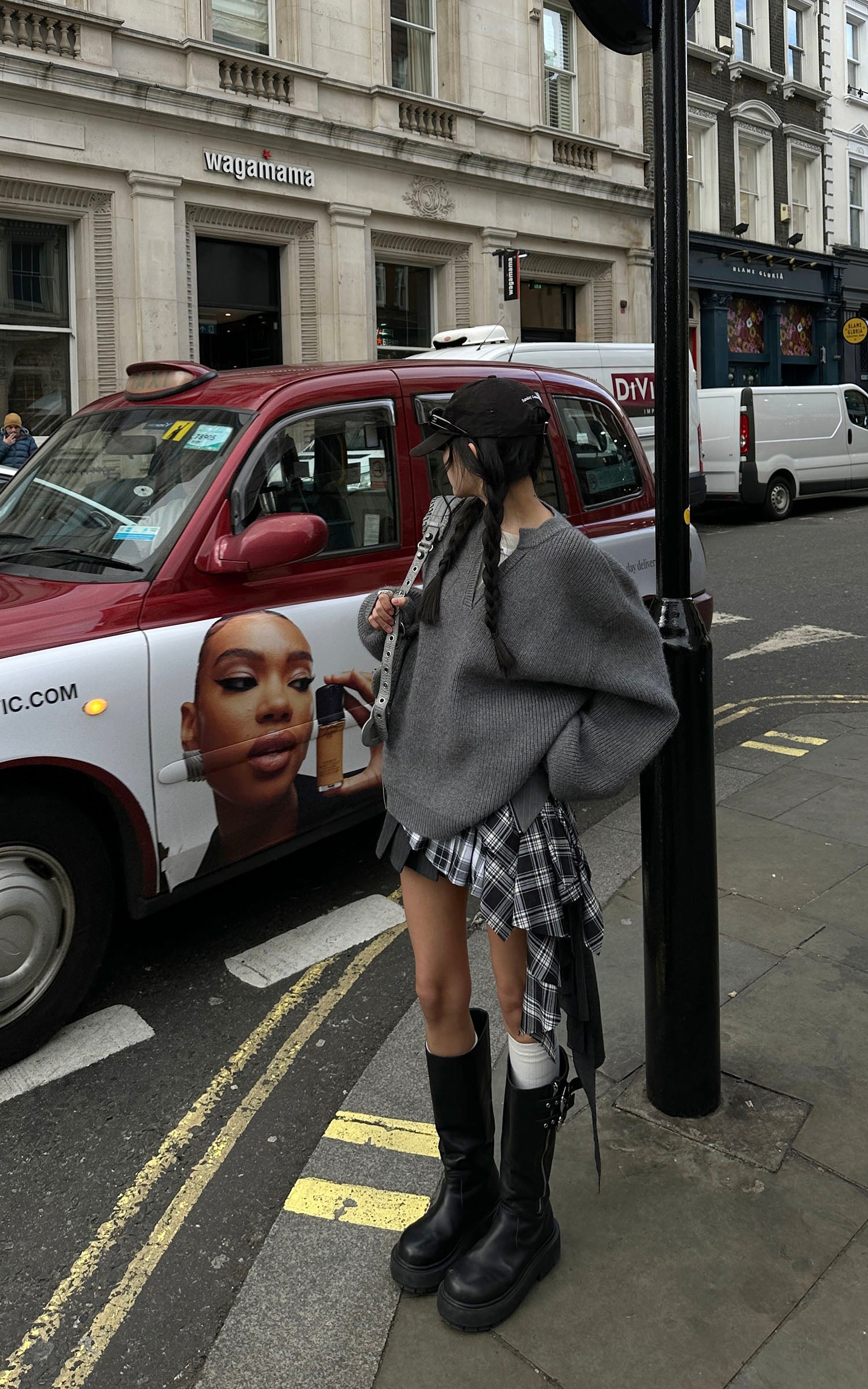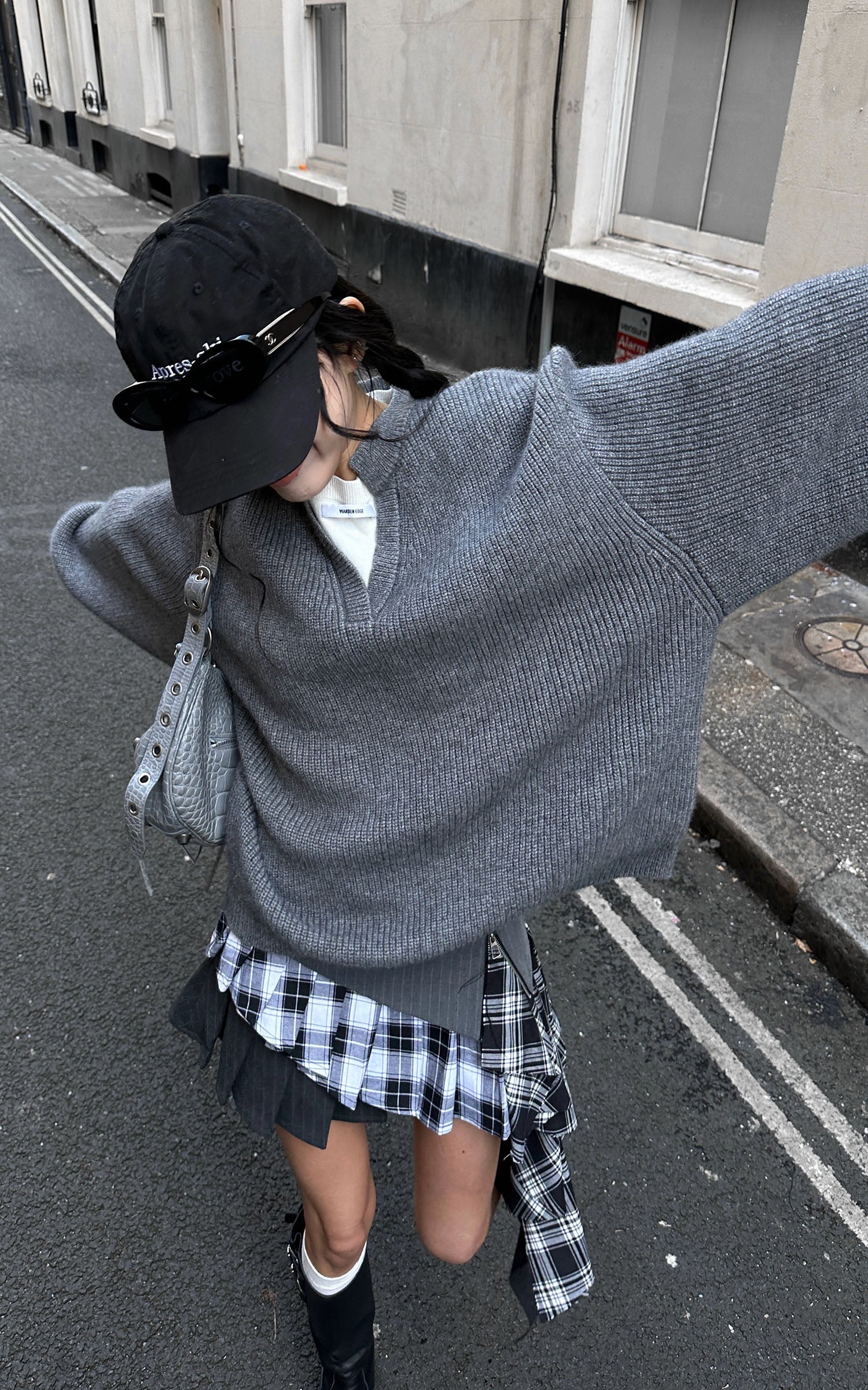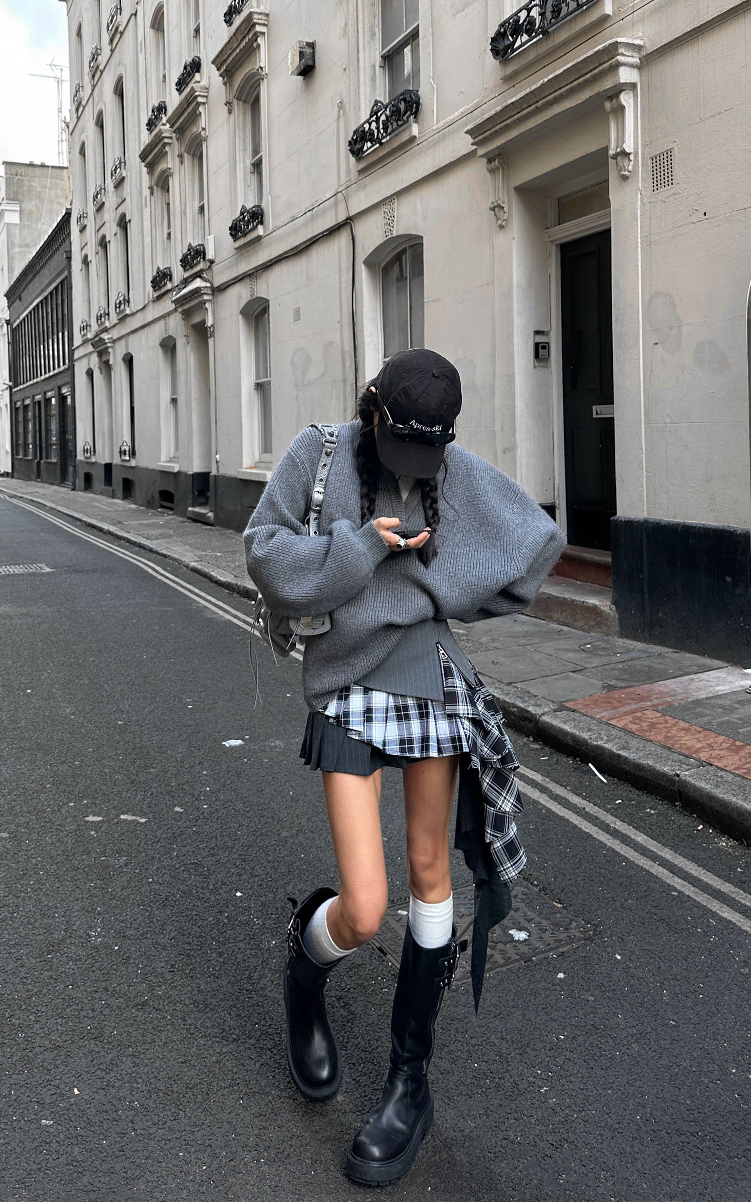 Effortlessly fuse comfort with edge in this contemporary ensemble. The oversized knit pullover exudes casual sophistication, featuring a deep V-neck and ribbed textures for an elevated tactile feel. Paired with an asymmetrical plaid skirt that reimagines classic tailoring, this set delivers striking contrast with layered ruffles and precise zipper details. Perfect for those seeking bold, layered streetwear aesthetics, this outfit ensures a dynamic yet polished look for urban adventures.
