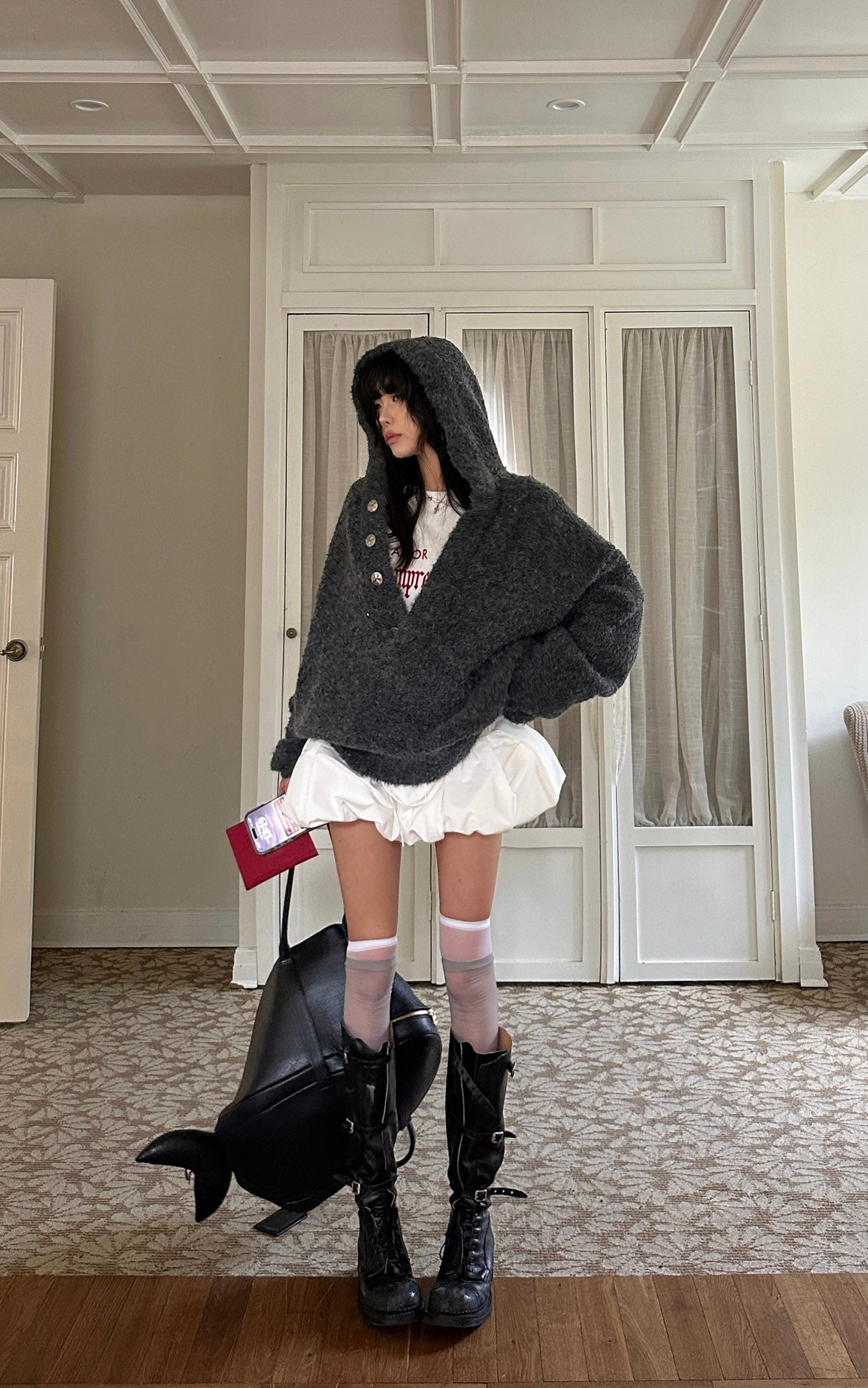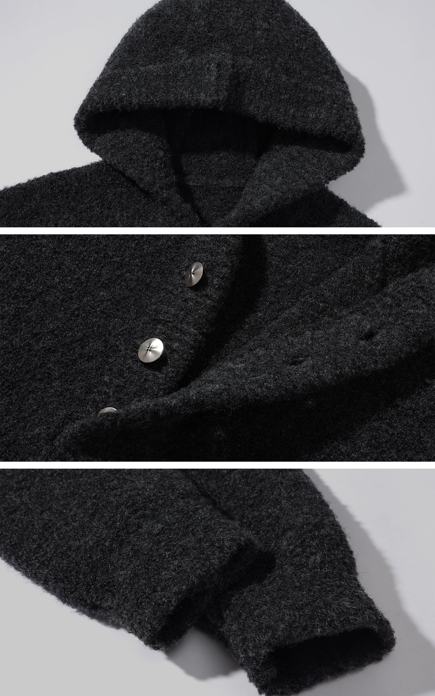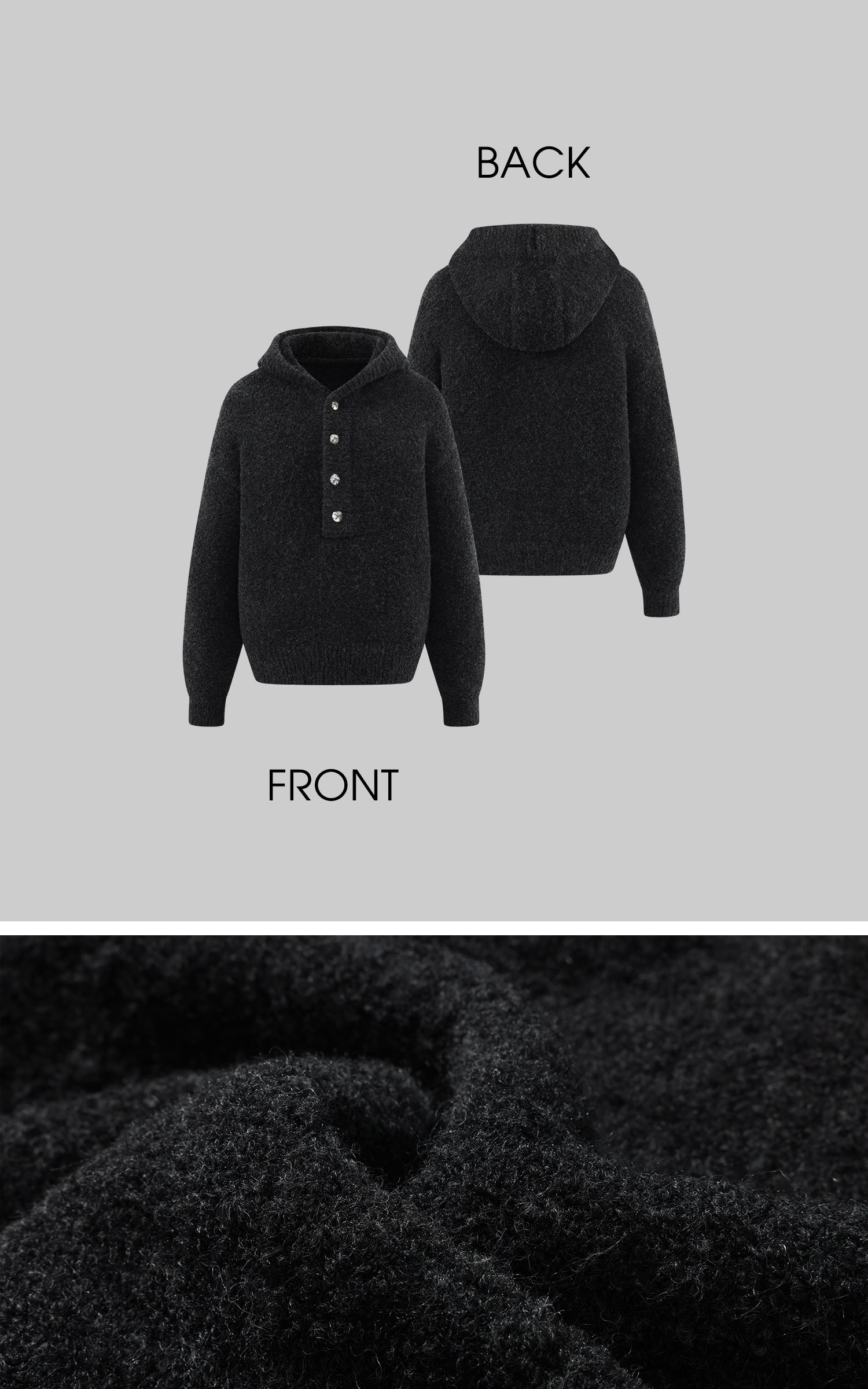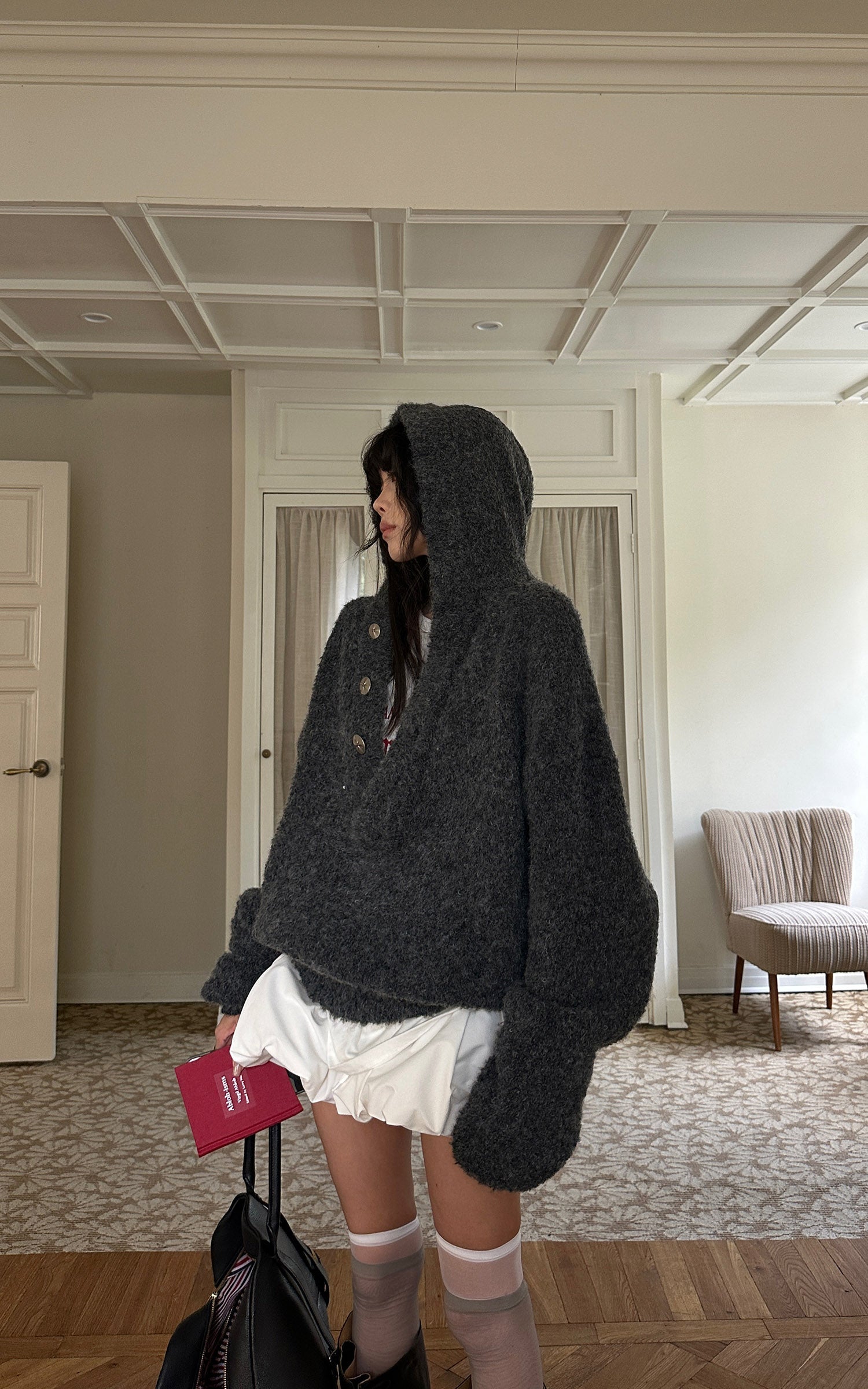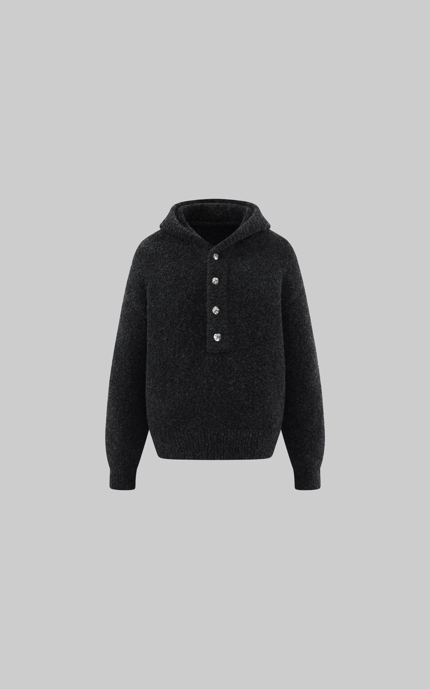 A slouchy, cocoon-shaped knit jacket built for colder days—soft, weighty, and matte in texture. The oversized hood and asymmetric button line add sculptural volume, while the dropped shoulders create an easy, undone silhouette. Designed to layer over tees or skirts, it balances comfort with a raw, minimal edge.