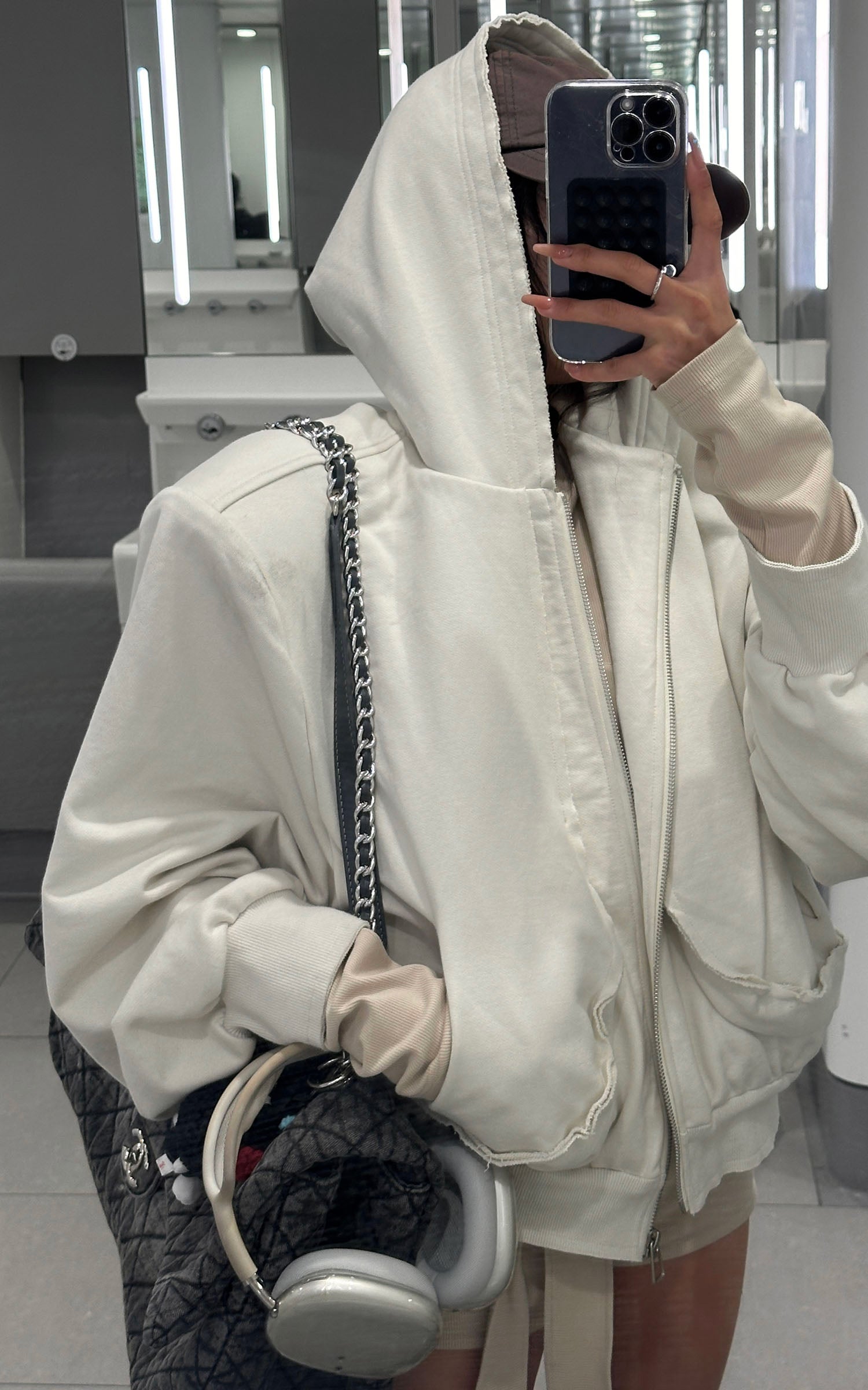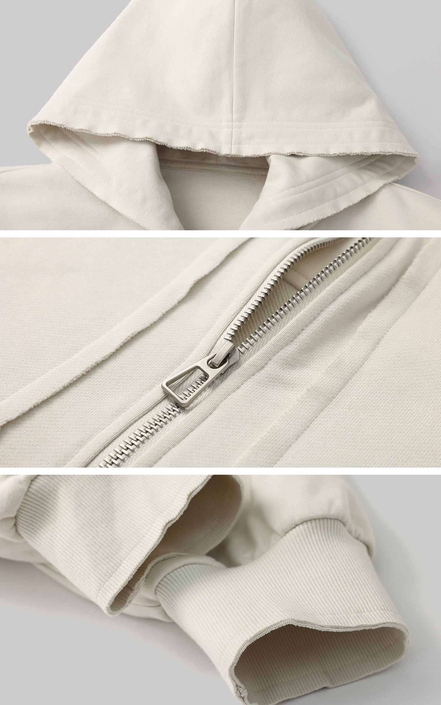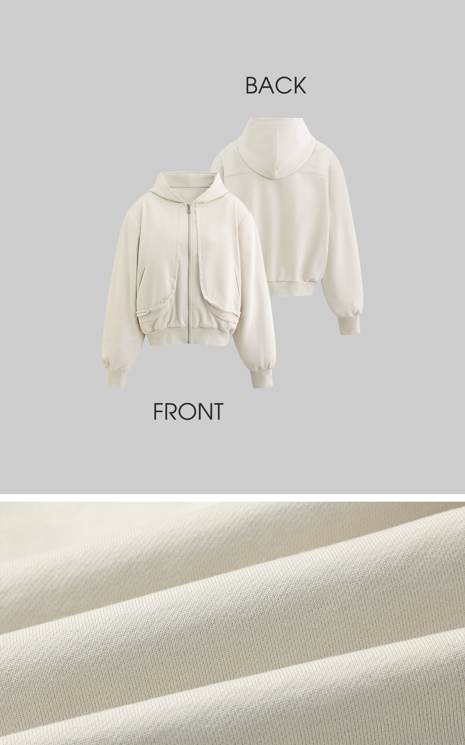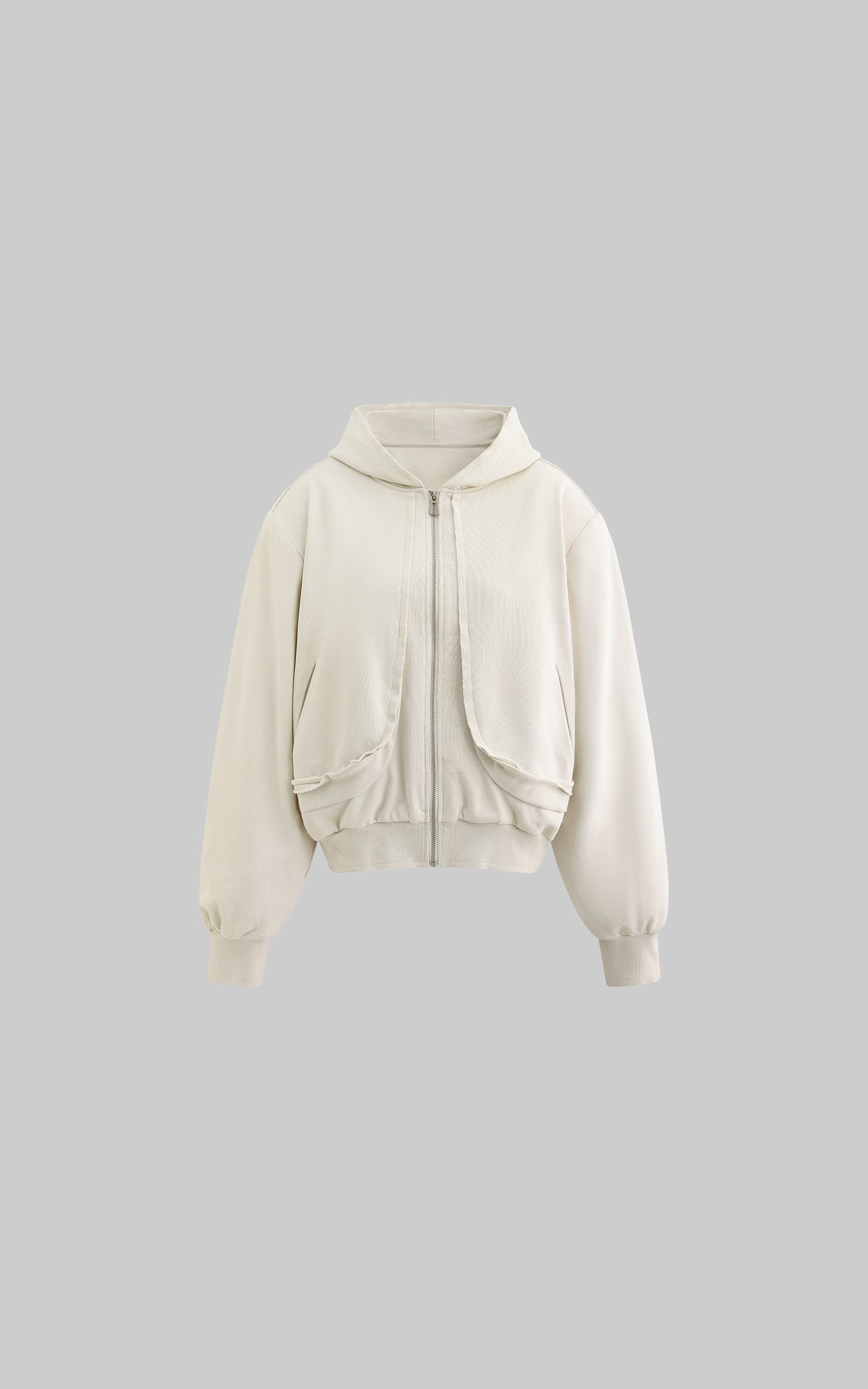 A blend of comfort and contemporary design. This hooded zip-up sweatshirt features an effortless silhouette with a slightly cropped cut. The soft, brushed fabric embraces the body, while the oversized sleeves add a laid-back, street-style edge. The raw edges and oversized fit convey a relaxed aesthetic, perfect for layering or wearing solo. Pair it with high-waisted pants or a mini skirt for a bold, street-inspired look.