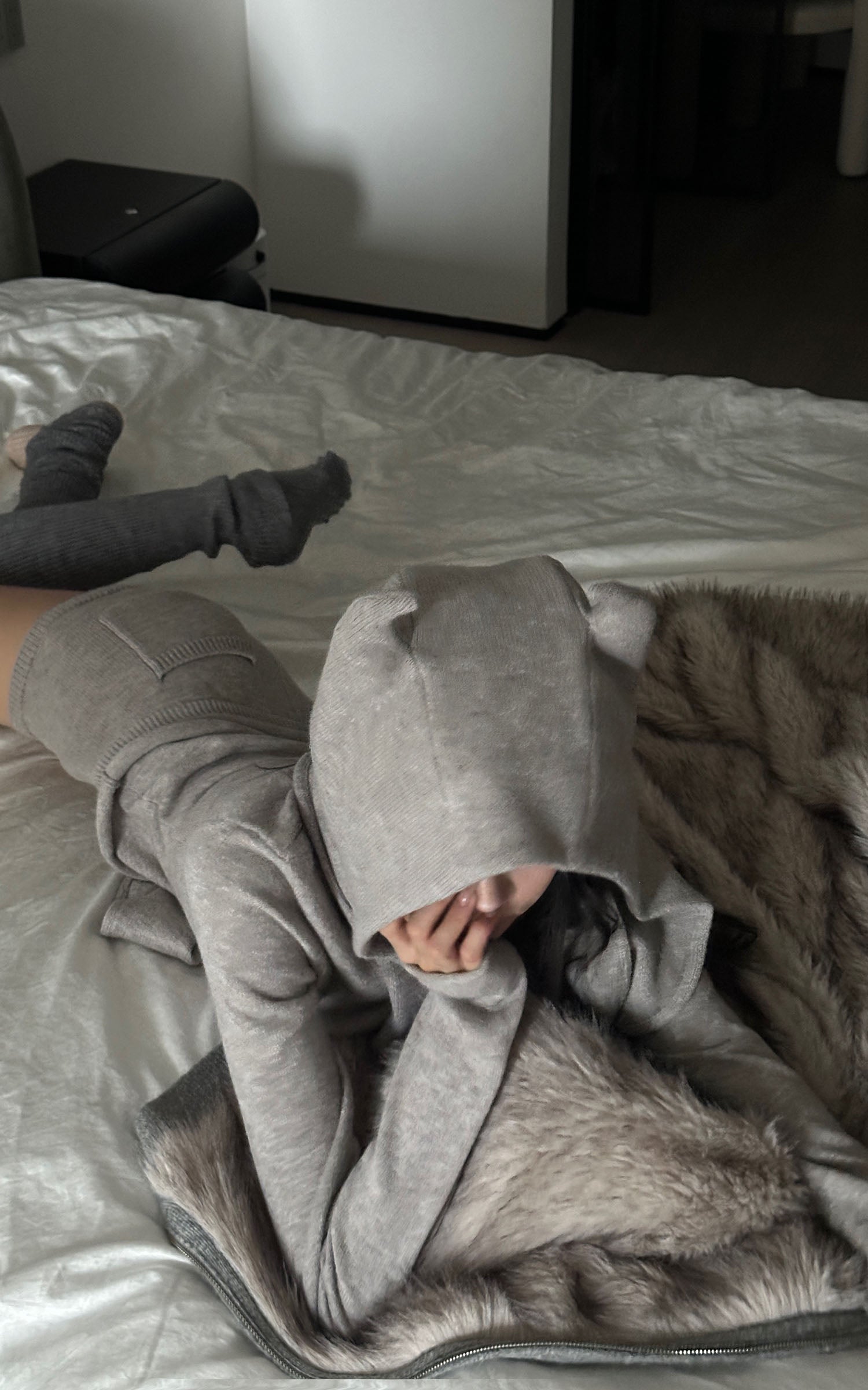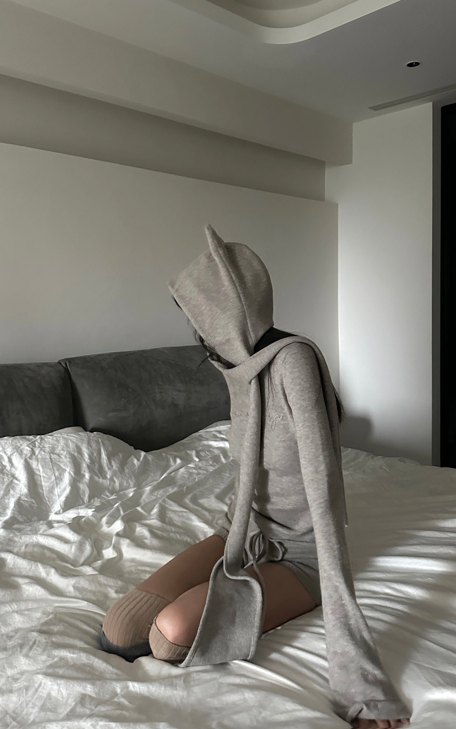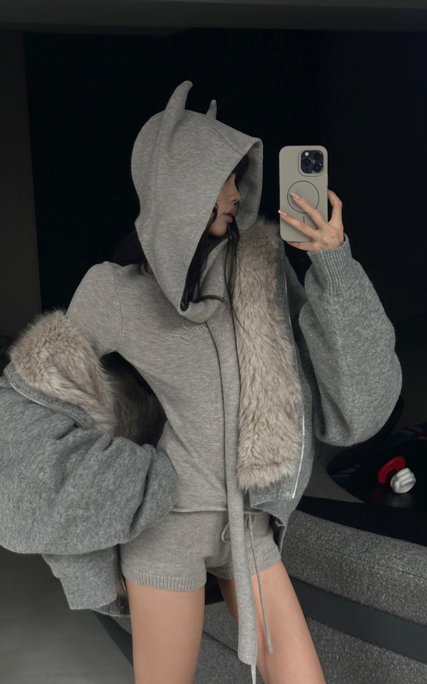 A three-piece knit set built around a sculpted, subversive silhouette. The devil-horn hood drapes with exaggerated length, adding a quiet attitude to the look. The fitted top contours the body with clean, minimal lines, while the drawstring shorts sit soft and low for effortless movement. Warm, tactile, and lightweight, the set blends comfort with a refined edge—made to shift between indoor ease and street styling without losing its cool, directional energy.