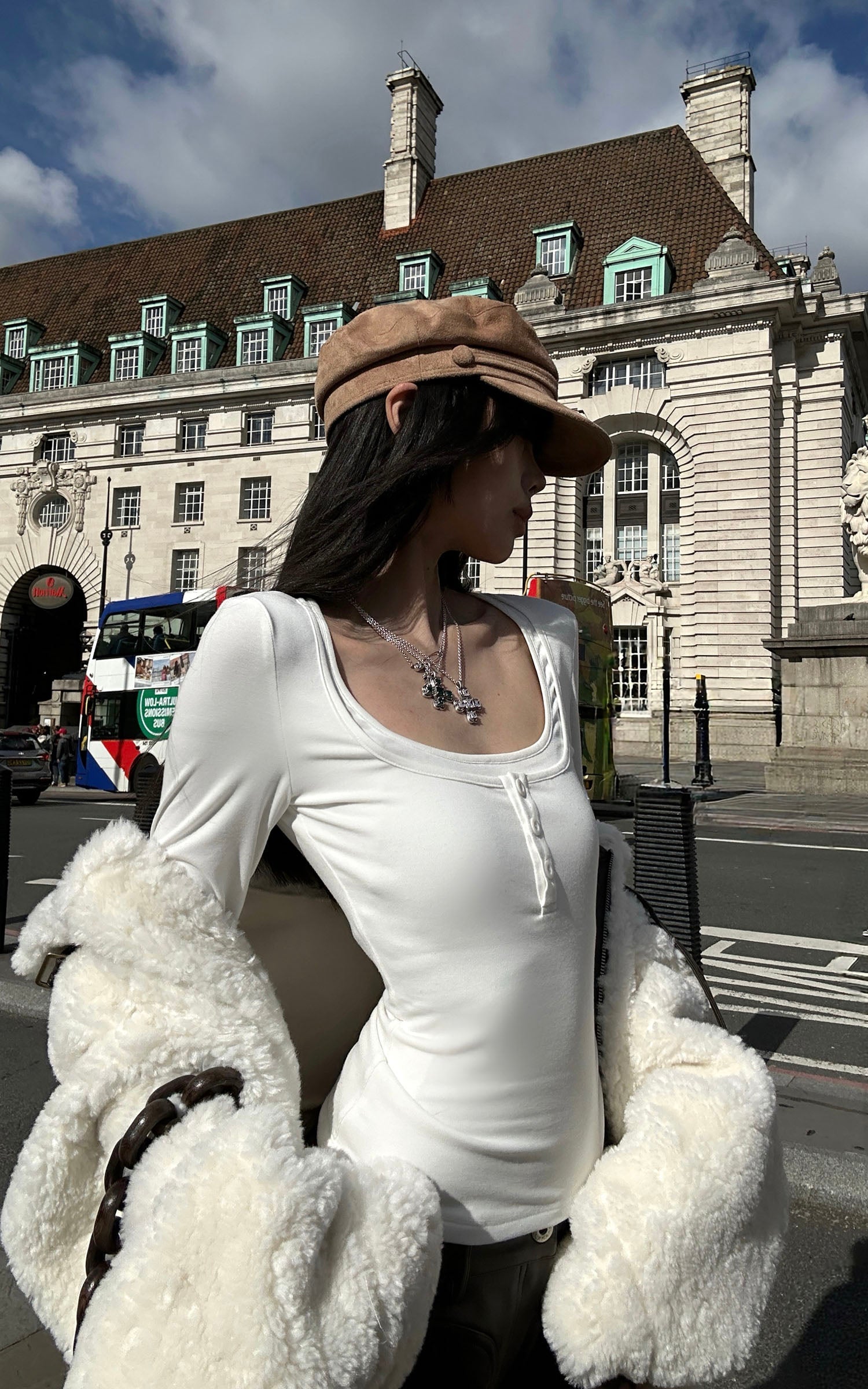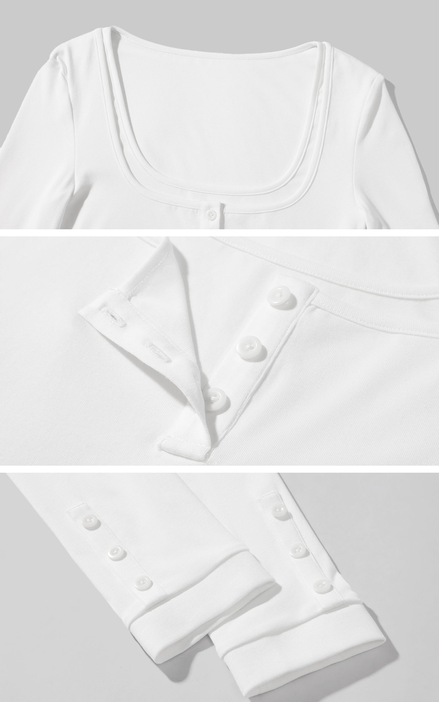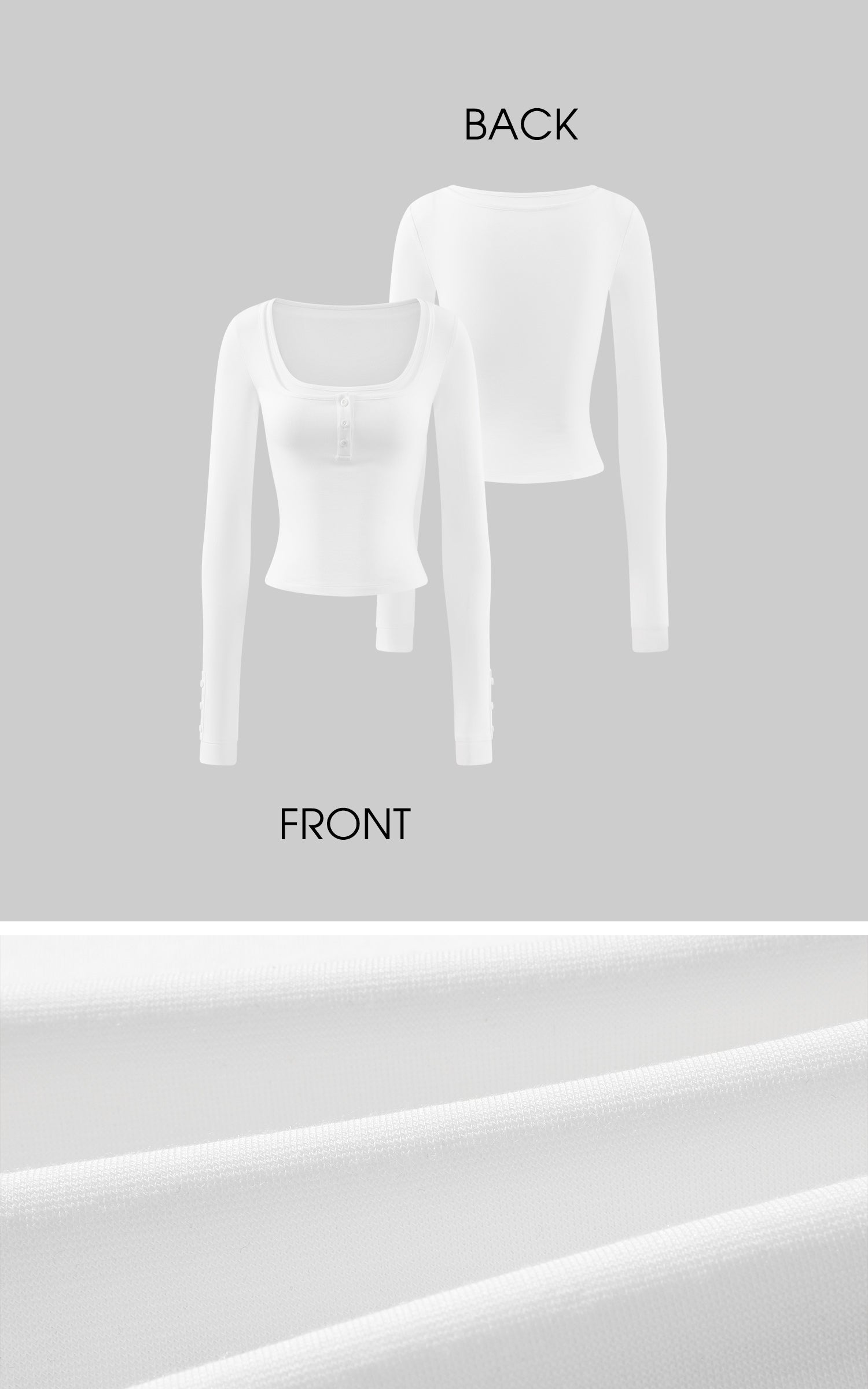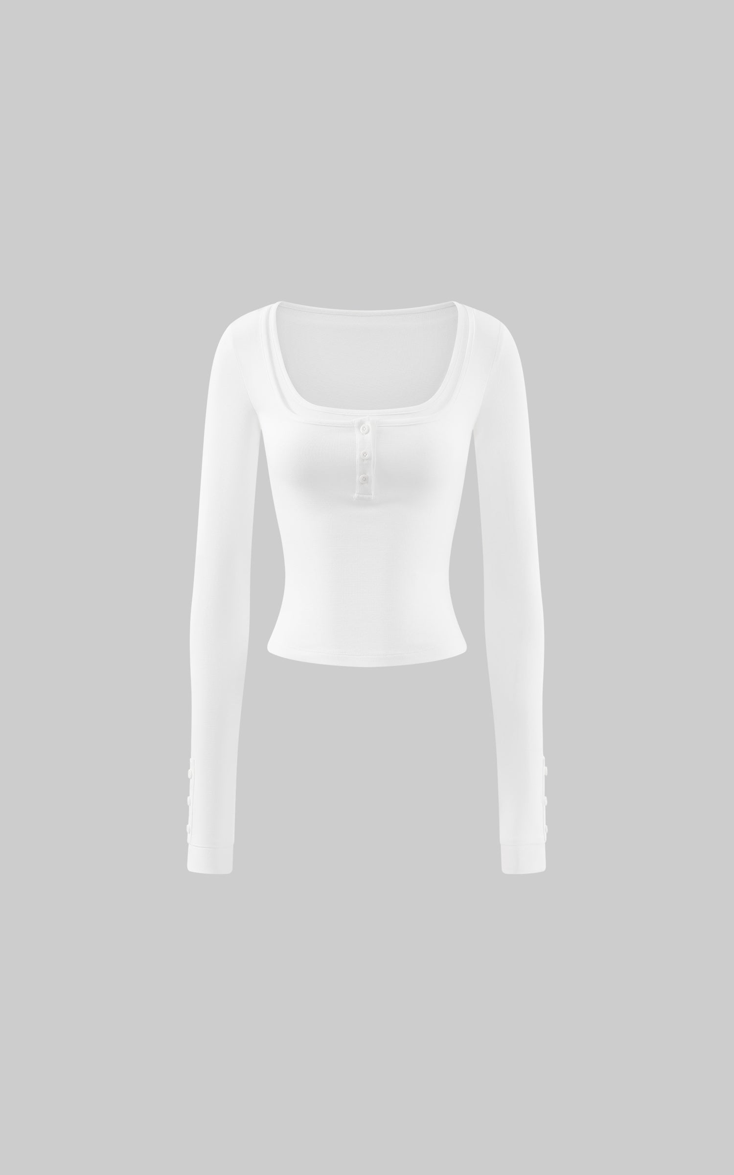 A sleek reinterpretation of the classic tee, this layered-effect long sleeve top blends minimalism with sharp feminine structure. Crafted from soft stretch cotton, it features a wide square neckline, buttoned placket, and subtle sleeve details. The close fit contours the body with ease, making it a versatile base layer that shifts seamlessly from casual street looks to elevated layering pieces.