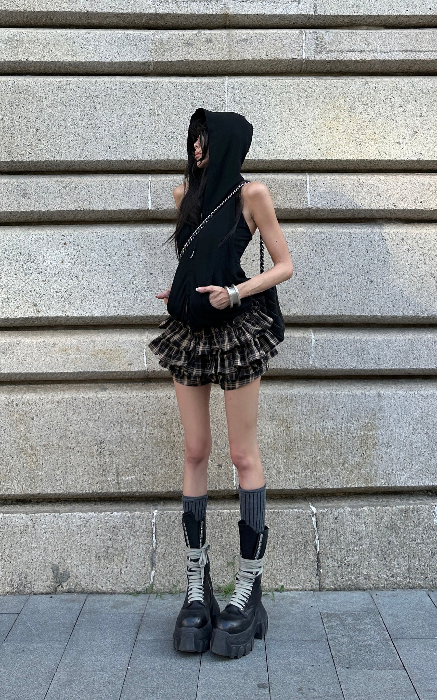 A playful twist on streetwear, this mini skirt features a layered construction combining soft jersey shorts with a crisp outer skirt. The elastic waistband is finished with a functional drawstring for an adjustable fit, while the flared silhouette adds dynamic movement. Designed for comfort and statement styling, it pairs effortlessly with oversized sweats, crop tops, or structured jackets for an elevated casual look.