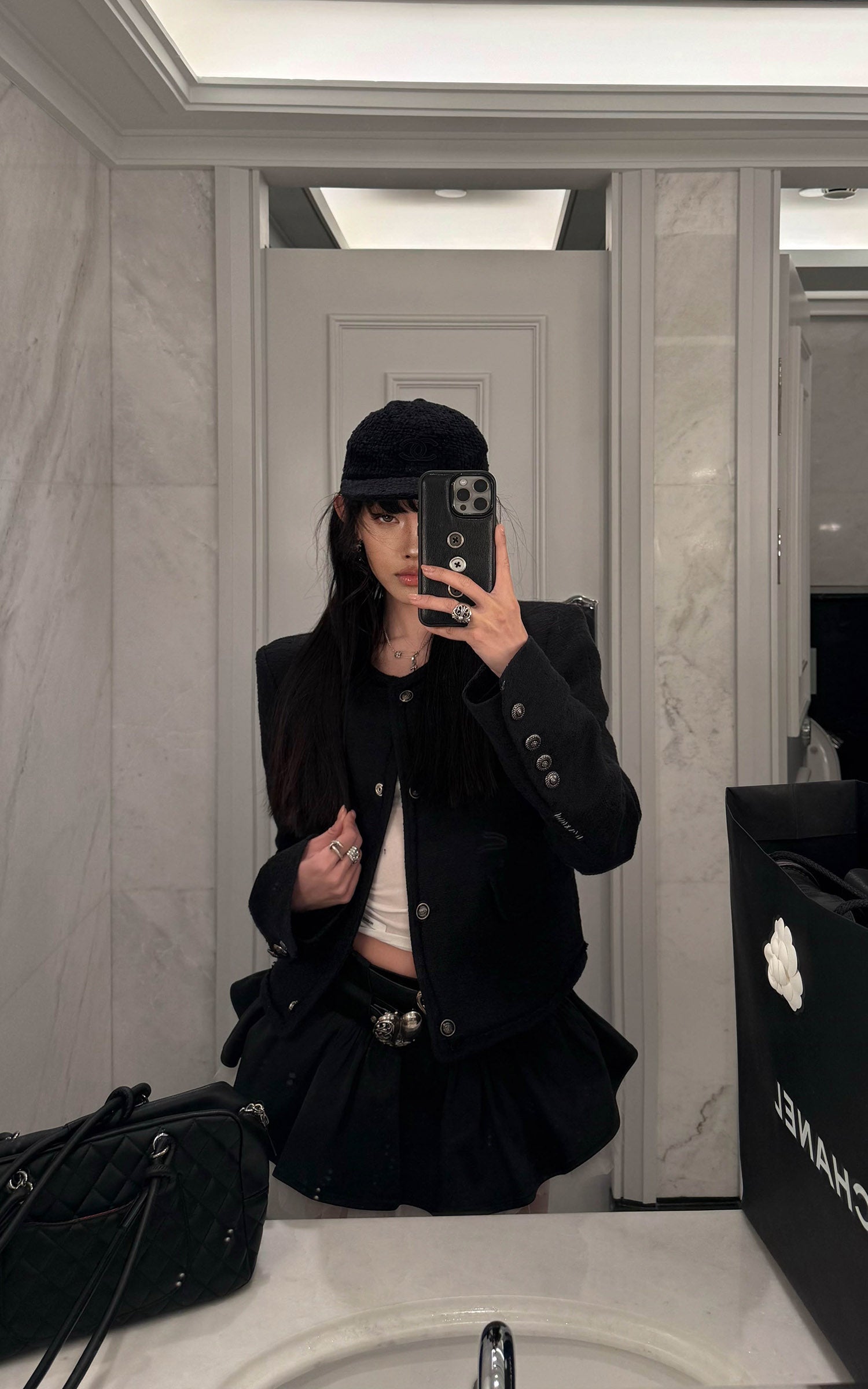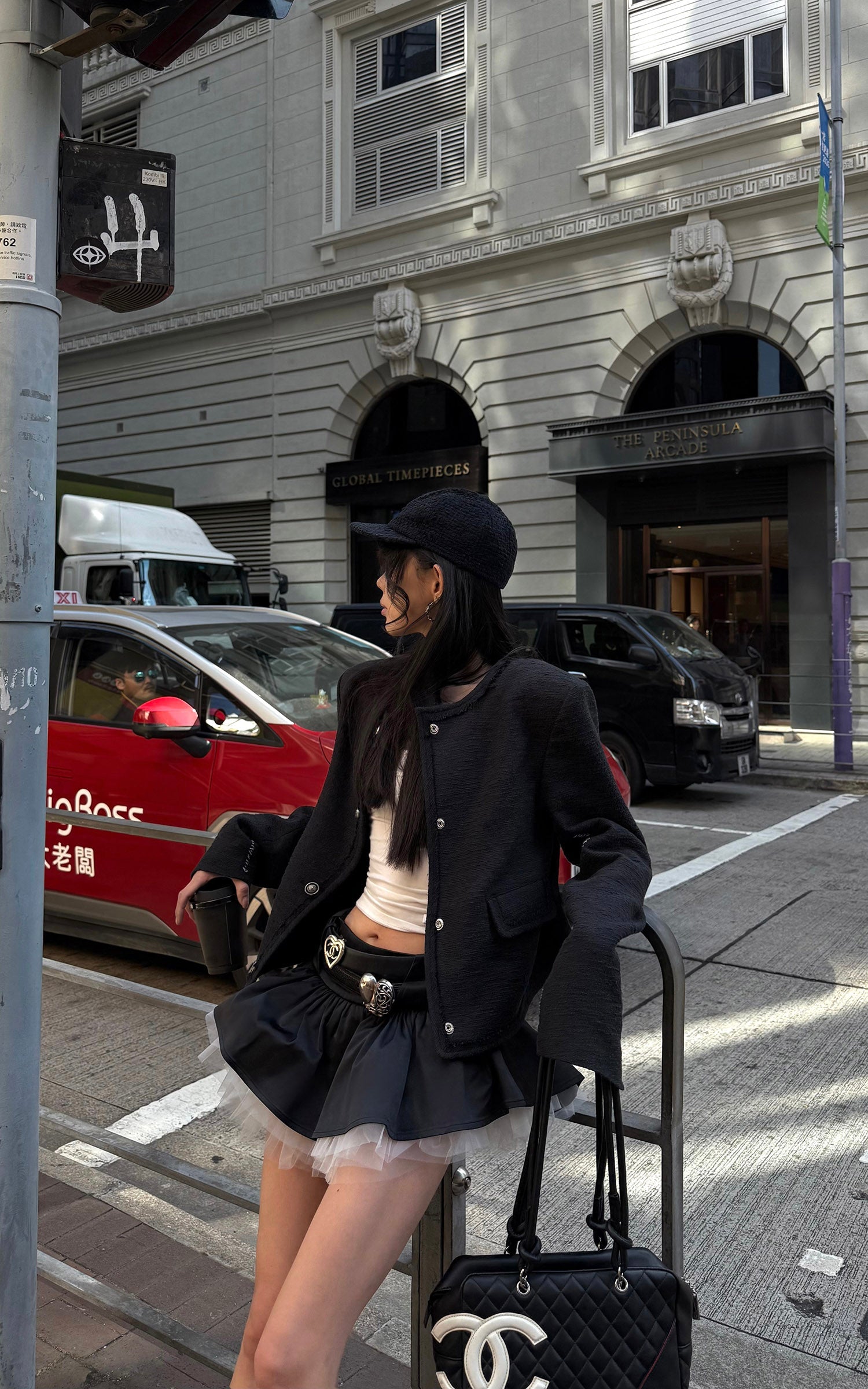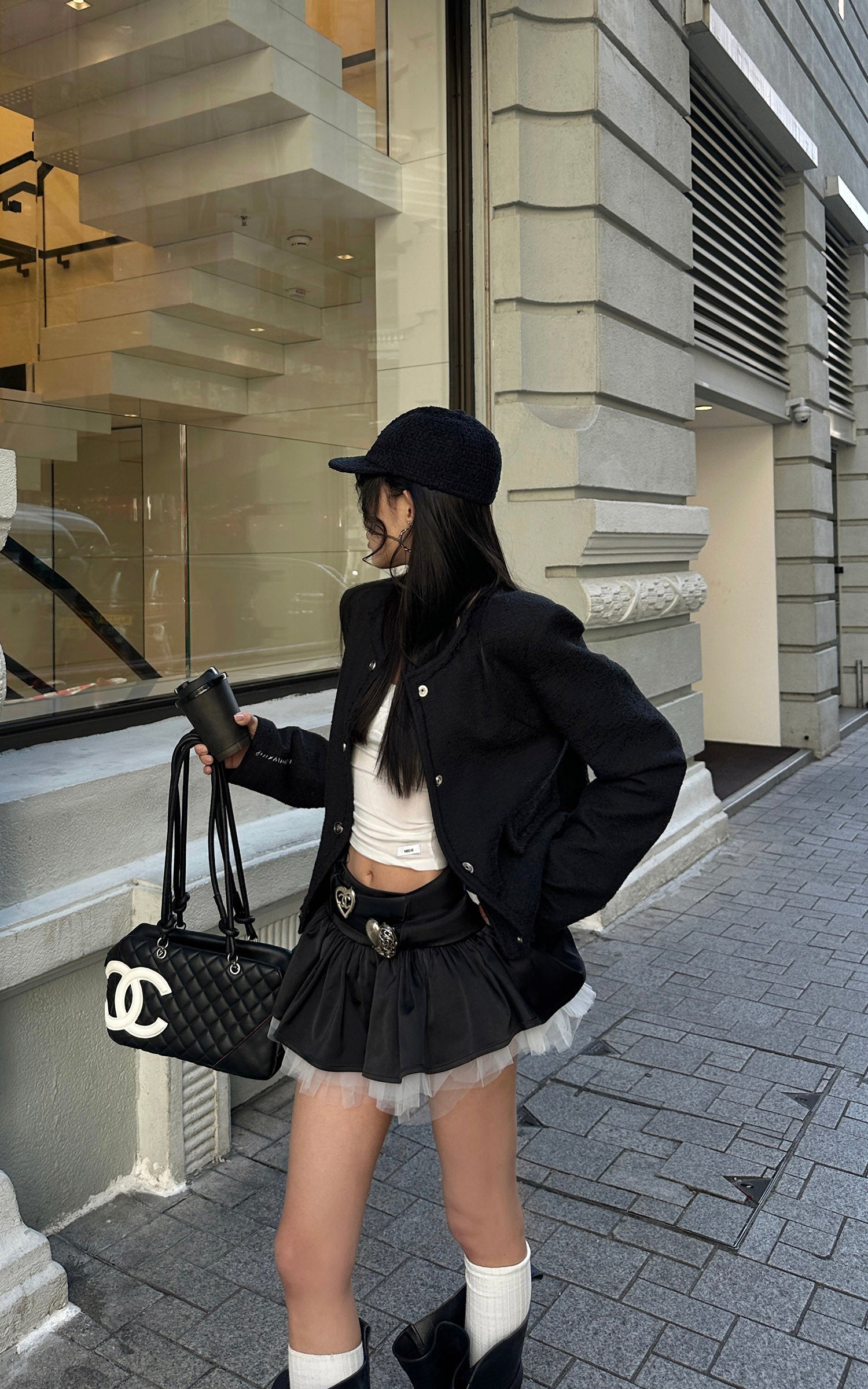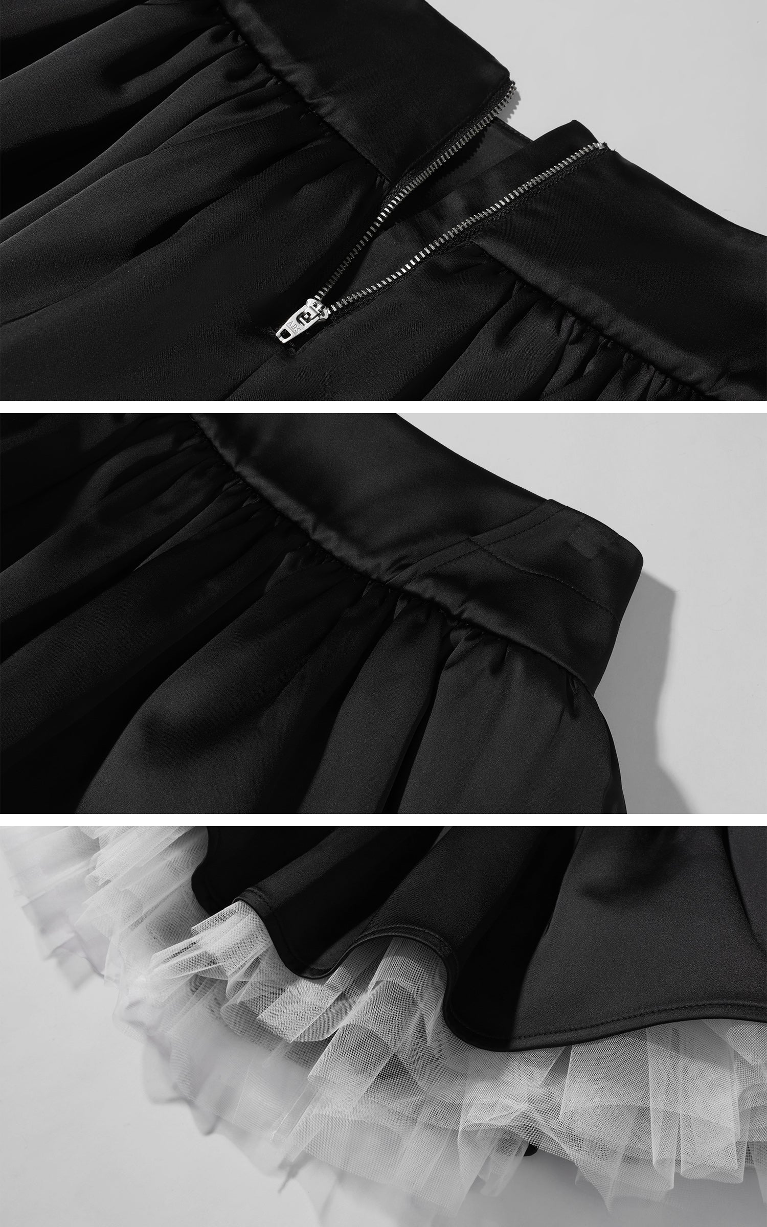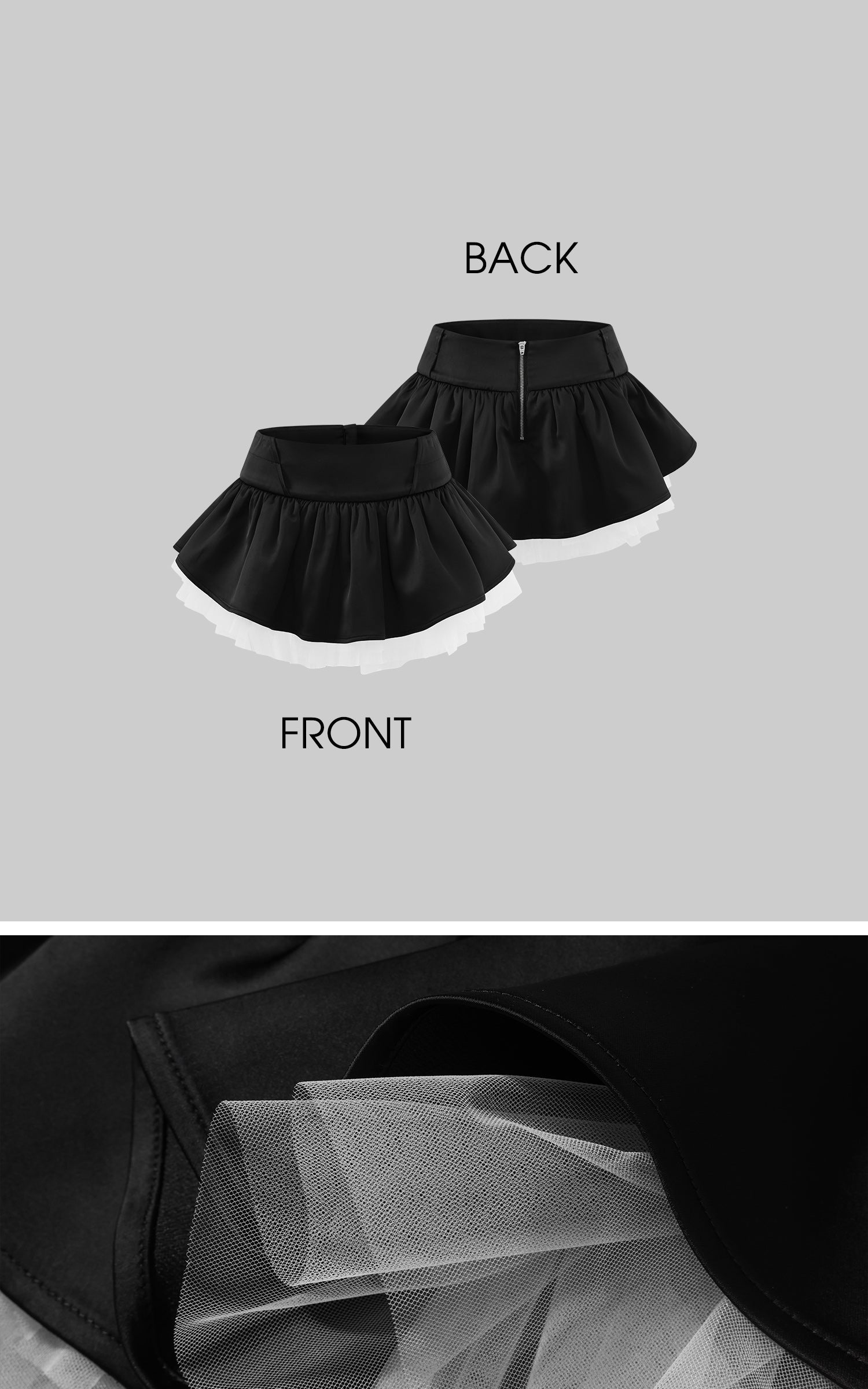 A sharp mini skirt defined by layered construction and subtle contrast. The high-waist silhouette elongates the frame, while the smooth outer layer drapes cleanly over a sheer tulle underlayer, creating depth and movement with every step. Finished with a concealed back zipper for a streamlined fit, this piece balances structure and softness. Designed to stand alone or pair effortlessly with fitted tops or tailored outerwear, it delivers a modern, directional attitude with refined edge.
