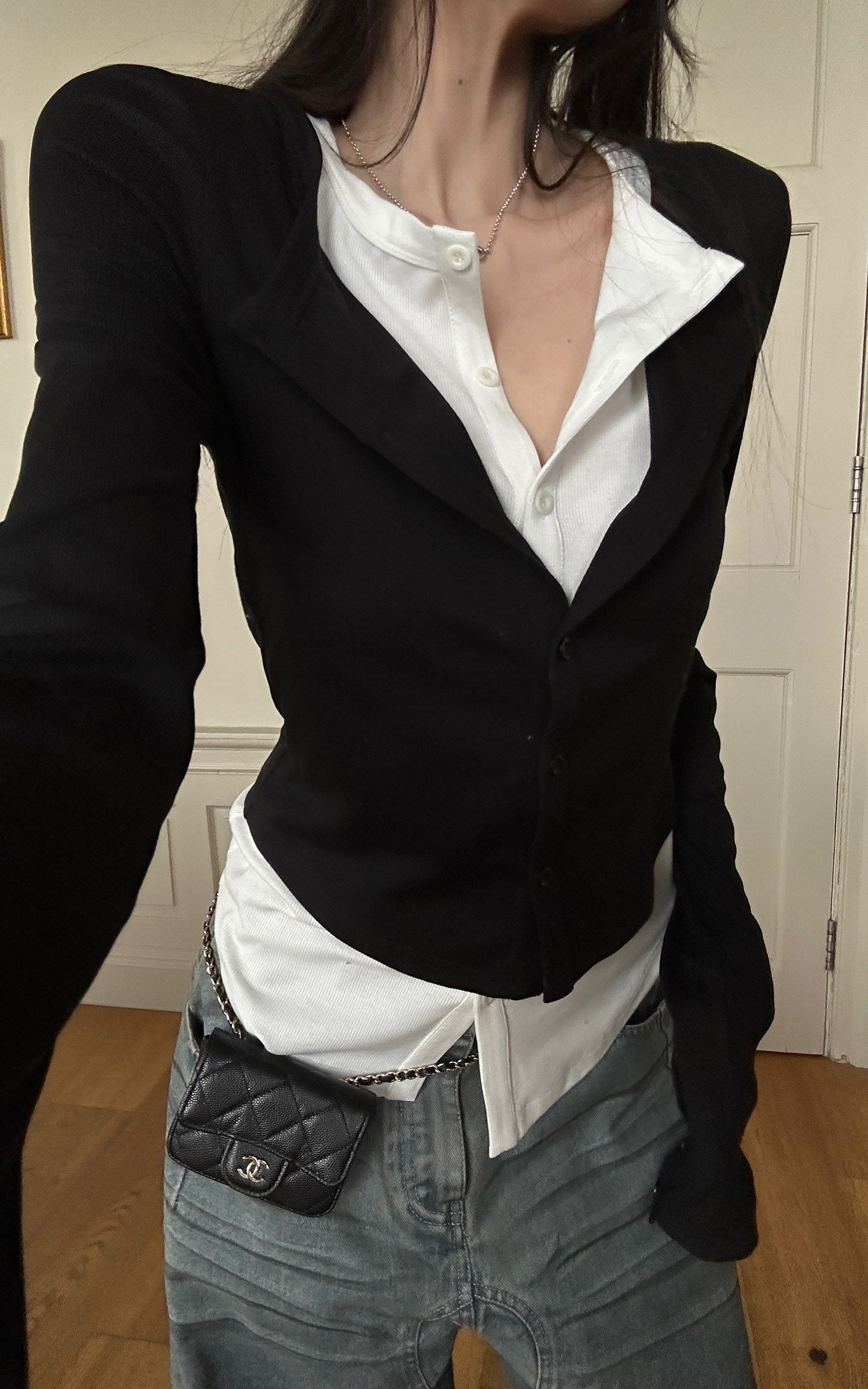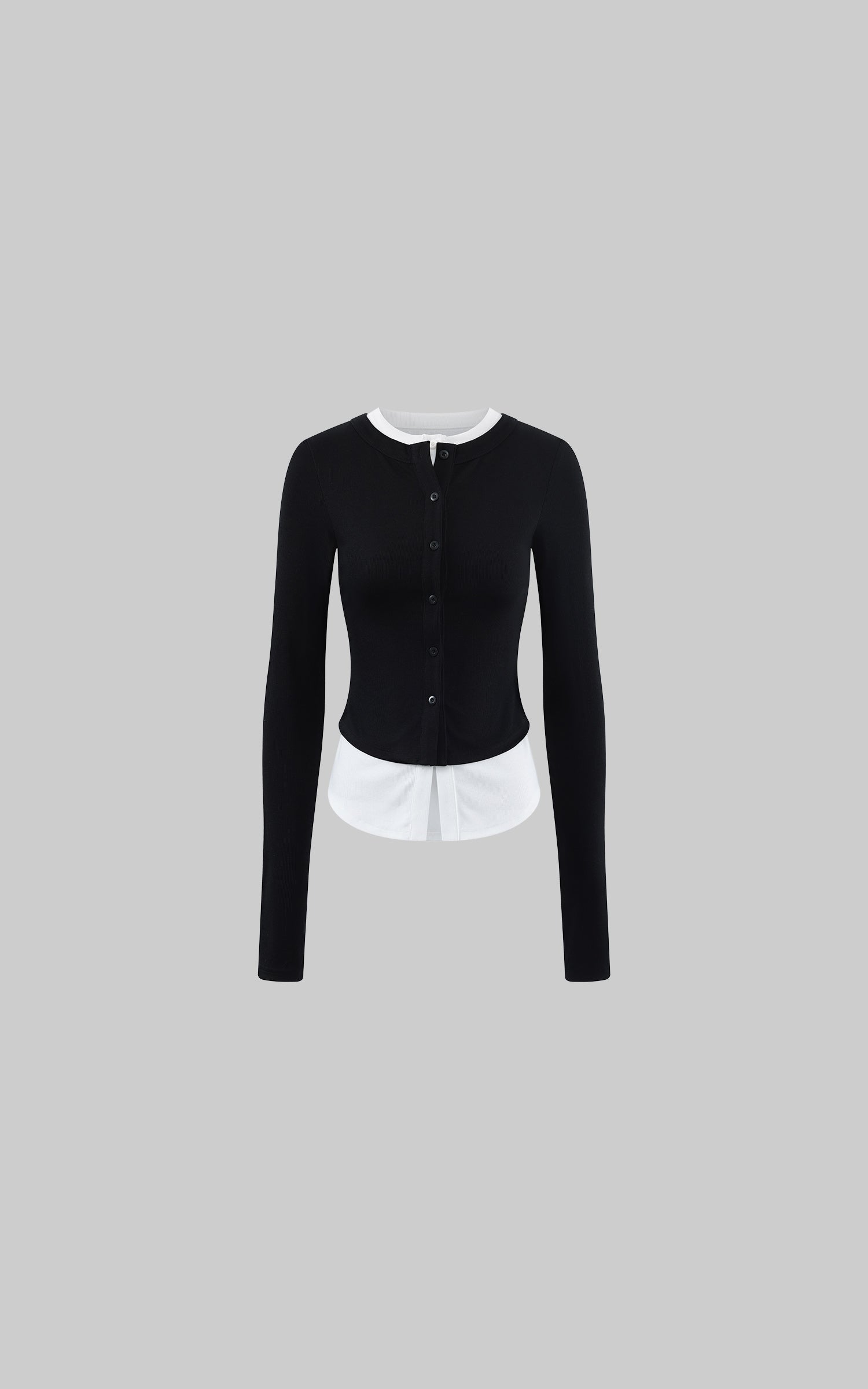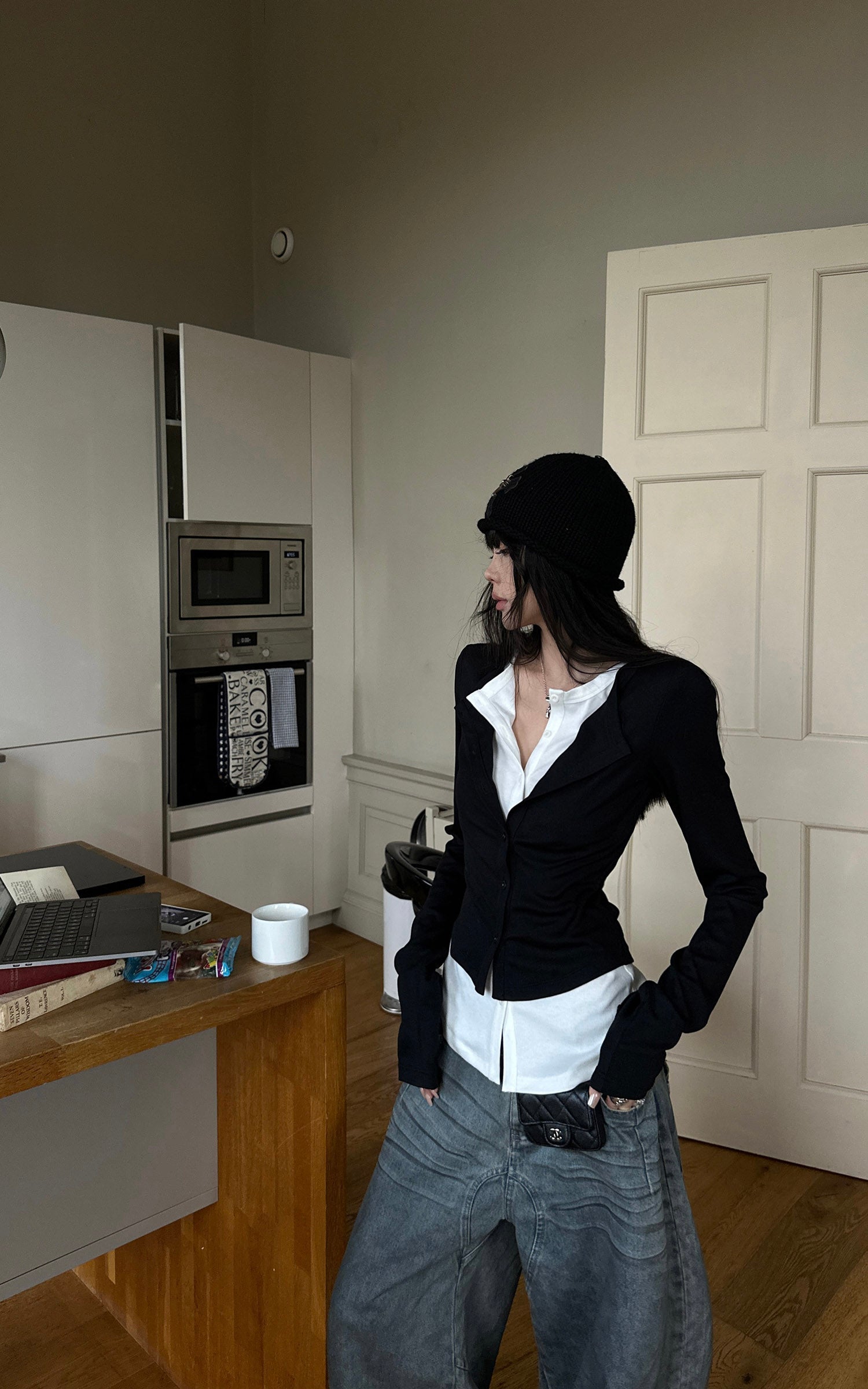 This layered V-neck top merges the sharpness of tailoring with the ease of stretch knit. The outer panel sculpts a fitted silhouette, while the inner ribbed layer brings contrast and depth, creating a clean dual-layer effect without bulk. Button details extend through the sleeves, offering adjustable styling and subtle deconstruction. Soft, resilient fabric shapes comfortably to the body, making it ideal for pairing with wide-leg denim or structured bottoms for a modern, minimal street look.