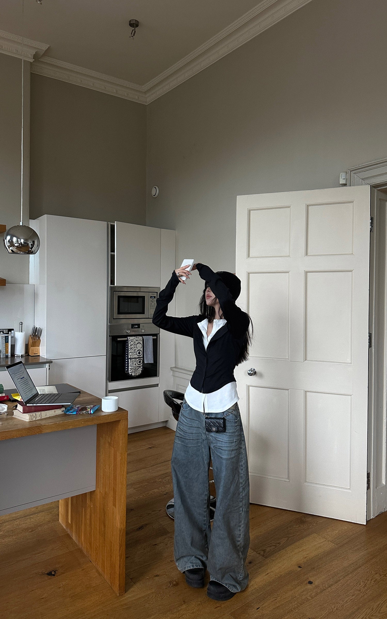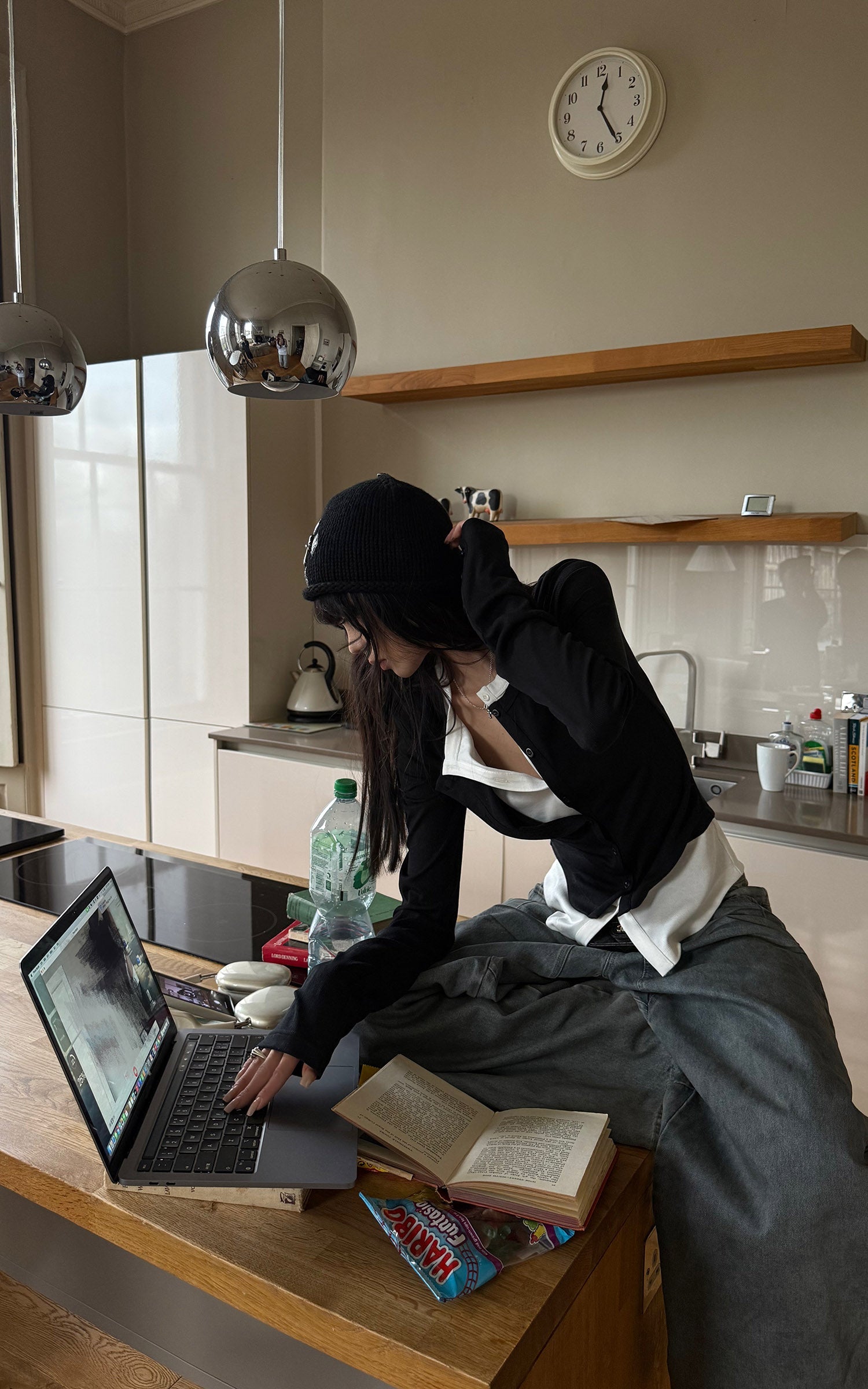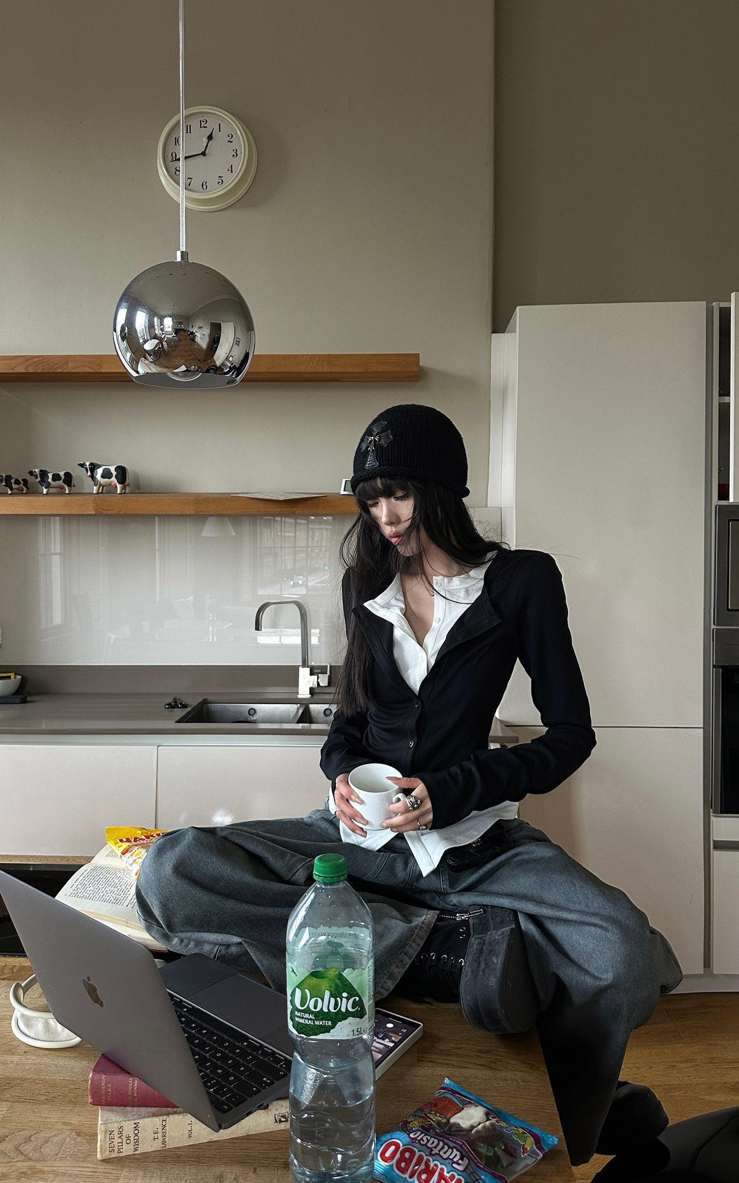 This layered V-neck top merges the sharpness of tailoring with the ease of stretch knit. The outer panel sculpts a fitted silhouette, while the inner ribbed layer brings contrast and depth, creating a clean dual-layer effect without bulk. Button details extend through the sleeves, offering adjustable styling and subtle deconstruction. Soft, resilient fabric shapes comfortably to the body, making it ideal for pairing with wide-leg denim or structured bottoms for a modern, minimal street look.
