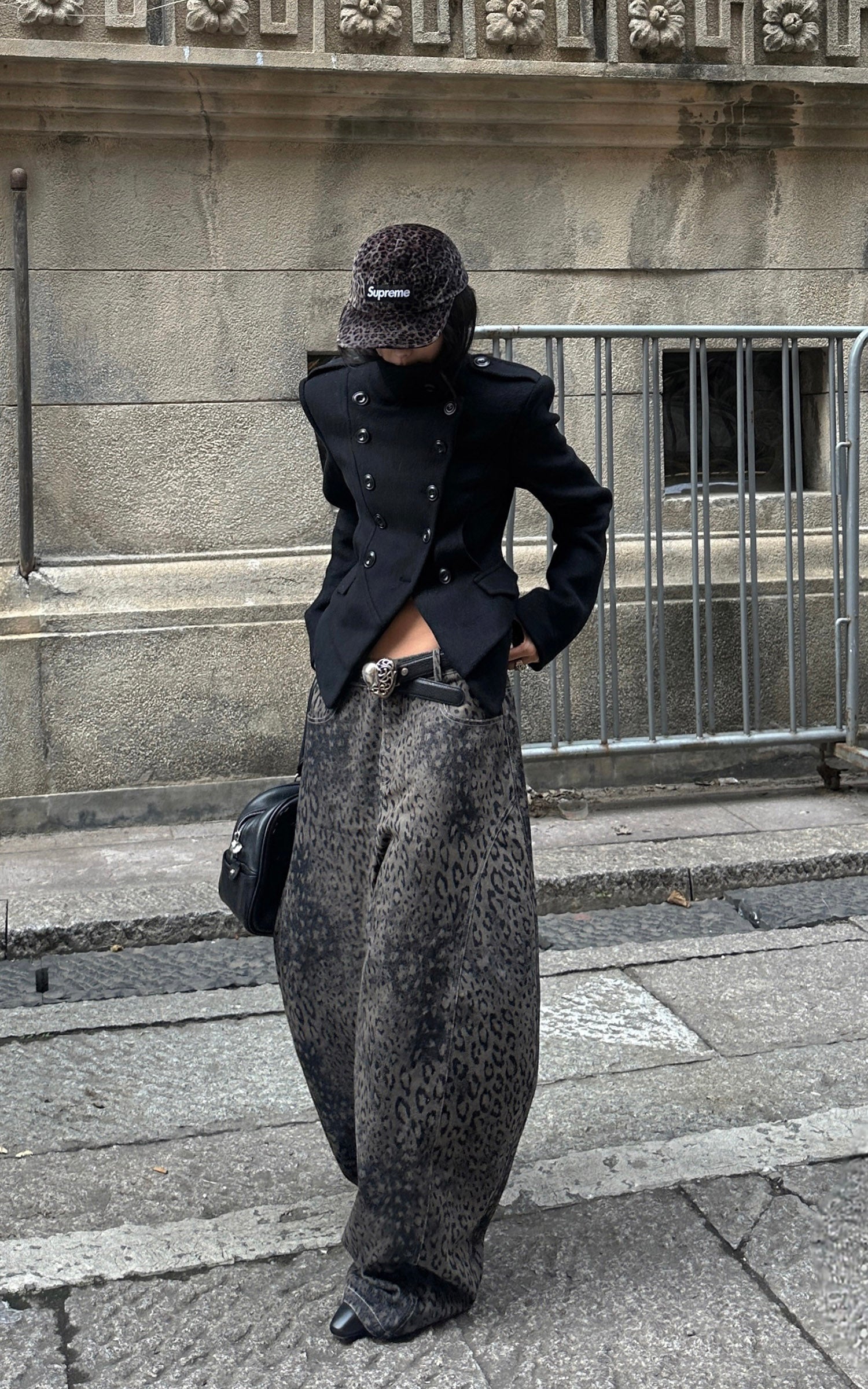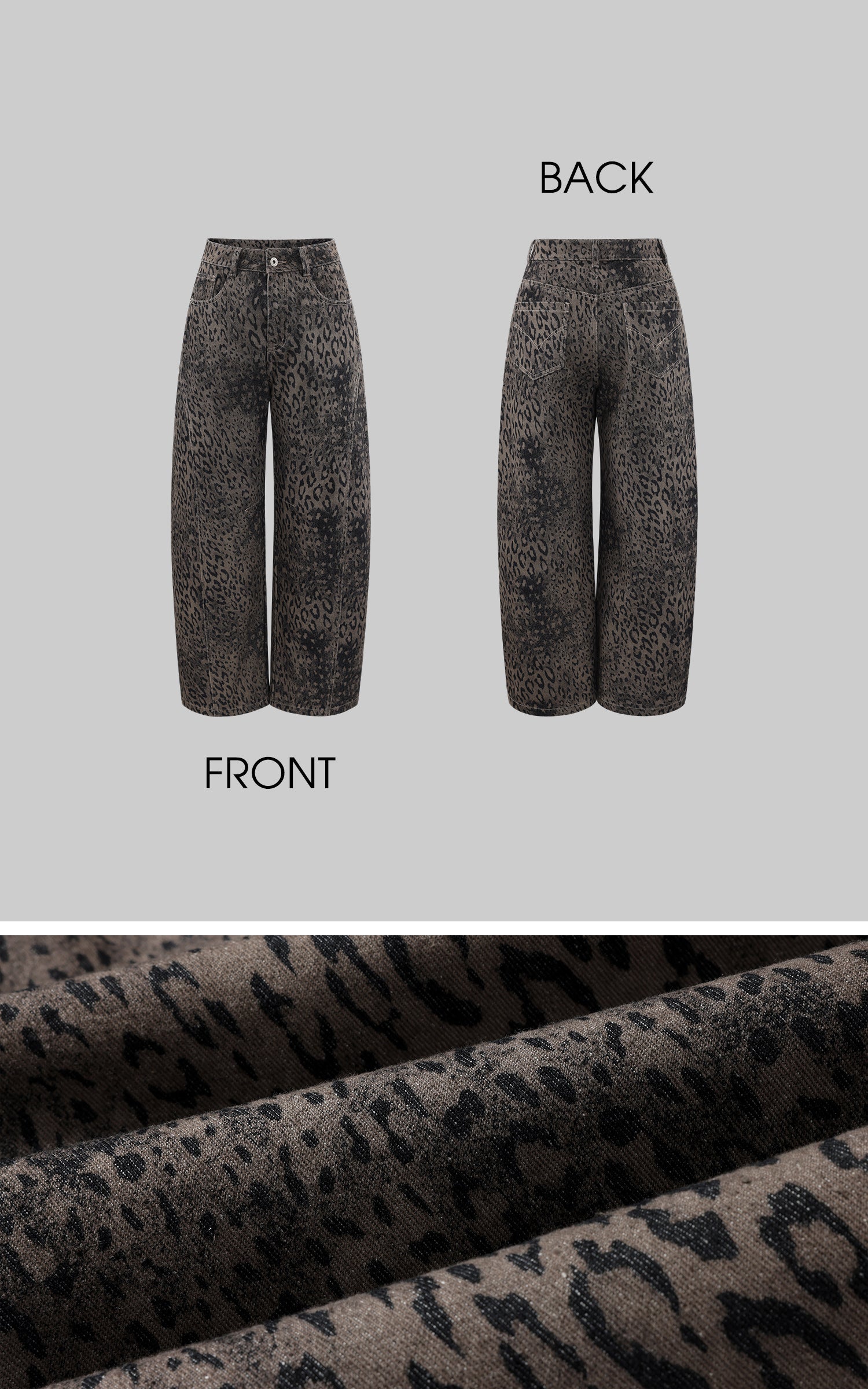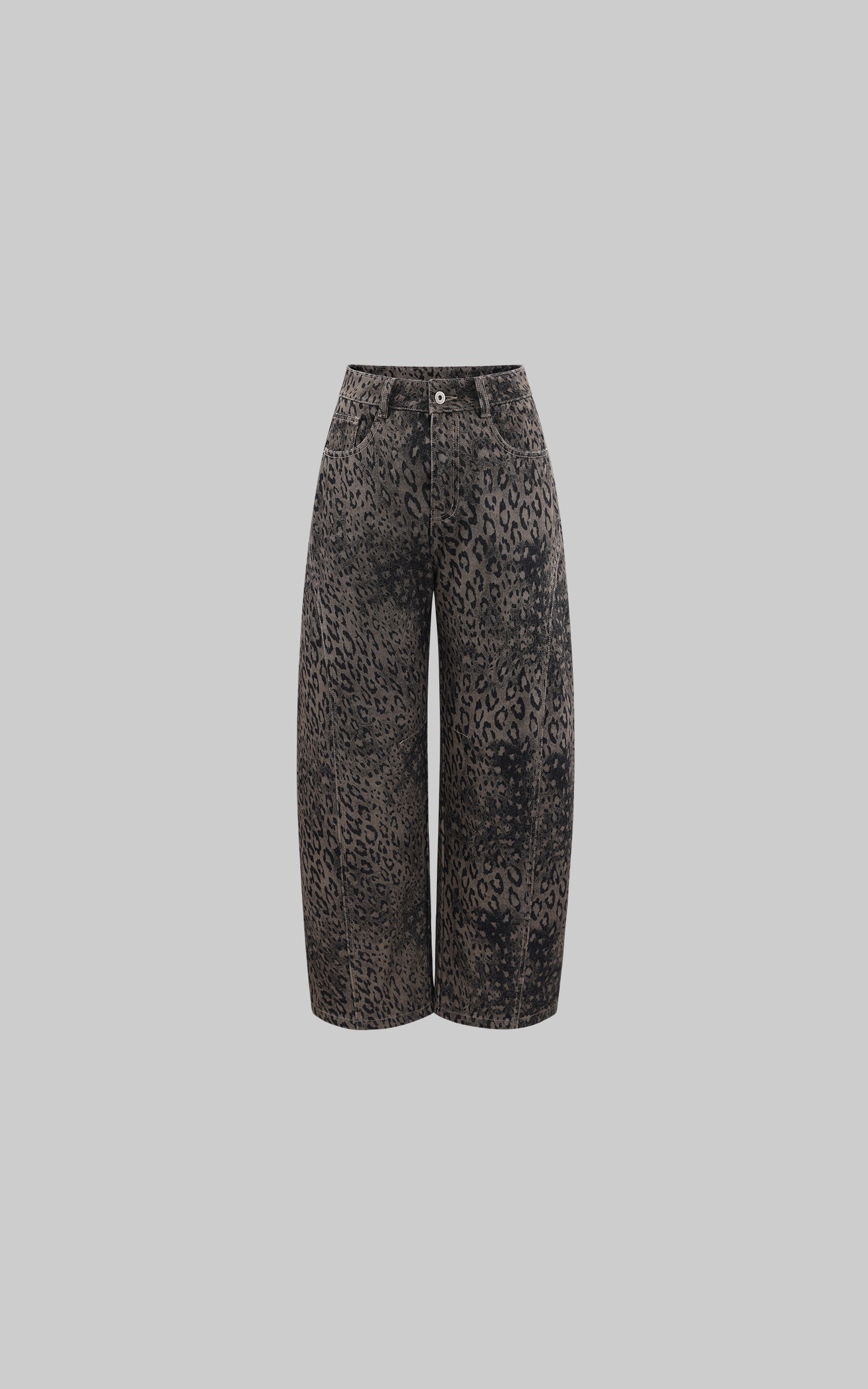 A wide-leg denim silhouette built with attitude—cut from heavy washed fabric and marked with an all-over blurred leopard pattern. The structure sits high on the waist, dropping into a loose, slouching volume that moves with an urban, off-center rhythm. Subtle distressing adds depth, while the classic five-pocket layout keeps it grounded in utility. A statement piece that sharpens everyday layering with raw texture and forward shape.
