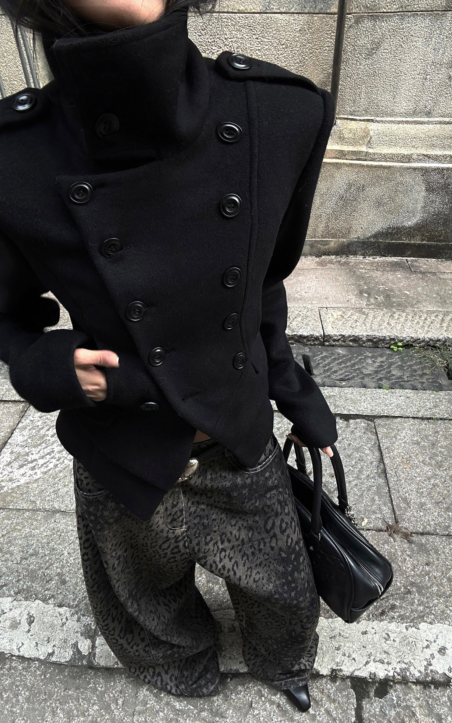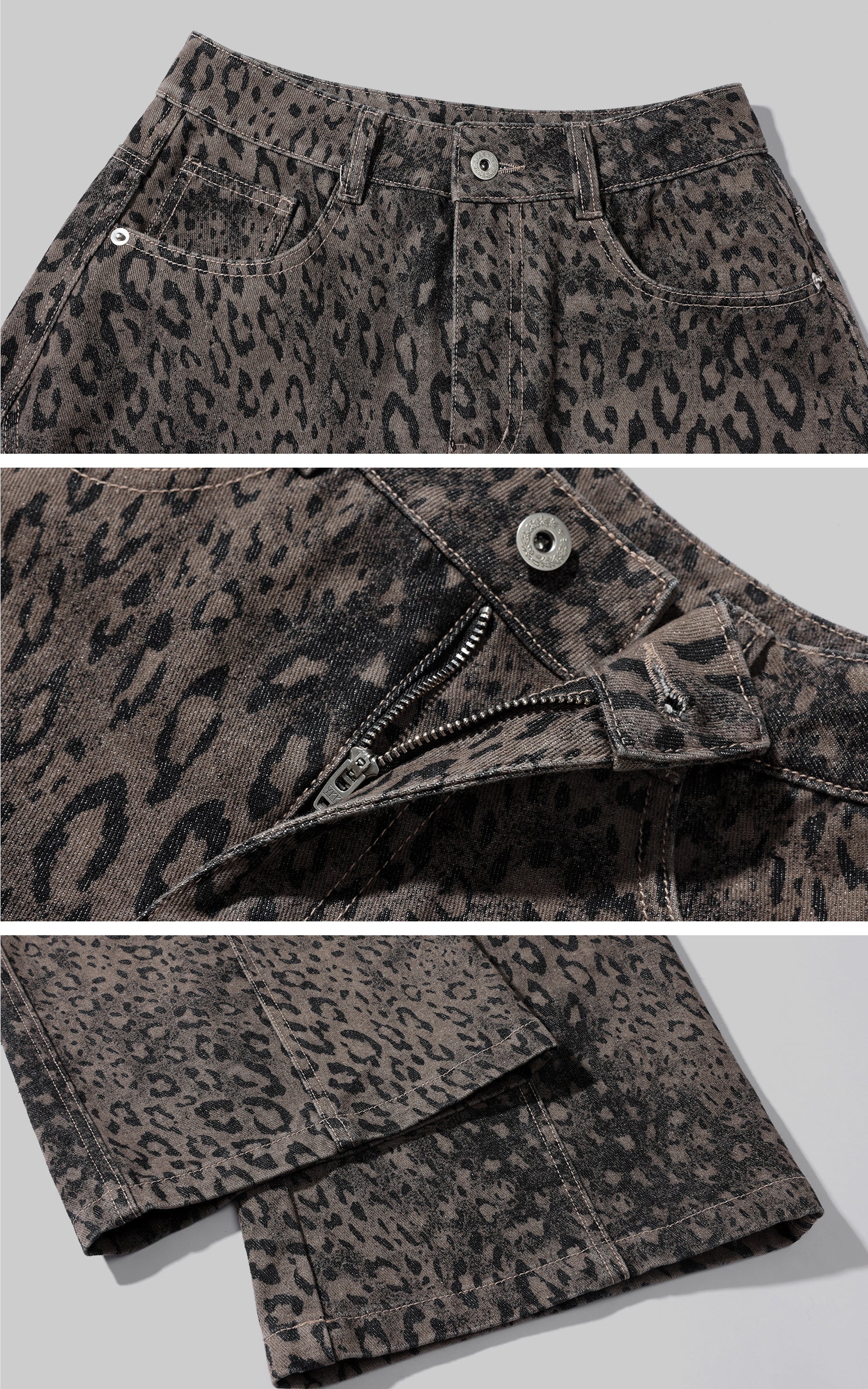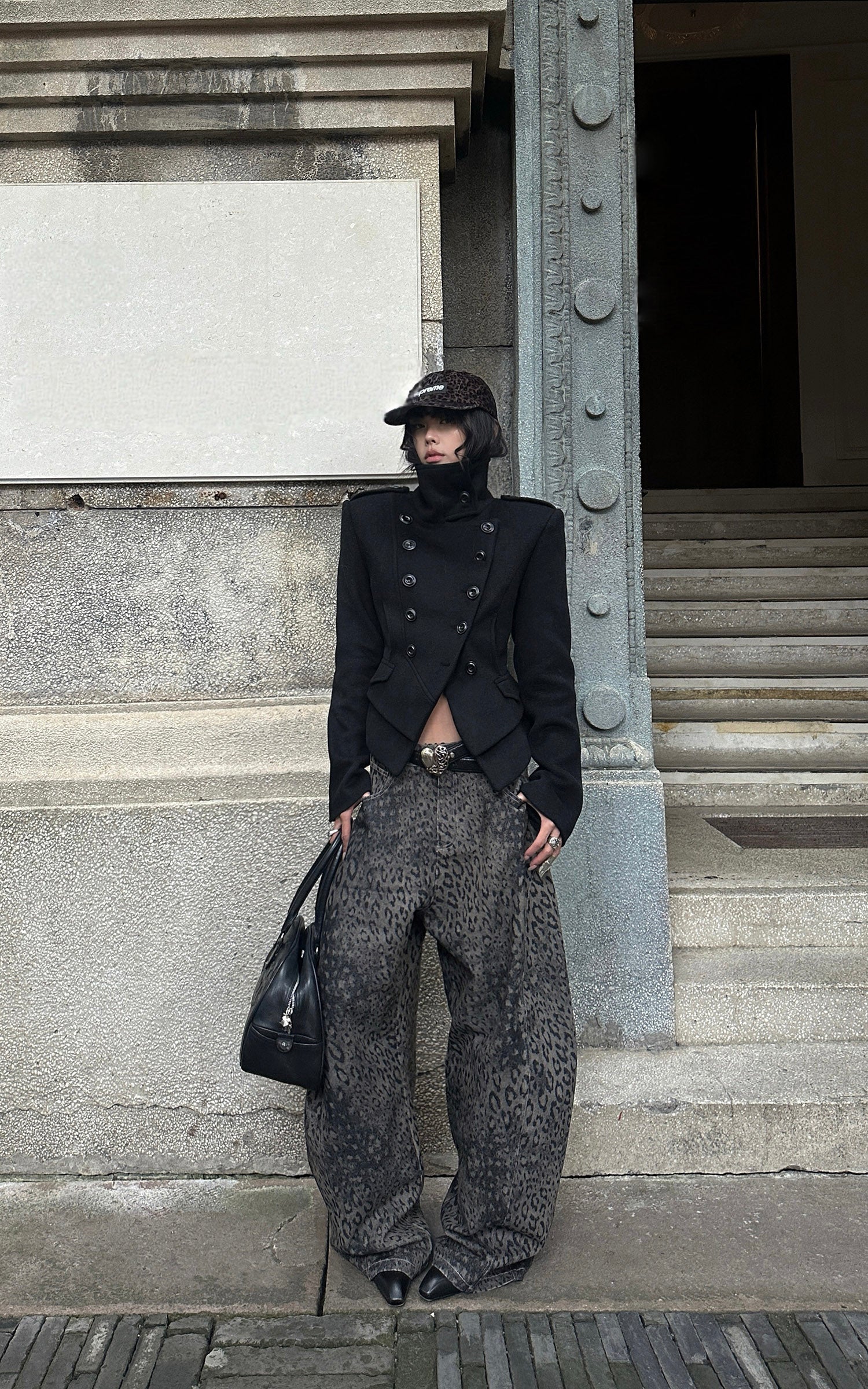 A wide-leg denim silhouette built with attitude—cut from heavy washed fabric and marked with an all-over blurred leopard pattern. The structure sits high on the waist, dropping into a loose, slouching volume that moves with an urban, off-center rhythm. Subtle distressing adds depth, while the classic five-pocket layout keeps it grounded in utility. A statement piece that sharpens everyday layering with raw texture and forward shape.