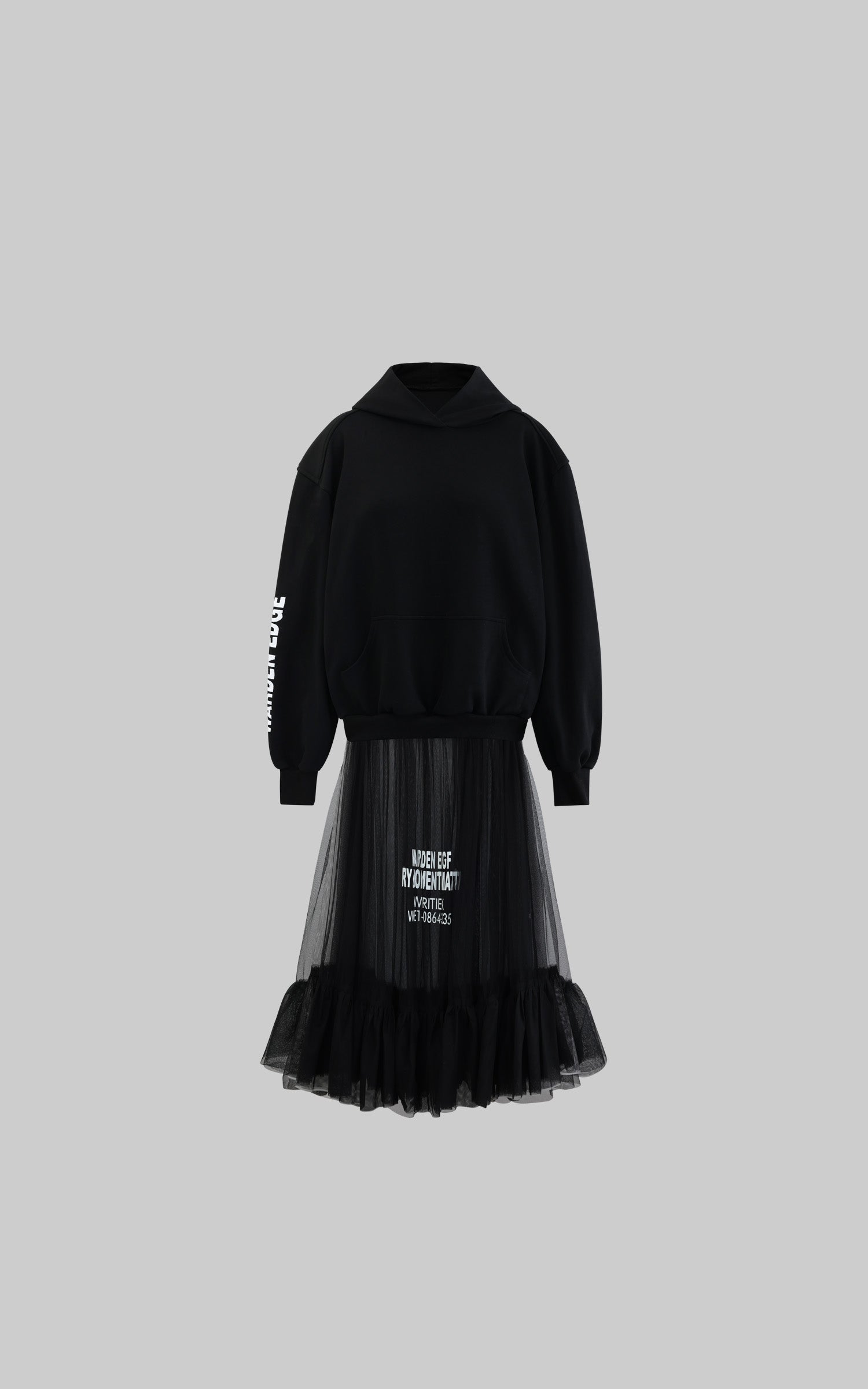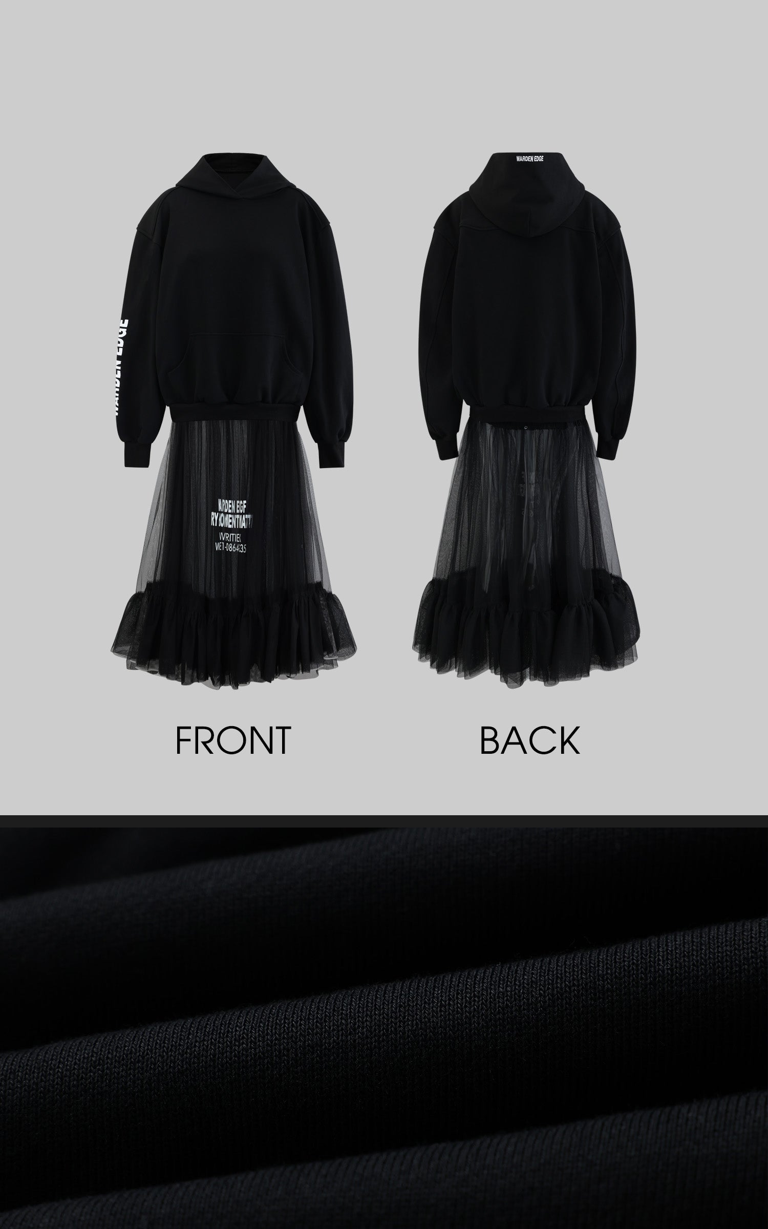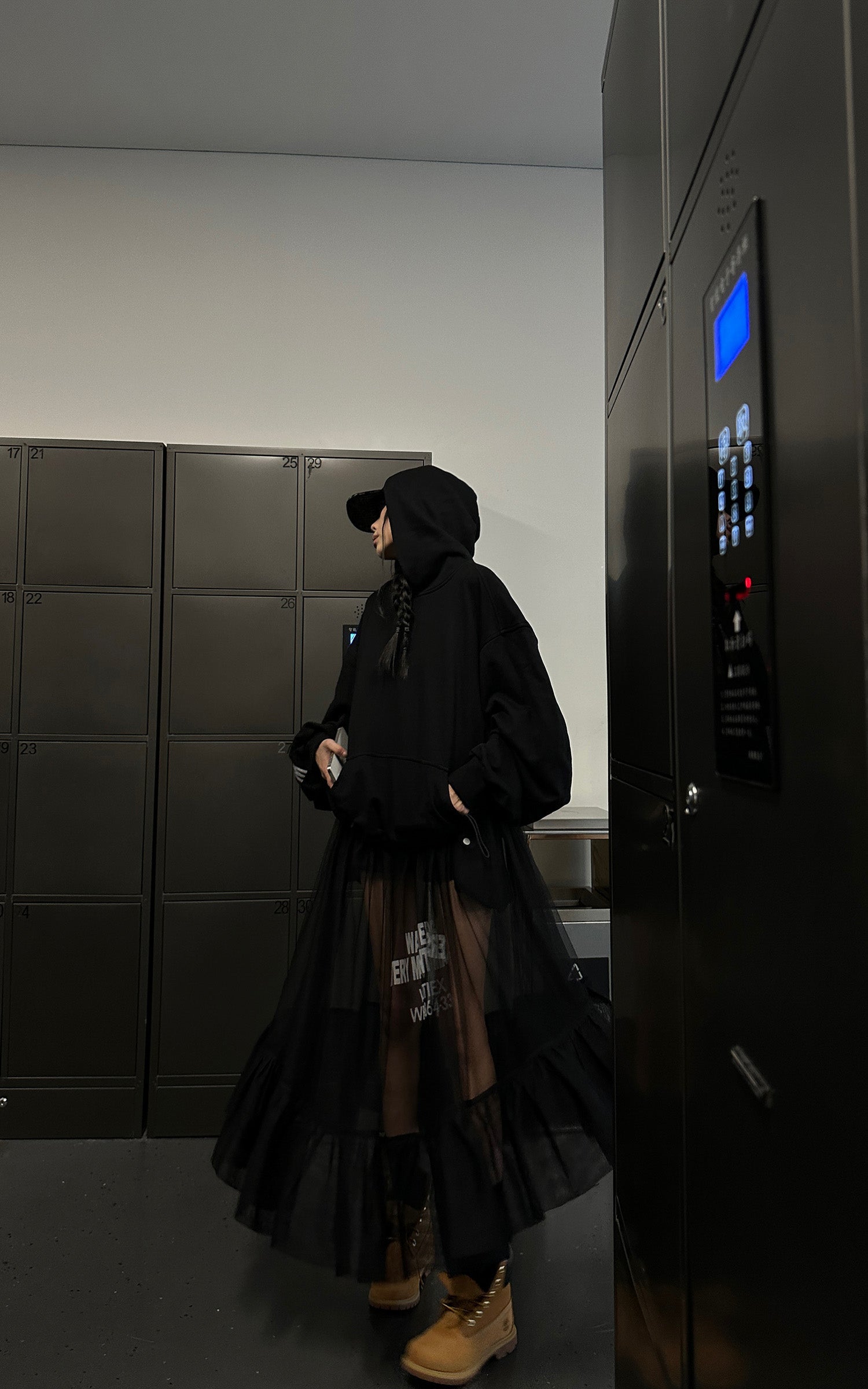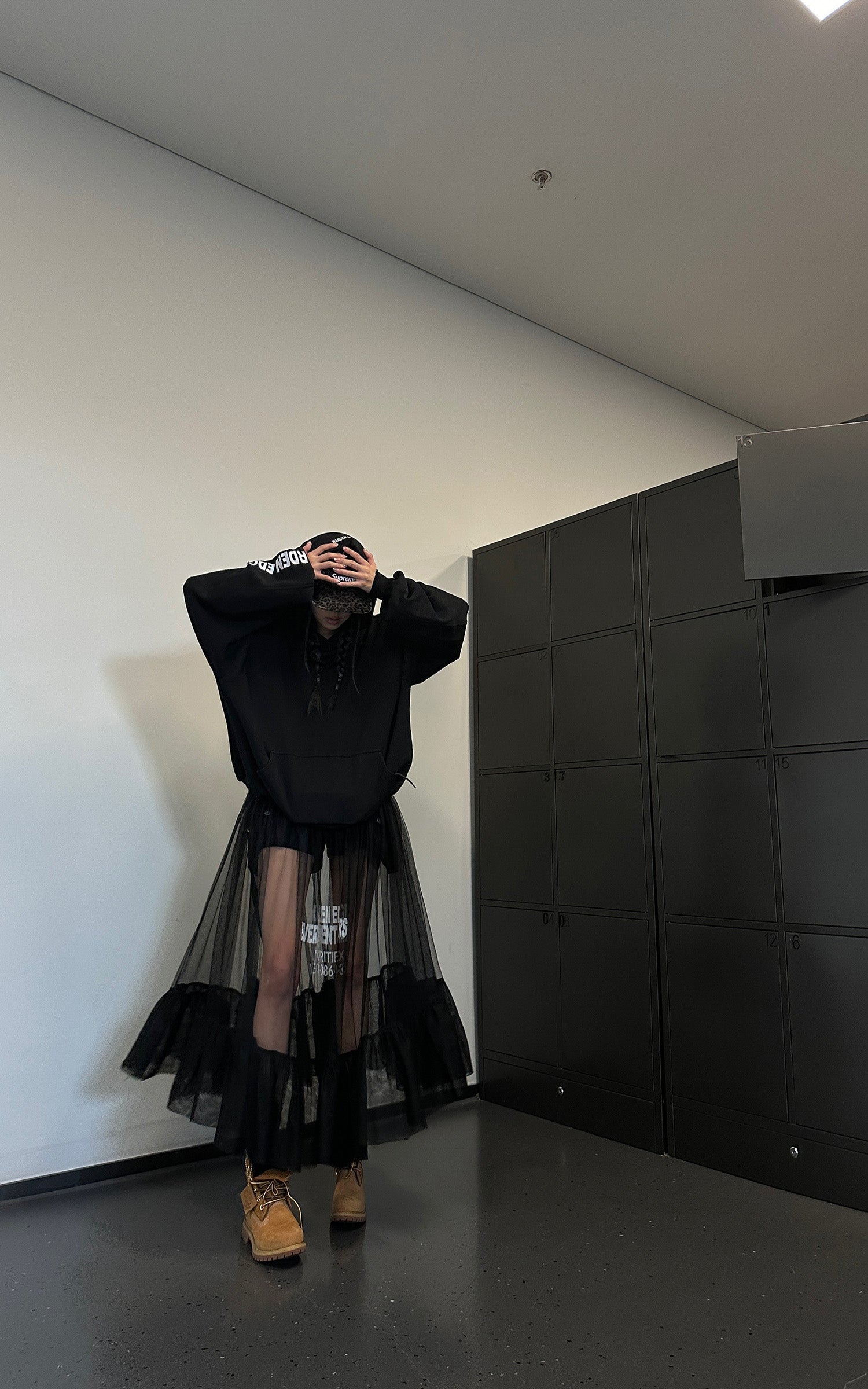 Combining sheer mesh with a cozy hoodie, this set blends street fashion with delicate textures. The contrast of the oversized hoodie and the flowing mesh skirt creates a striking look, perfect for both casual and elevated styles.