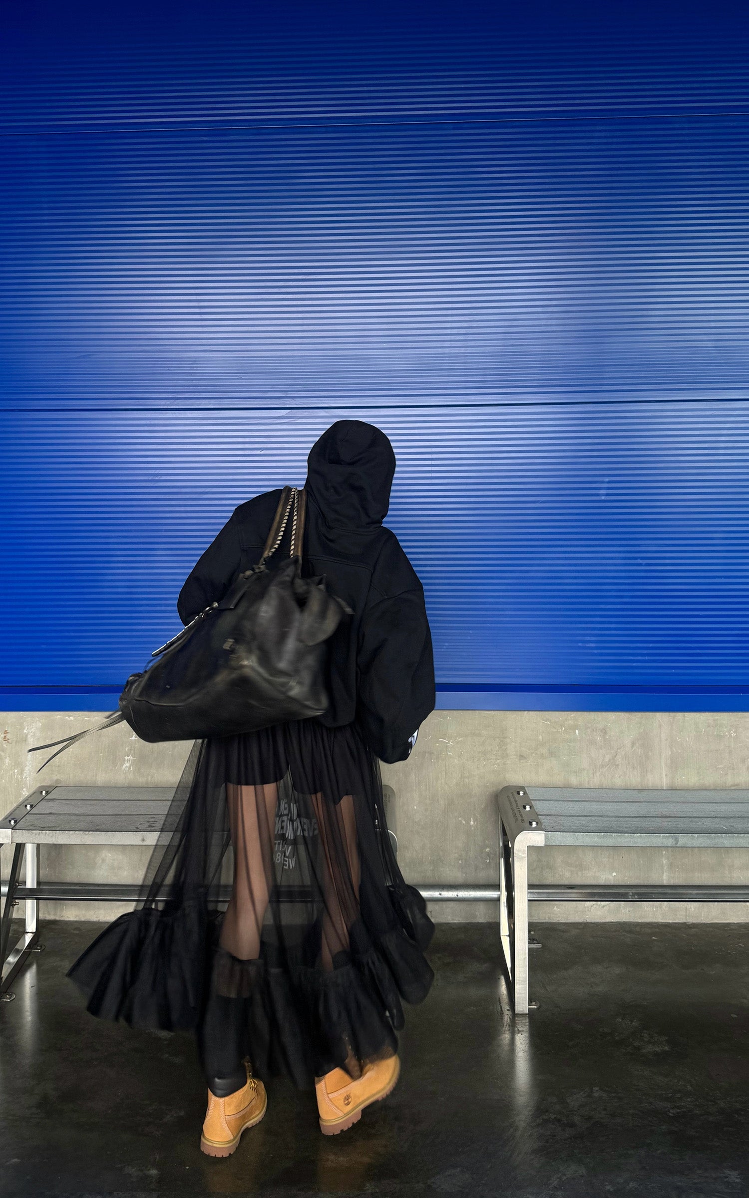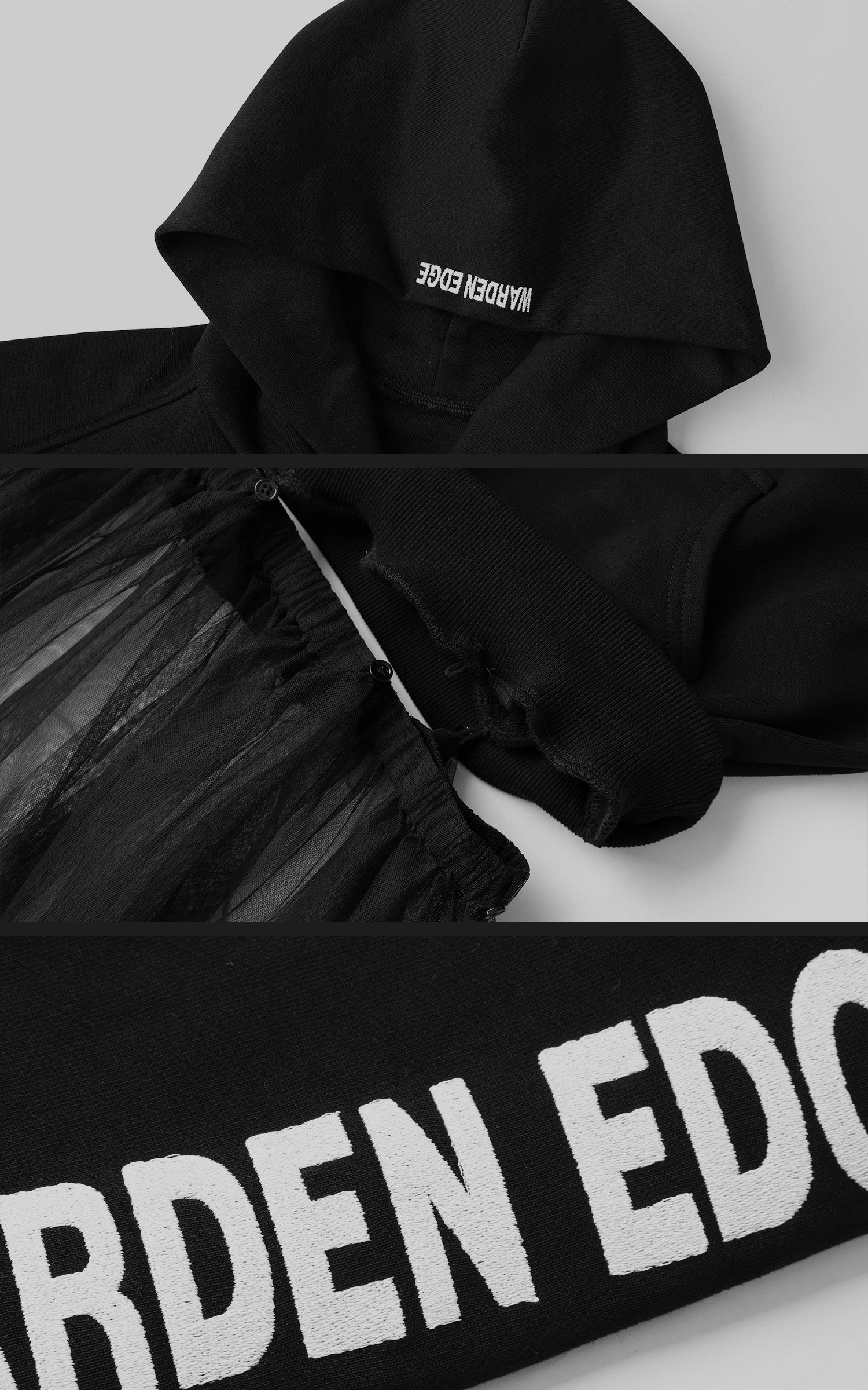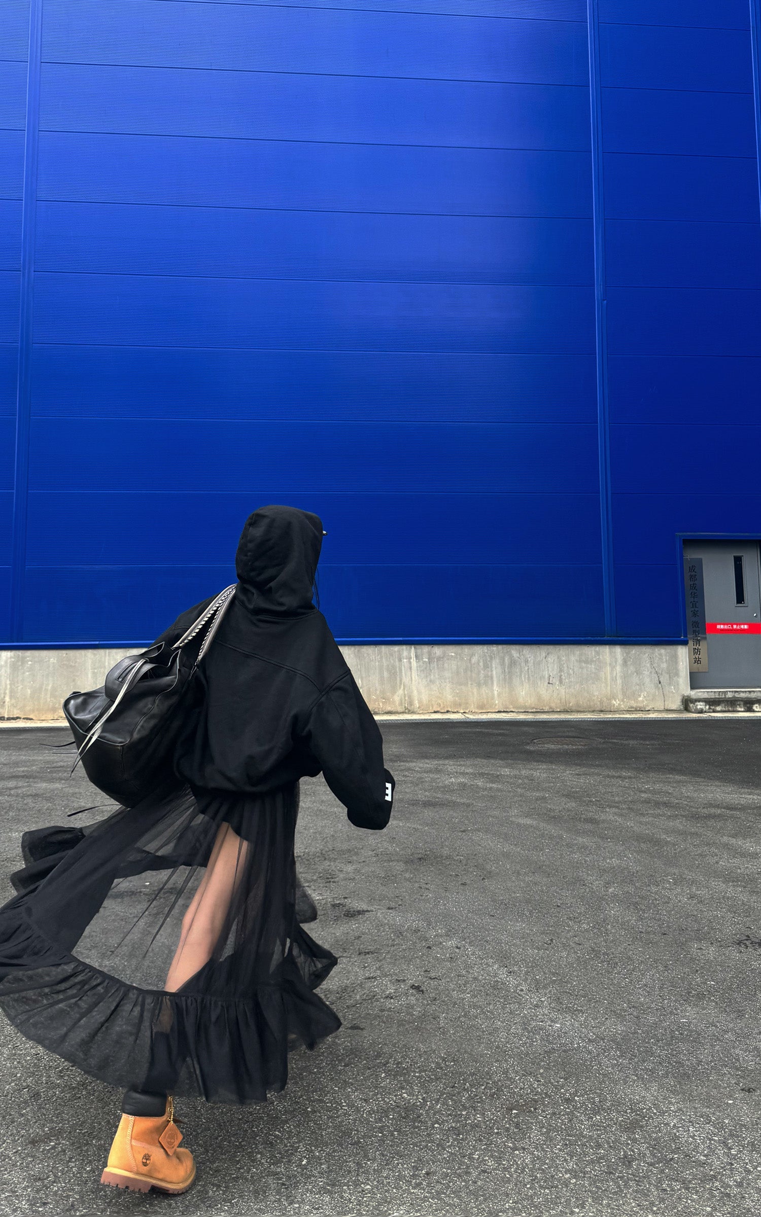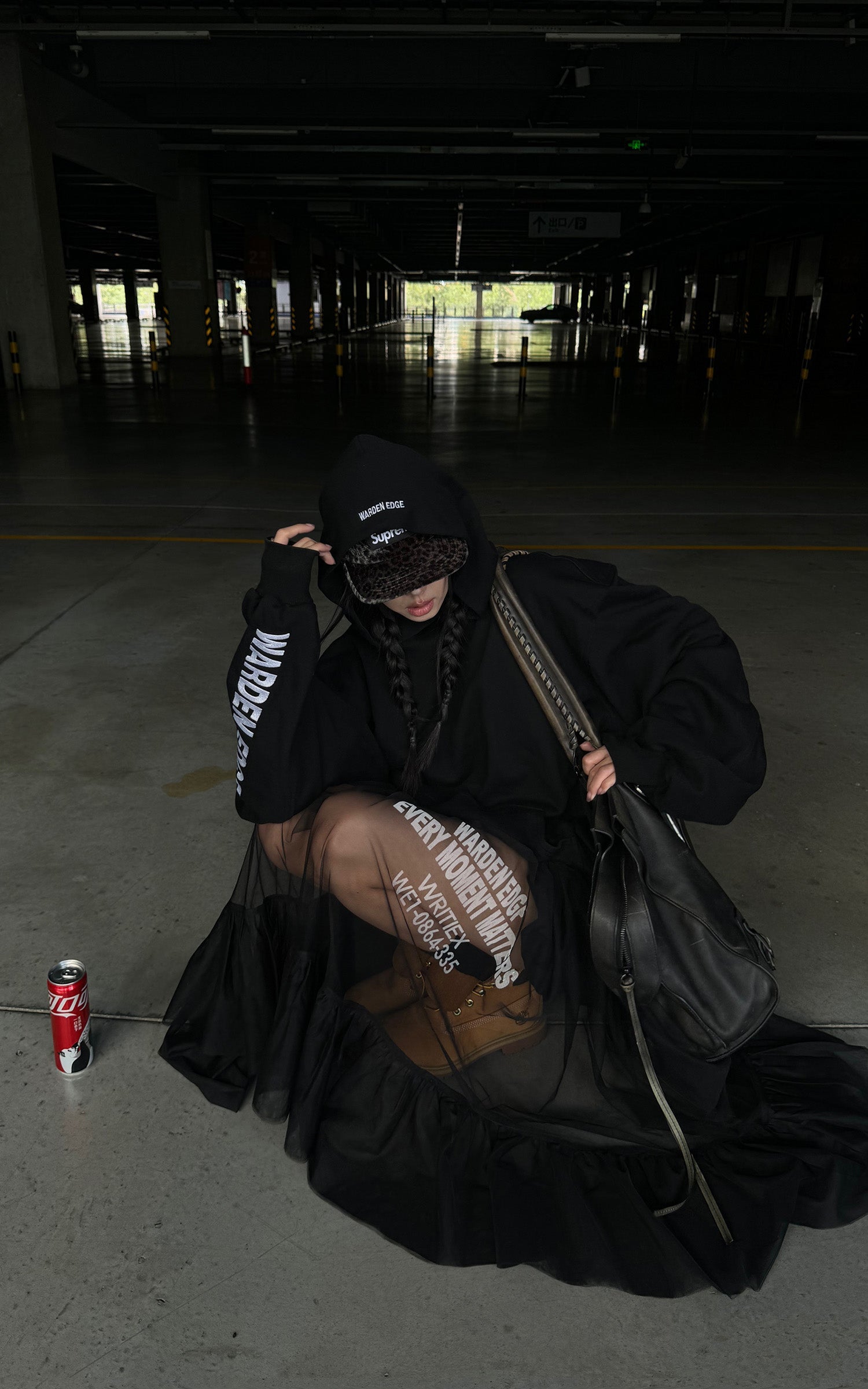 Combining sheer mesh with a cozy hoodie, this set blends street fashion with delicate textures. The contrast of the oversized hoodie and the flowing mesh skirt creates a striking look, perfect for both casual and elevated styles.