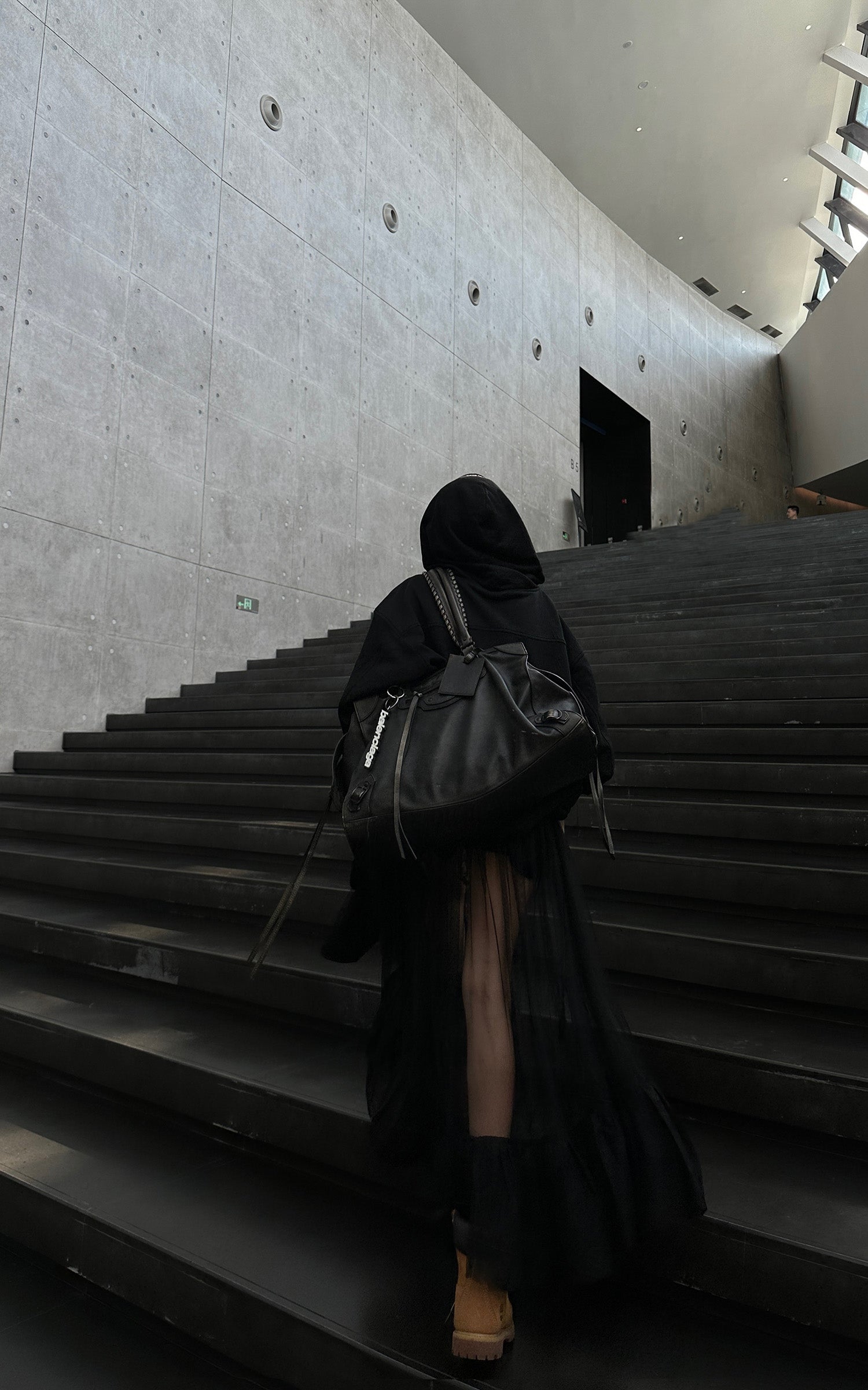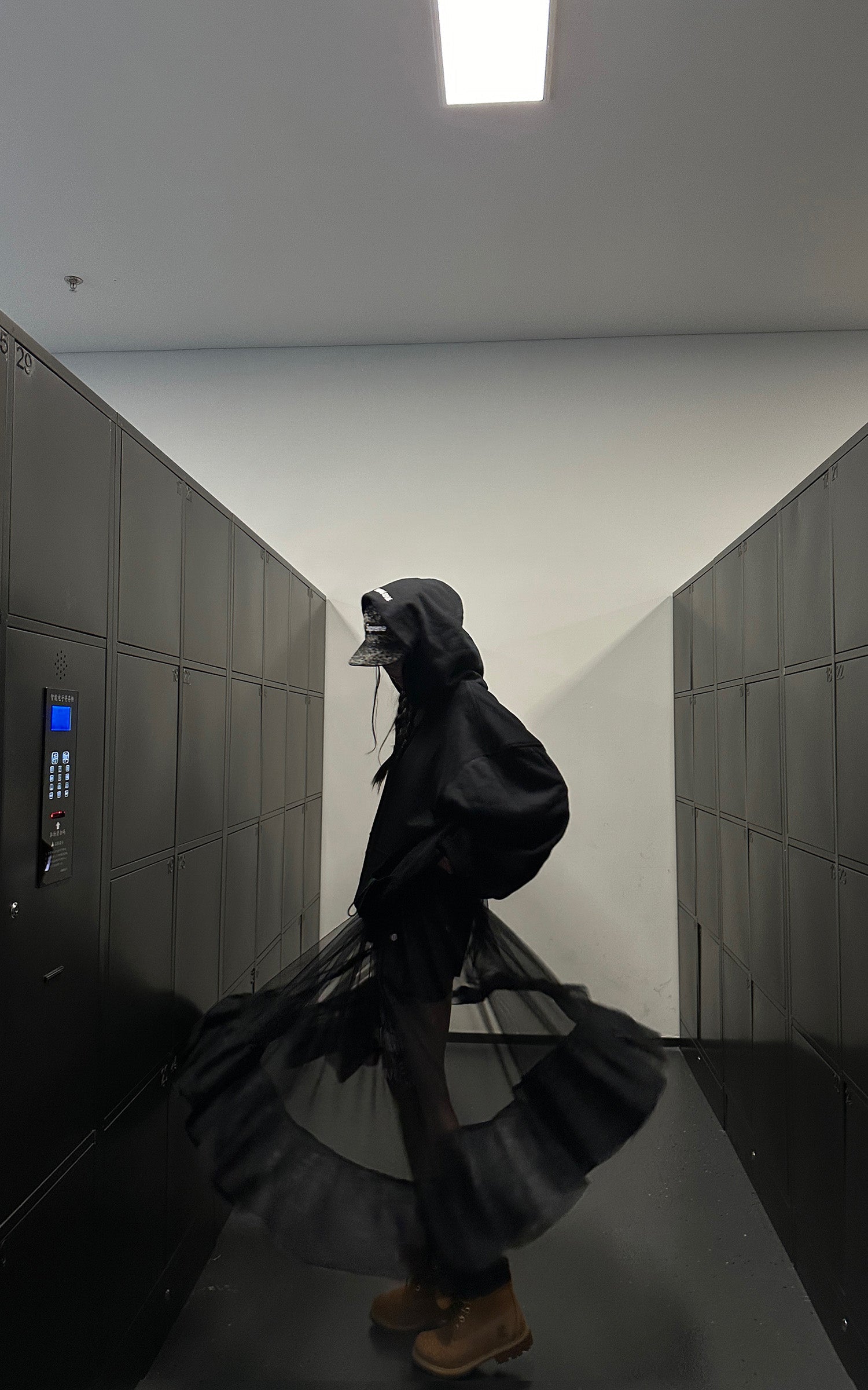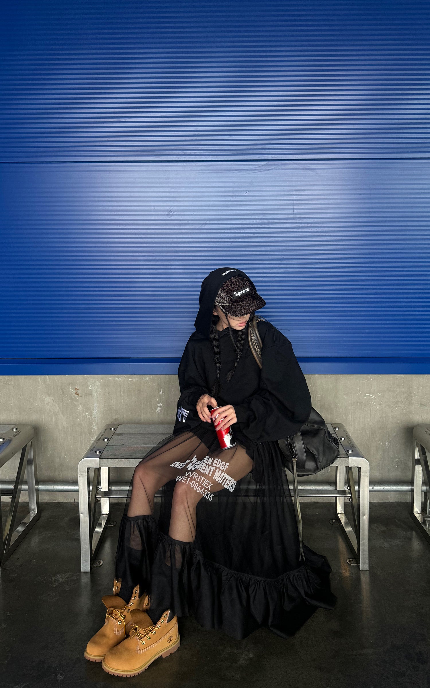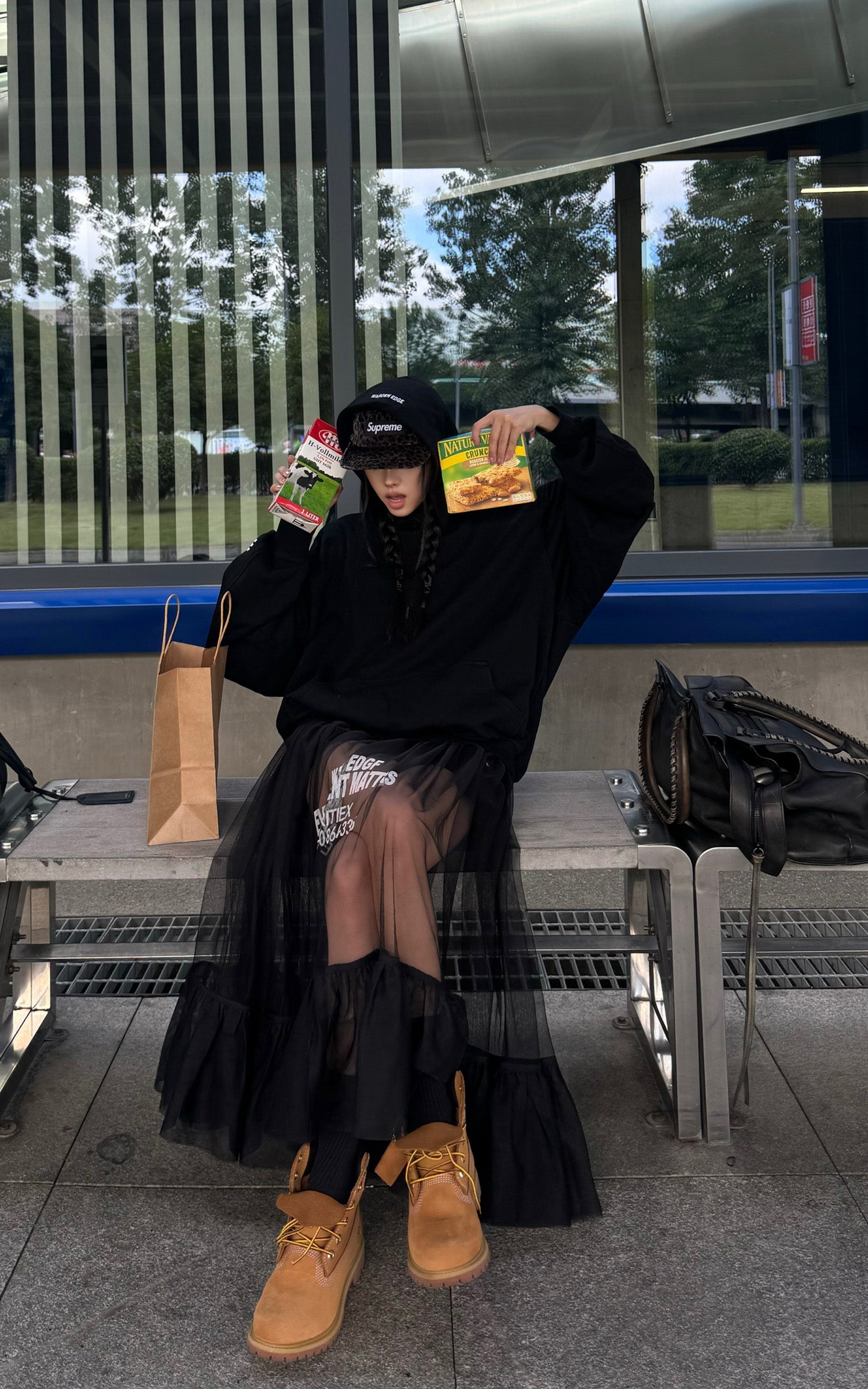 Combining sheer mesh with a cozy hoodie, this set blends street fashion with delicate textures. The contrast of the oversized hoodie and the flowing mesh skirt creates a striking look, perfect for both casual and elevated styles.