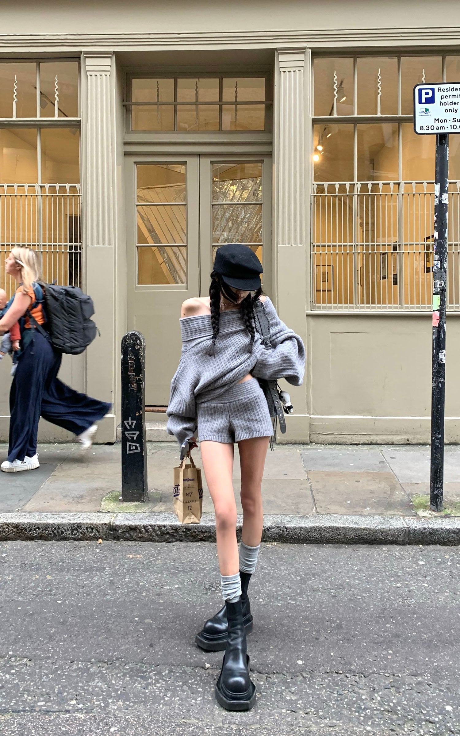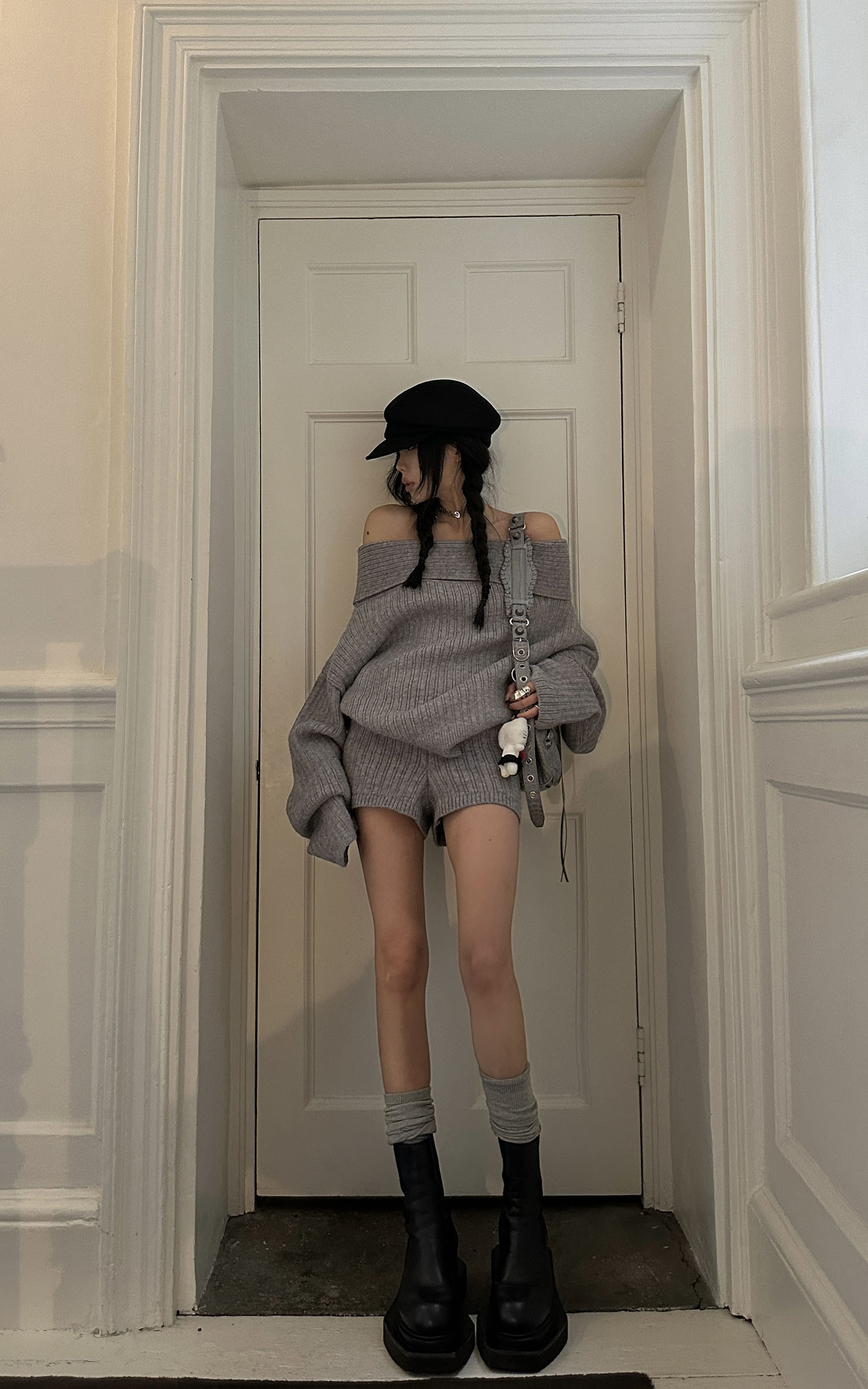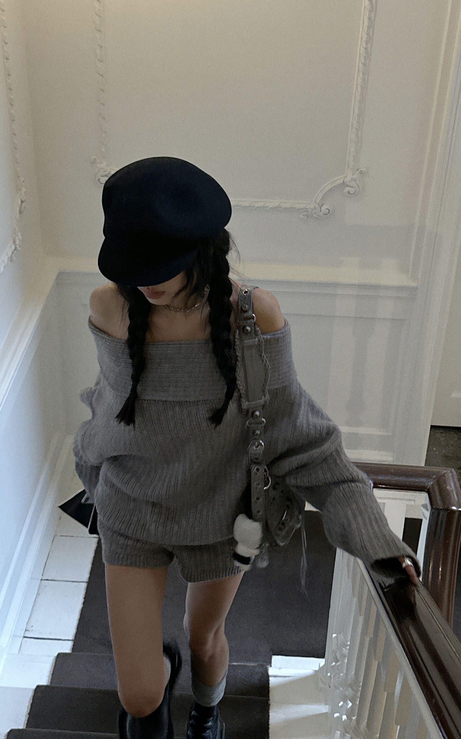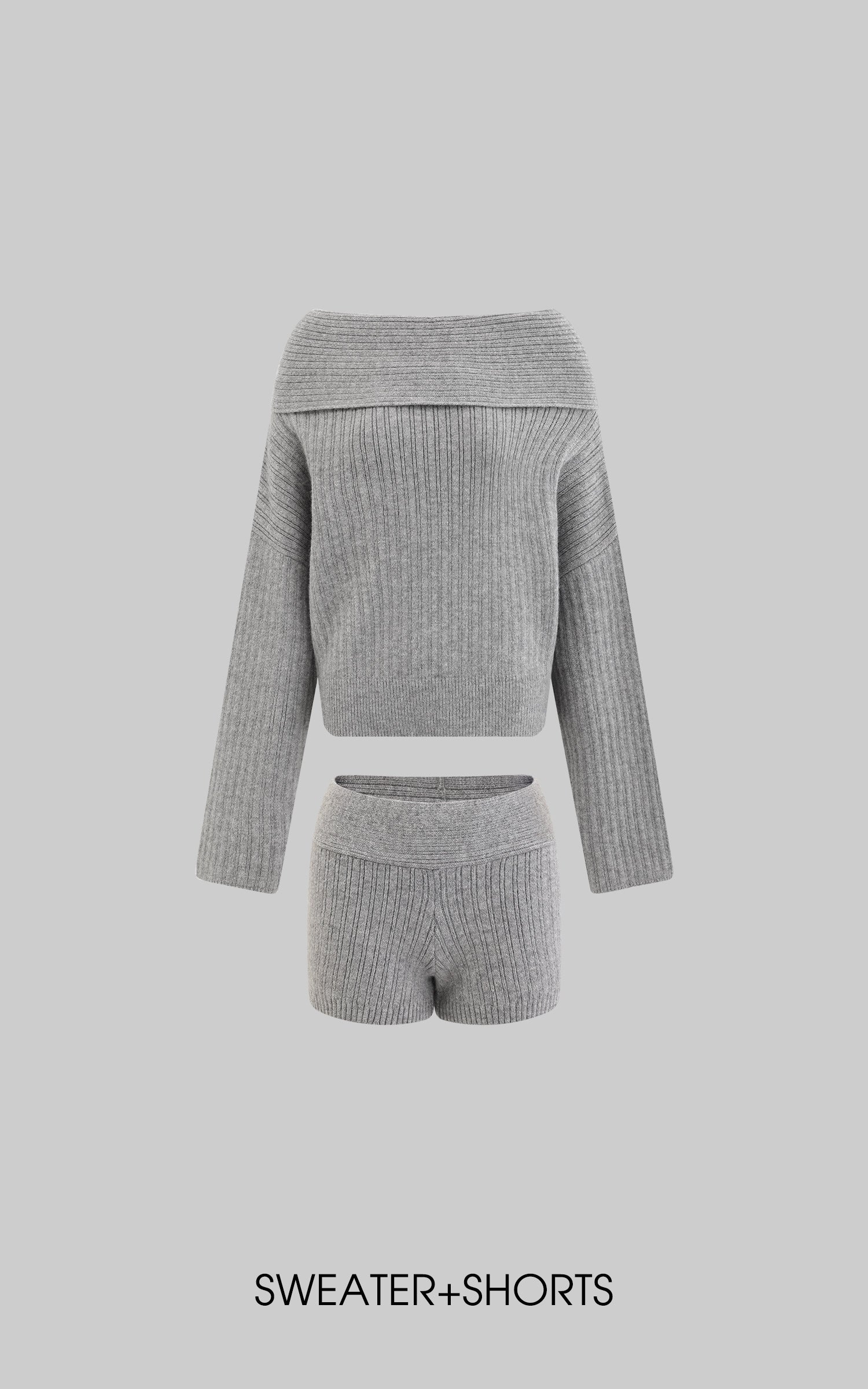 Effortlessly chic and cozy, this off-shoulder knit set redefines loungewear with its minimalist elegance. The oversized sweater drapes softly over the shoulders, creating a relaxed yet sophisticated silhouette. Paired with high-waisted ribbed shorts, the set offers a perfect blend of comfort and style. Designed for layering or lounging, this versatile piece transitions seamlessly from casual homewear to a street-ready statement.