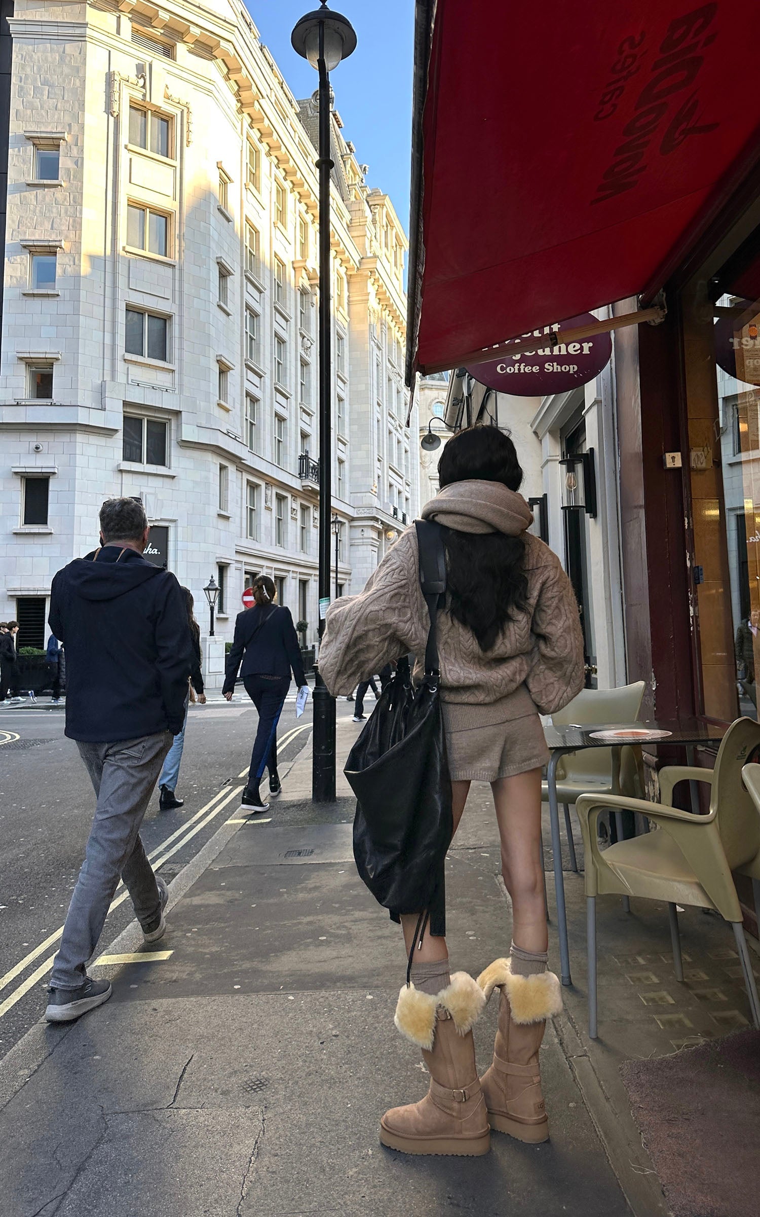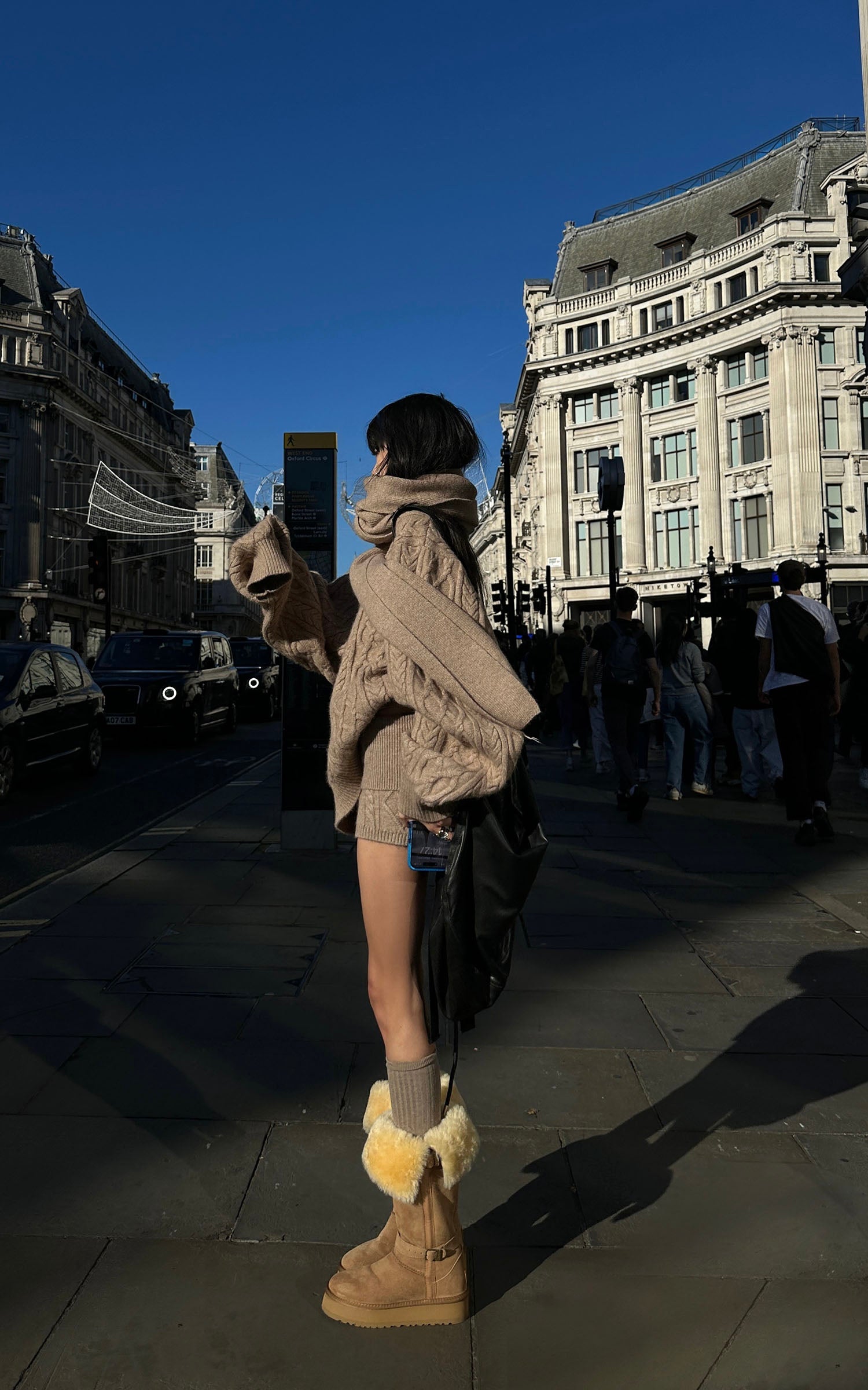 A perfect blend of texture and coziness, this cable-knit set features a voluminous sweater, high-waisted shorts, and an oversized scarf. The sweater boasts intricate cable patterns and dropped shoulders, creating a relaxed yet refined silhouette. Paired with snug shorts for a balanced look, the addition of the scarf elevates the ensemble, offering warmth and versatility. Whether styled for lounging or layered for a stroll through the city, this set redefines contemporary knitwear with a touch of understated elegance.