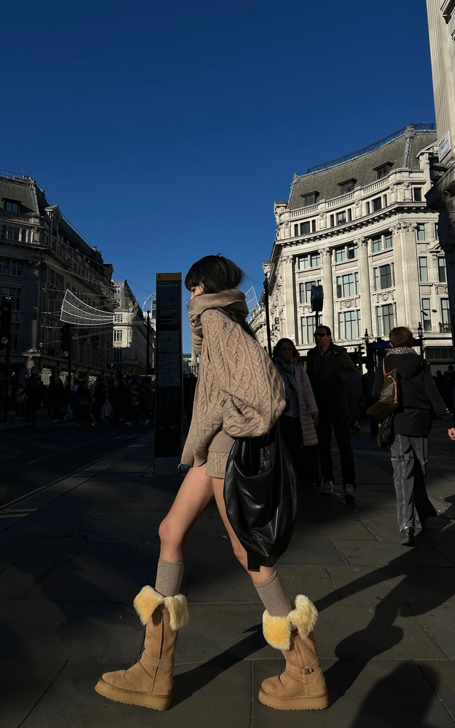 A perfect blend of texture and coziness, this cable-knit set features a voluminous sweater, high-waisted shorts, and an oversized scarf. The sweater boasts intricate cable patterns and dropped shoulders, creating a relaxed yet refined silhouette. Paired with snug shorts for a balanced look, the addition of the scarf elevates the ensemble, offering warmth and versatility. Whether styled for lounging or layered for a stroll through the city, this set redefines contemporary knitwear with a touch of understated elegance.