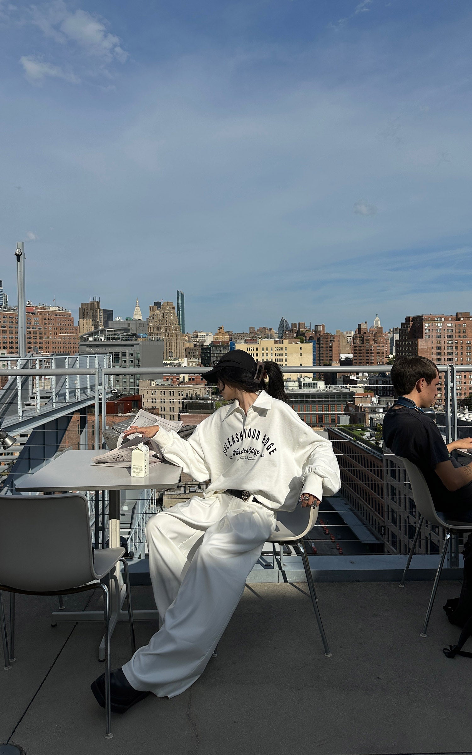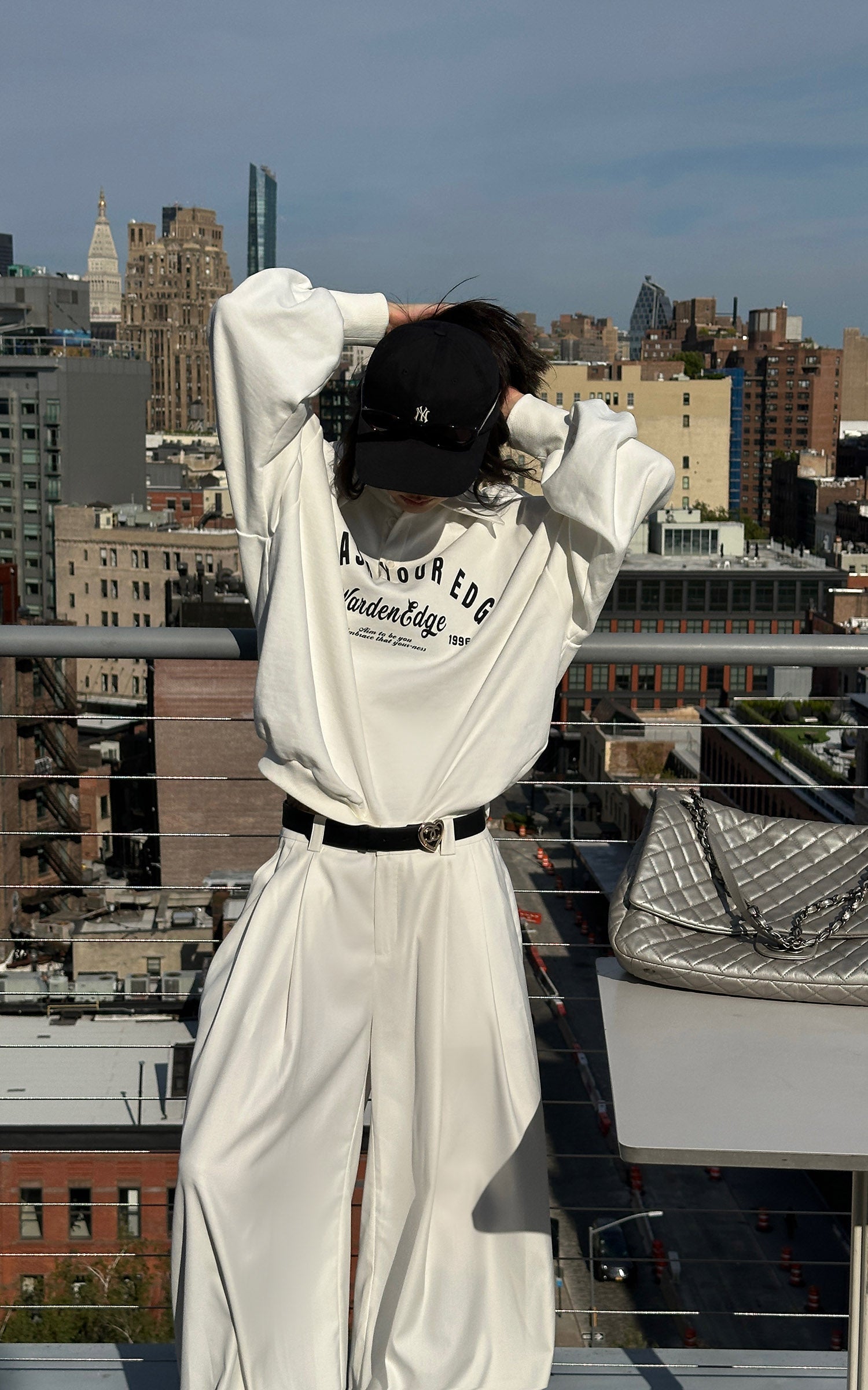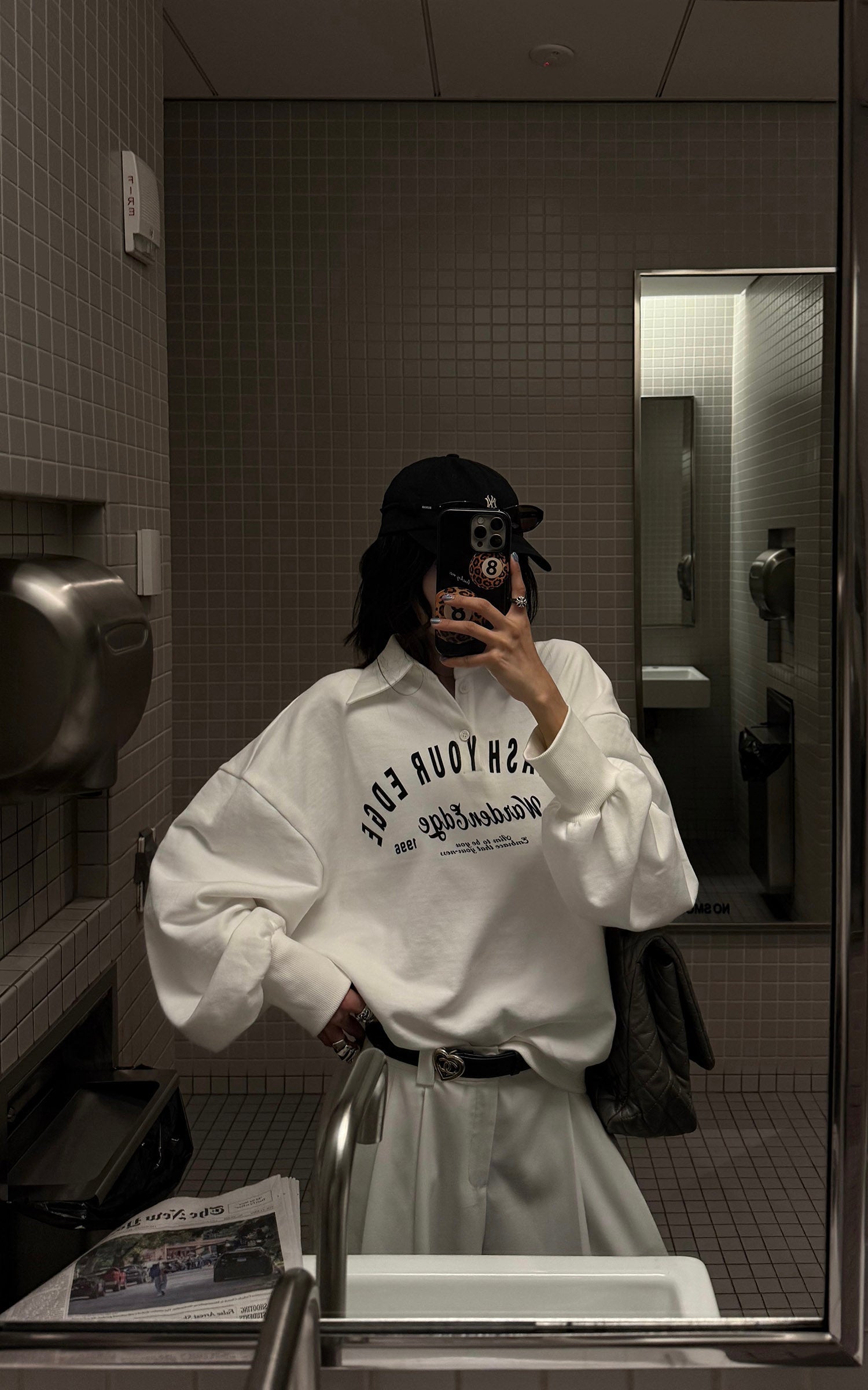 An oversized polo sweatshirt cut with dropped shoulders and a structured collar. The bold front graphic is framed in arched lettering, bringing a raw collegiate energy fused with streetwear minimalism. Crafted in heavyweight cotton for structure and comfort, it balances sharp lines with an effortless drape. A versatile piece that moves between casual layers and statement styling, redefining classic sportswear with a modern edge.