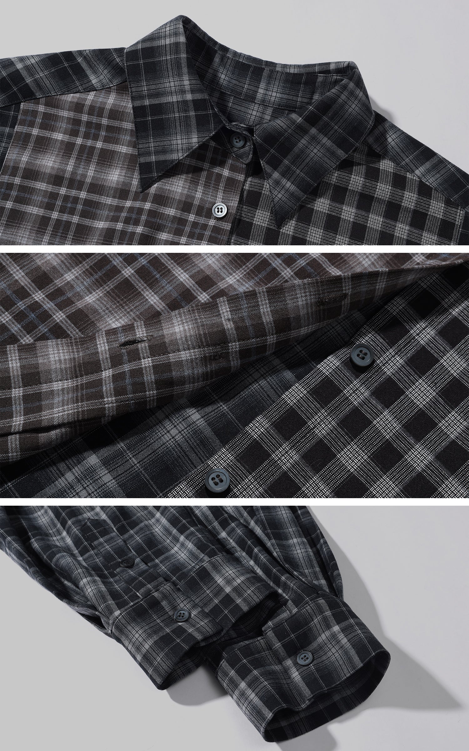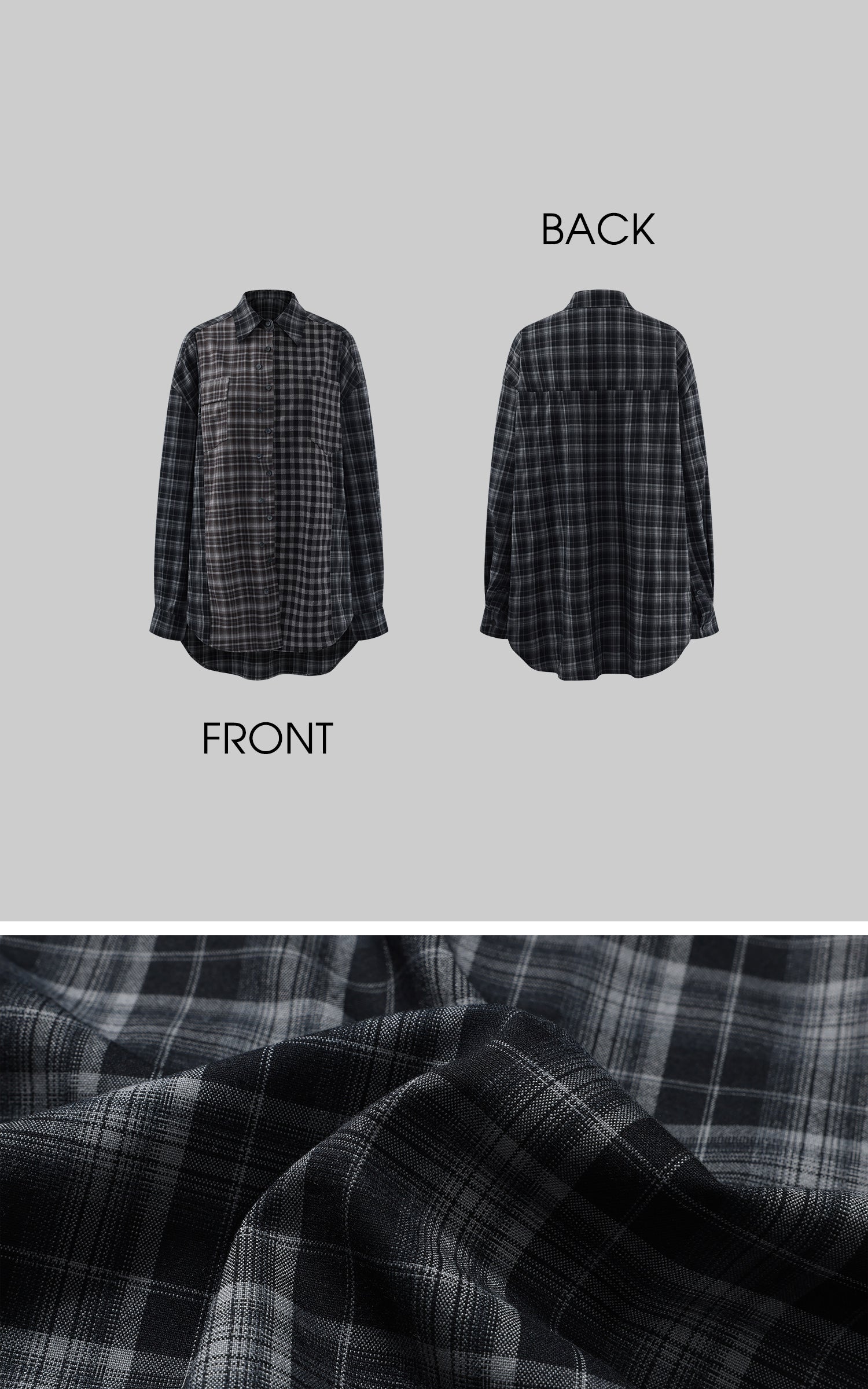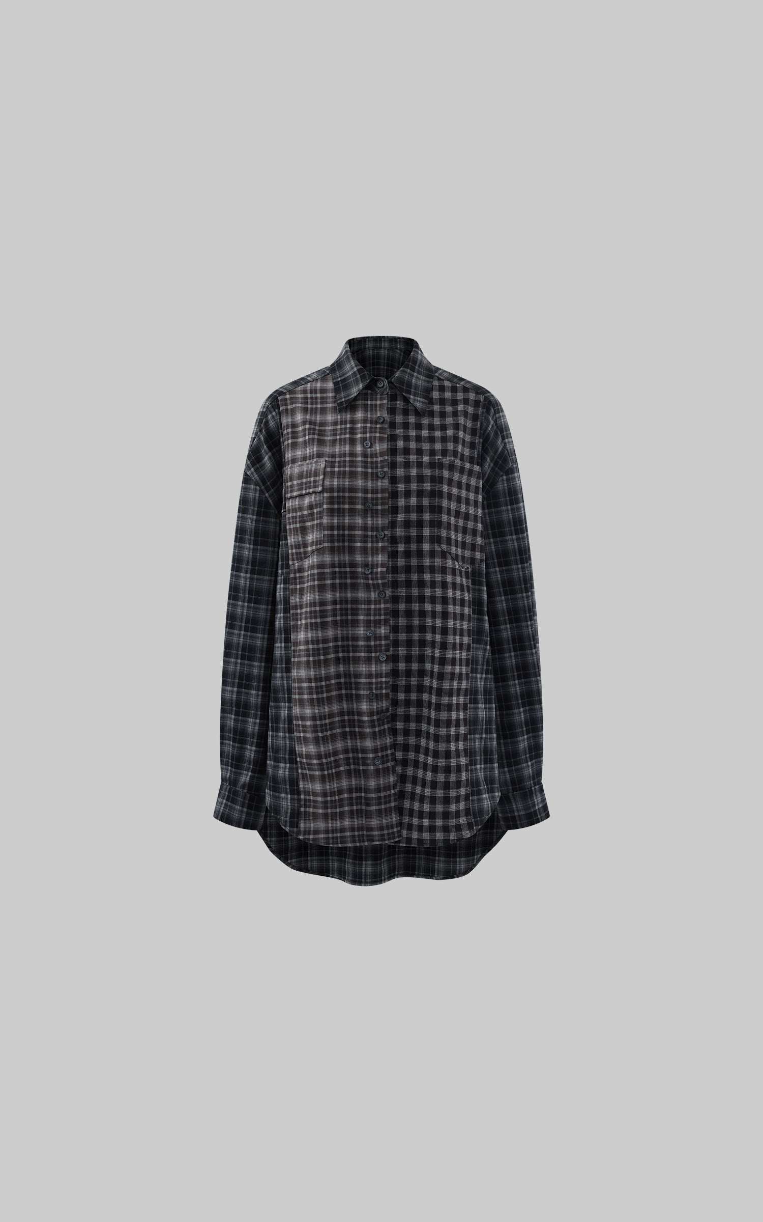 Defined by contrasting plaid panels, this shirt reworks a familiar pattern through deliberate patchwork and imbalance. The relaxed silhouette softens traditional shirting, with dropped shoulders and a fluid drape that feels effortless rather than undone. Subtle variations in length add depth and coverage, allowing the piece to function as a standalone top or an open layering layer. Lightweight fabric moves naturally with the body, creating soft folds and motion. Designed for versatile styling, it pairs easily with denim, shorts, or oversized bottoms, expressing a quiet, unforced street attitude.