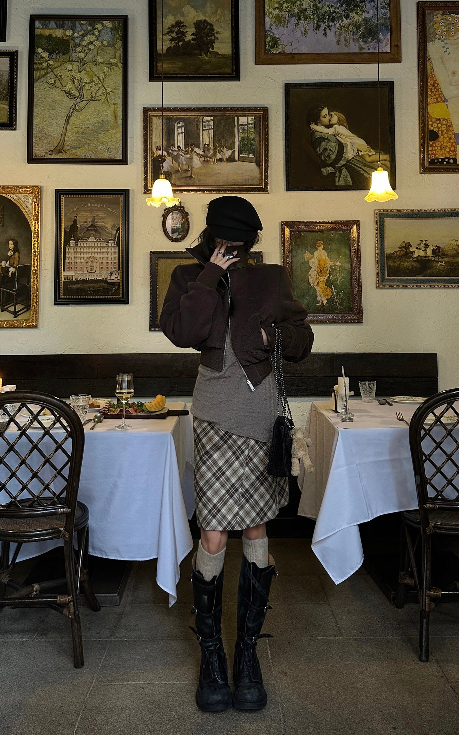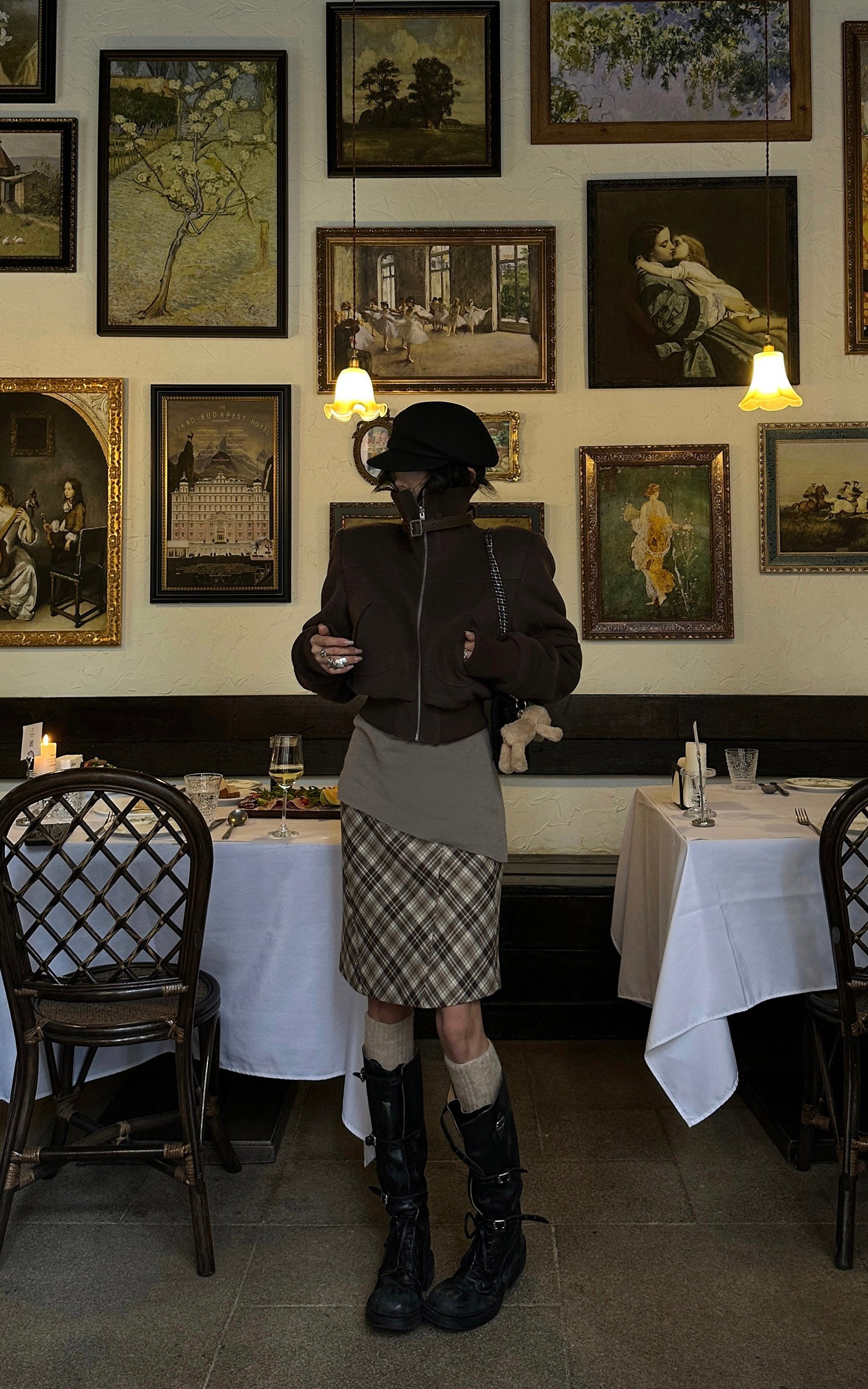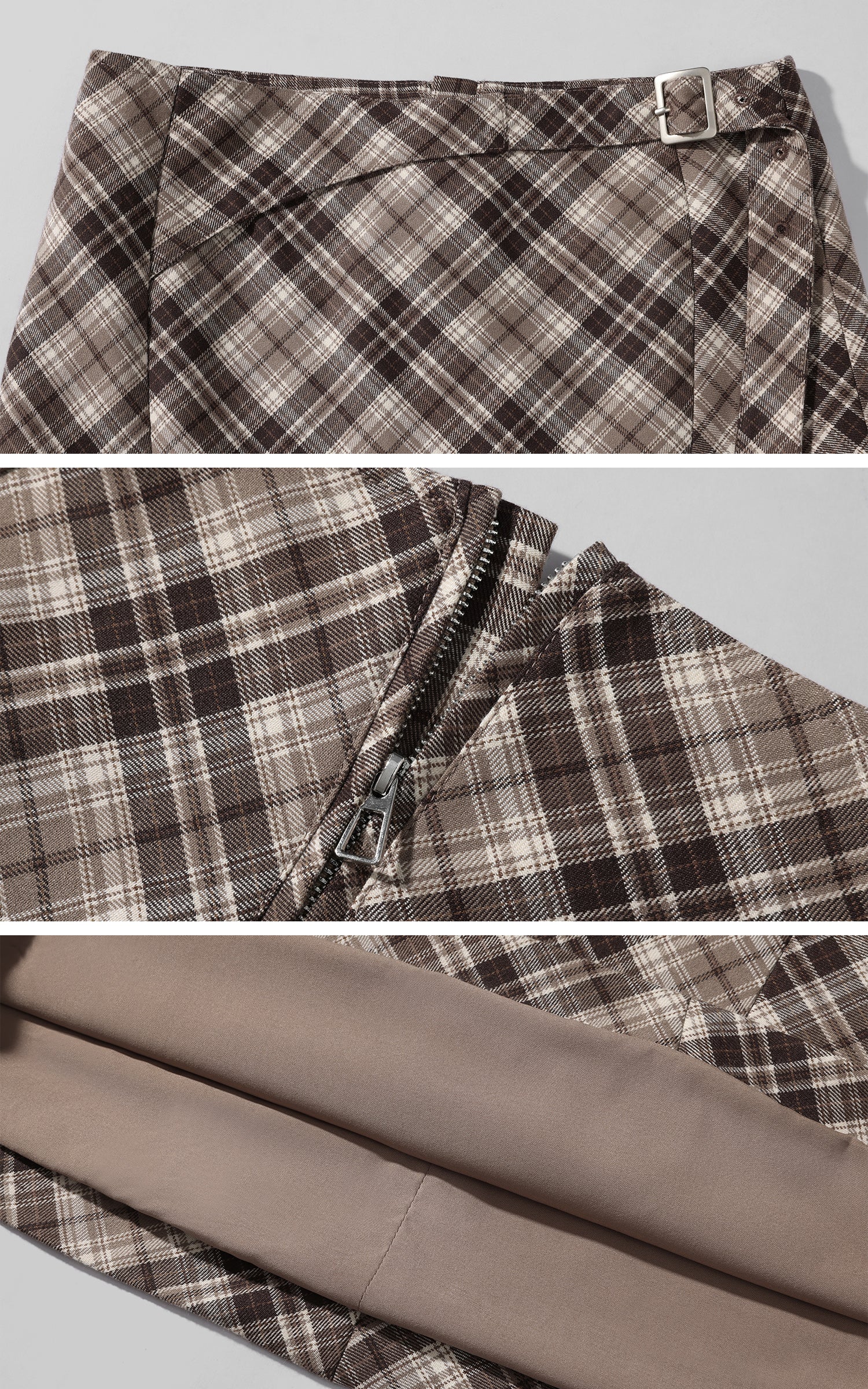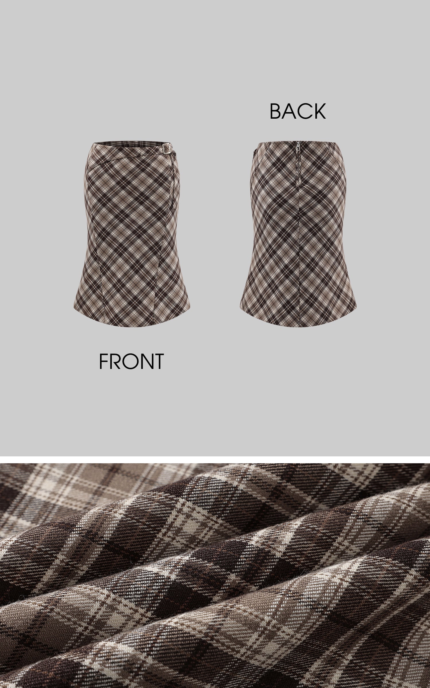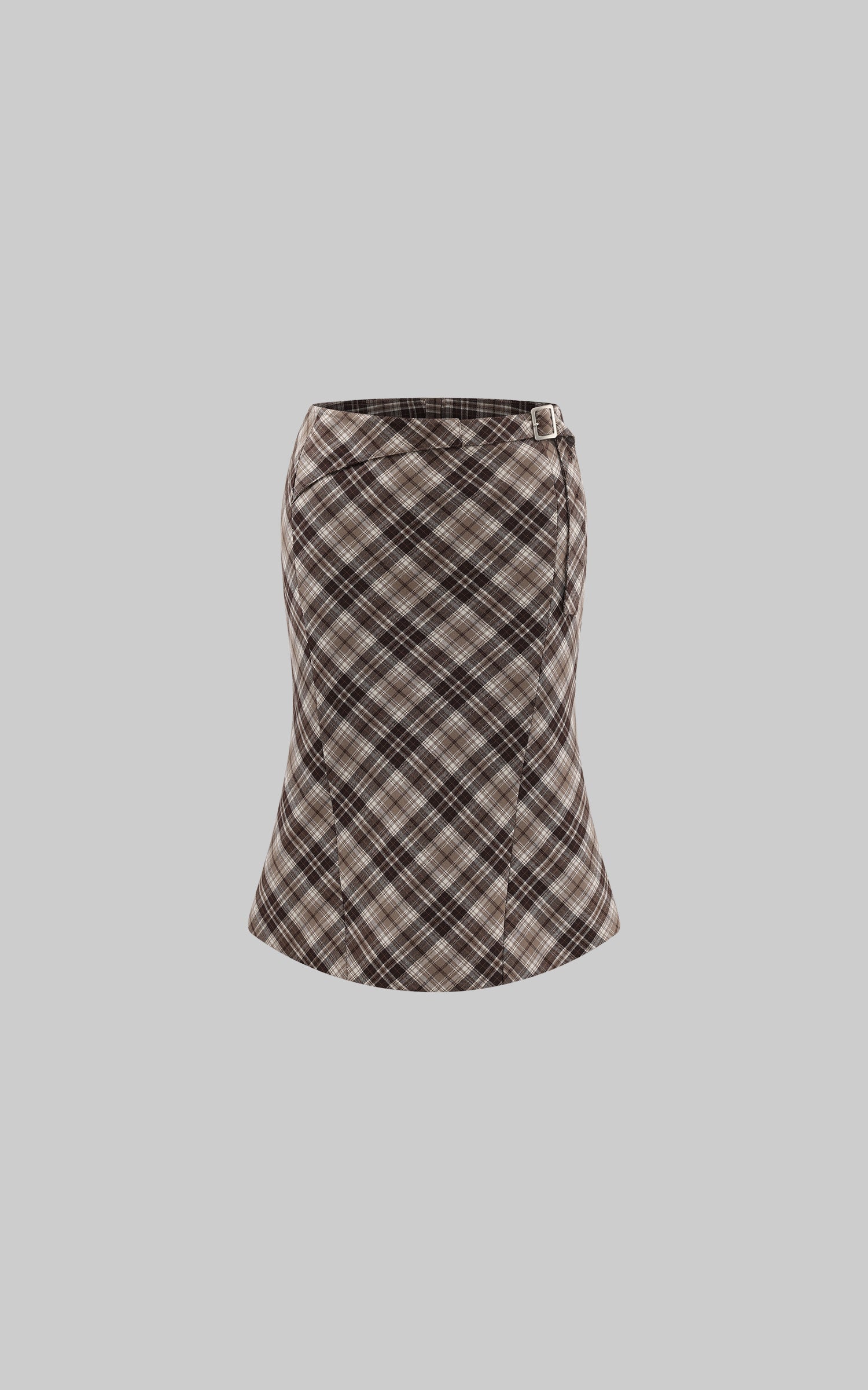 A structured plaid midi skirt cut in a contouring silhouette that frames the body with clean, architectural lines. The angled panel construction creates a subtle flare at the hem, while the metal side-buckle adds a utilitarian edge. Soft inner lining ensures comfort, and the textured plaid fabric delivers a refined yet subversive attitude—designed for layered fall looks and everyday styling with a modern, understated edge.