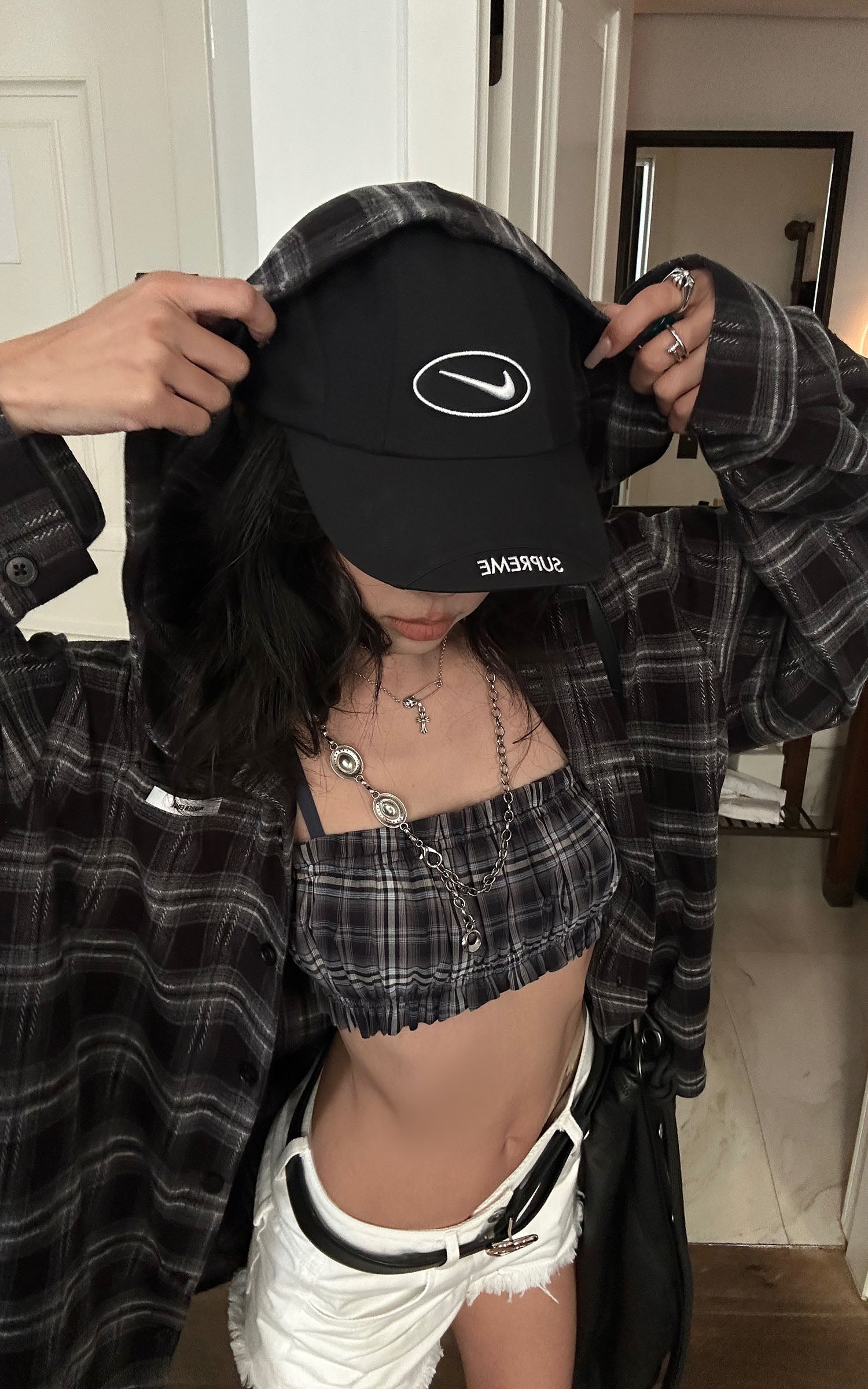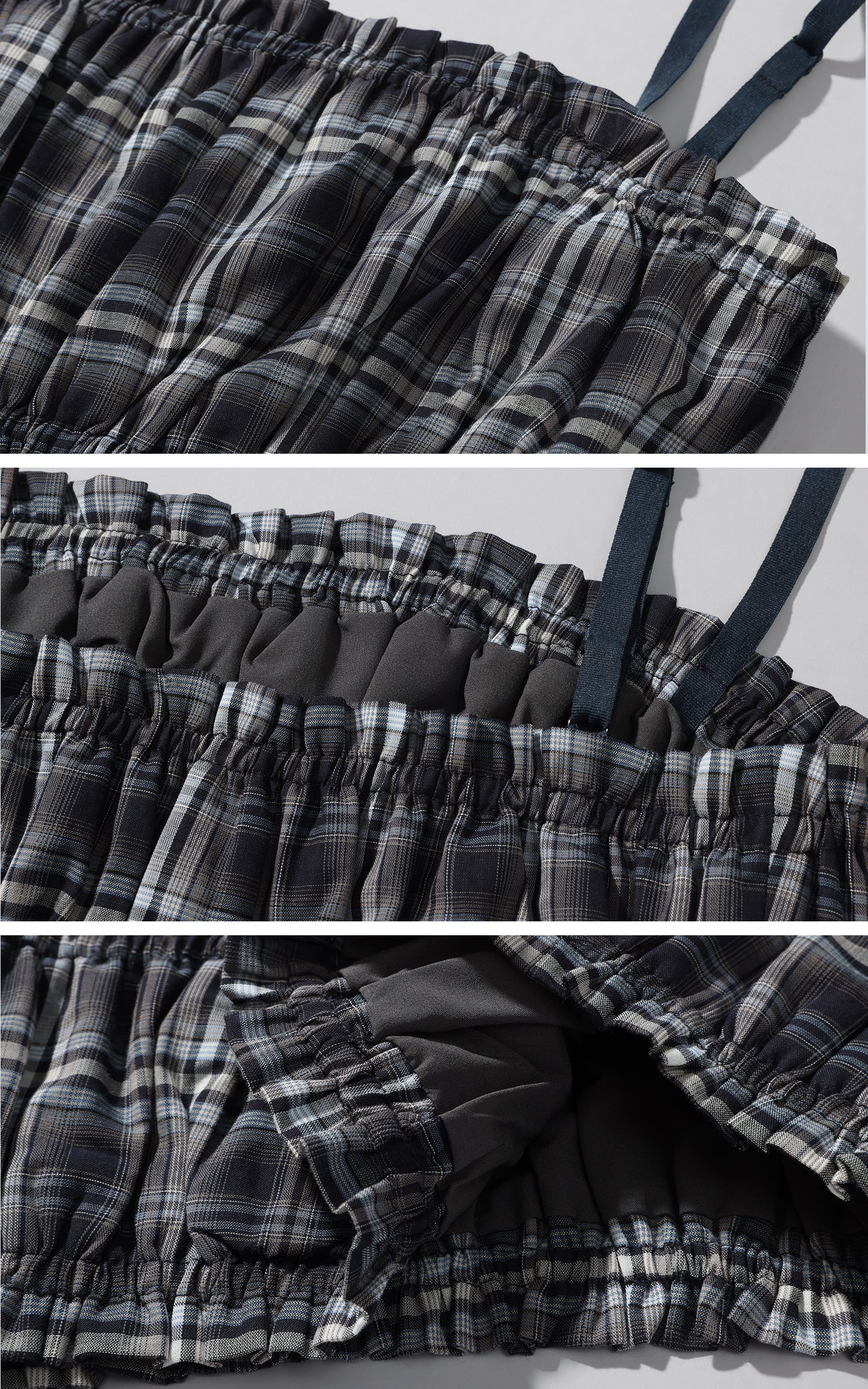 A cropped silhouette cut from textured plaid cotton, designed with ruched elastic gathering that molds to the body. The lightweight straps add minimal edge, while the raw plaid finish carries an effortless, street-driven energy. Layer it with oversized shirting or pair with distressed denim shorts for a bold, urban attitude.