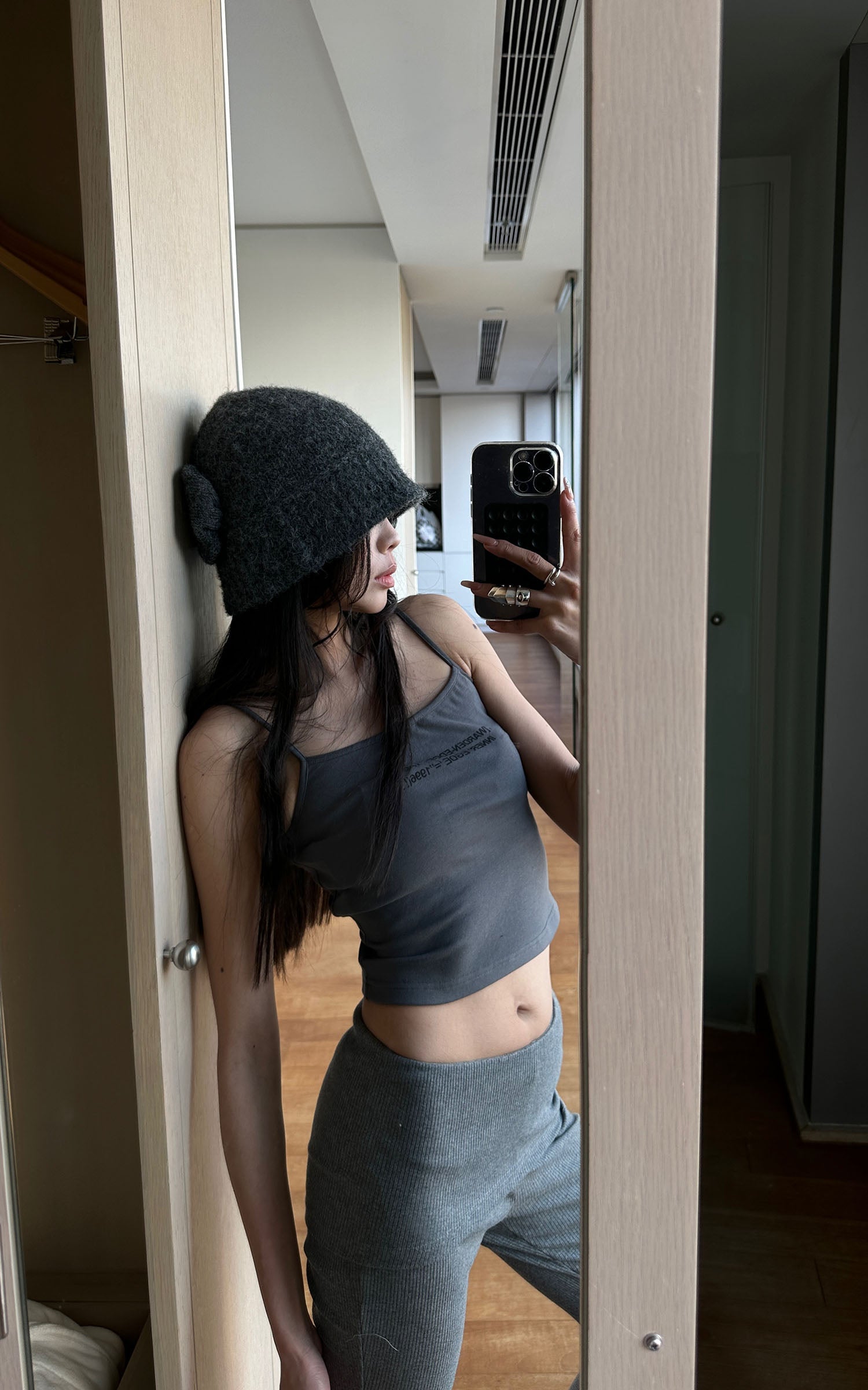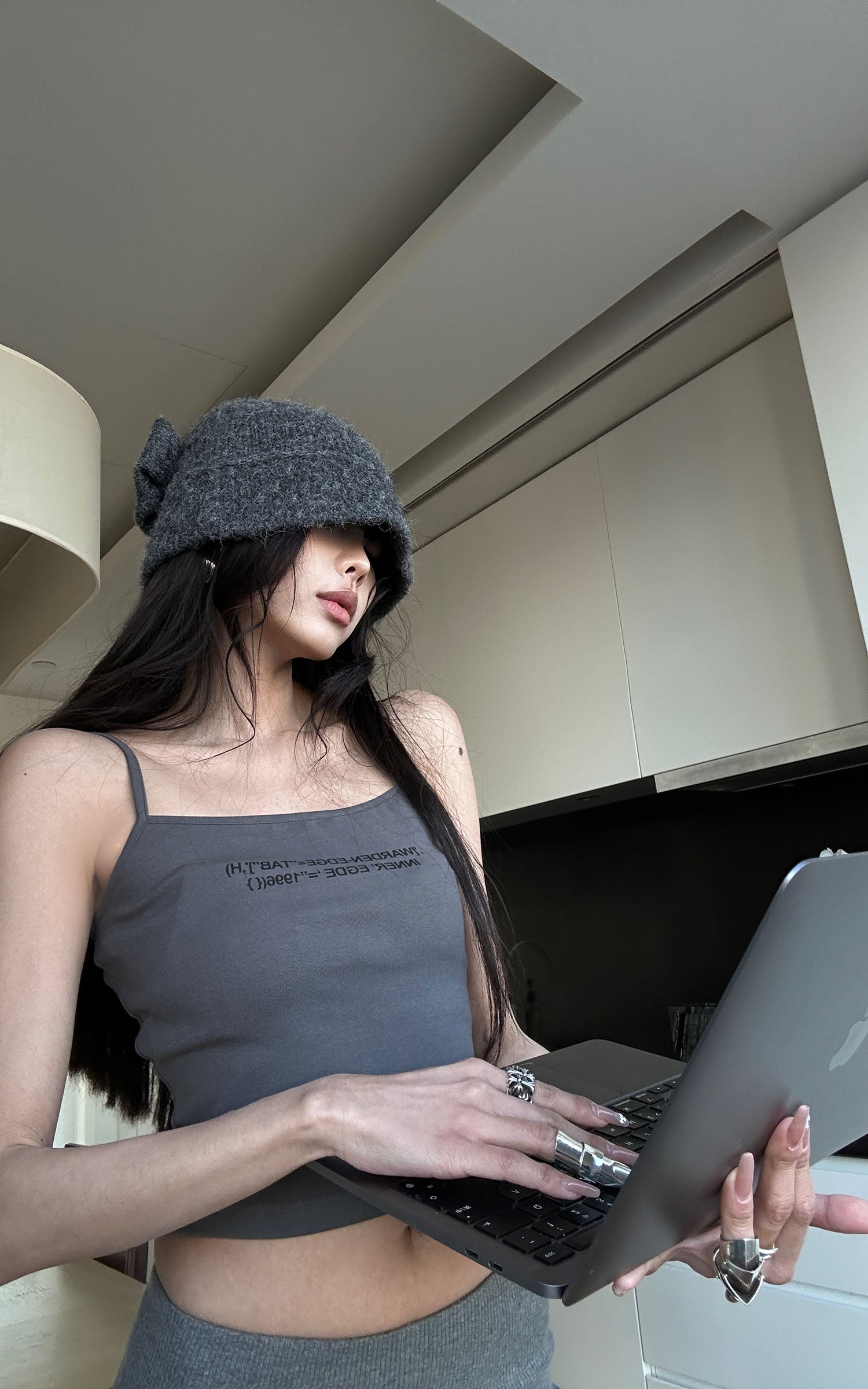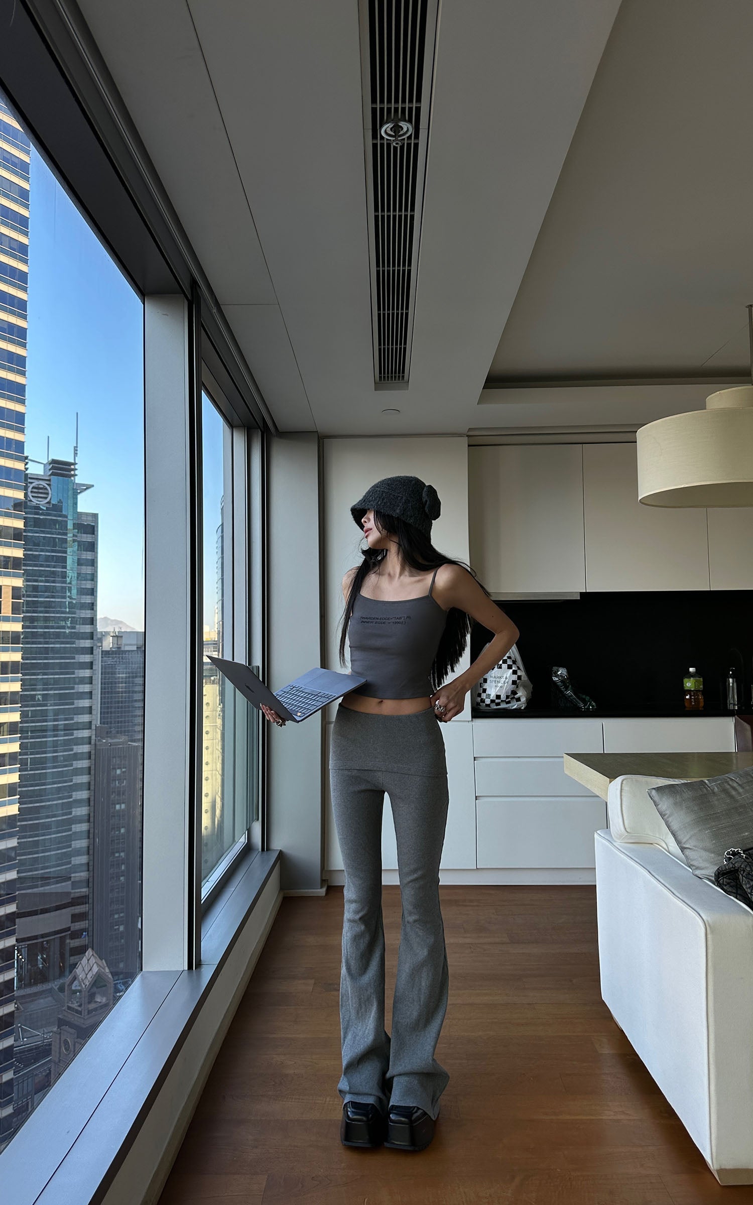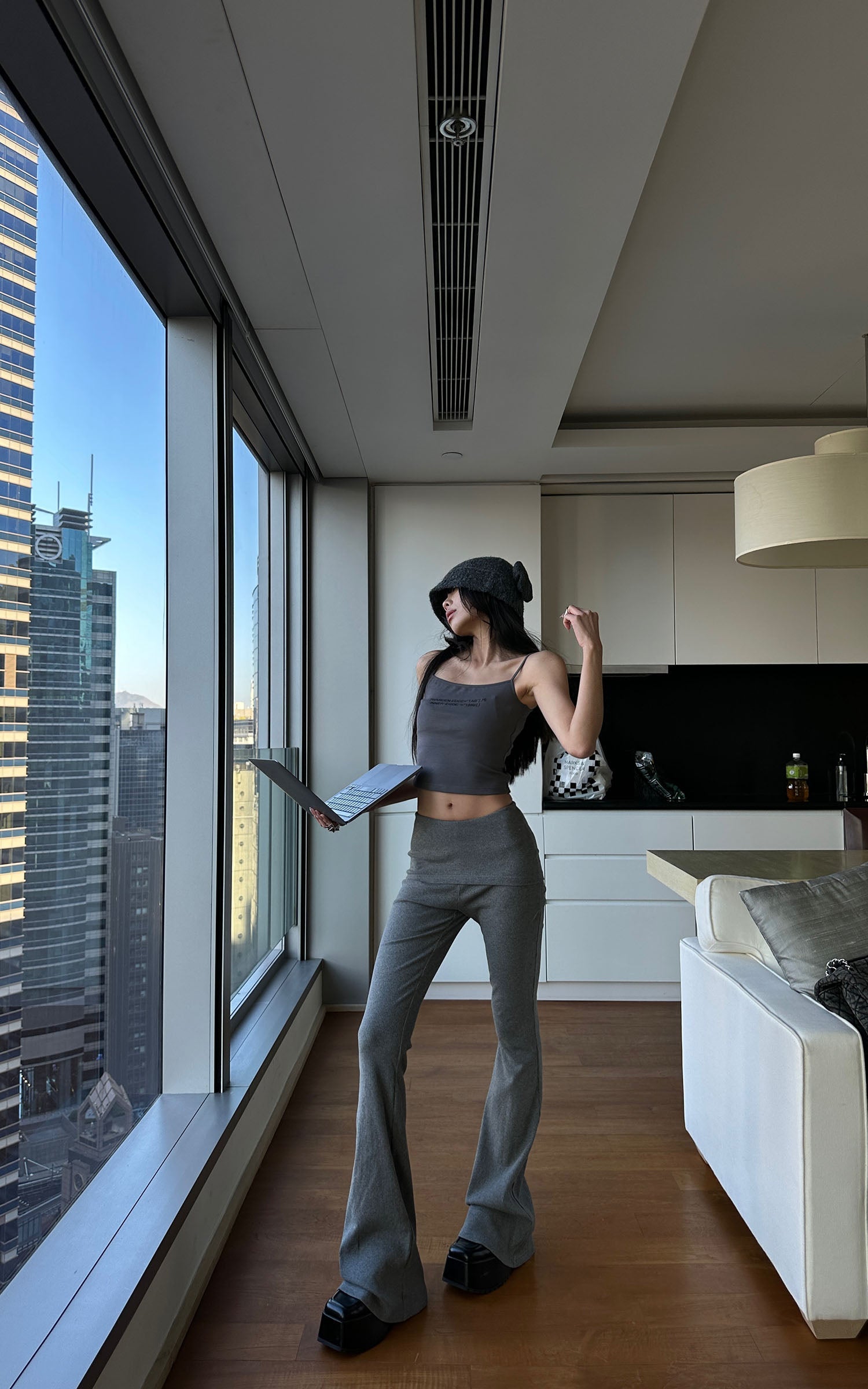 Effortless structure meets relaxed tailoring in this ribbed knit set. Designed for a sleek yet easygoing silhouette, the stretch-knit fabric offers a second-skin fit that moves with you. The low-waist flared pants enhance the legs with a streamlined drape, while the cropped camisole balances a relaxed shape with a subtle cinch. Featuring a deconstructed text print, this set blends streetwear aesthetics with understated confidence.