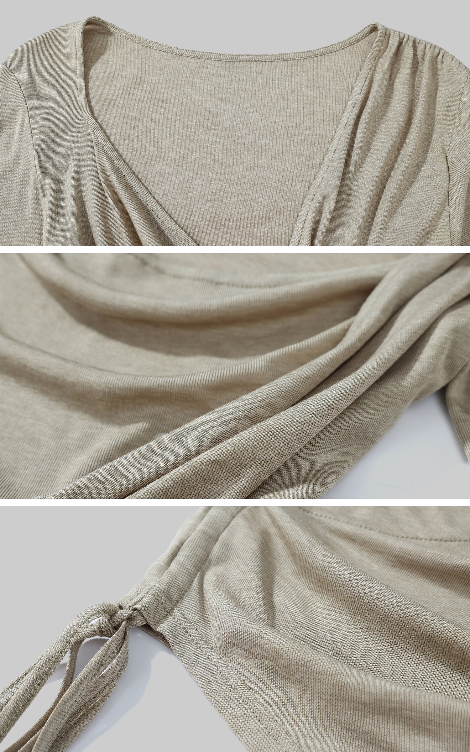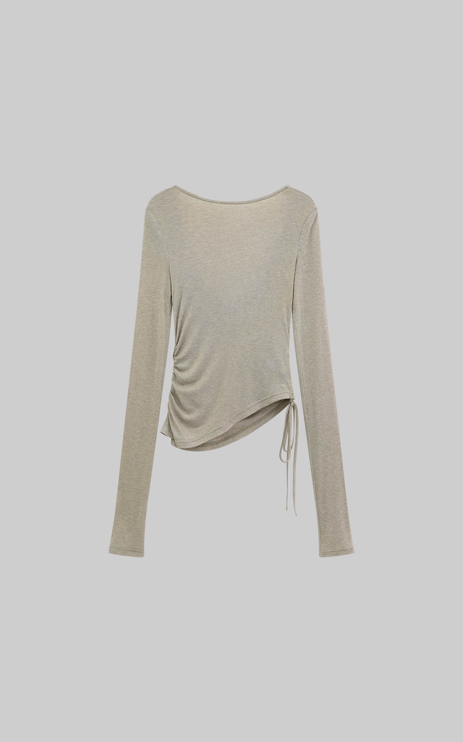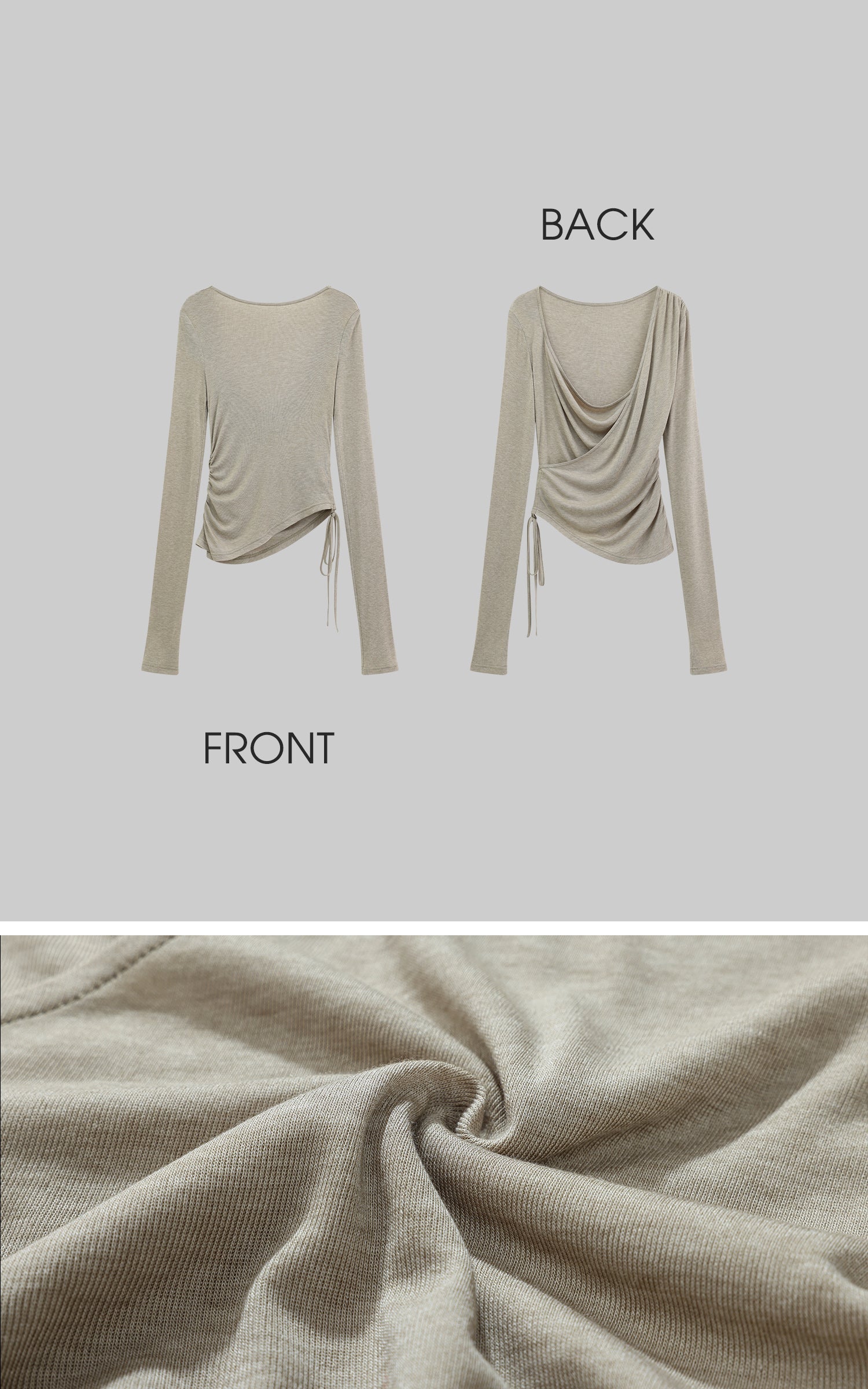 Crafted from a soft, breathable fabric, this ruched long sleeve tee is the perfect blend of comfort and style. Designed with a flattering scoop neckline and ruched detailing at the front and back, this piece creates a dynamic, form-fitting silhouette. The back features a draped open design, adding a touch of effortless edge. Adjustable drawstrings at the side allow for a customized fit and versatile styling options. Perfect for layering or wearing alone, this tee embodies understated streetwear elegance.