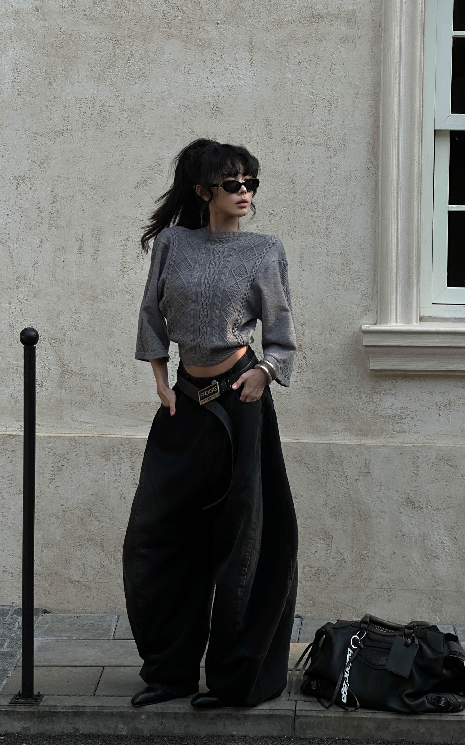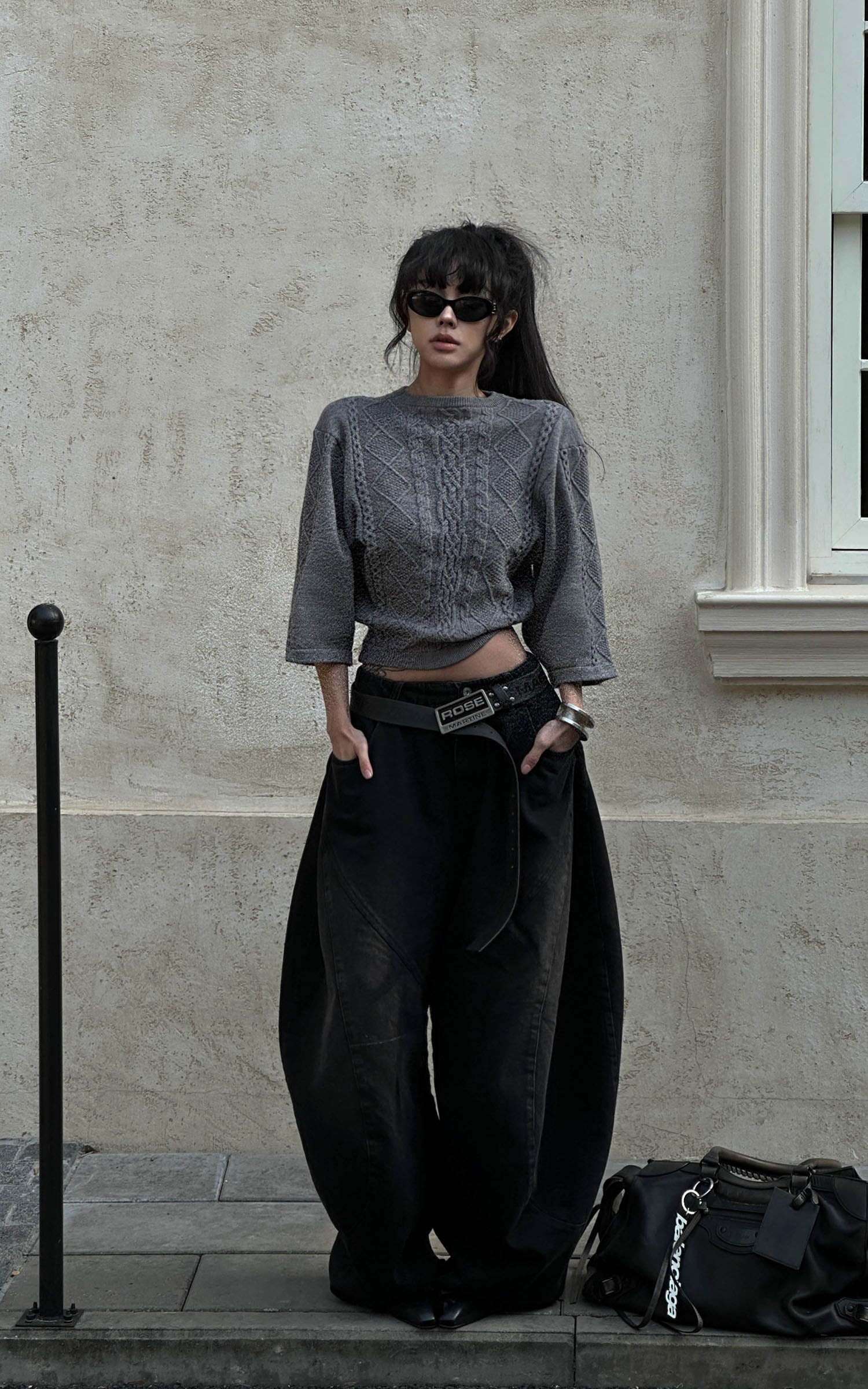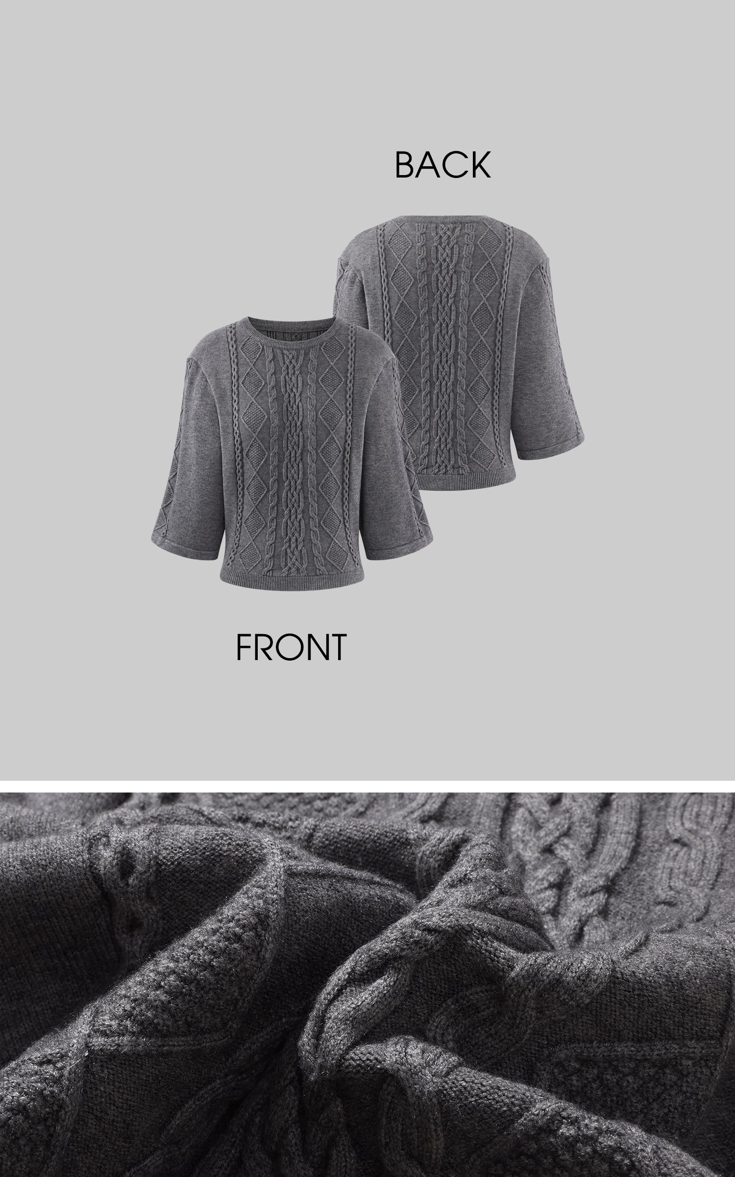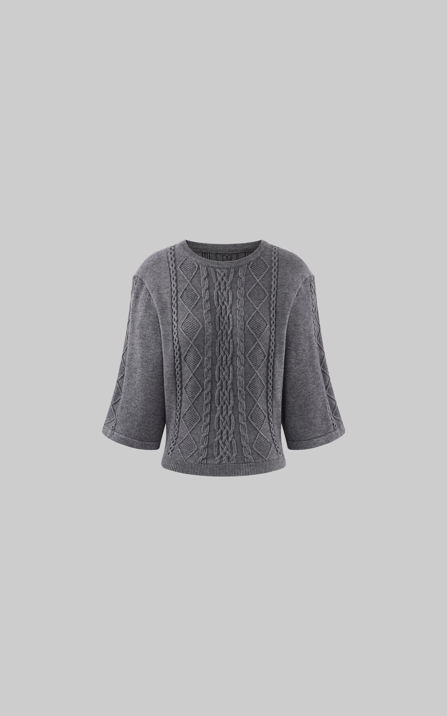 A reworked knit defined by sculptural cable textures and restrained proportions. Raised braid and diamond patterns build a structured surface, contrasted by cropped length and wide sleeves for a sharp, modern silhouette. Soft yet substantial, the fabric holds its shape without feeling rigid. Designed to balance precision and ease, it layers effortlessly with tailored or oversized bottoms, delivering a quiet, directional presence rooted in contemporary minimalism.