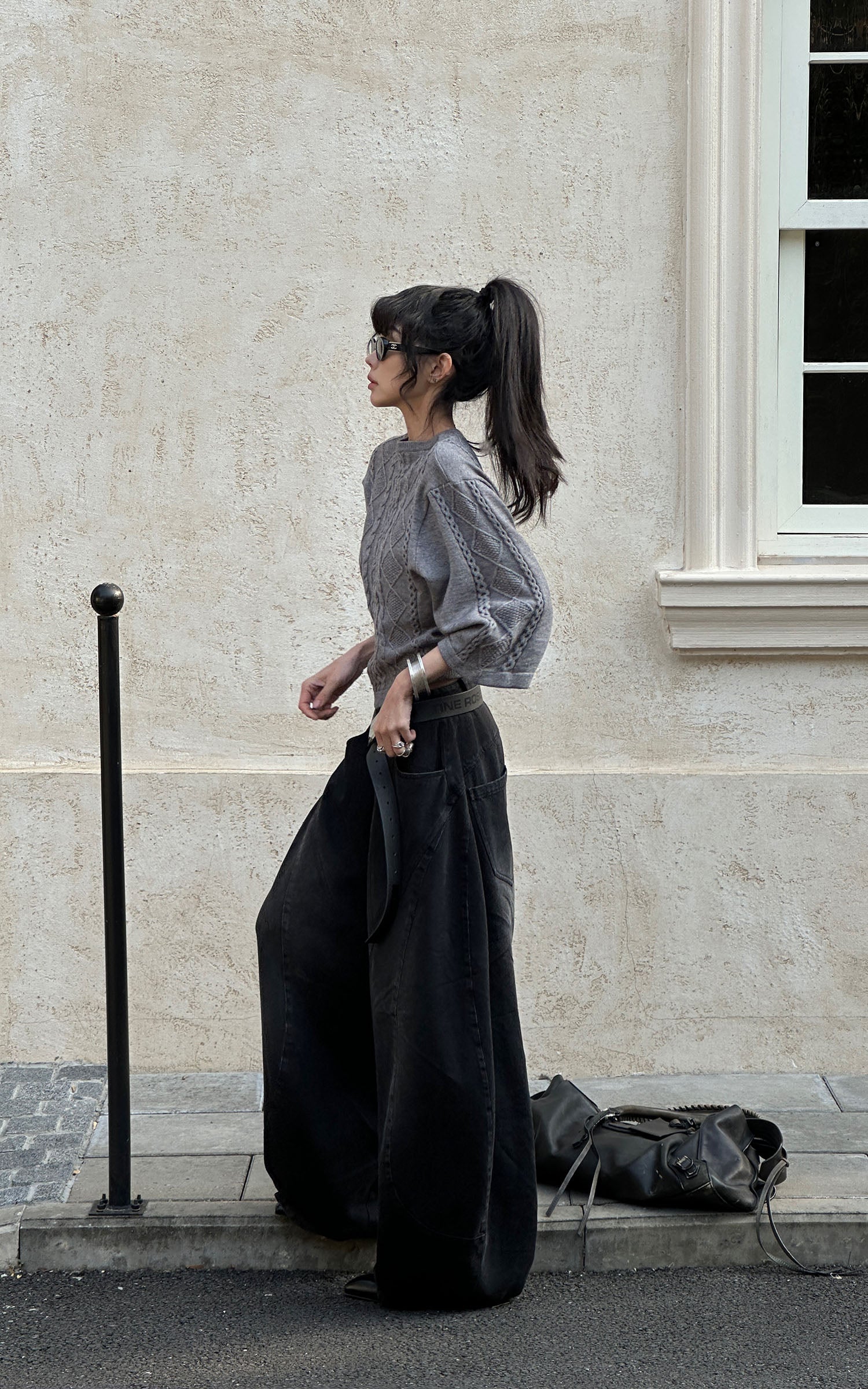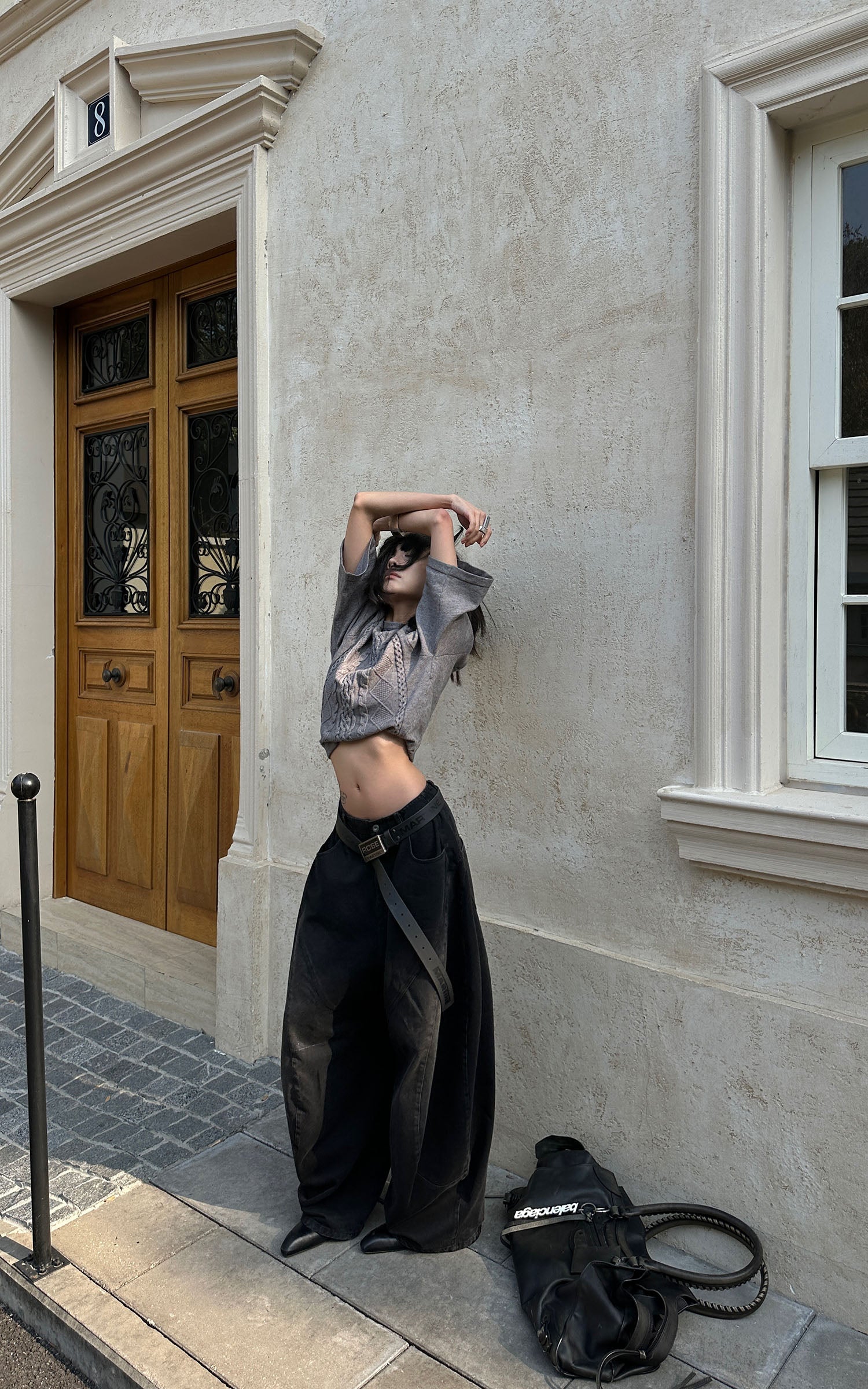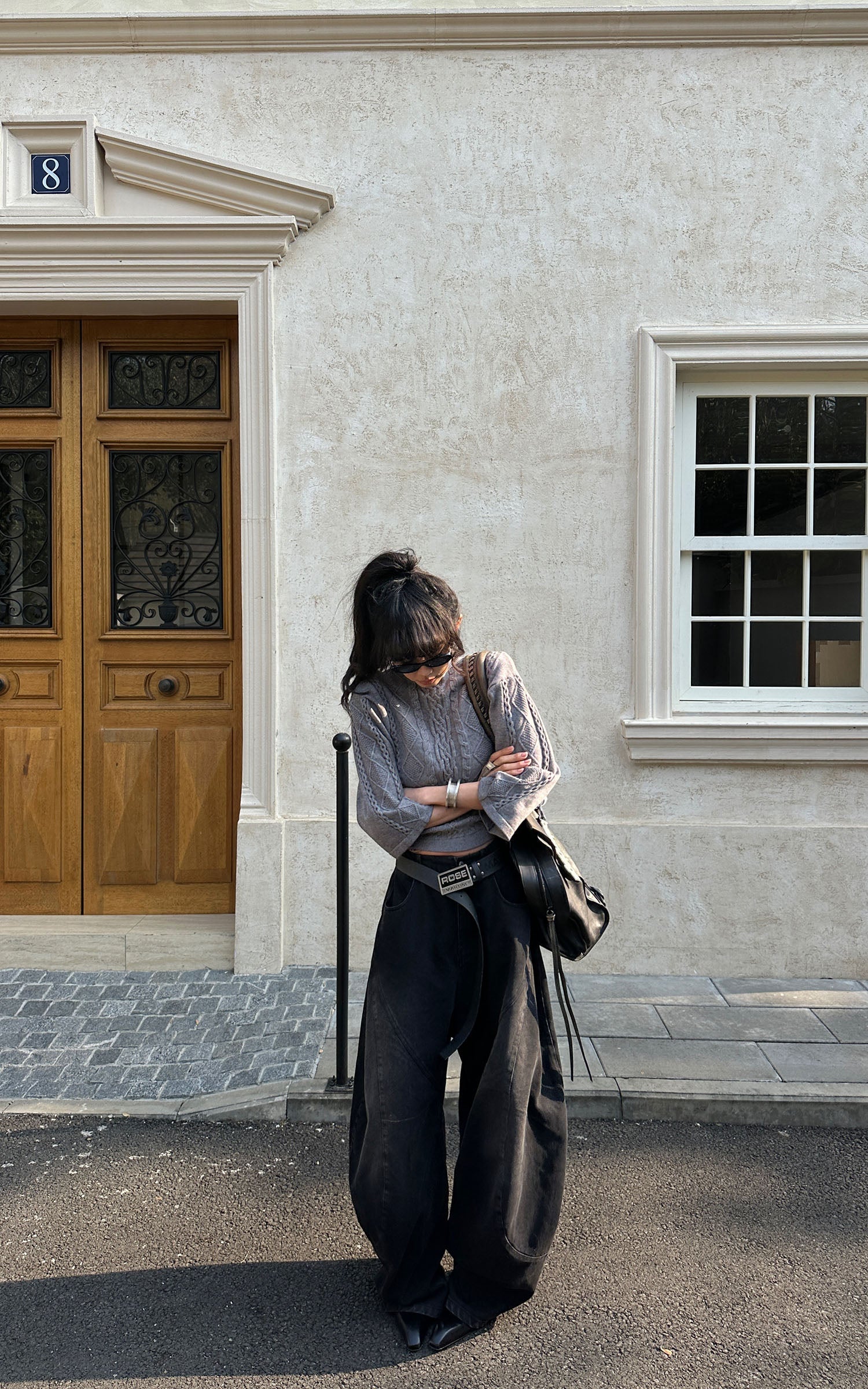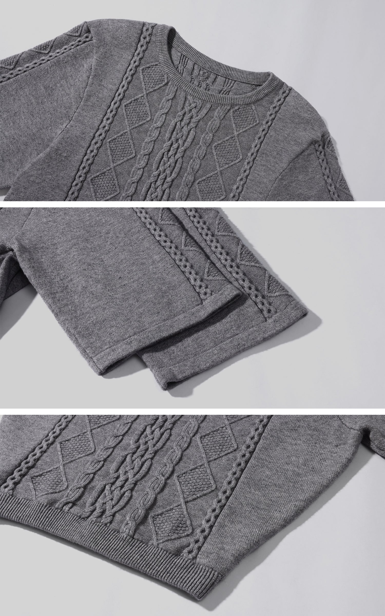 A reworked knit defined by sculptural cable textures and restrained proportions. Raised braid and diamond patterns build a structured surface, contrasted by cropped length and wide sleeves for a sharp, modern silhouette. Soft yet substantial, the fabric holds its shape without feeling rigid. Designed to balance precision and ease, it layers effortlessly with tailored or oversized bottoms, delivering a quiet, directional presence rooted in contemporary minimalism.