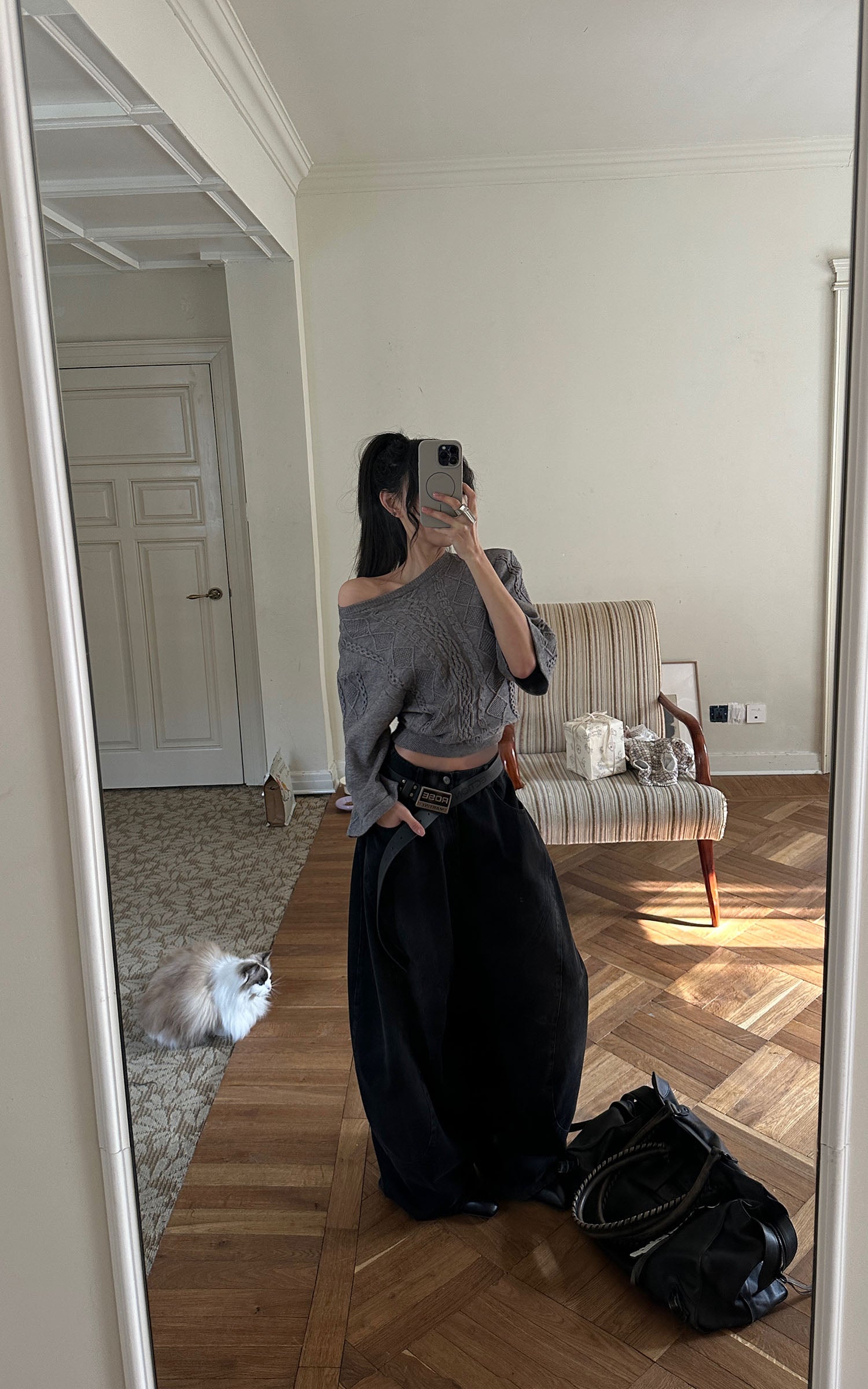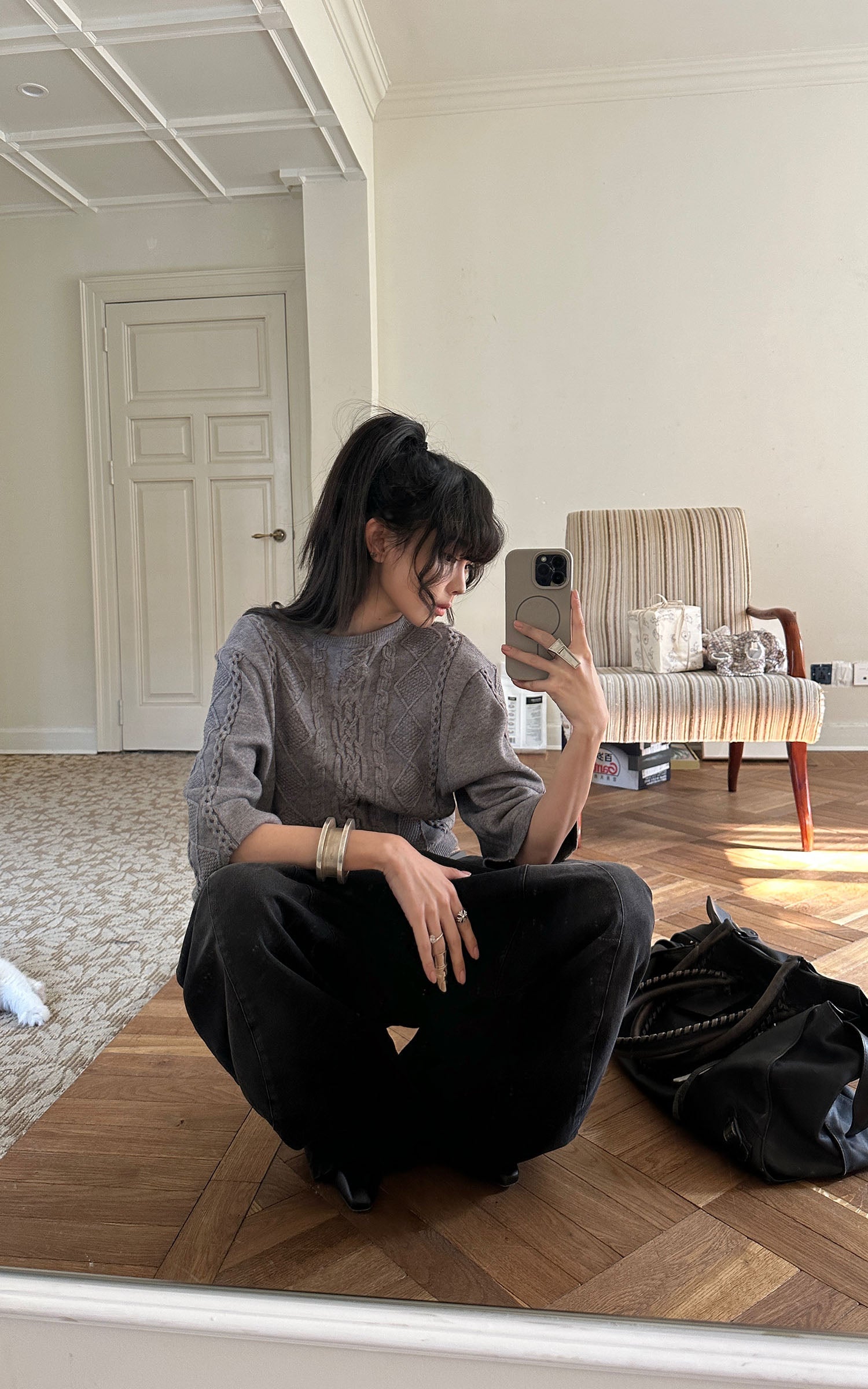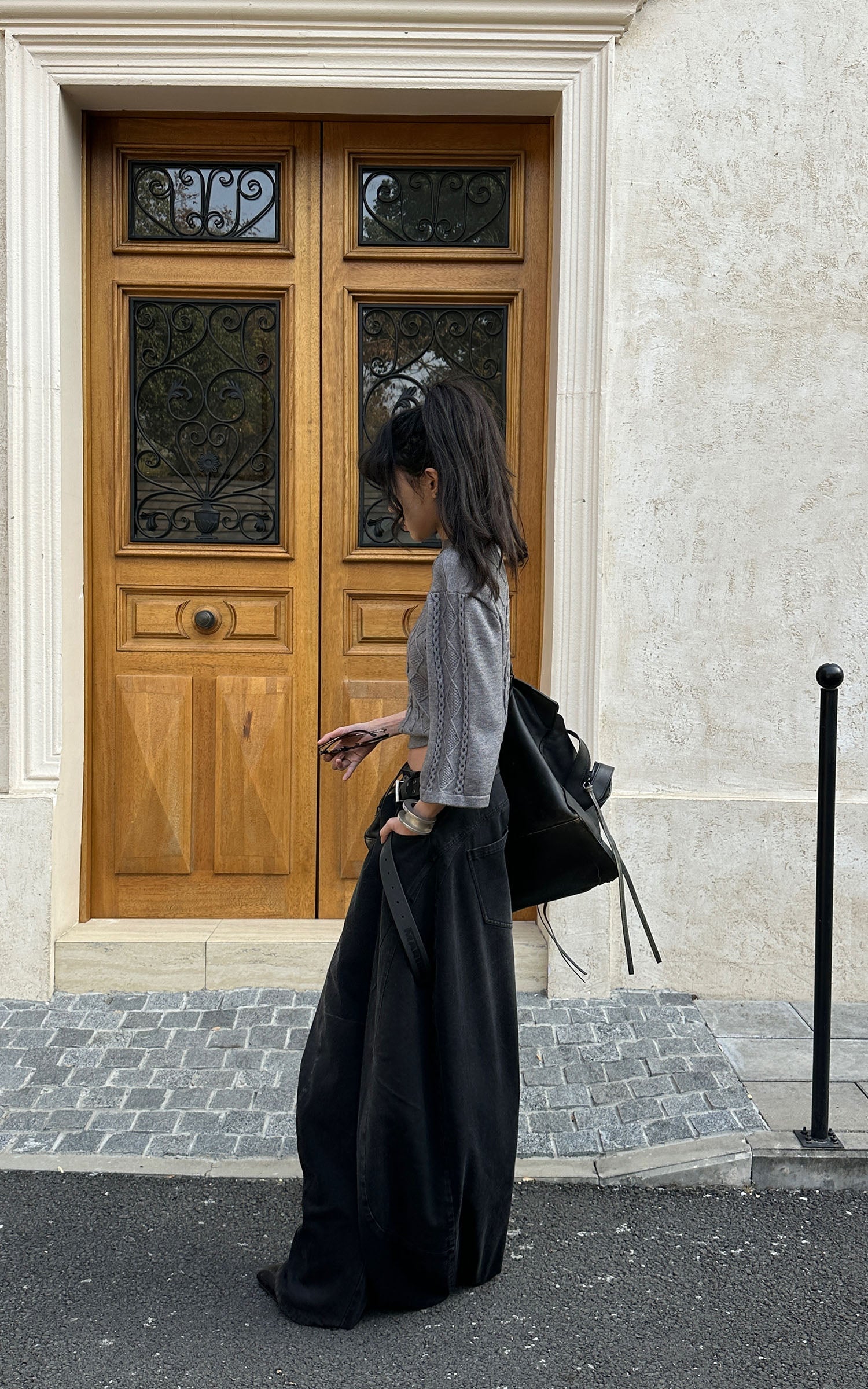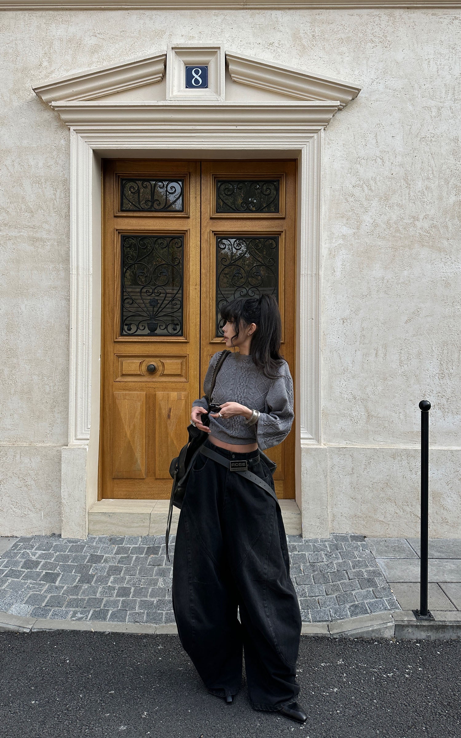 A reworked knit defined by sculptural cable textures and restrained proportions. Raised braid and diamond patterns build a structured surface, contrasted by cropped length and wide sleeves for a sharp, modern silhouette. Soft yet substantial, the fabric holds its shape without feeling rigid. Designed to balance precision and ease, it layers effortlessly with tailored or oversized bottoms, delivering a quiet, directional presence rooted in contemporary minimalism.