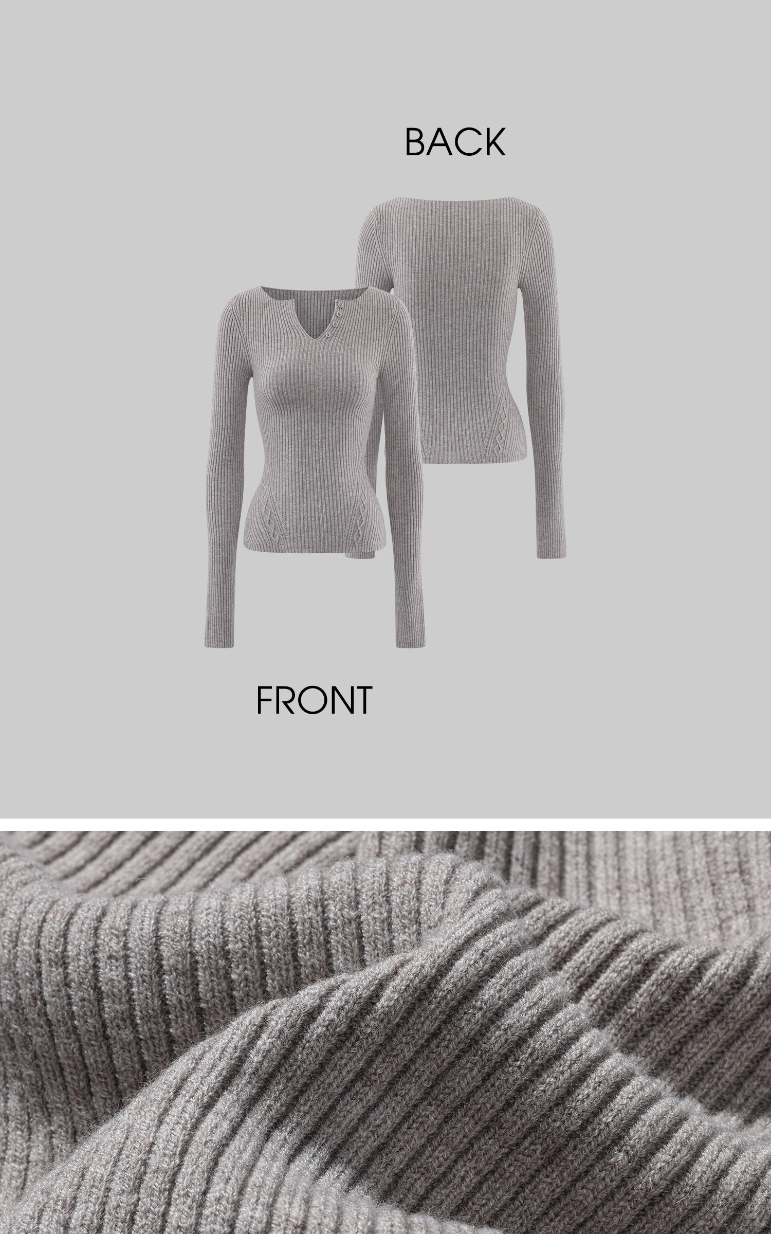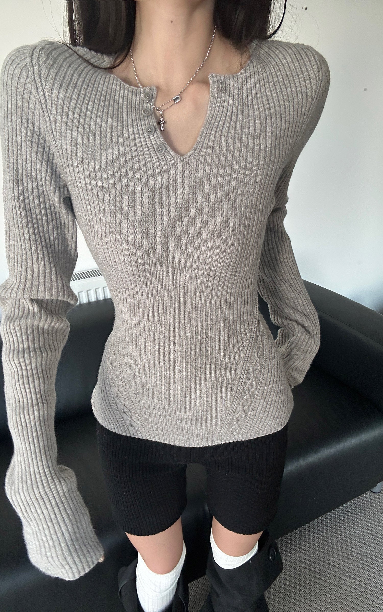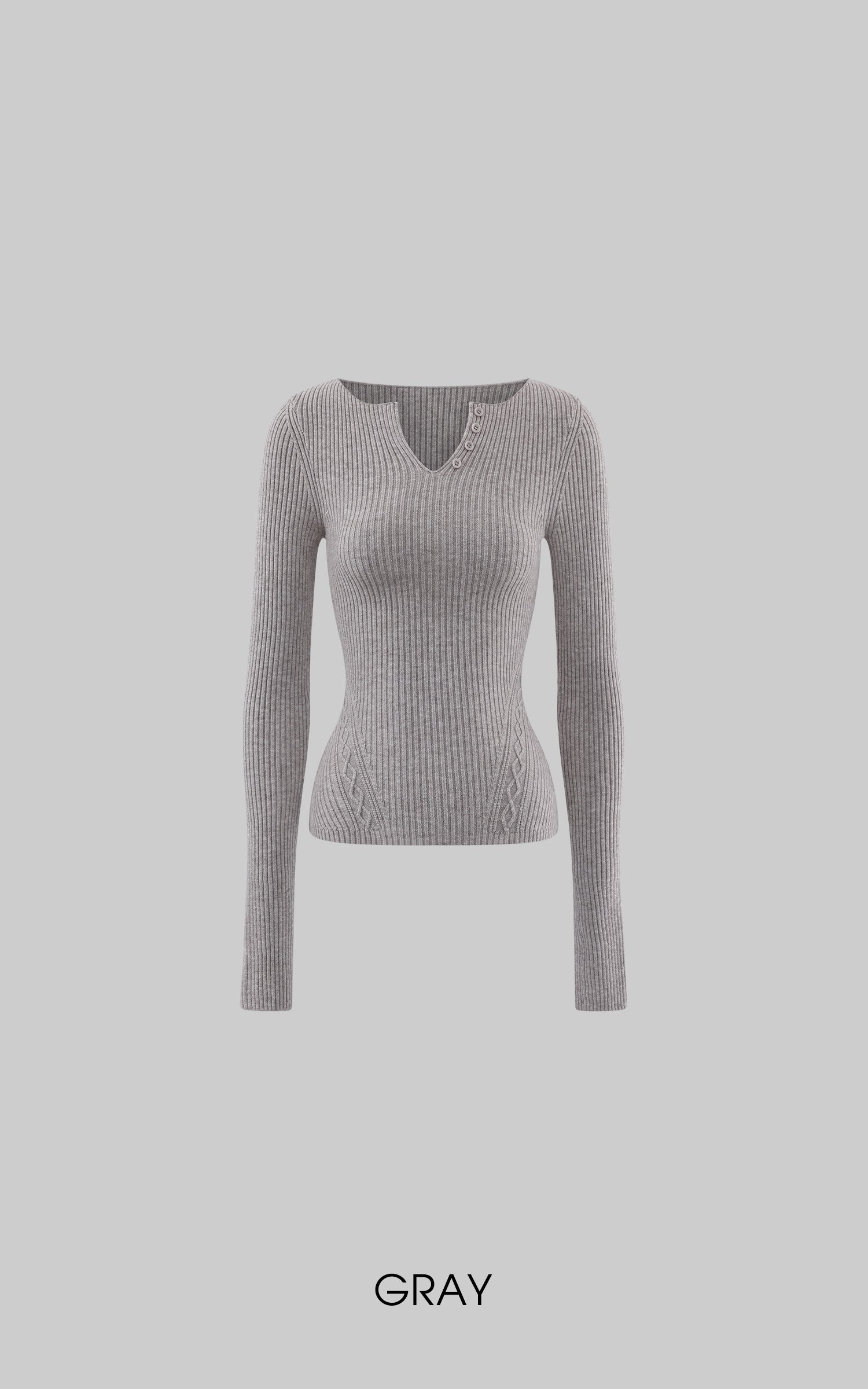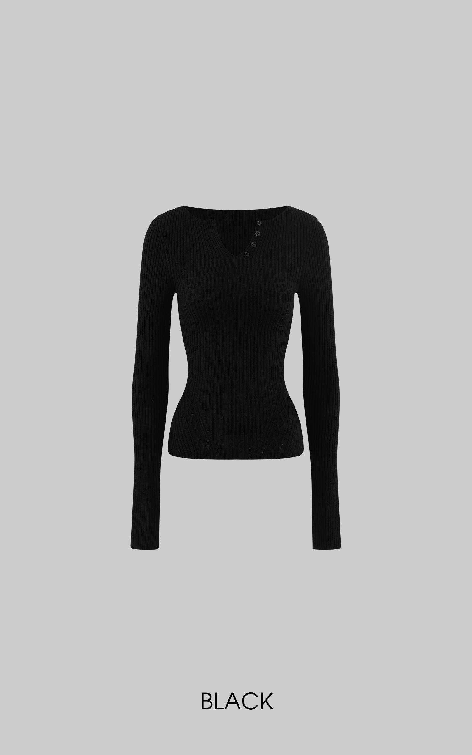 Crafted from a dense ribbed knit, this top follows the body with controlled precision. The split neckline and offset button detail introduce a quiet disruption to an otherwise restrained silhouette. Subtle textural shifts around the waist enhance structure without excess. Designed for versatility, it transitions effortlessly between standalone wear and refined layering in a modern wardrobe.