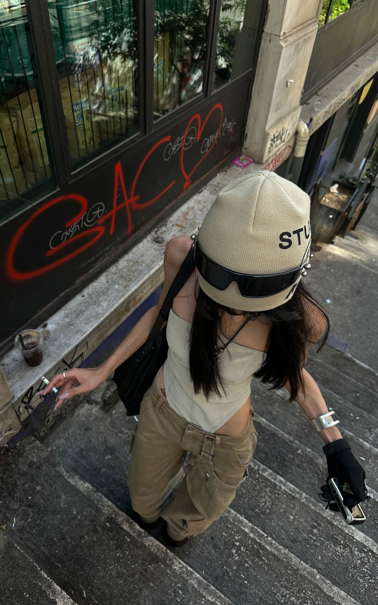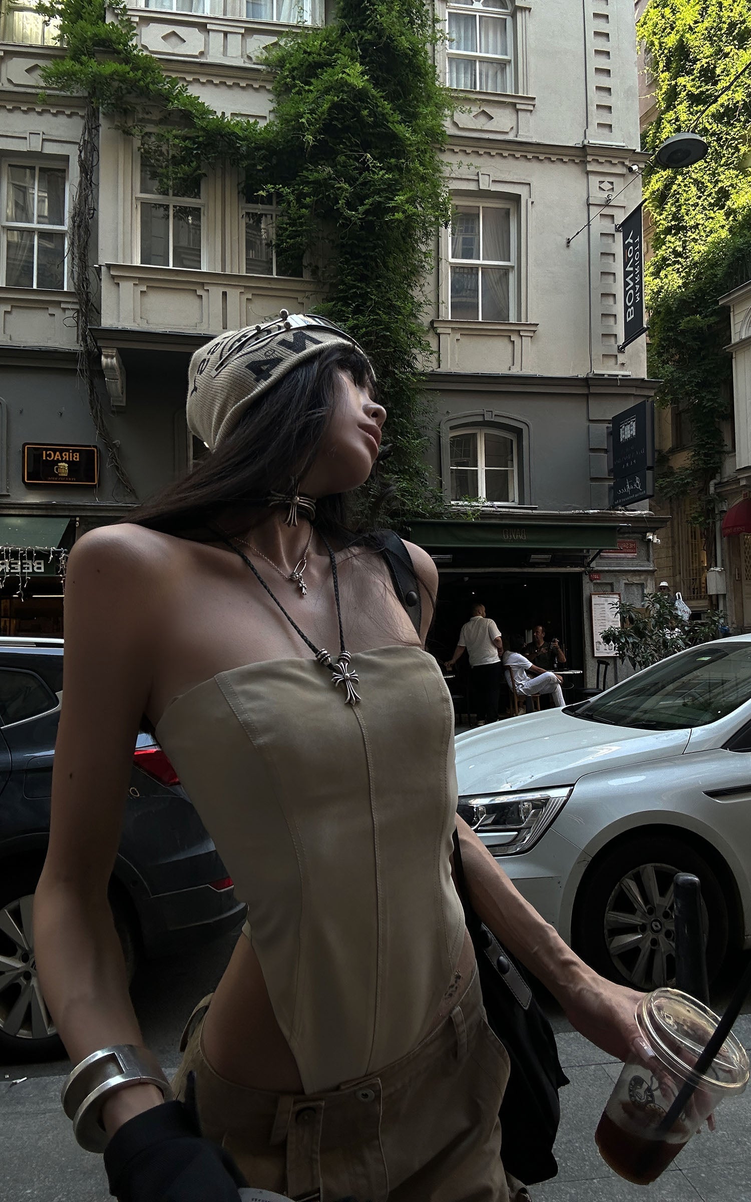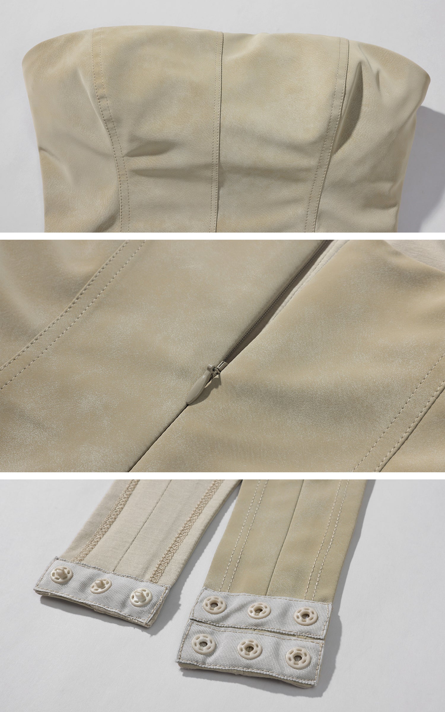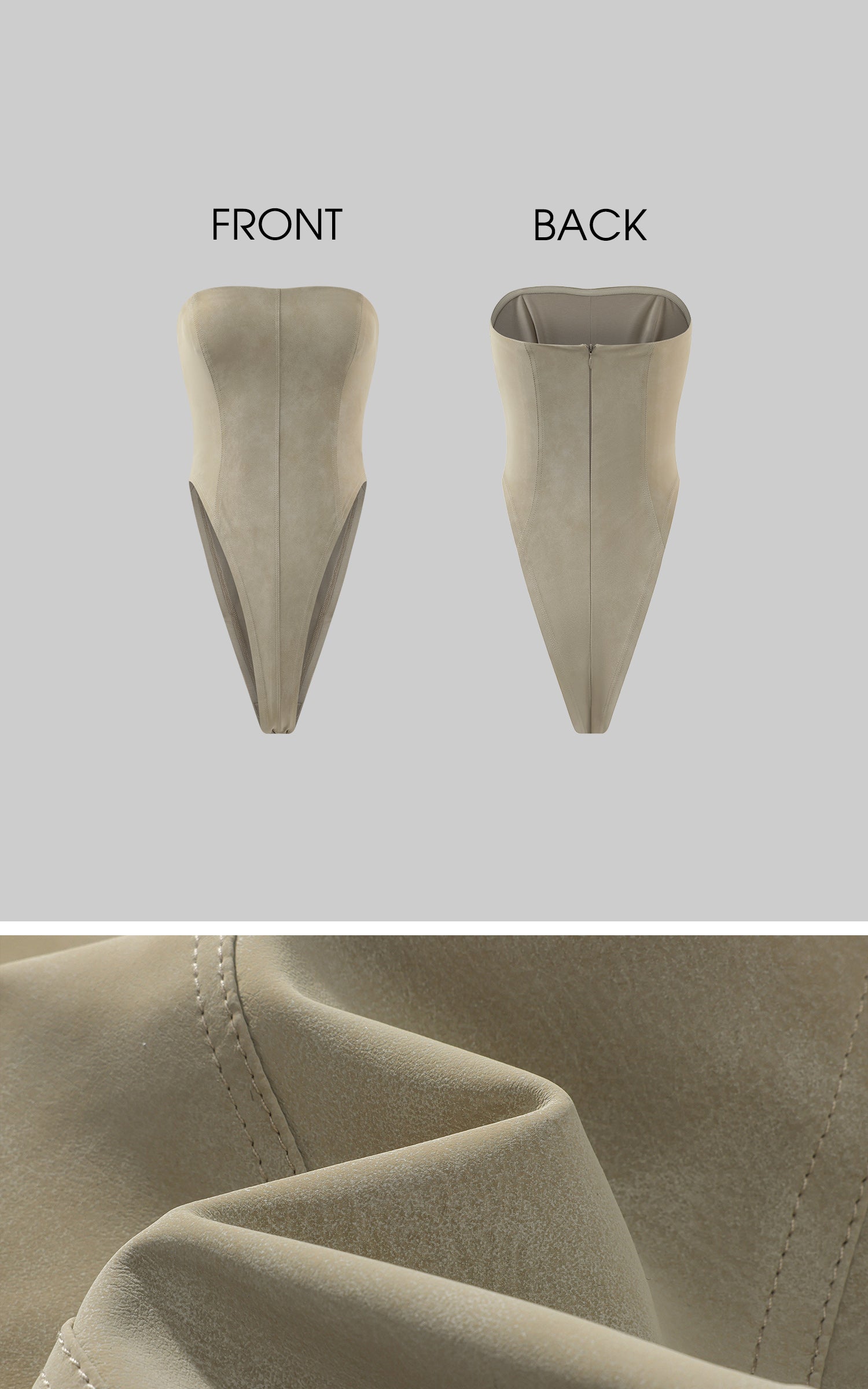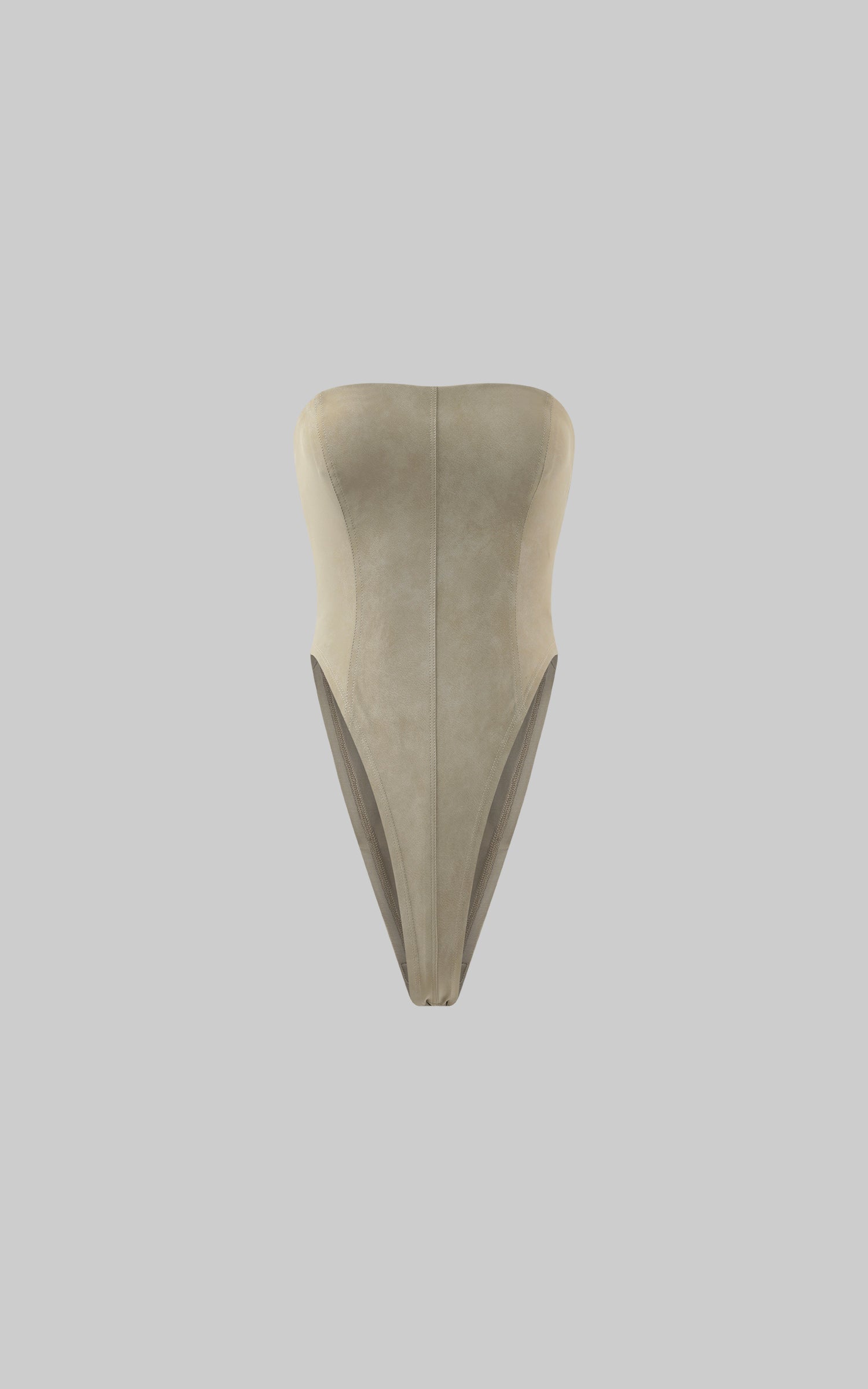This structured bodysuit redefines sharp minimalism. Made from a matte faux leather with subtle texture, it sculpts the torso with architectural seam lines and an exaggerated high-cut leg. Internal boning adds support while the back zip and snap-button gusset ensure a secure fit. Raw yet refined, it’s made for layering under oversized cargos or low-slung denim.