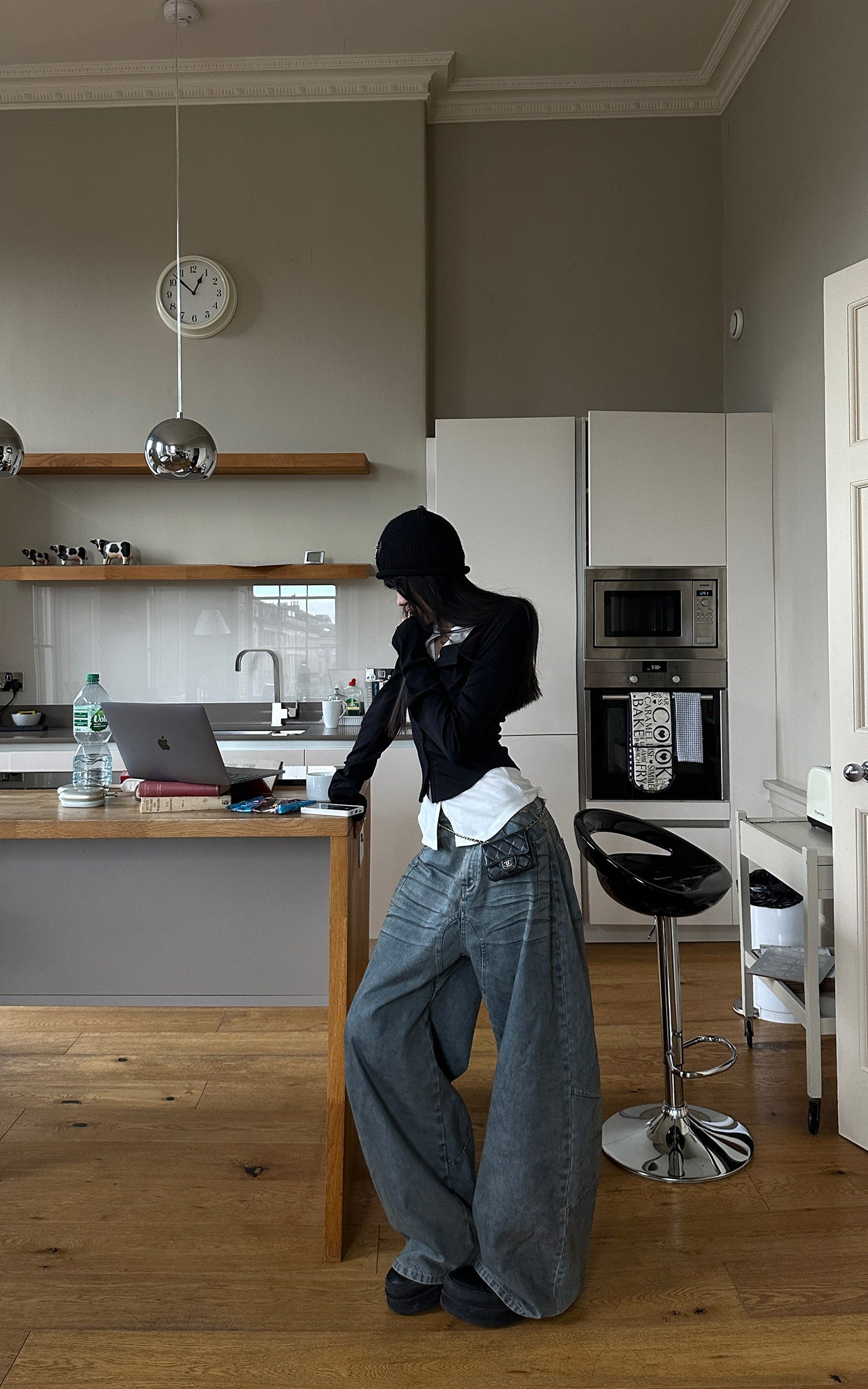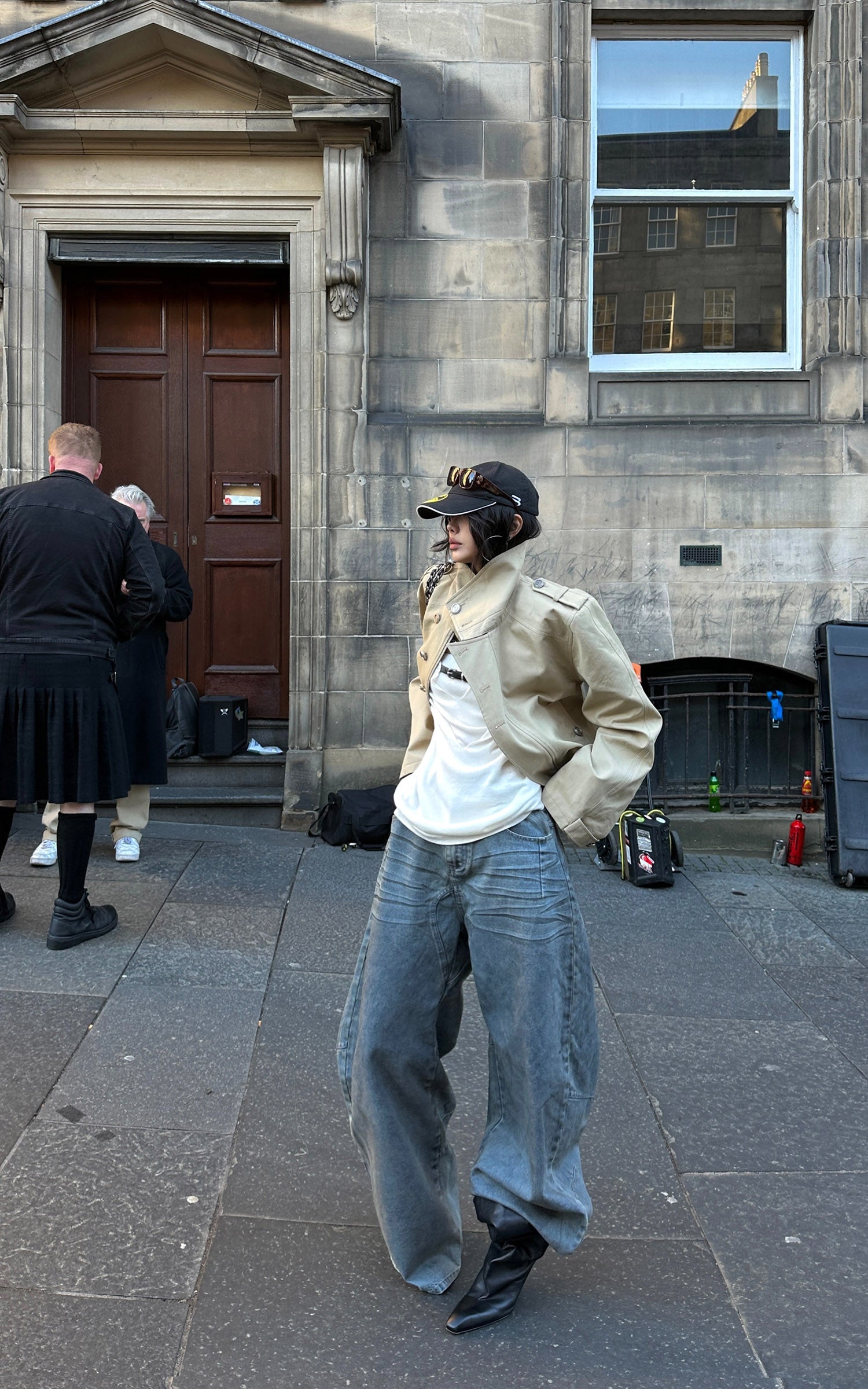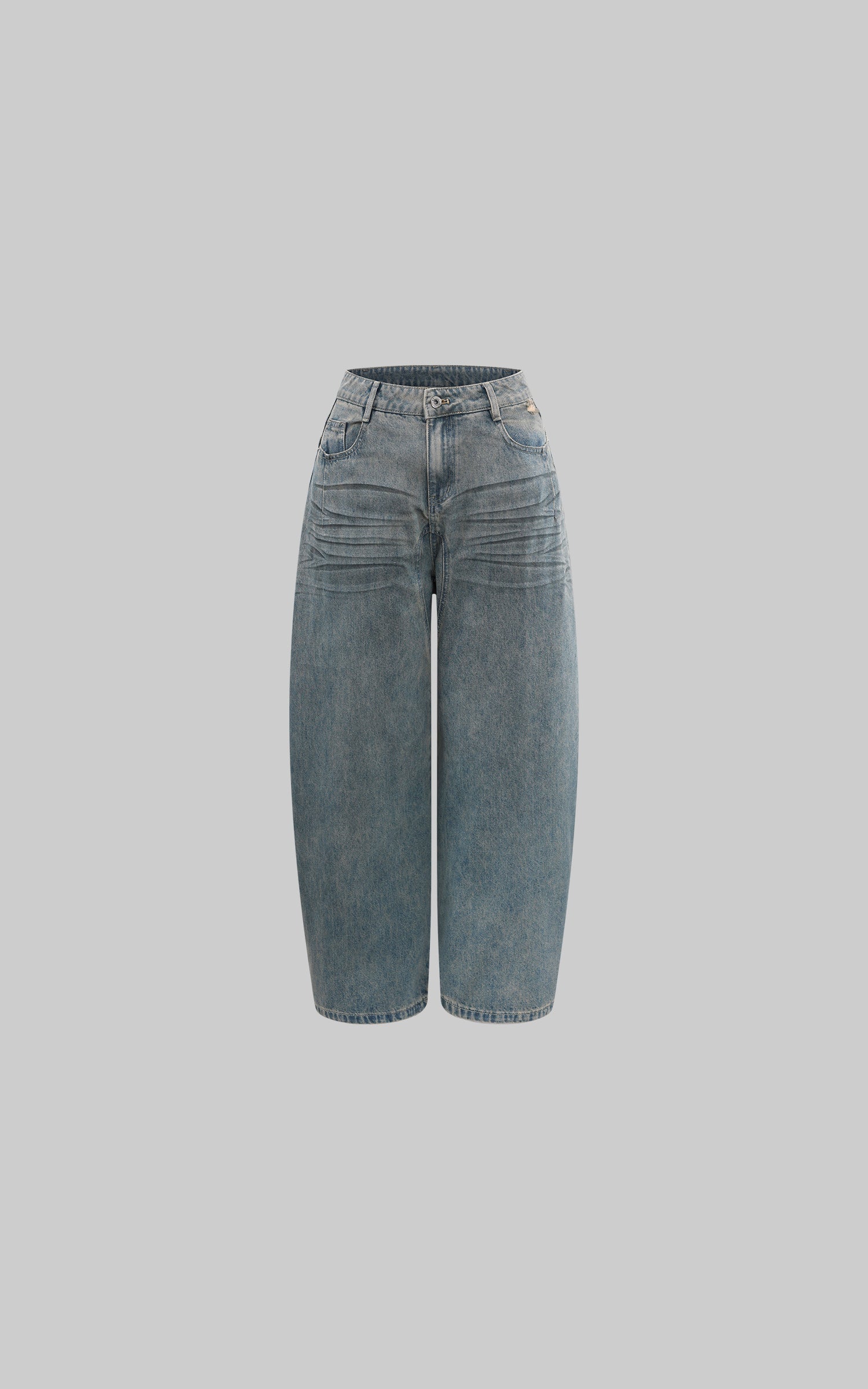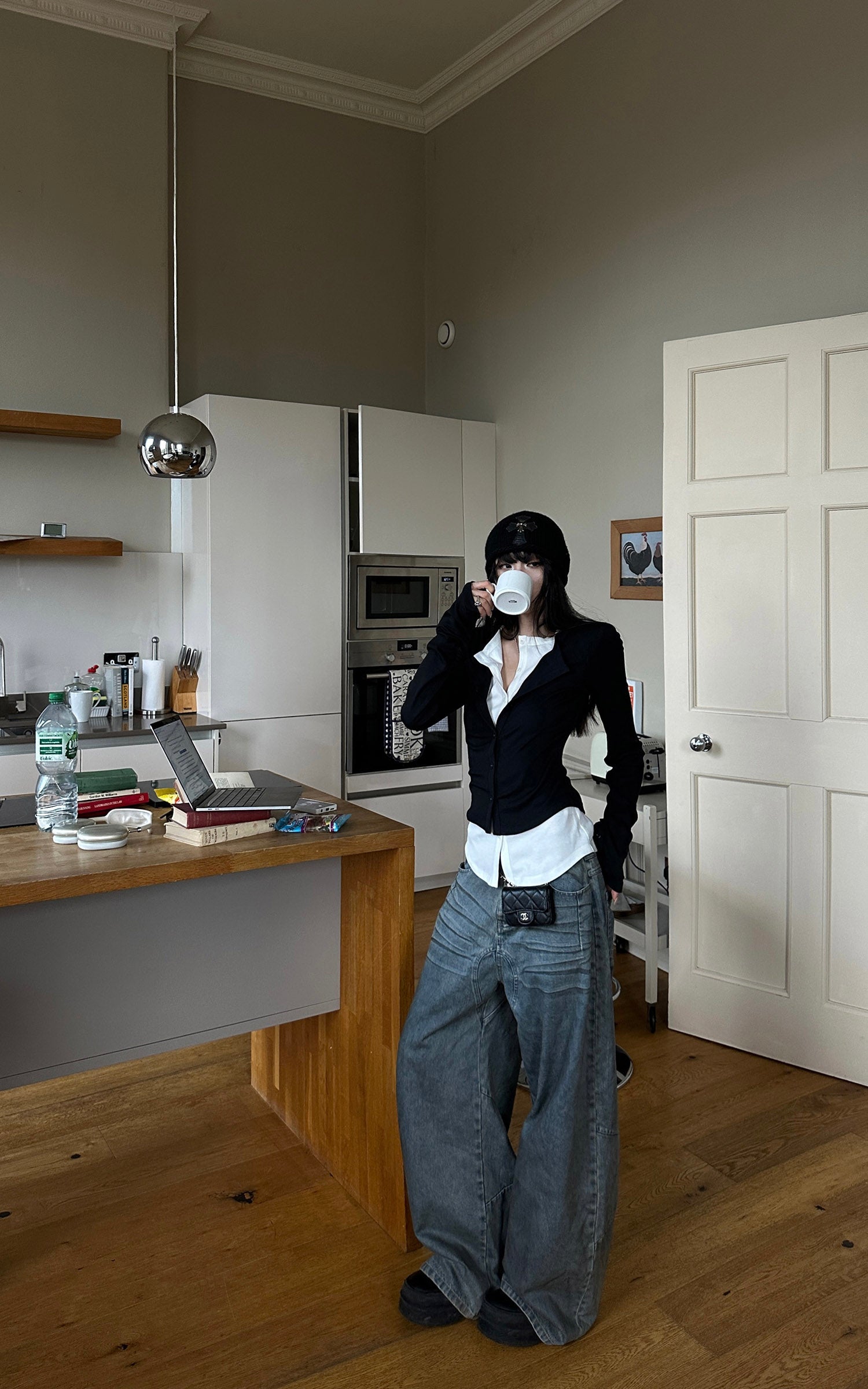 Defined by sculpted seams and a relaxed wide-leg silhouette, these denim pants balance structure with ease. A high-rise waist elongates the frame, while subtle whiskering and worn-in texture add depth without excess. The fabric holds its shape yet moves naturally, creating a grounded, effortless presence. Designed to pair seamlessly with fitted tops or oversized layers, this piece brings a quiet edge to everyday dressing.