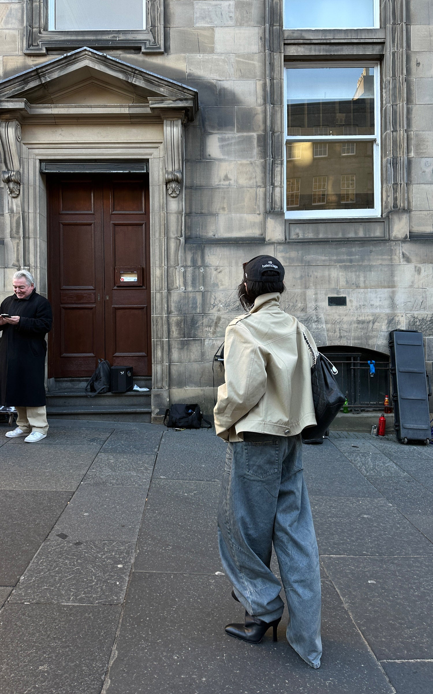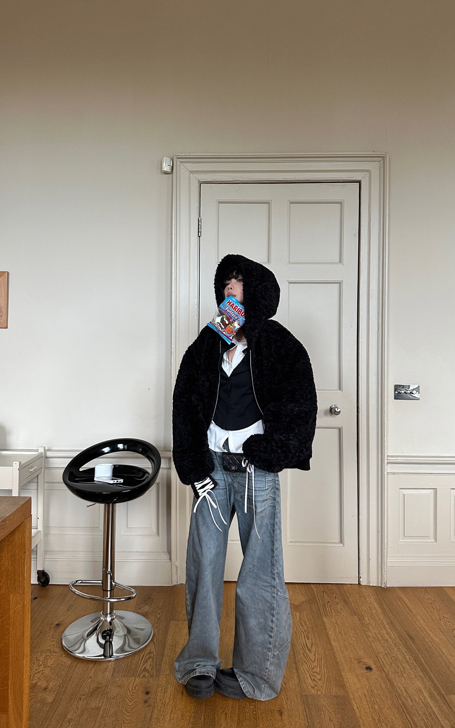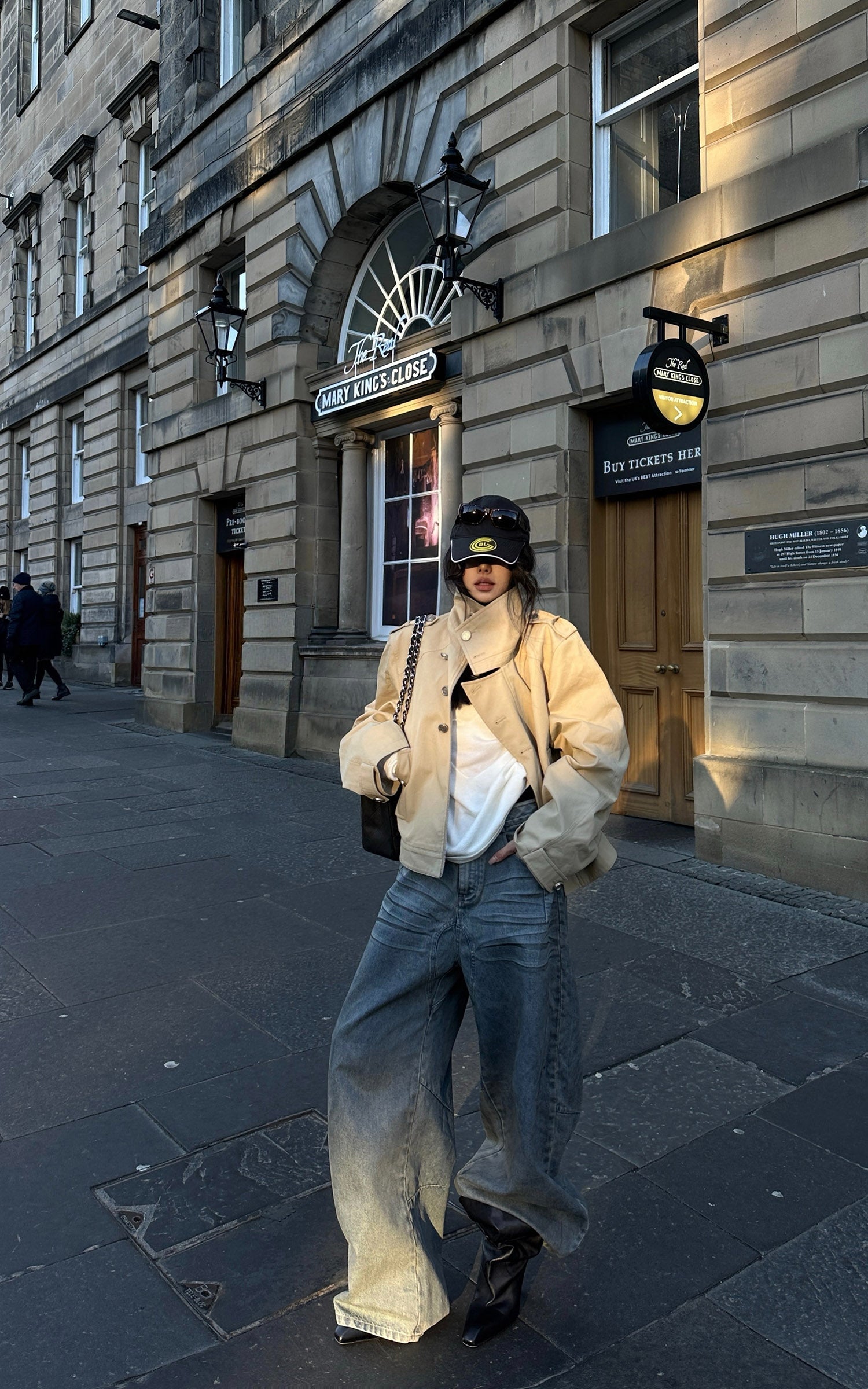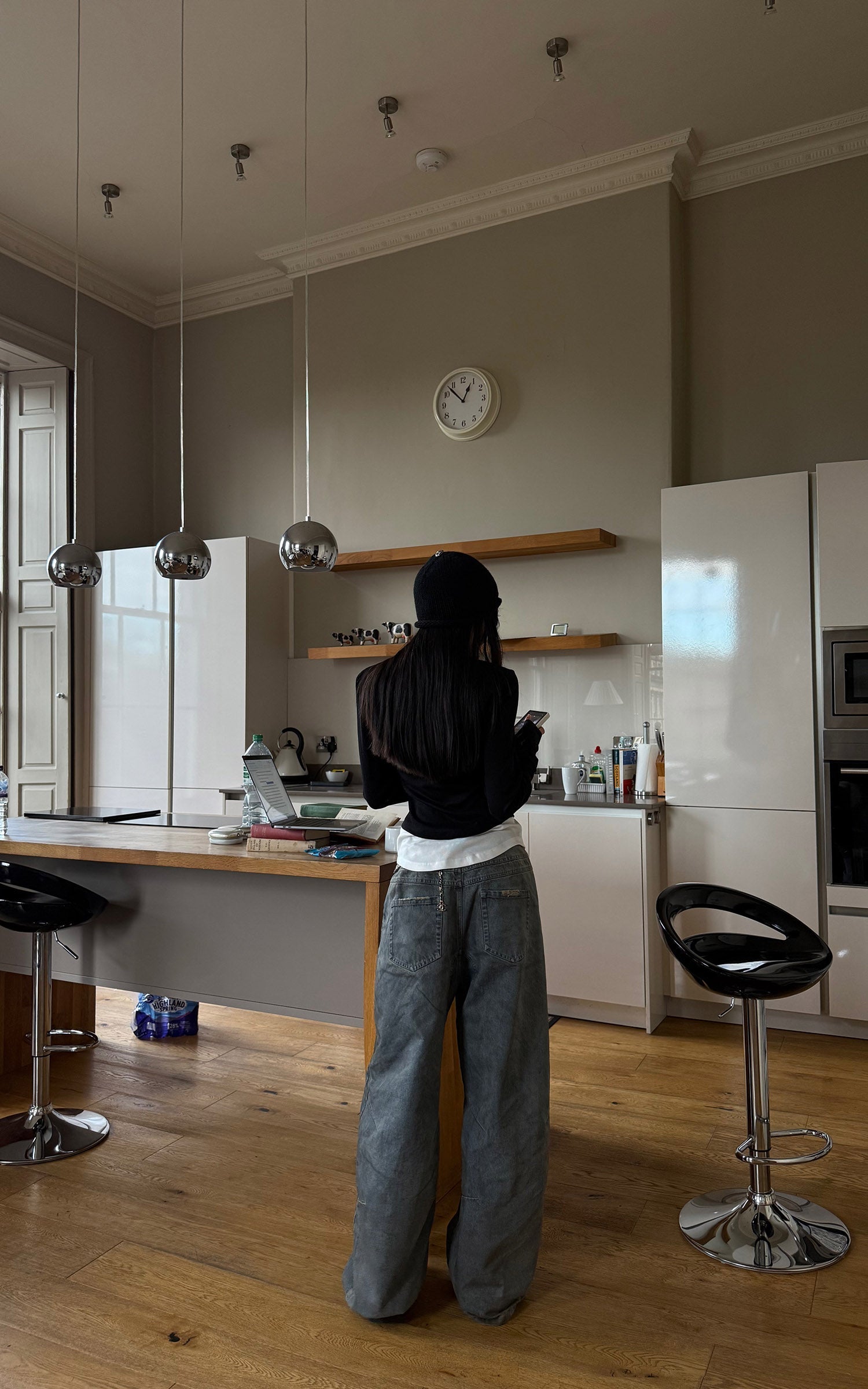 Defined by sculpted seams and a relaxed wide-leg silhouette, these denim pants balance structure with ease. A high-rise waist elongates the frame, while subtle whiskering and worn-in texture add depth without excess. The fabric holds its shape yet moves naturally, creating a grounded, effortless presence. Designed to pair seamlessly with fitted tops or oversized layers, this piece brings a quiet edge to everyday dressing.