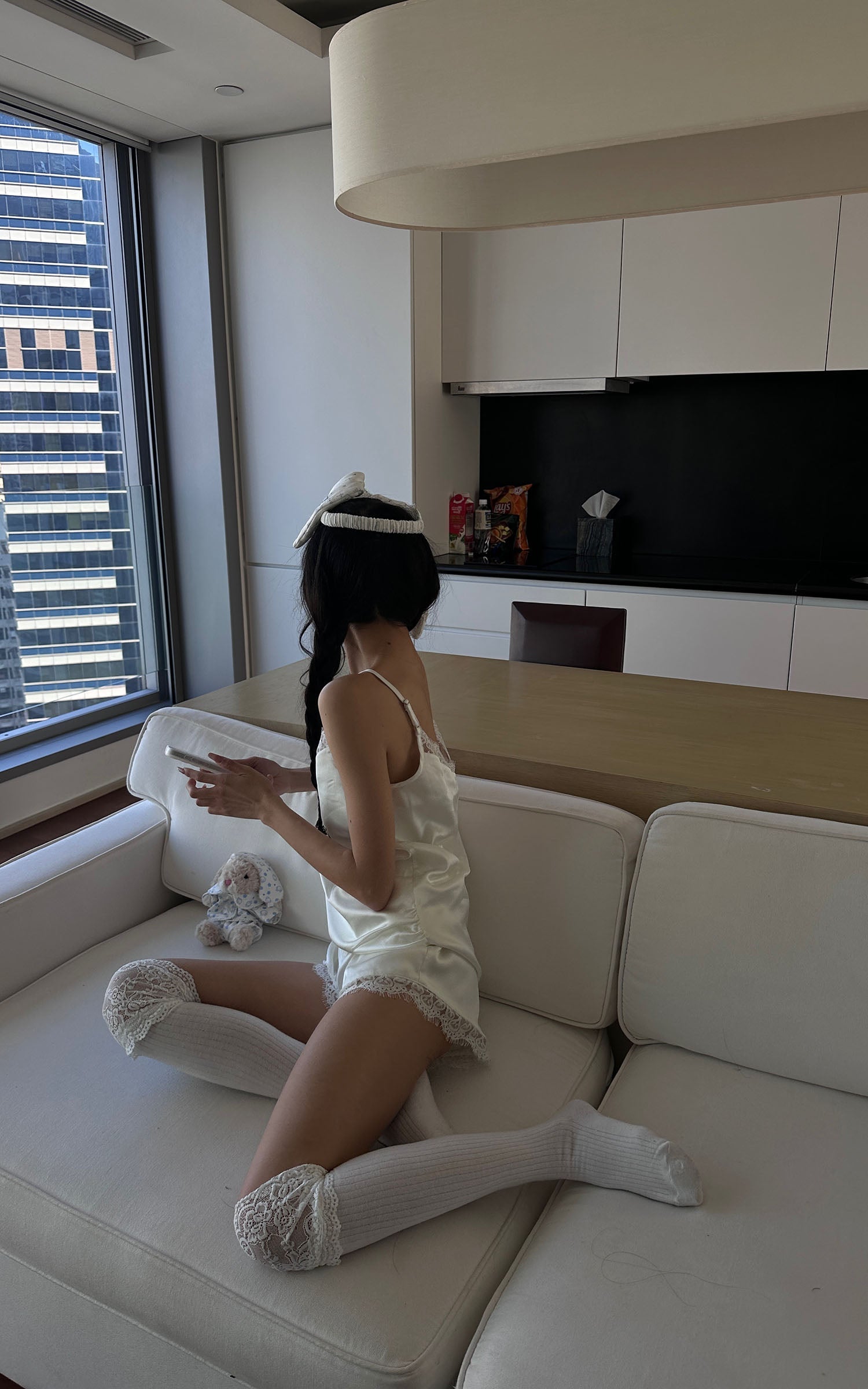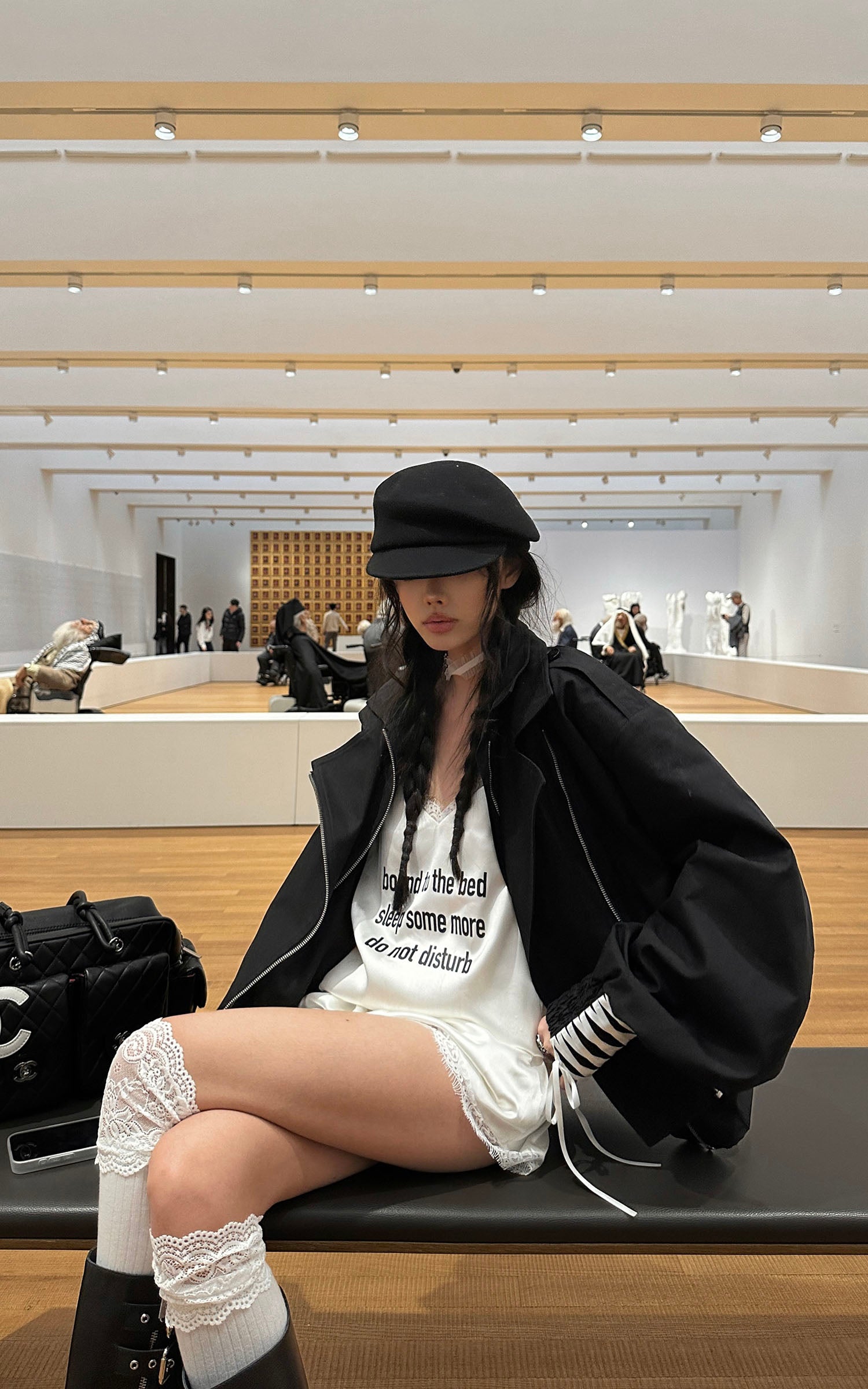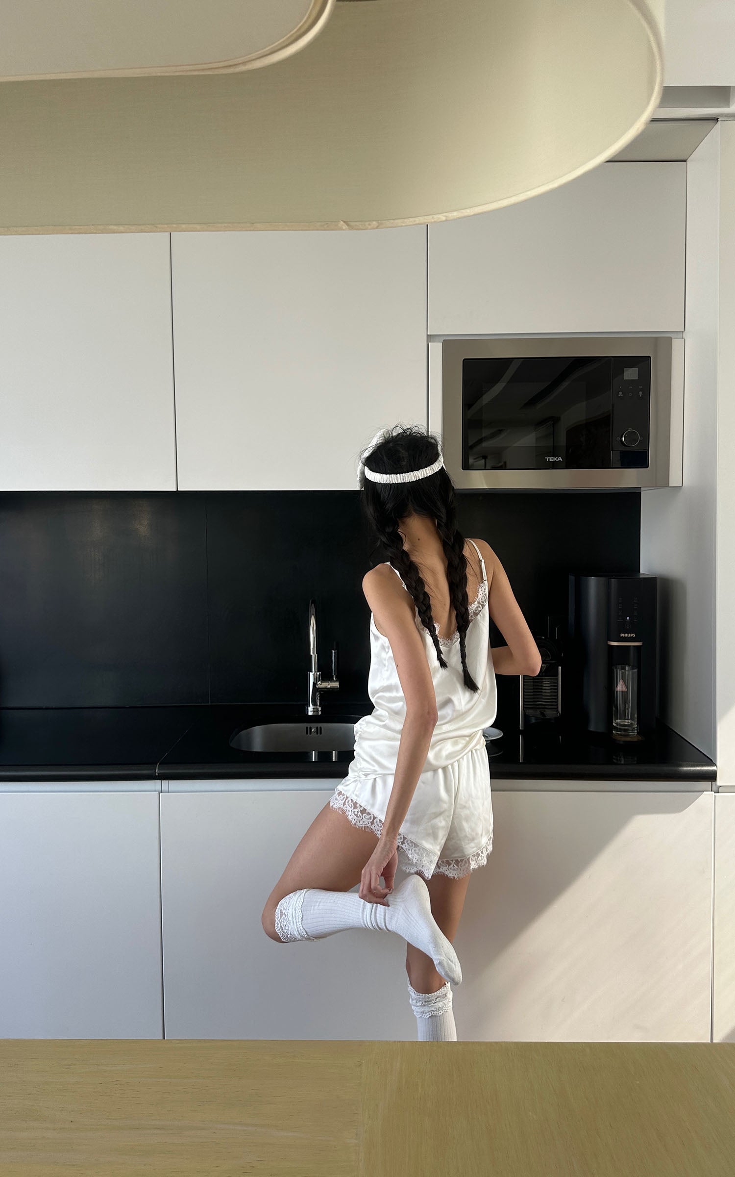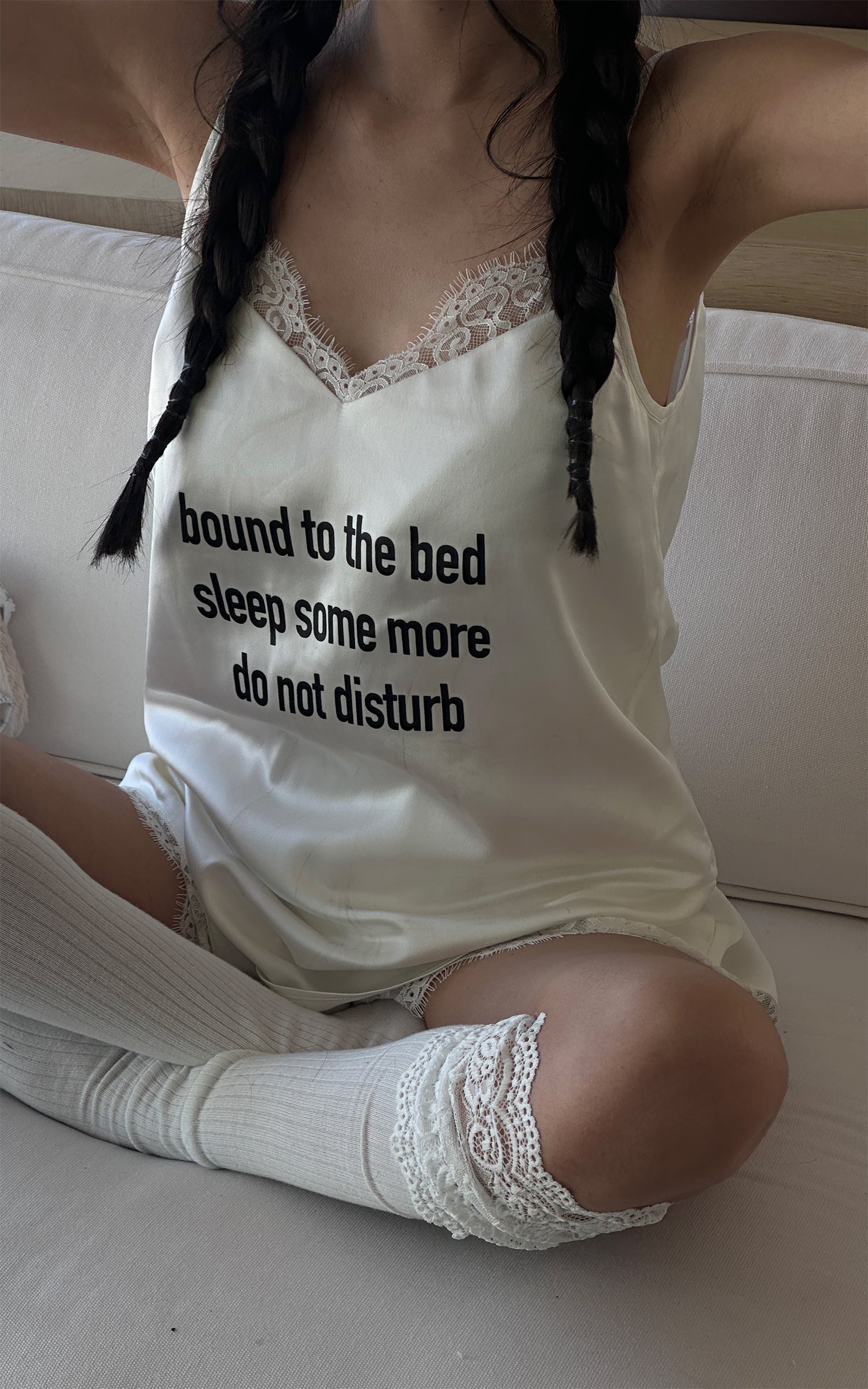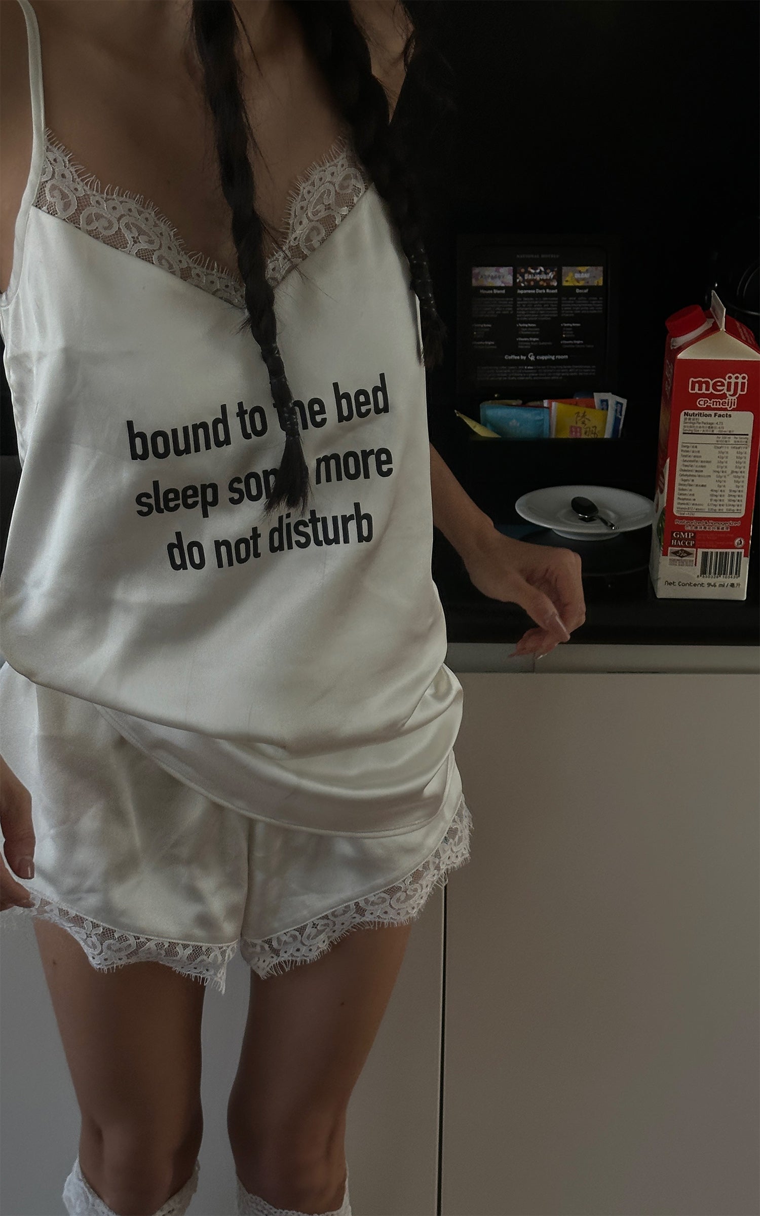 A fusion of sleepwear and street attitude—this silk cami & shorts set delivers effortless edge with a touch of elegance. The fluid satin drapes over the body, accented by delicate lace trim for a refined contrast. The relaxed fit ensures comfort, while the bold, typographic print injects a rebellious energy. Whether layered under an oversized blazer or worn solo, this set is designed to blur the line between loungewear and statement styling.